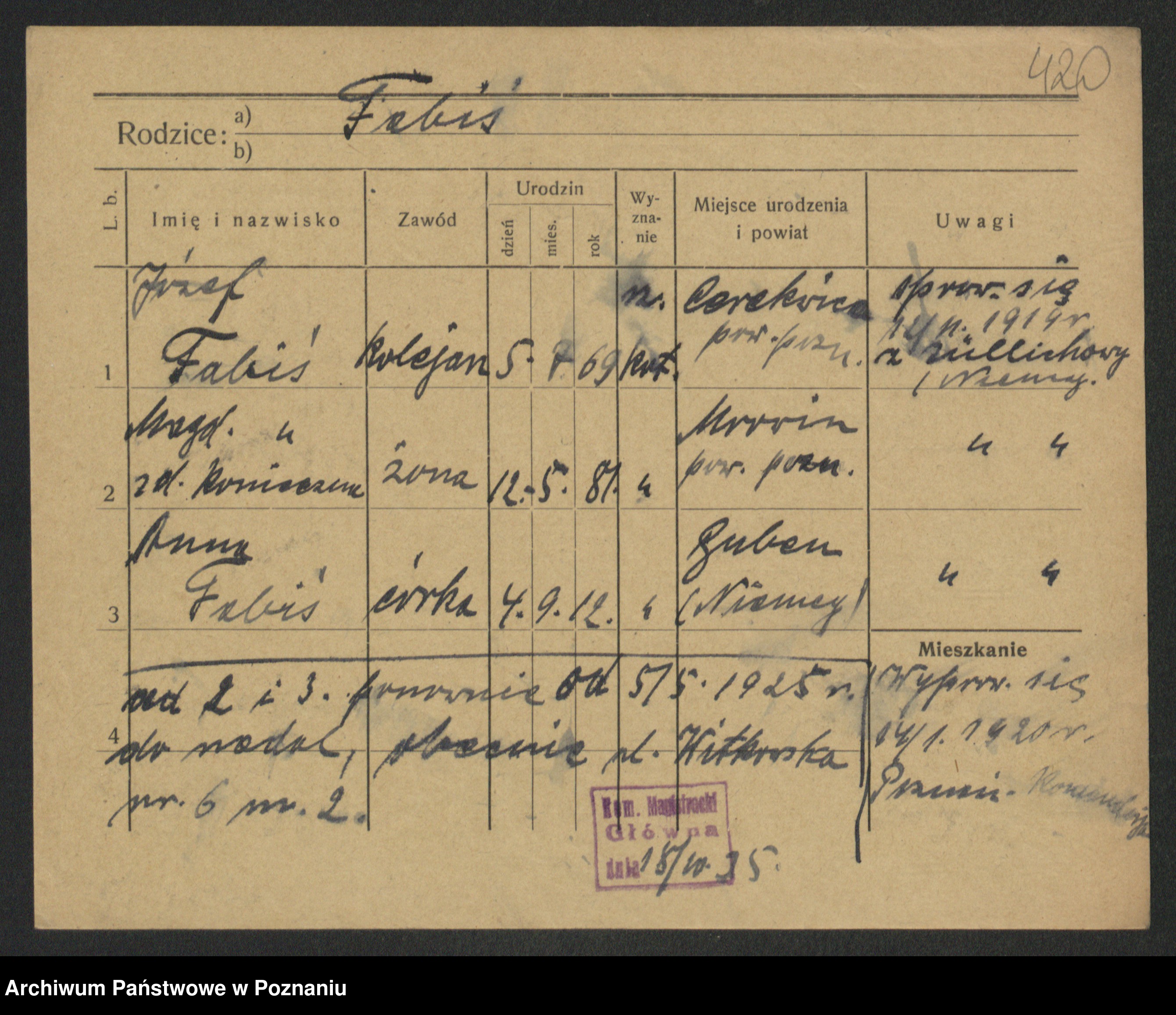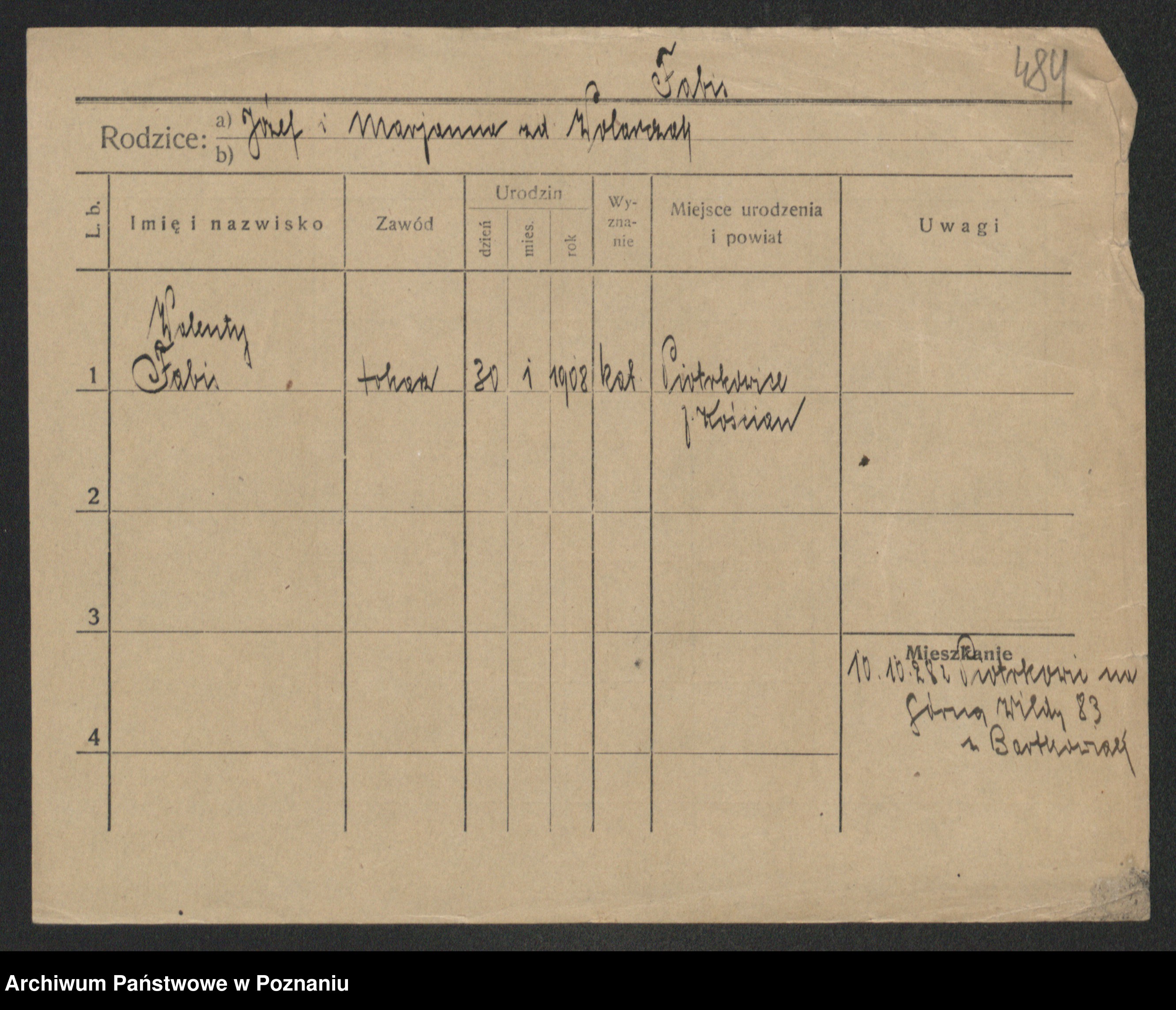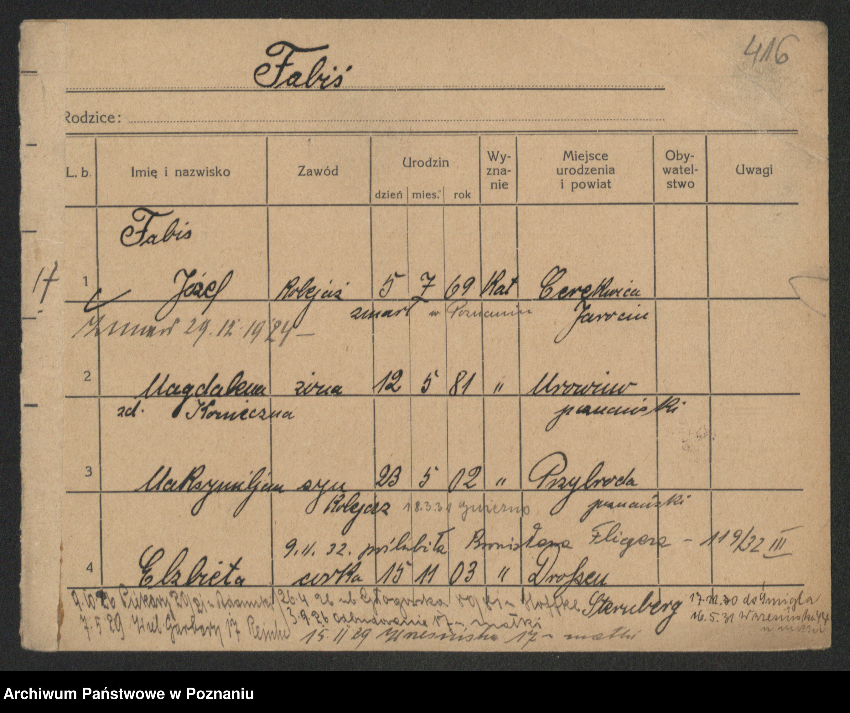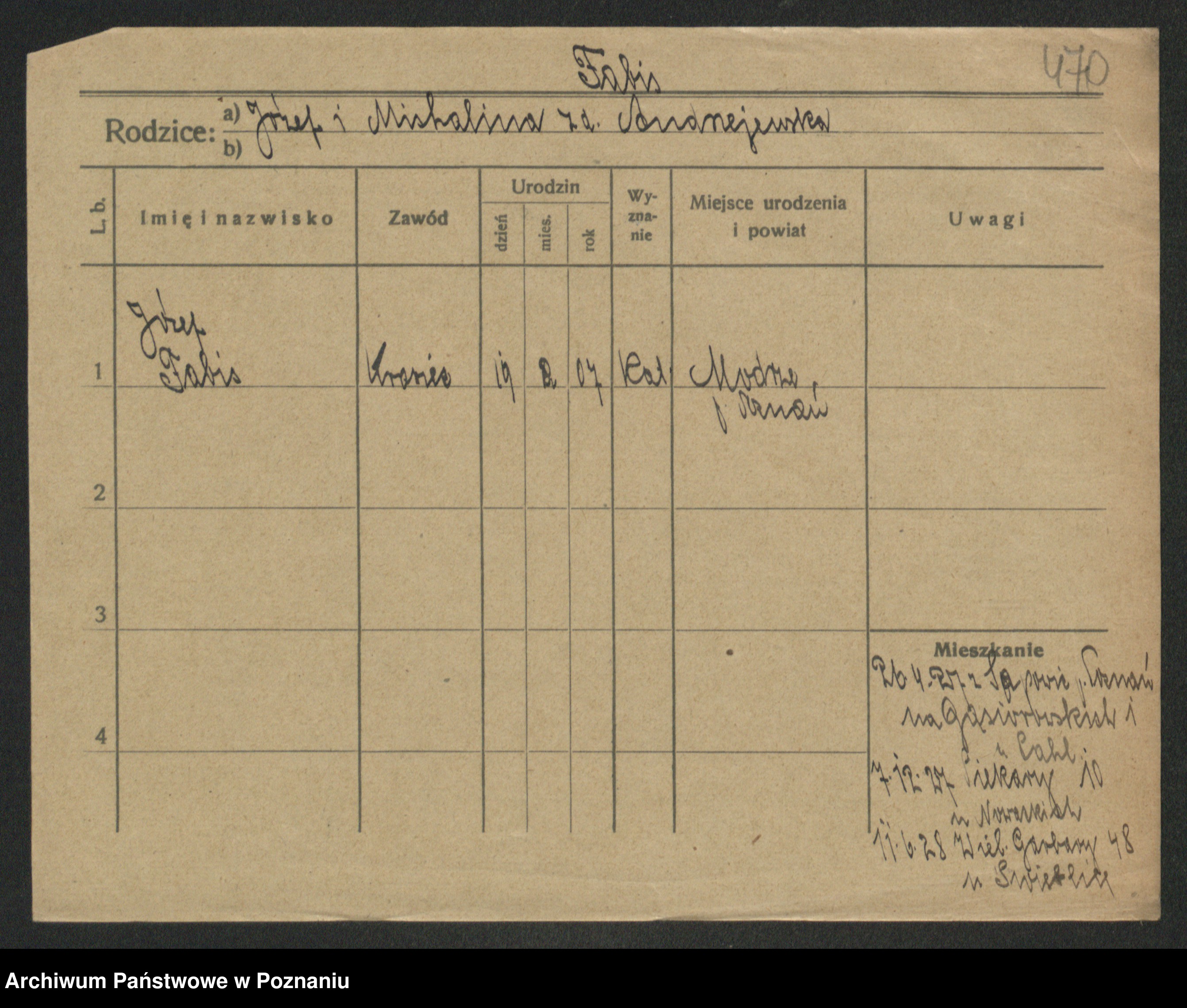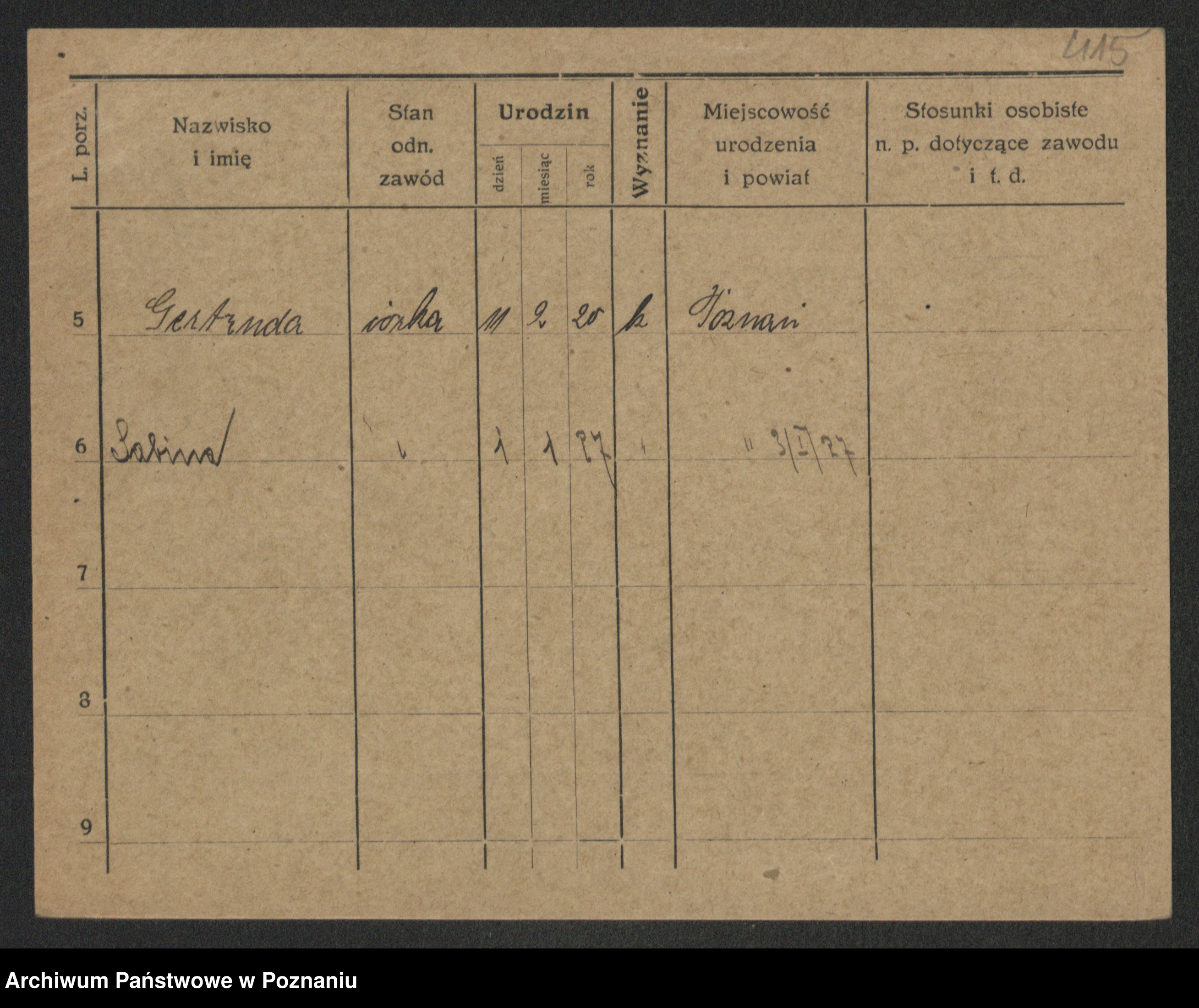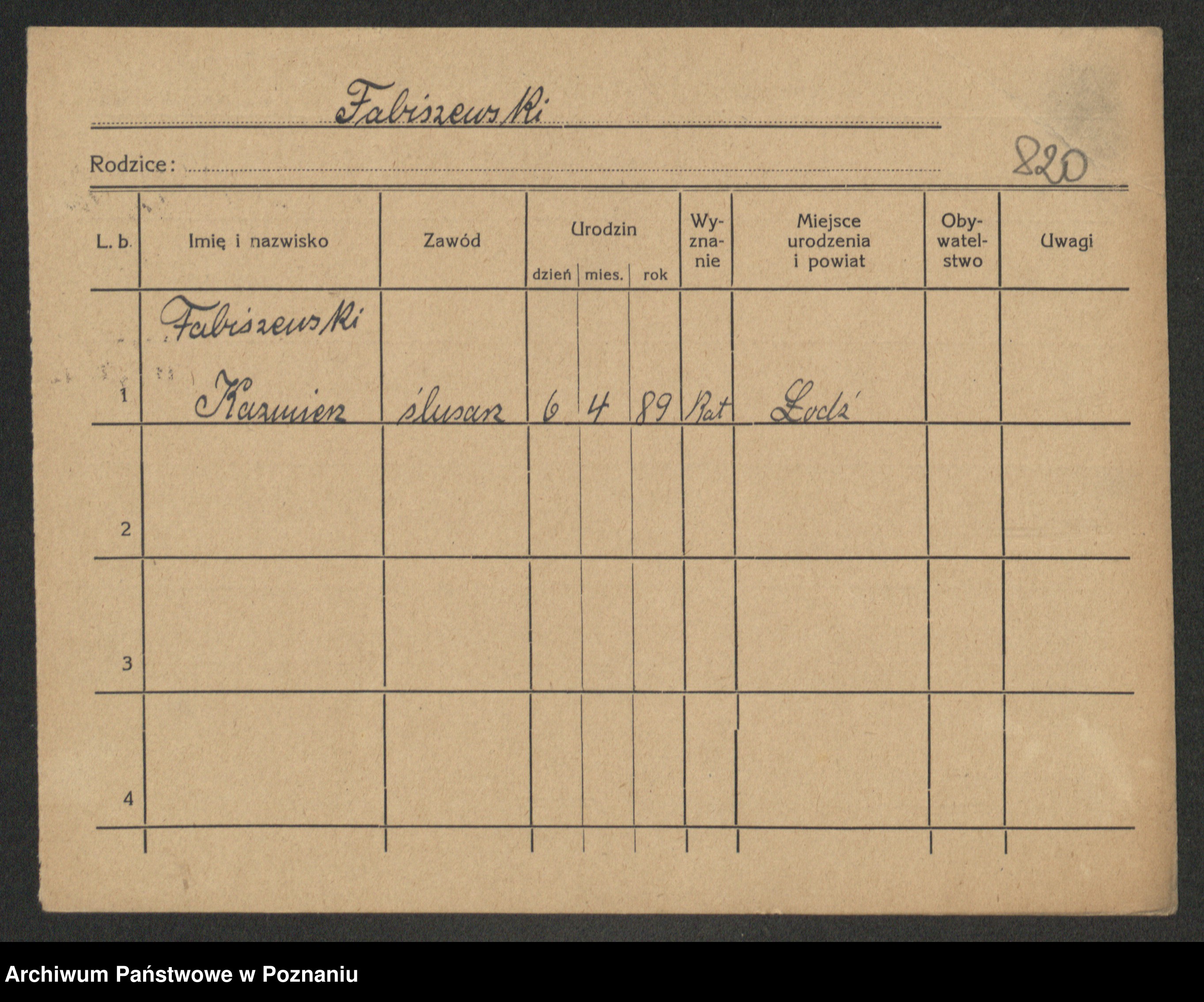 Podgląd karty osobowej dostępny jest po kliknięciu na nazwisko lub ikonkę karty. Można dokonywać powiększenia (ikony na górze) lub przechodzić między kolejnymi skanami (strzałki po bokach).