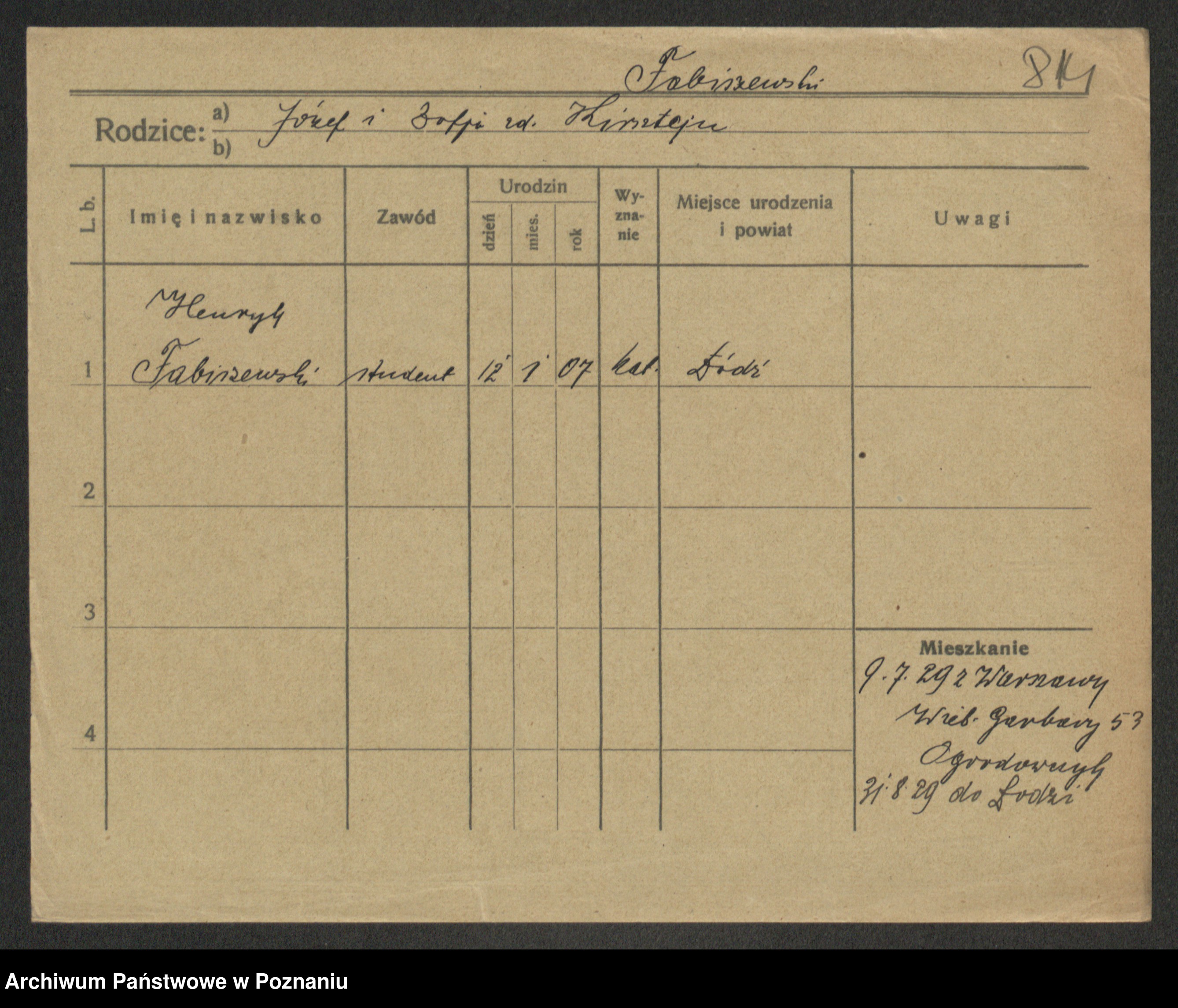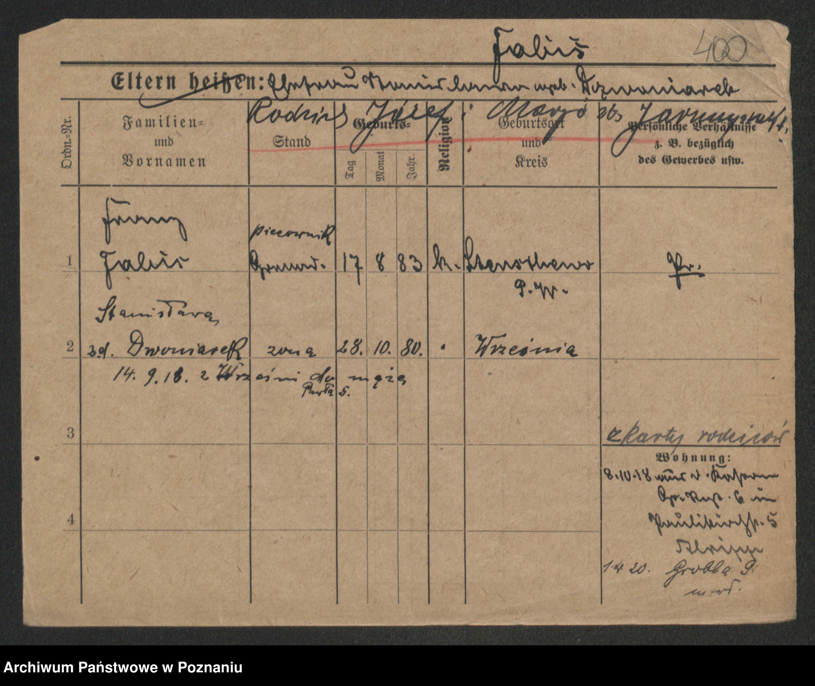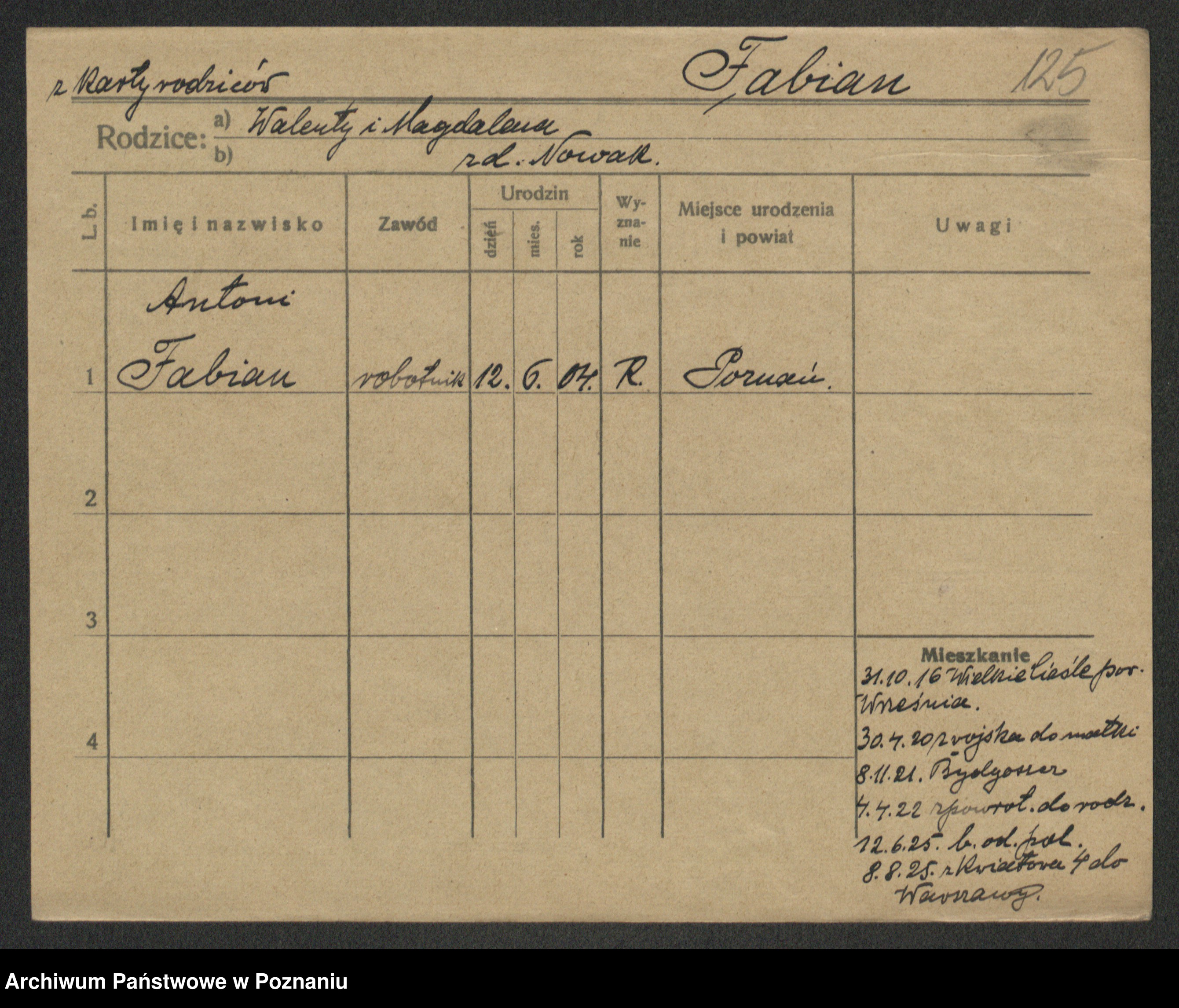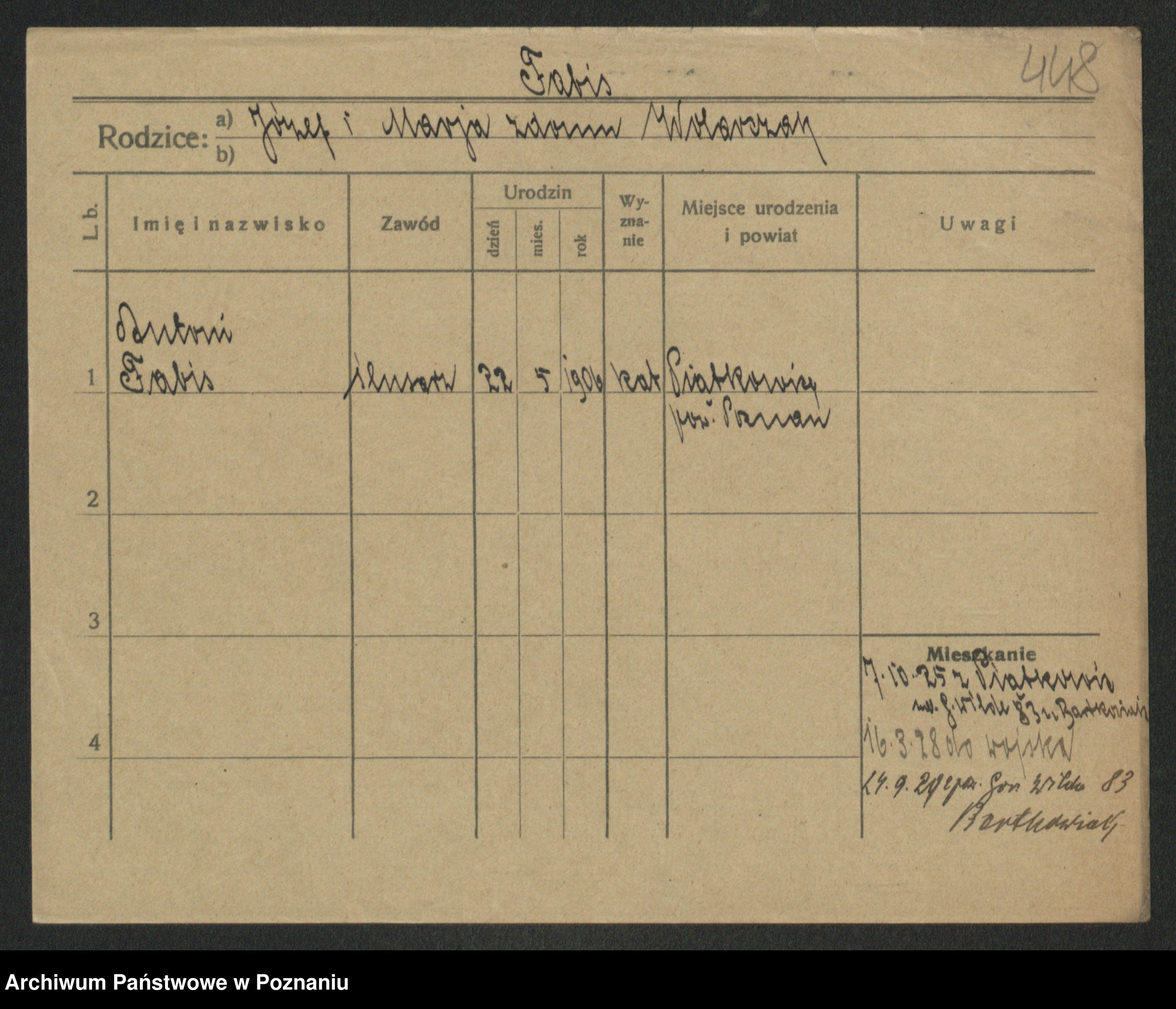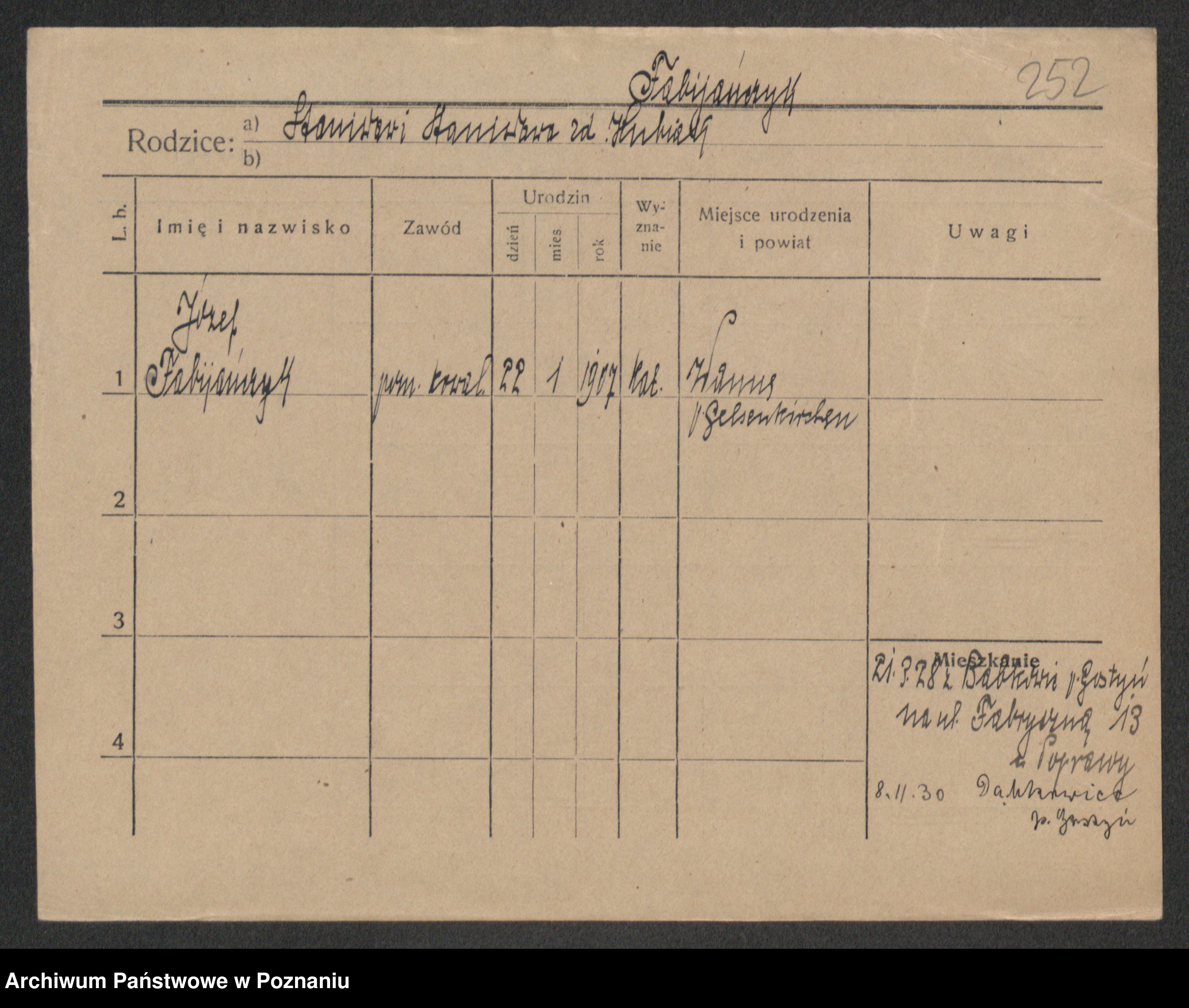 Podgląd karty osobowej dostępny jest po kliknięciu na nazwisko lub ikonkę karty. Można dokonywać powiększenia (ikony na górze) lub przechodzić między kolejnymi skanami (strzałki po bokach).