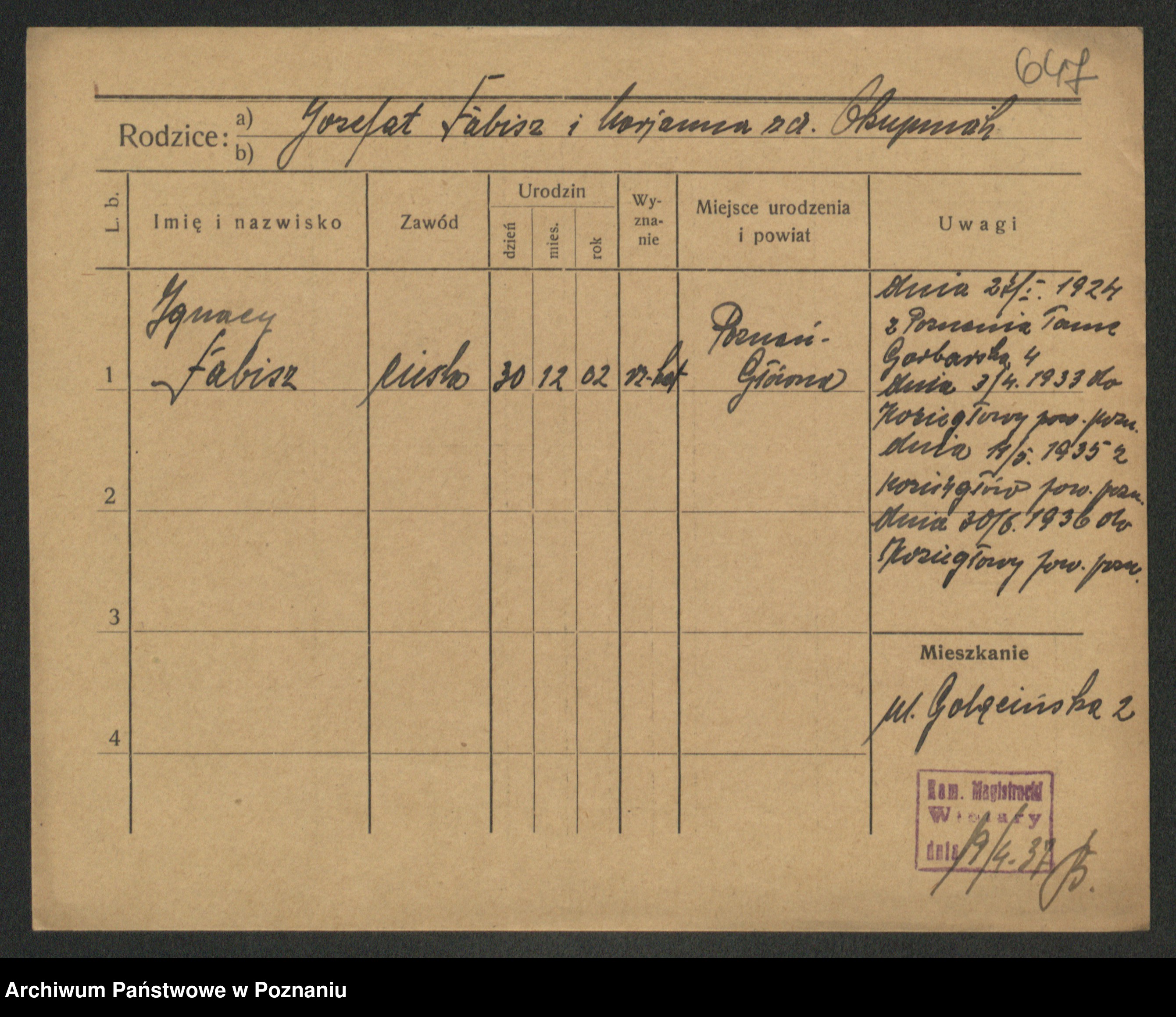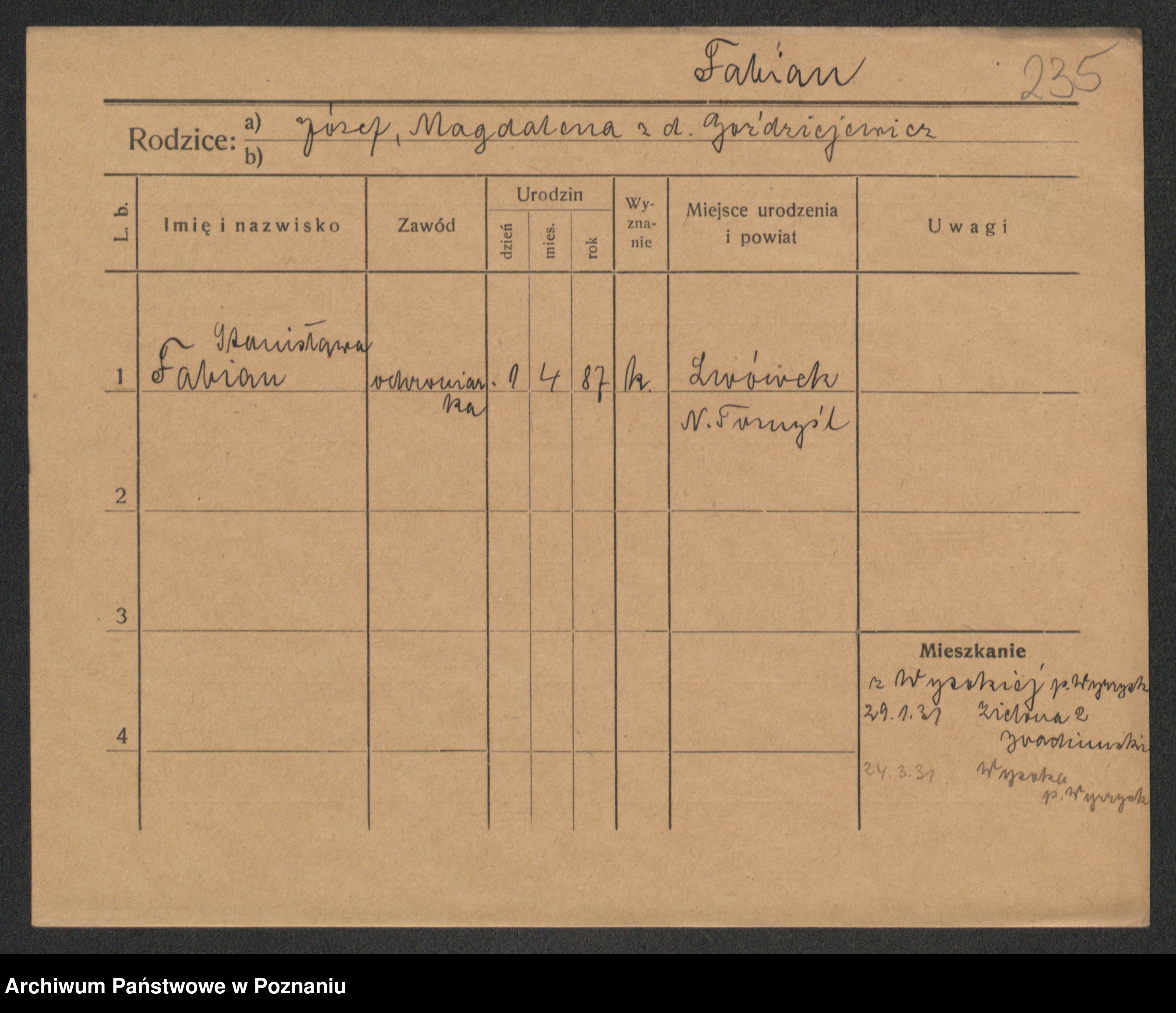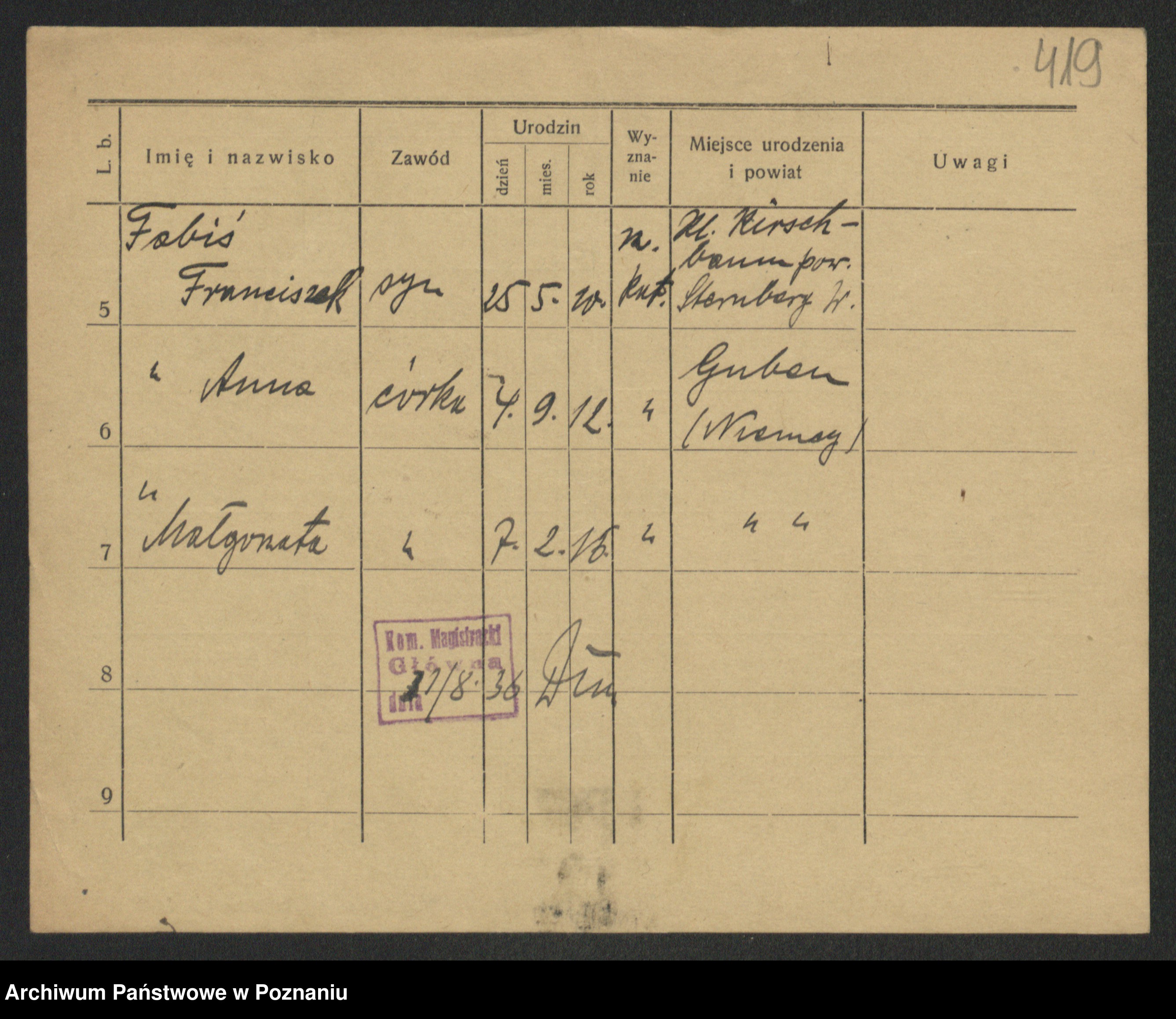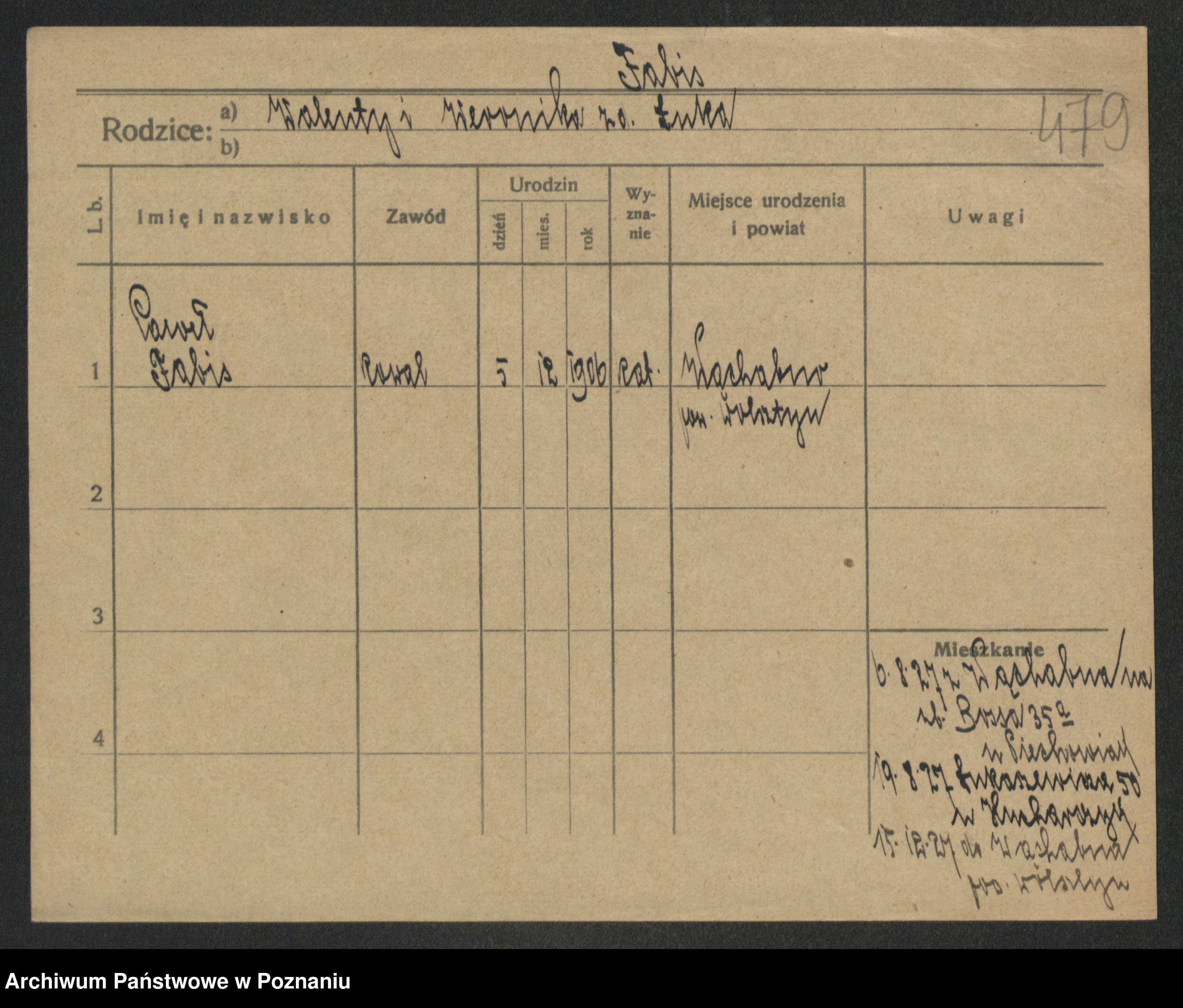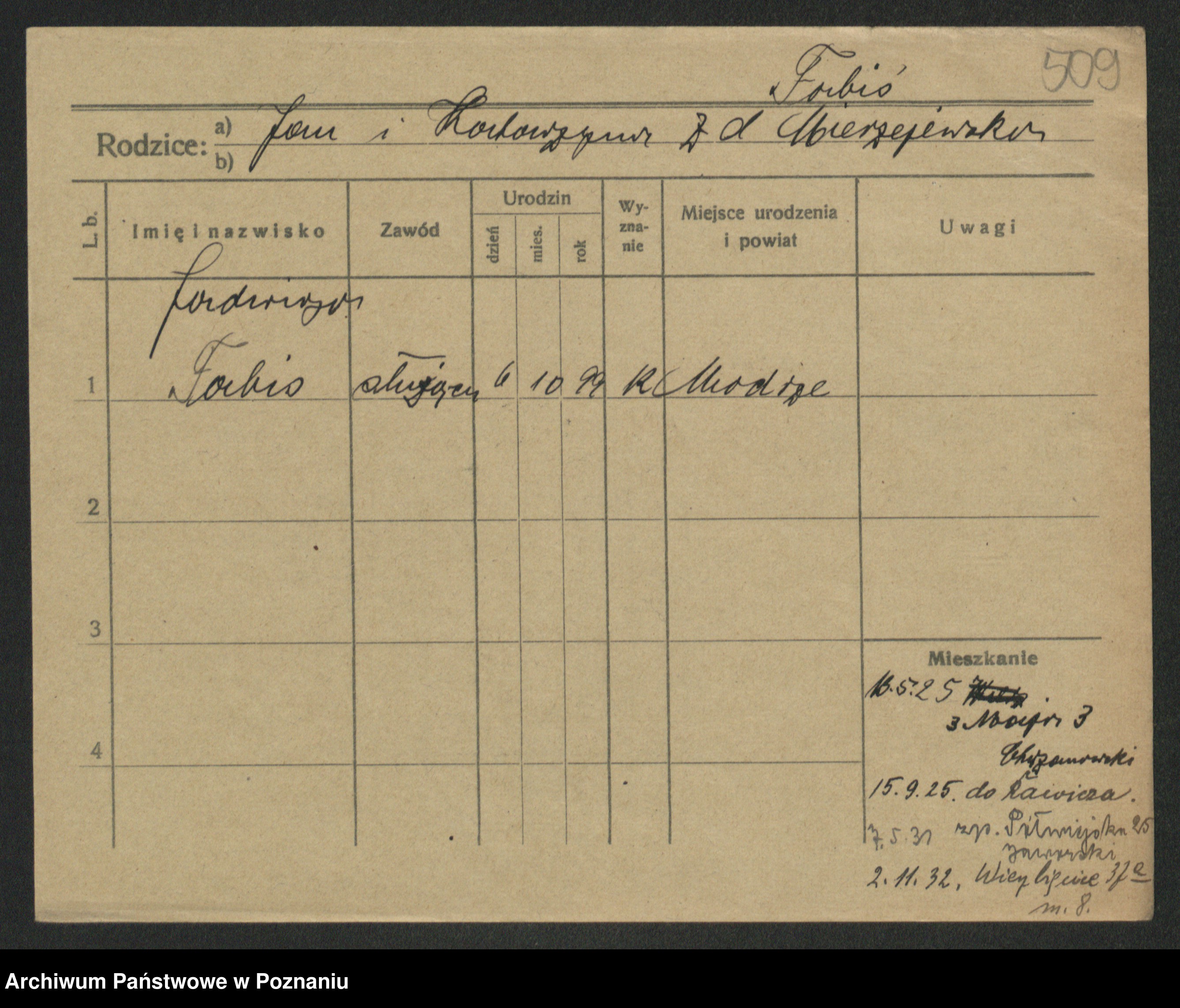 Podgląd karty osobowej dostępny jest po kliknięciu na nazwisko lub ikonkę karty. Można dokonywać powiększenia (ikony na górze) lub przechodzić między kolejnymi skanami (strzałki po bokach).