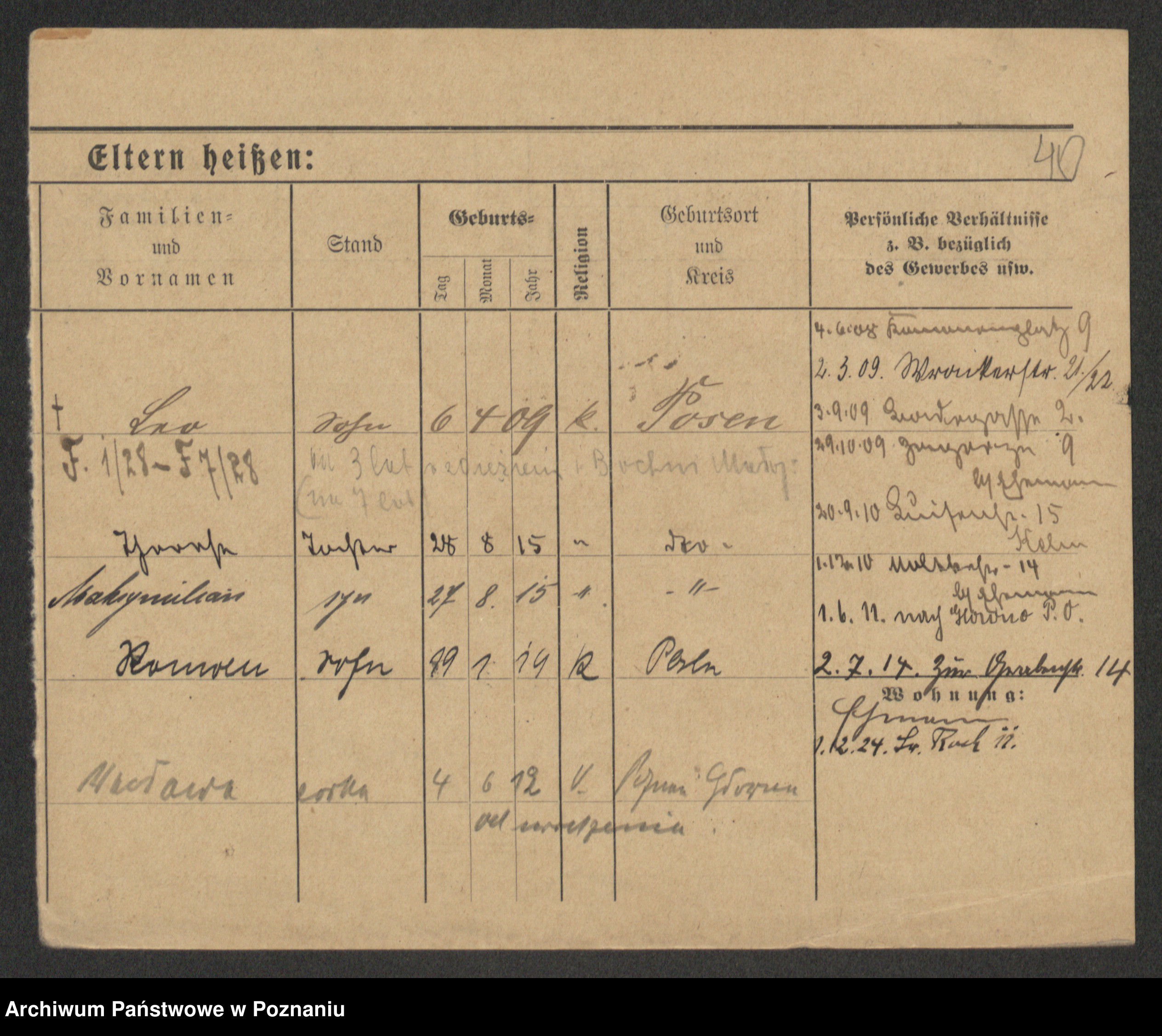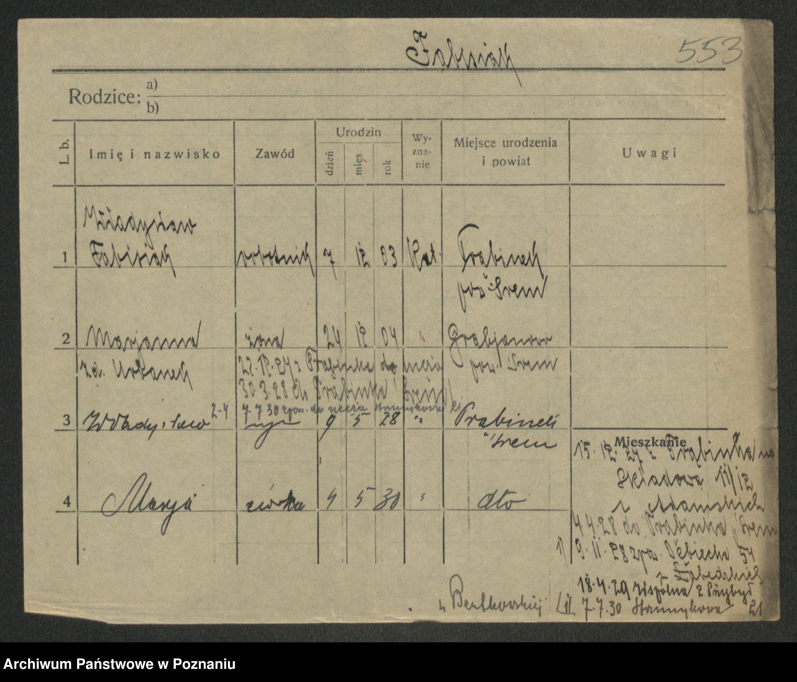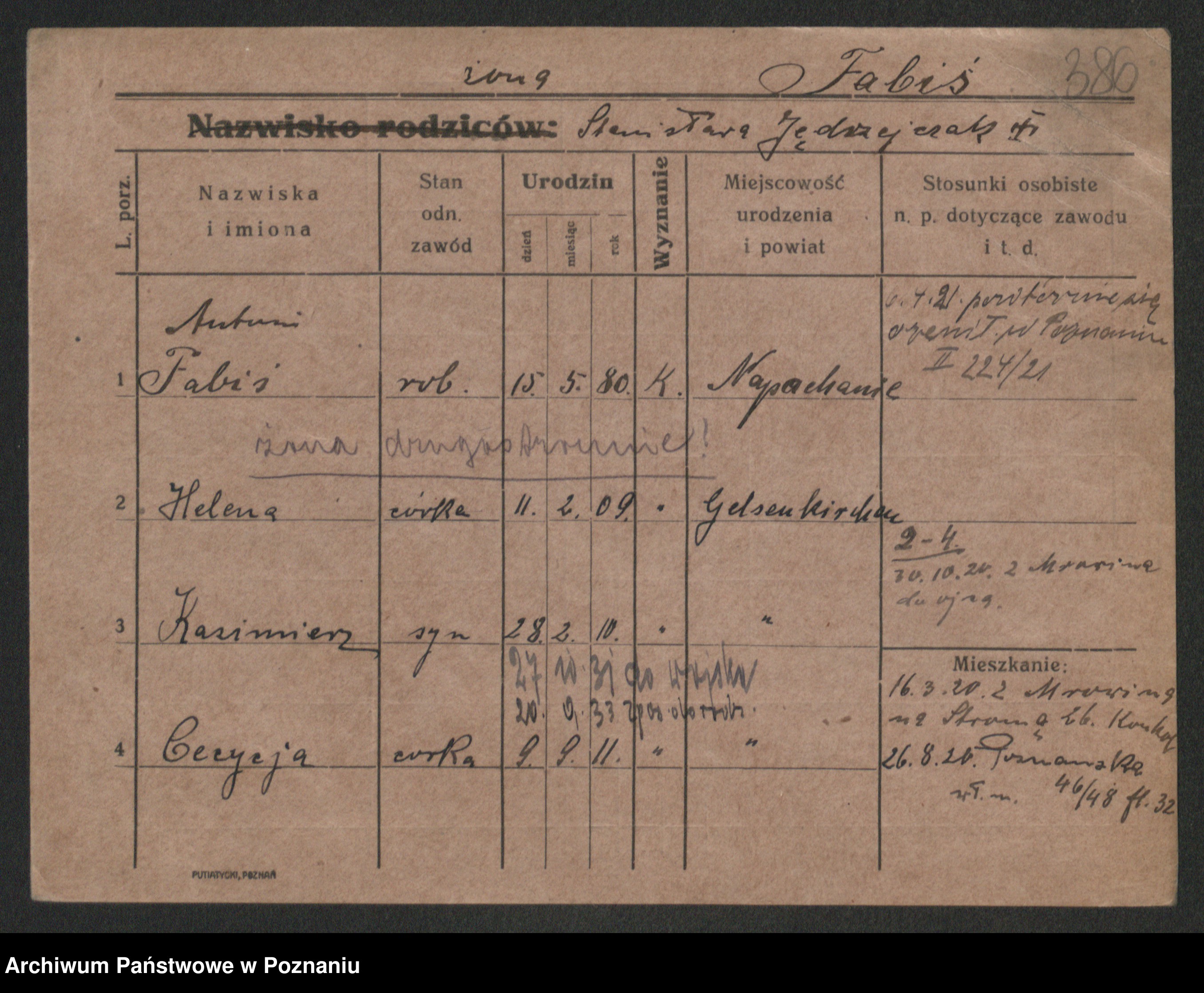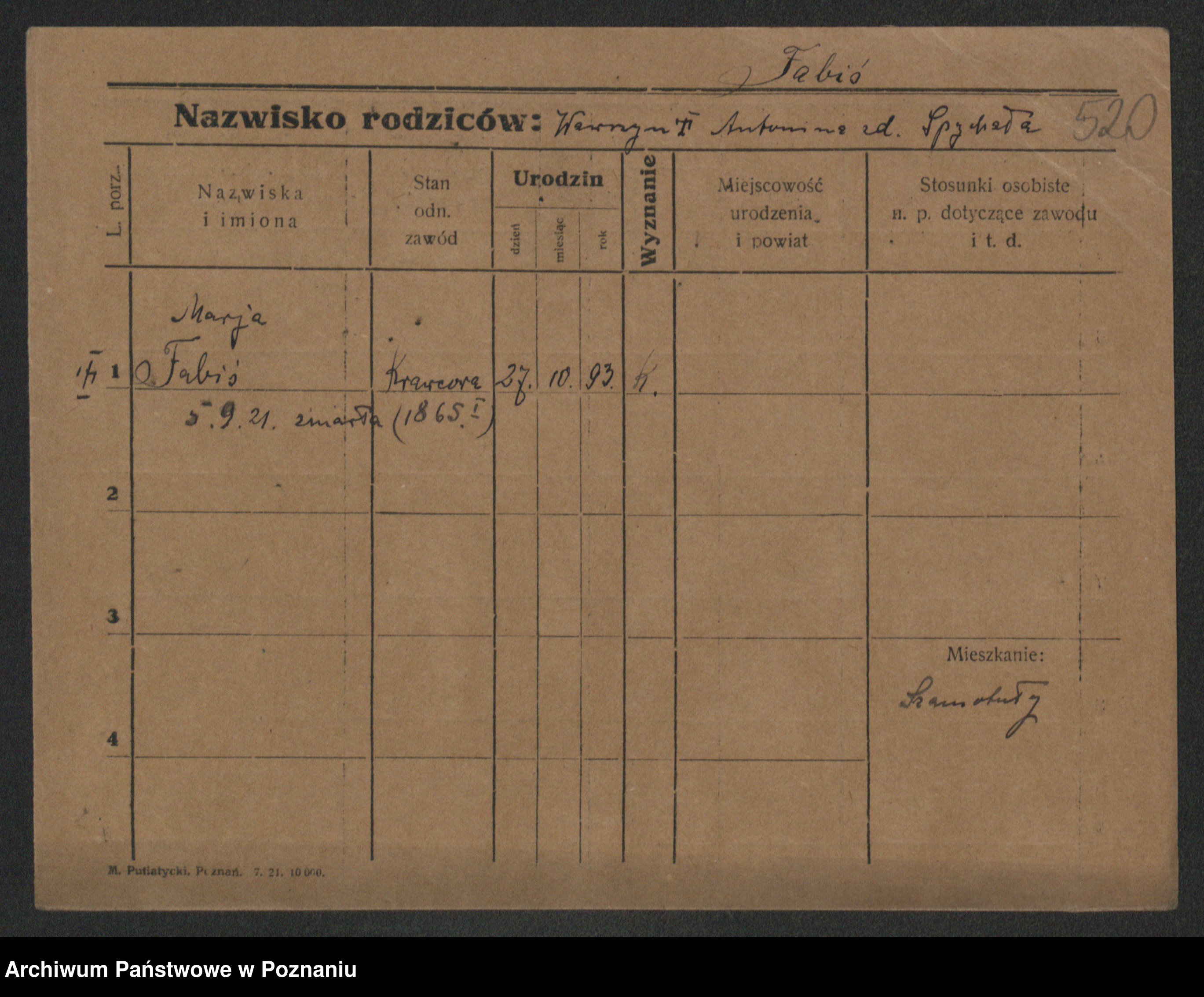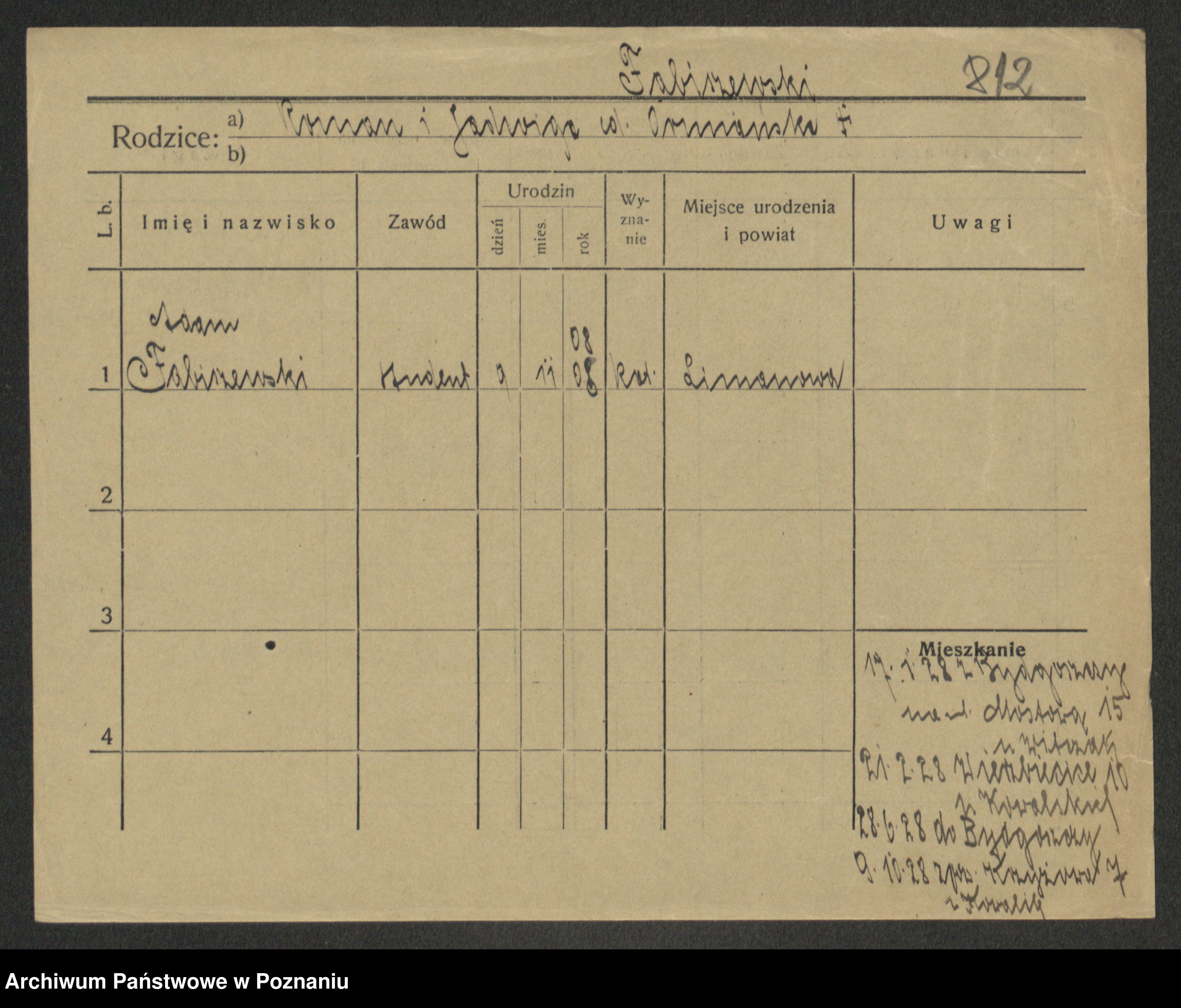 Podgląd karty osobowej dostępny jest po kliknięciu na nazwisko lub ikonkę karty. Można dokonywać powiększenia (ikony na górze) lub przechodzić między kolejnymi skanami (strzałki po bokach).