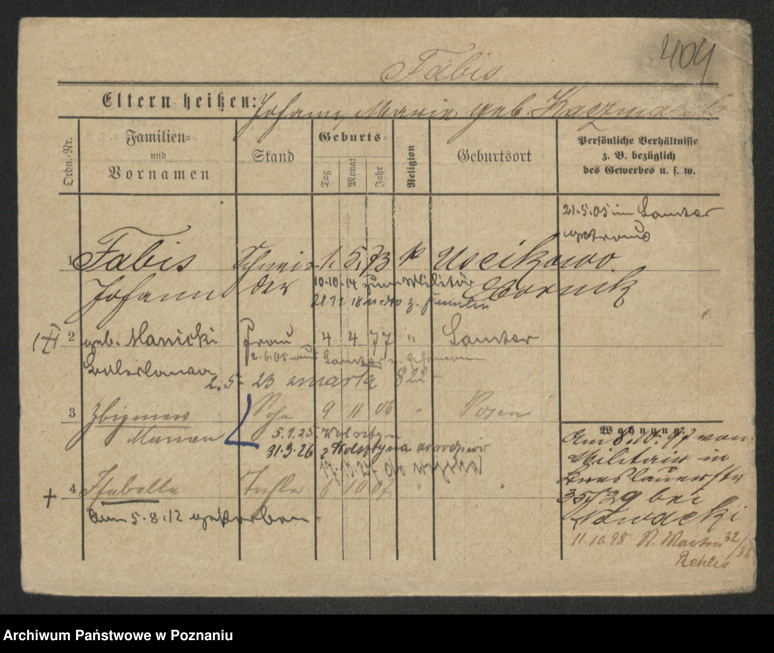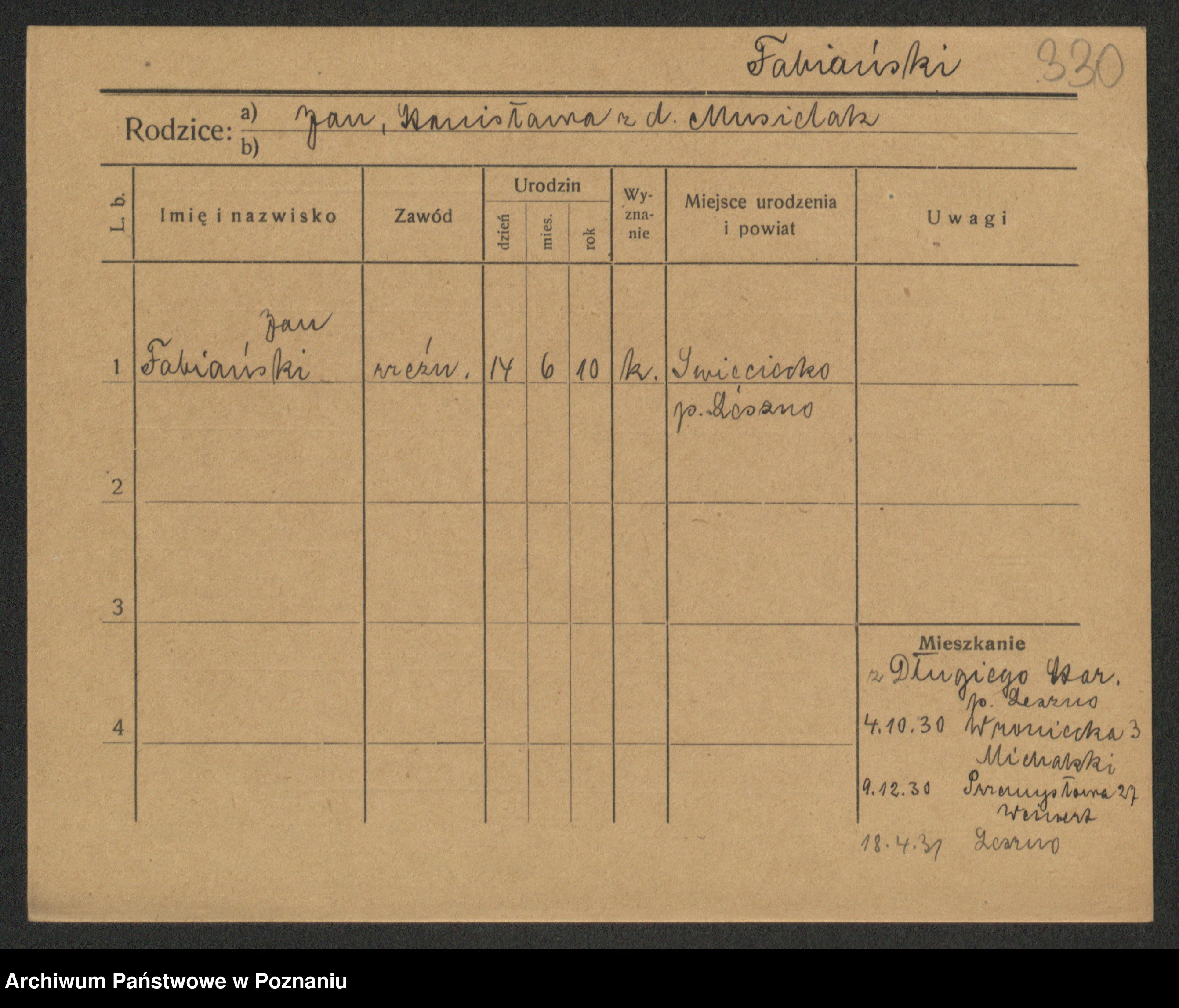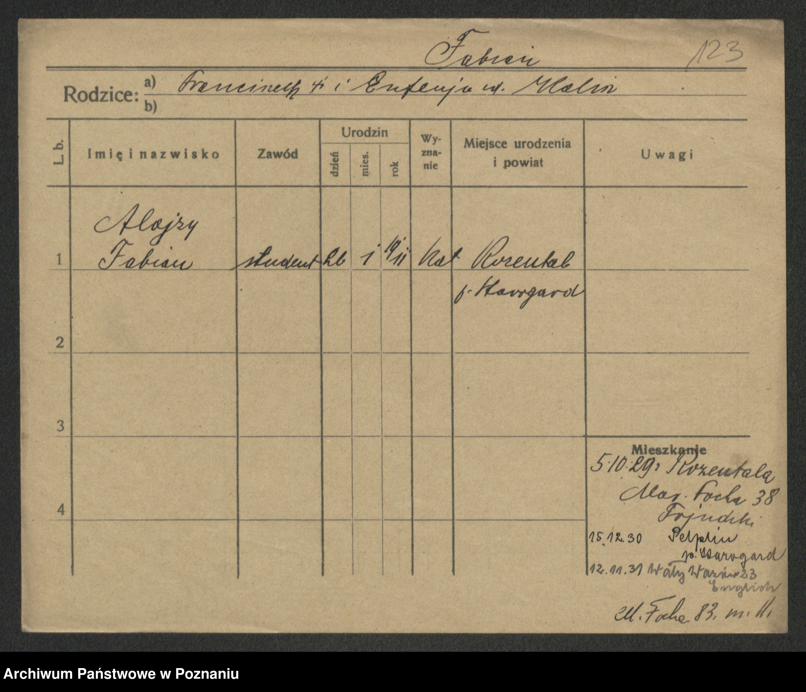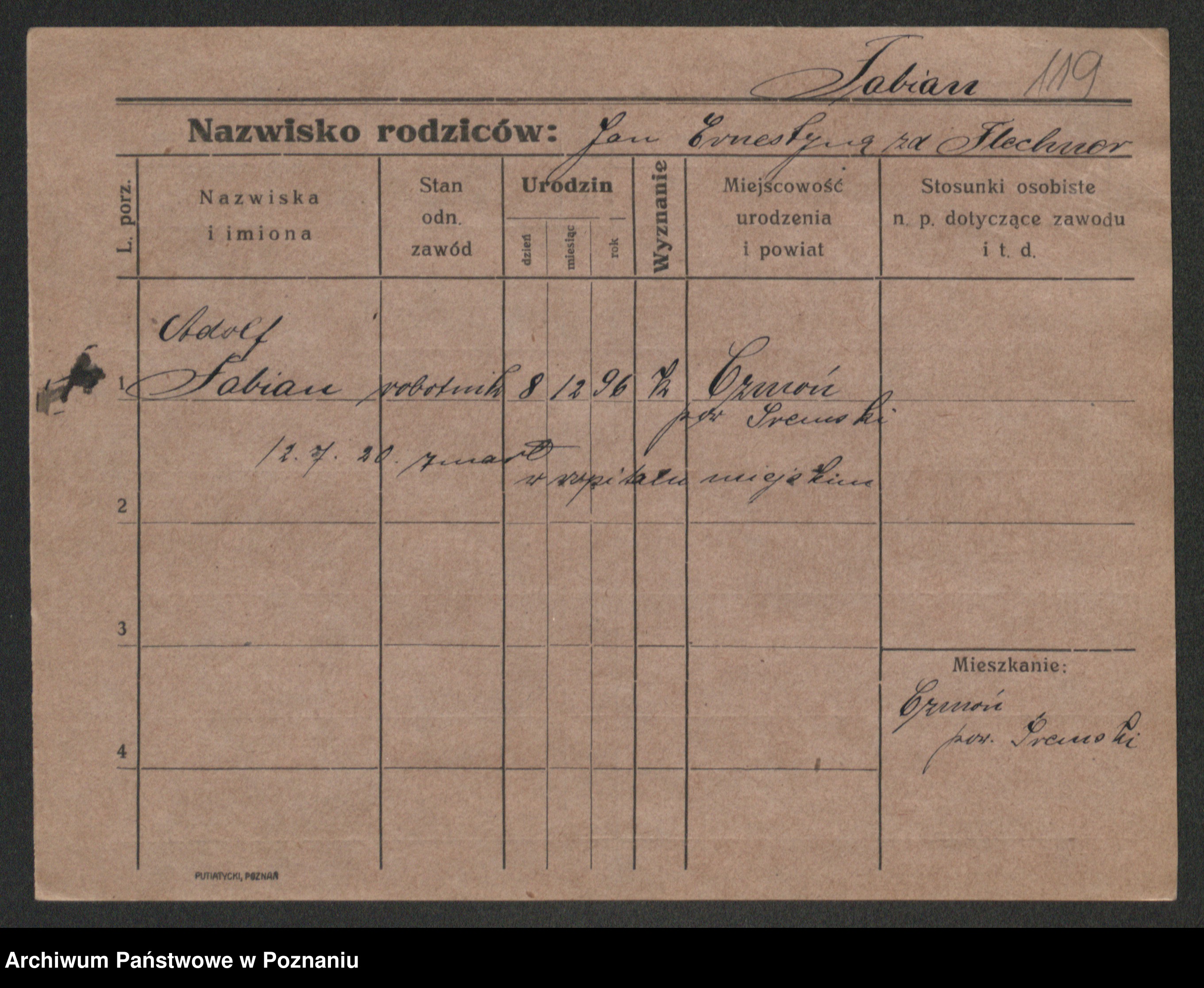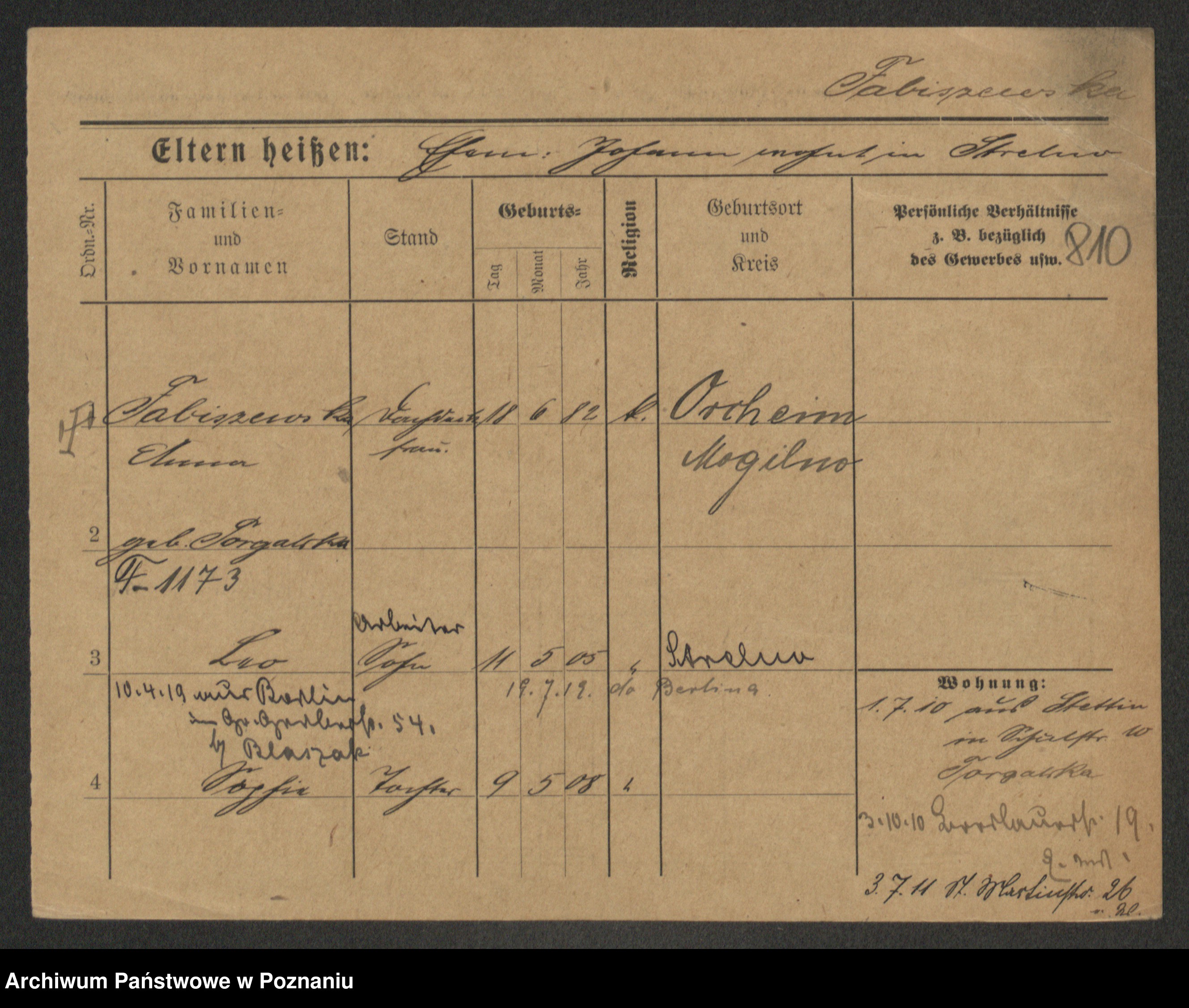 Podgląd karty osobowej dostępny jest po kliknięciu na nazwisko lub ikonkę karty. Można dokonywać powiększenia (ikony na górze) lub przechodzić między kolejnymi skanami (strzałki po bokach).