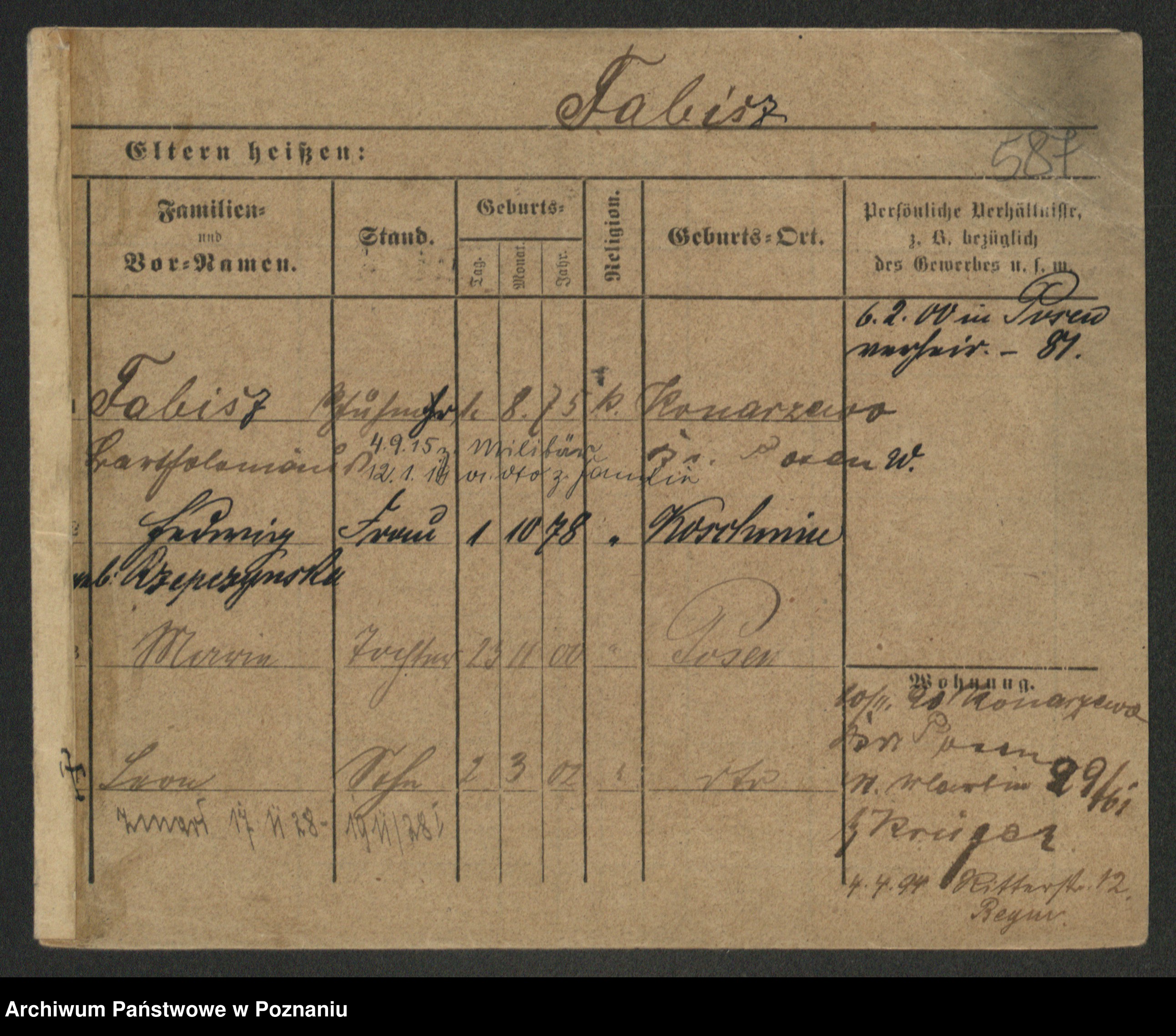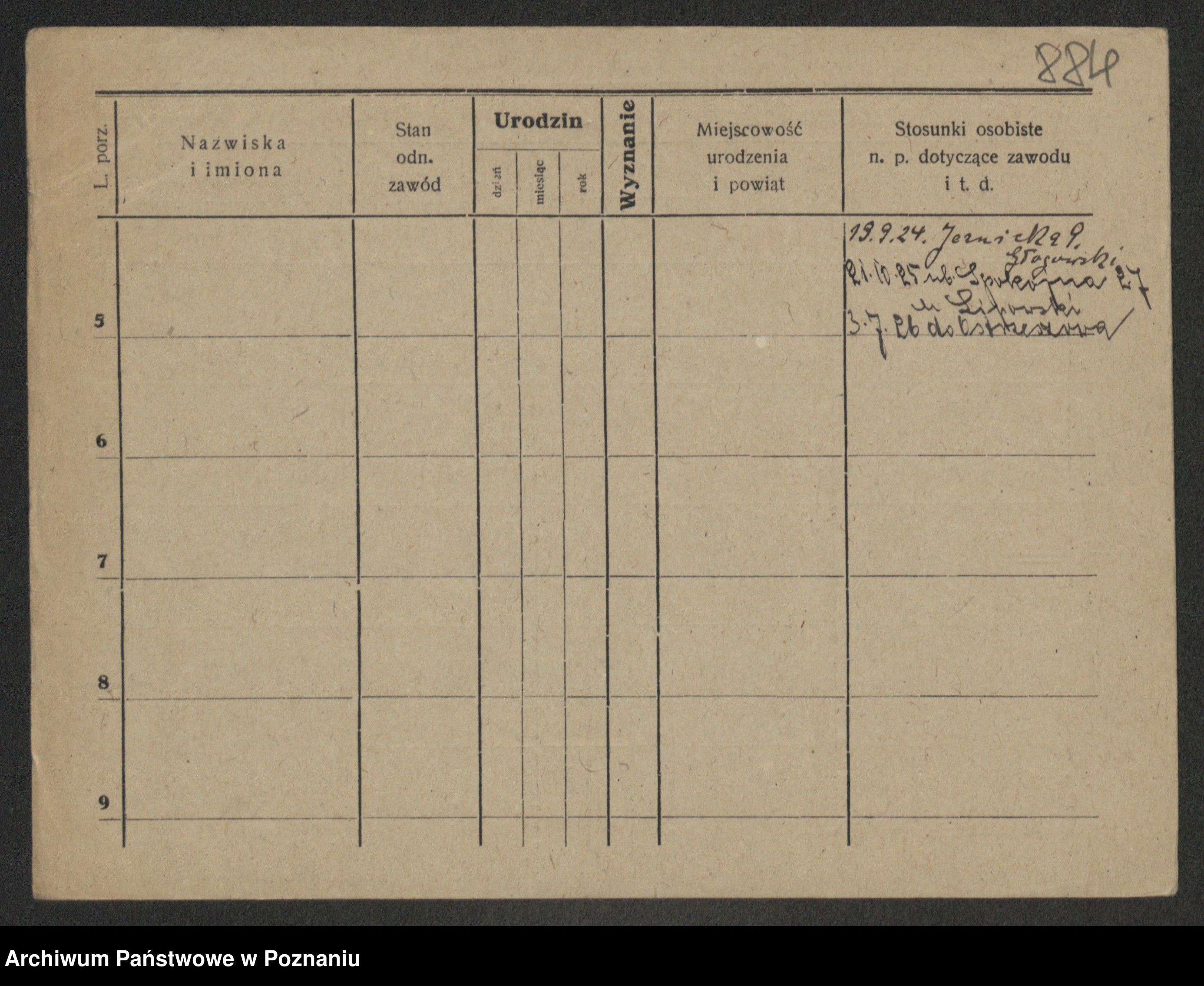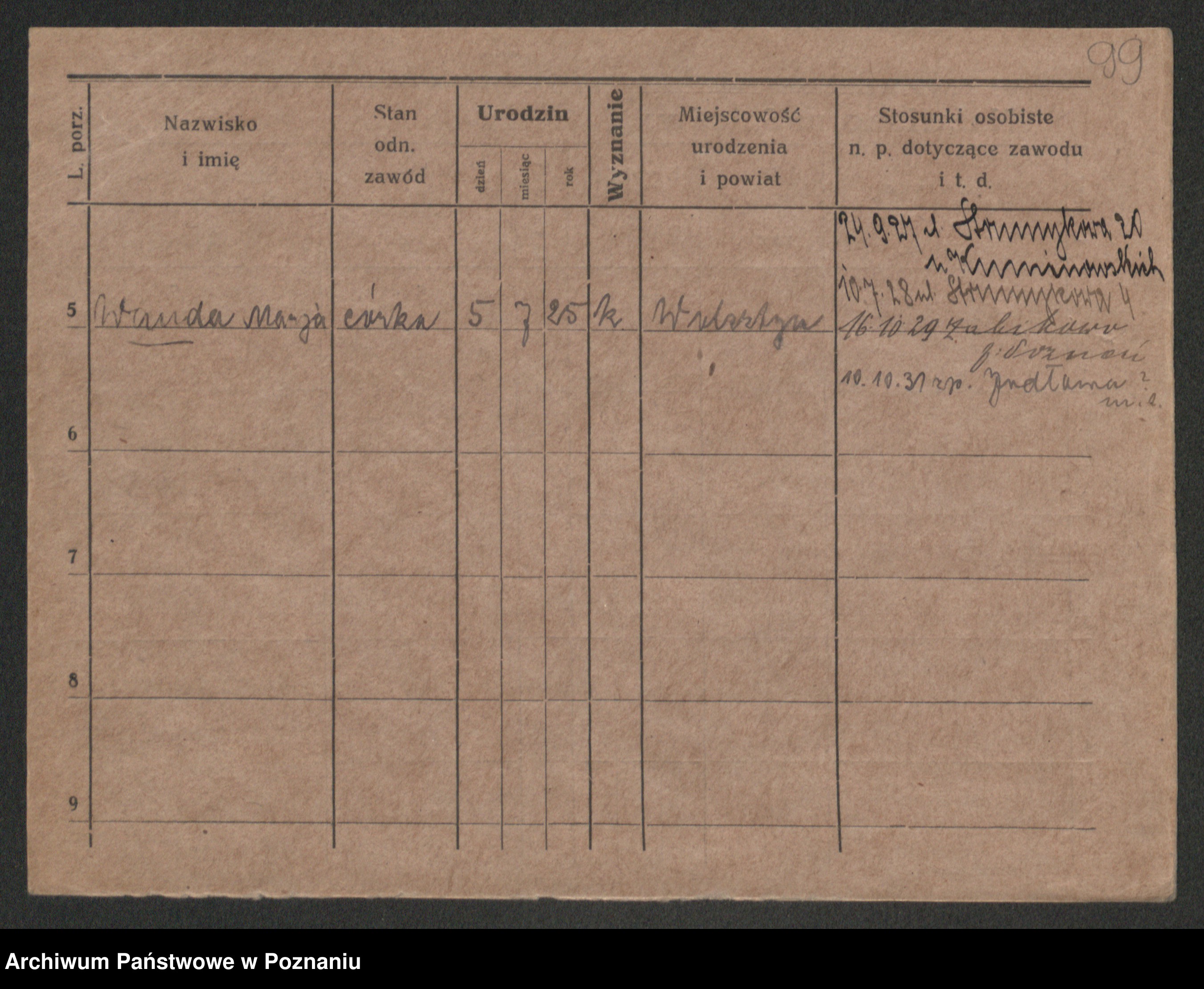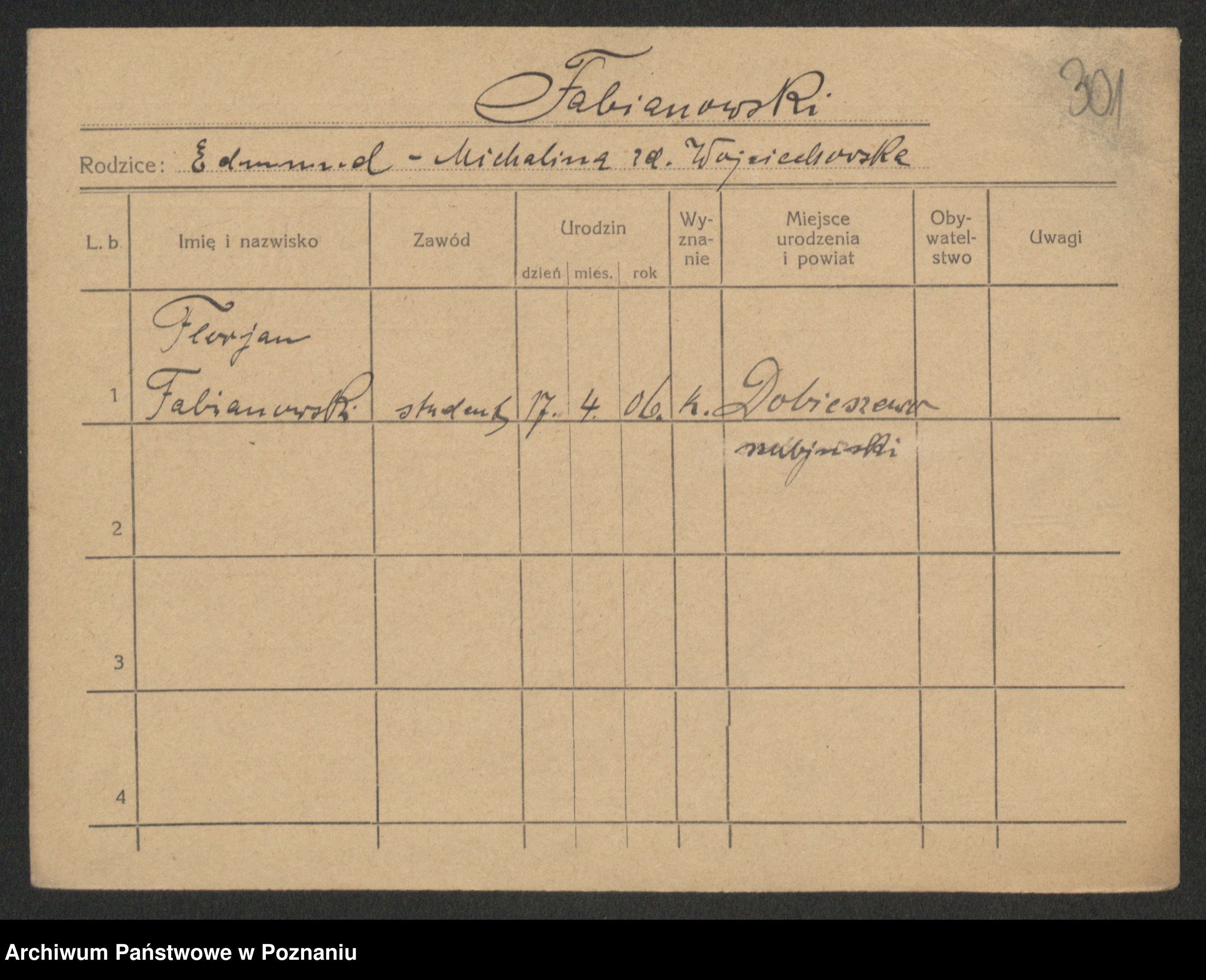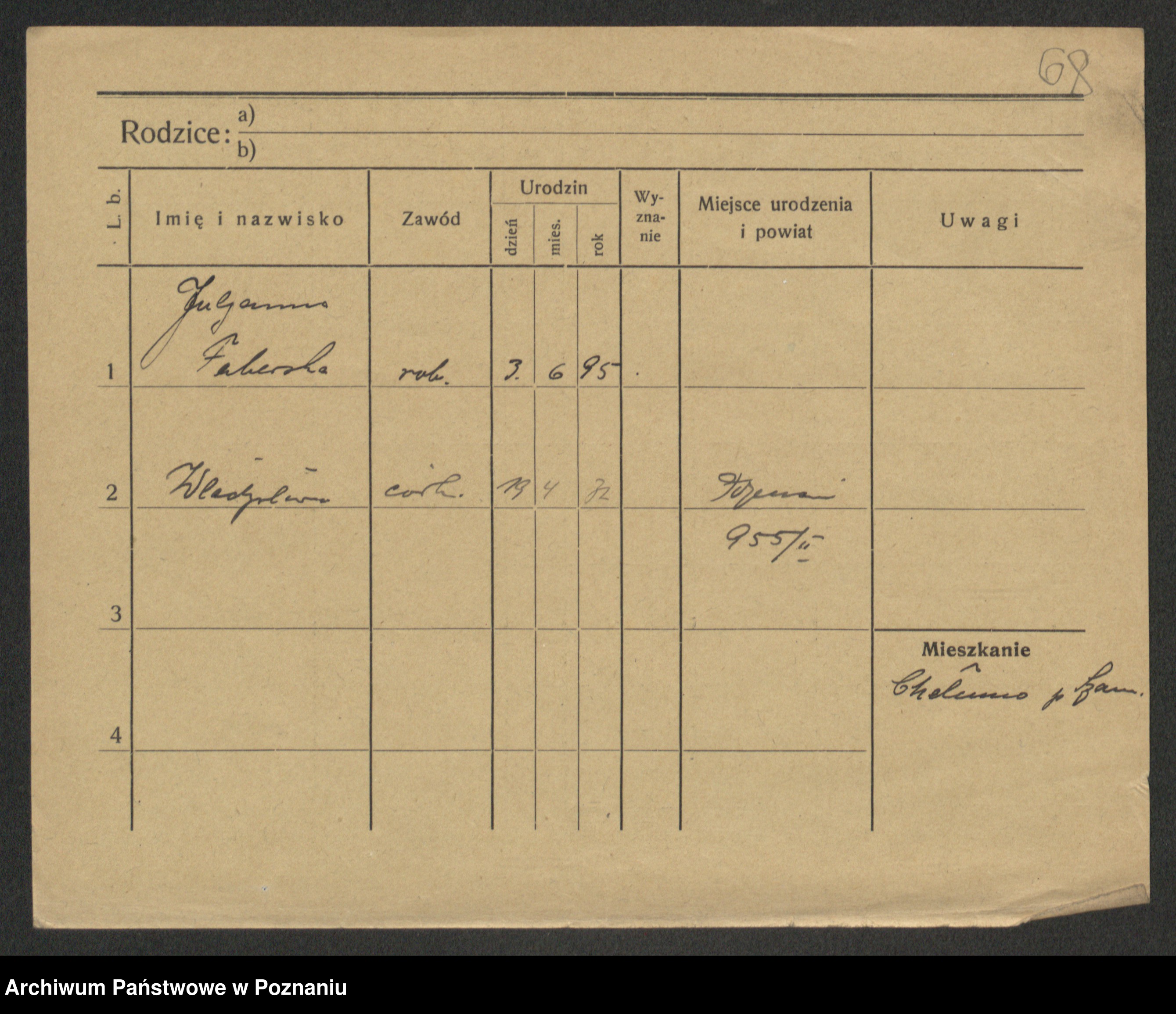 Podgląd karty osobowej dostępny jest po kliknięciu na nazwisko lub ikonkę karty. Można dokonywać powiększenia (ikony na górze) lub przechodzić między kolejnymi skanami (strzałki po bokach).