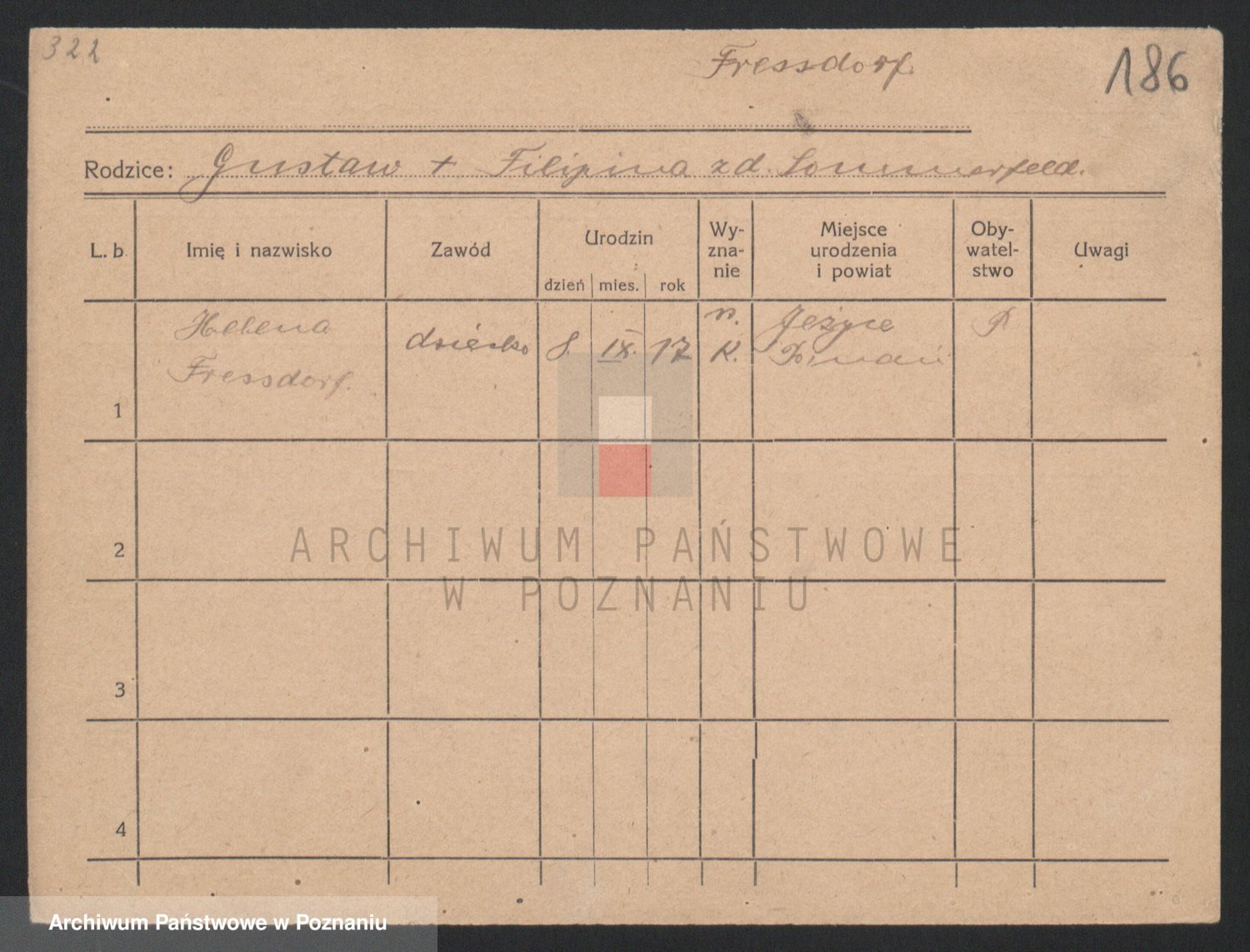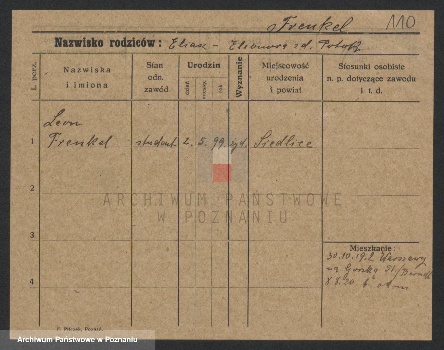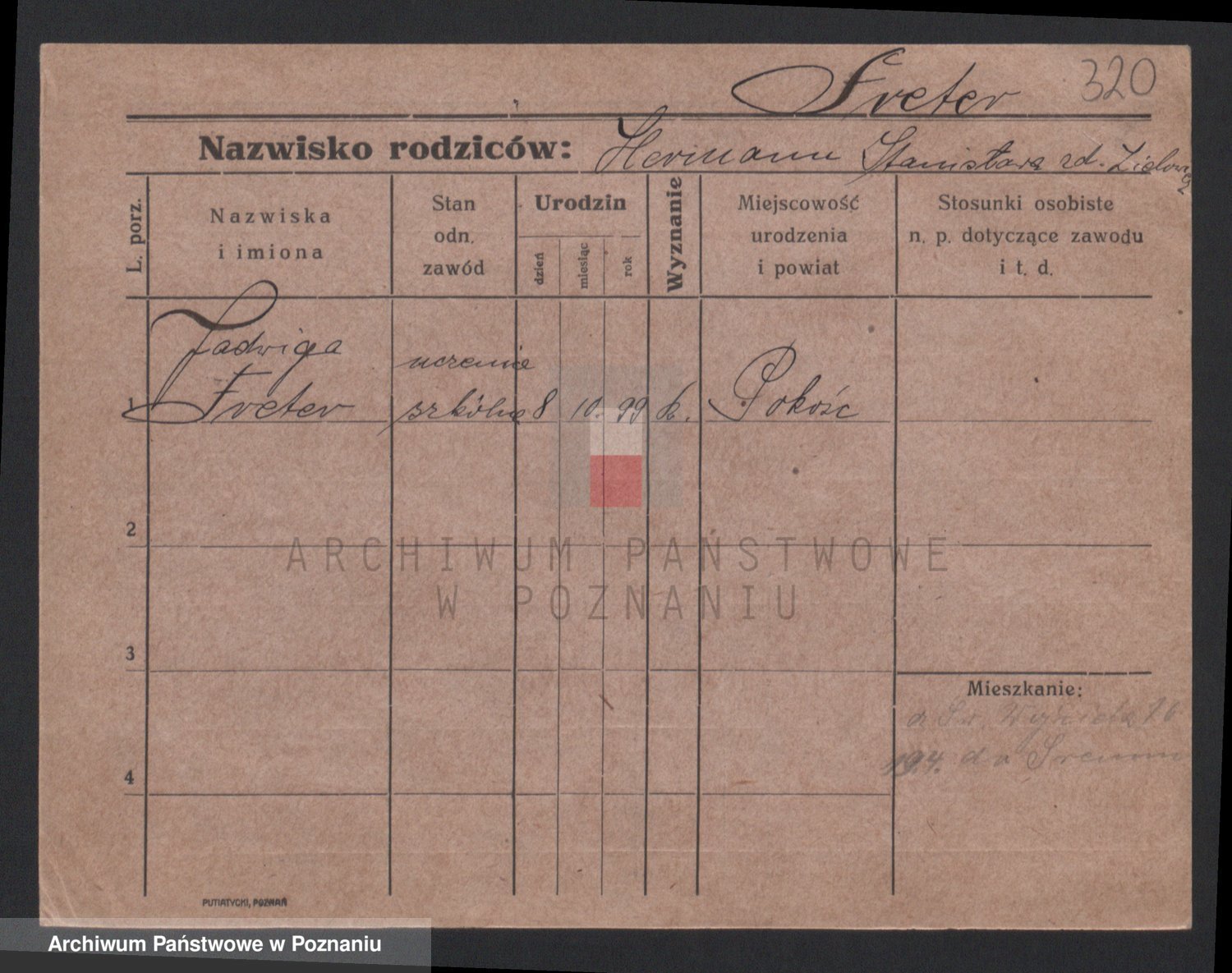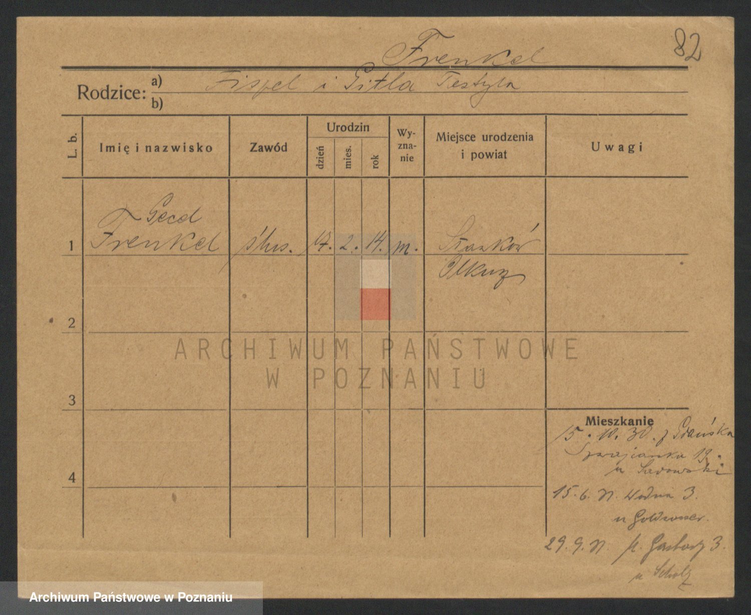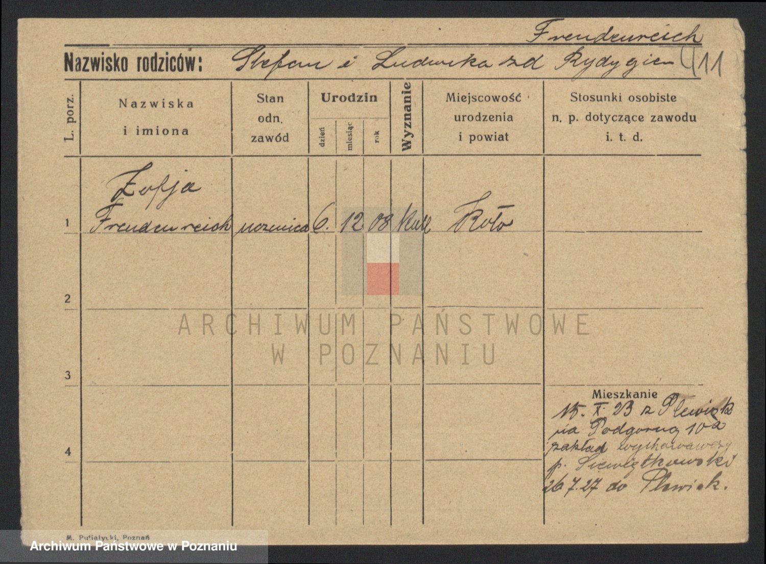 Podgląd karty osobowej dostępny jest po kliknięciu na nazwisko lub ikonkę karty. Można dokonywać powiększenia (ikony na górze) lub przechodzić między kolejnymi skanami (strzałki po bokach).