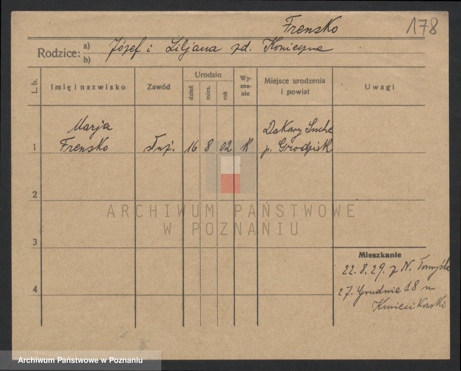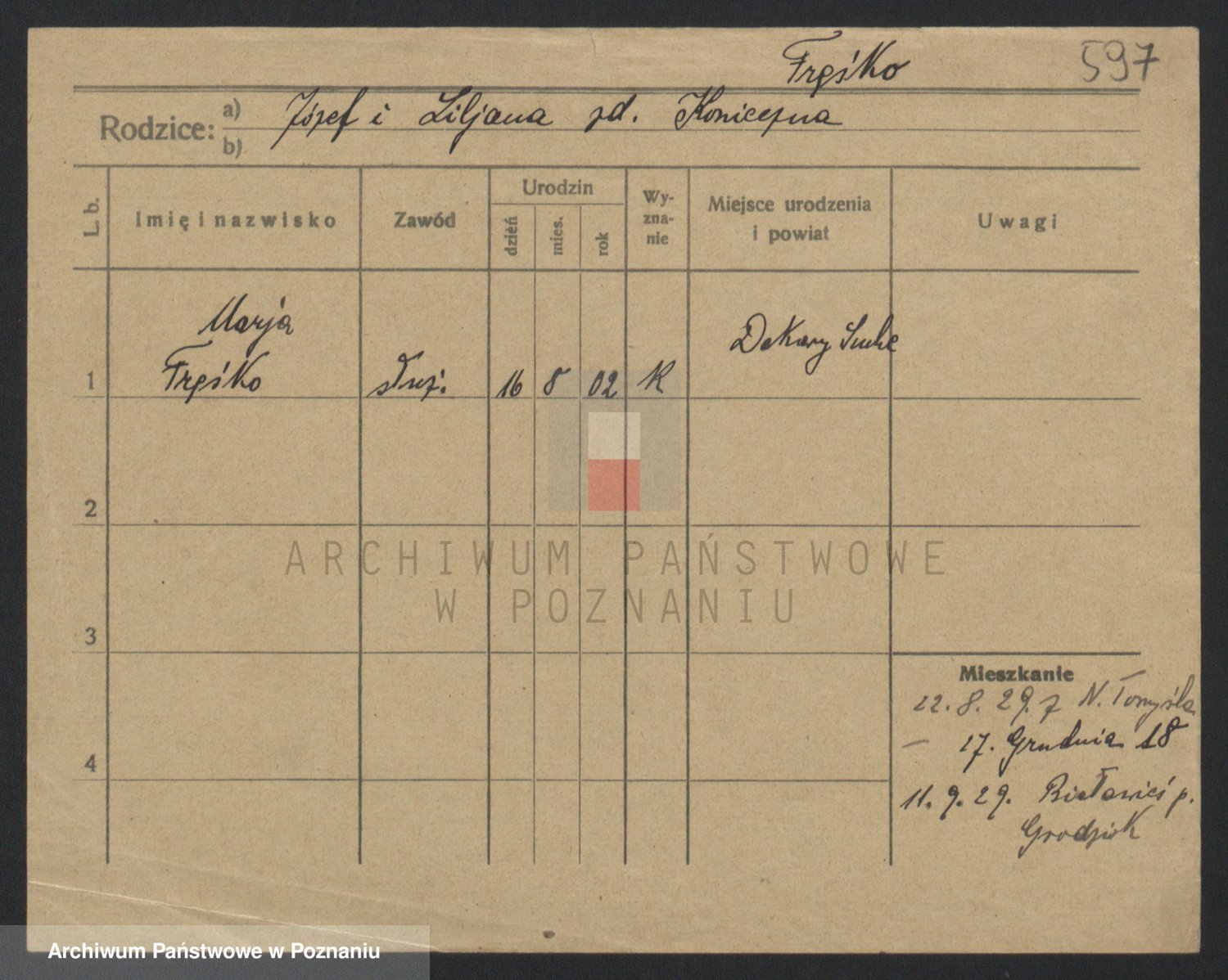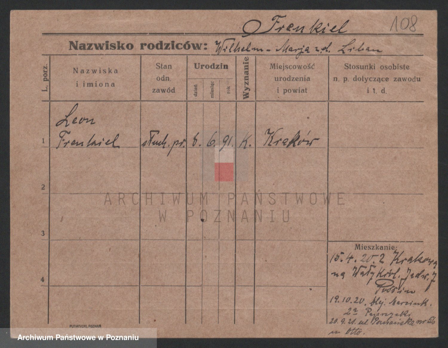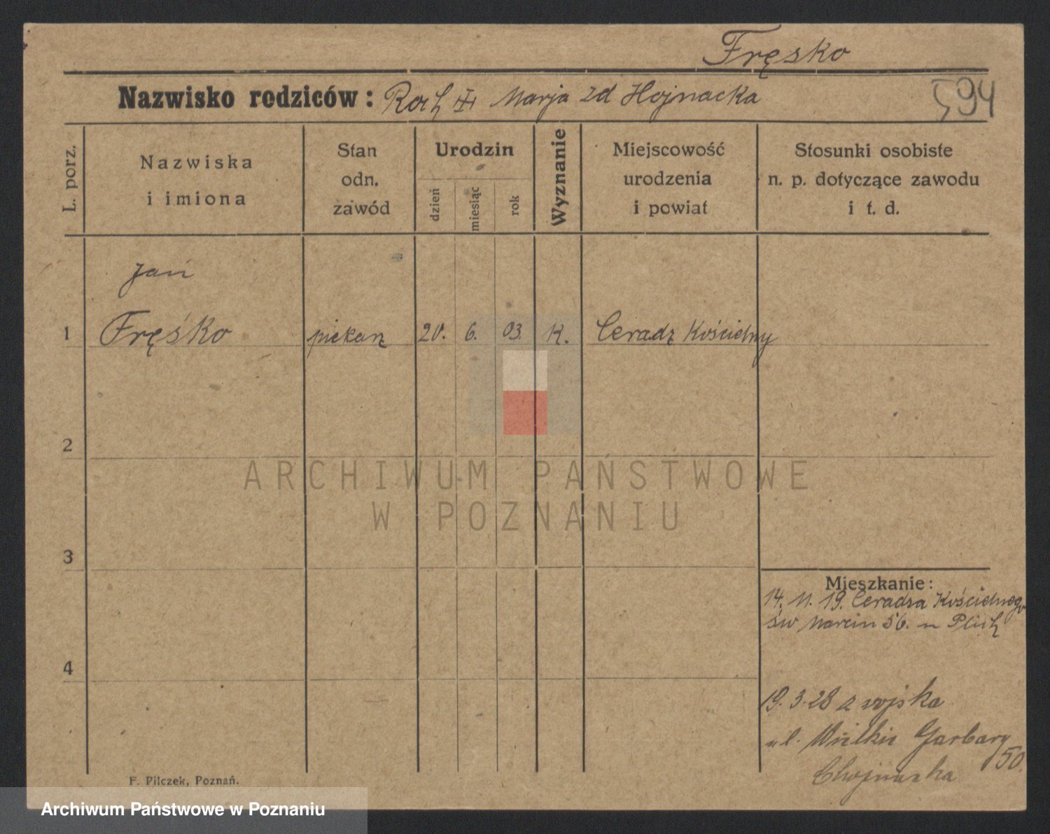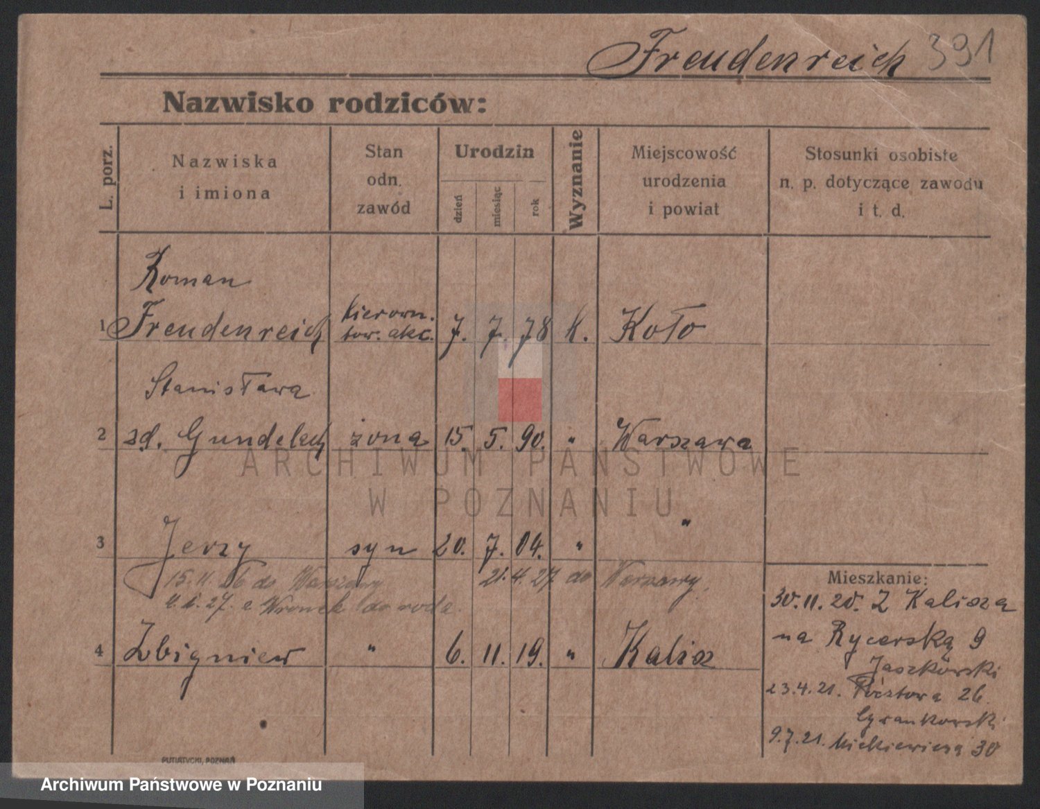 Podgląd karty osobowej dostępny jest po kliknięciu na nazwisko lub ikonkę karty. Można dokonywać powiększenia (ikony na górze) lub przechodzić między kolejnymi skanami (strzałki po bokach).