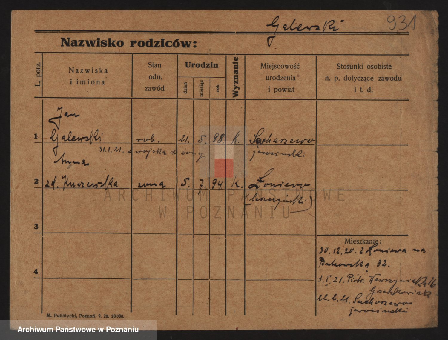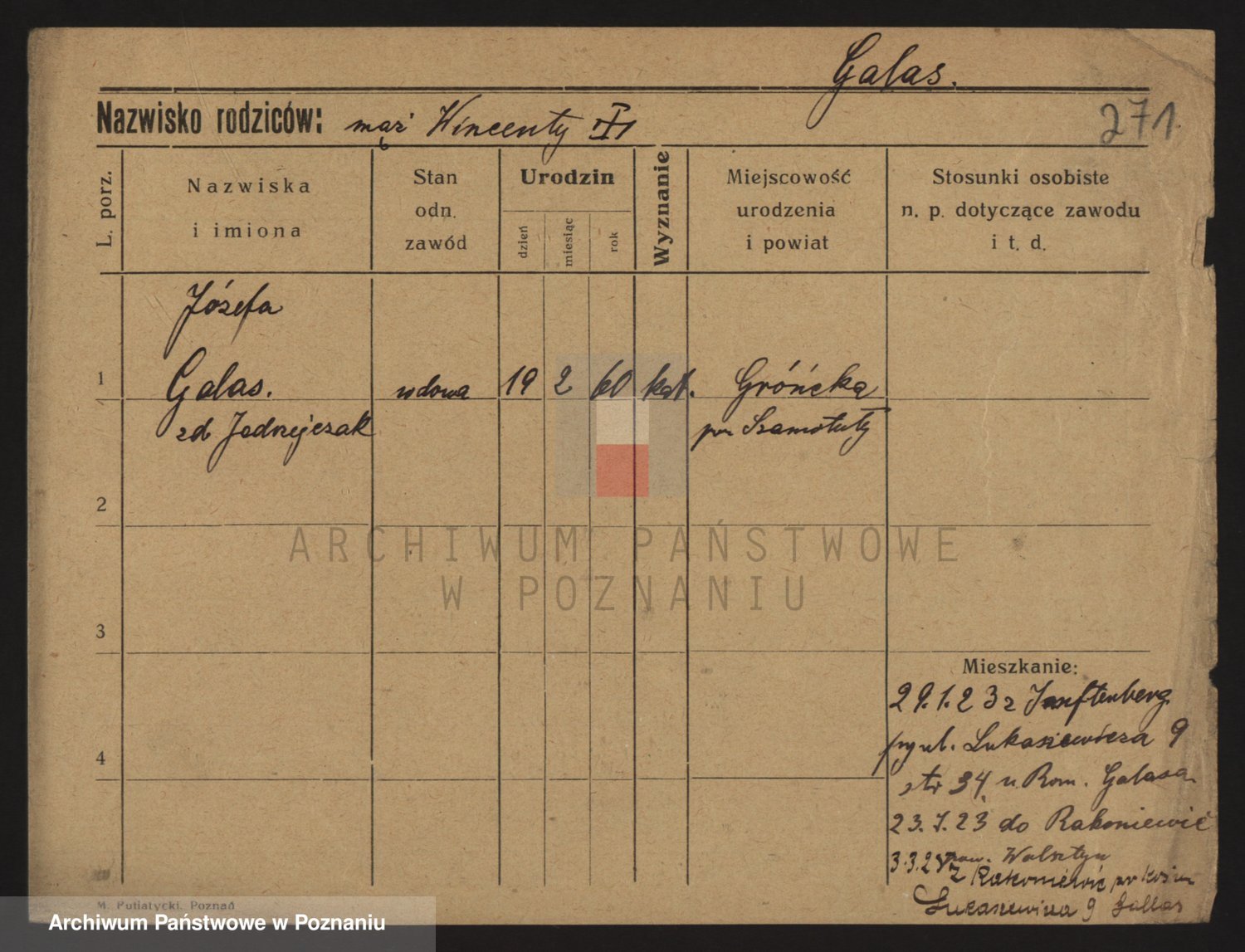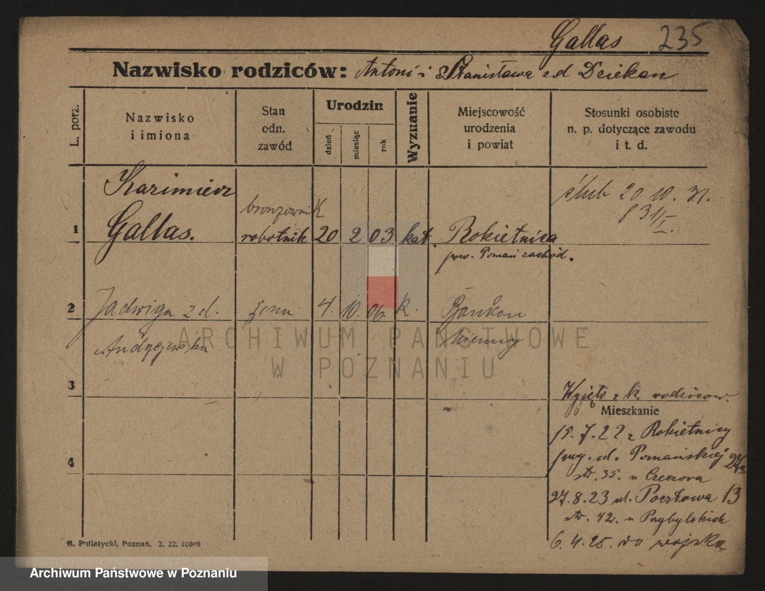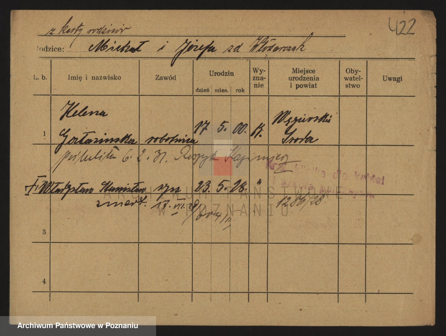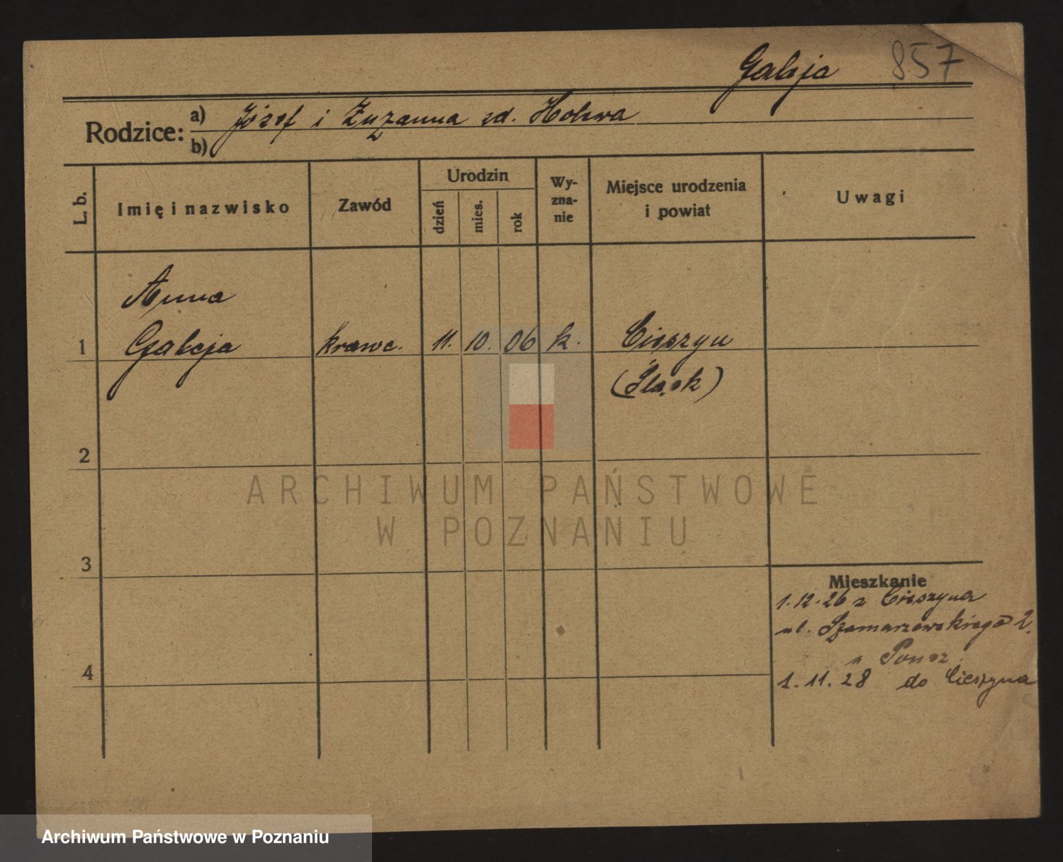 Podgląd karty osobowej dostępny jest po kliknięciu na nazwisko lub ikonkę karty. Można dokonywać powiększenia (ikony na górze) lub przechodzić między kolejnymi skanami (strzałki po bokach).