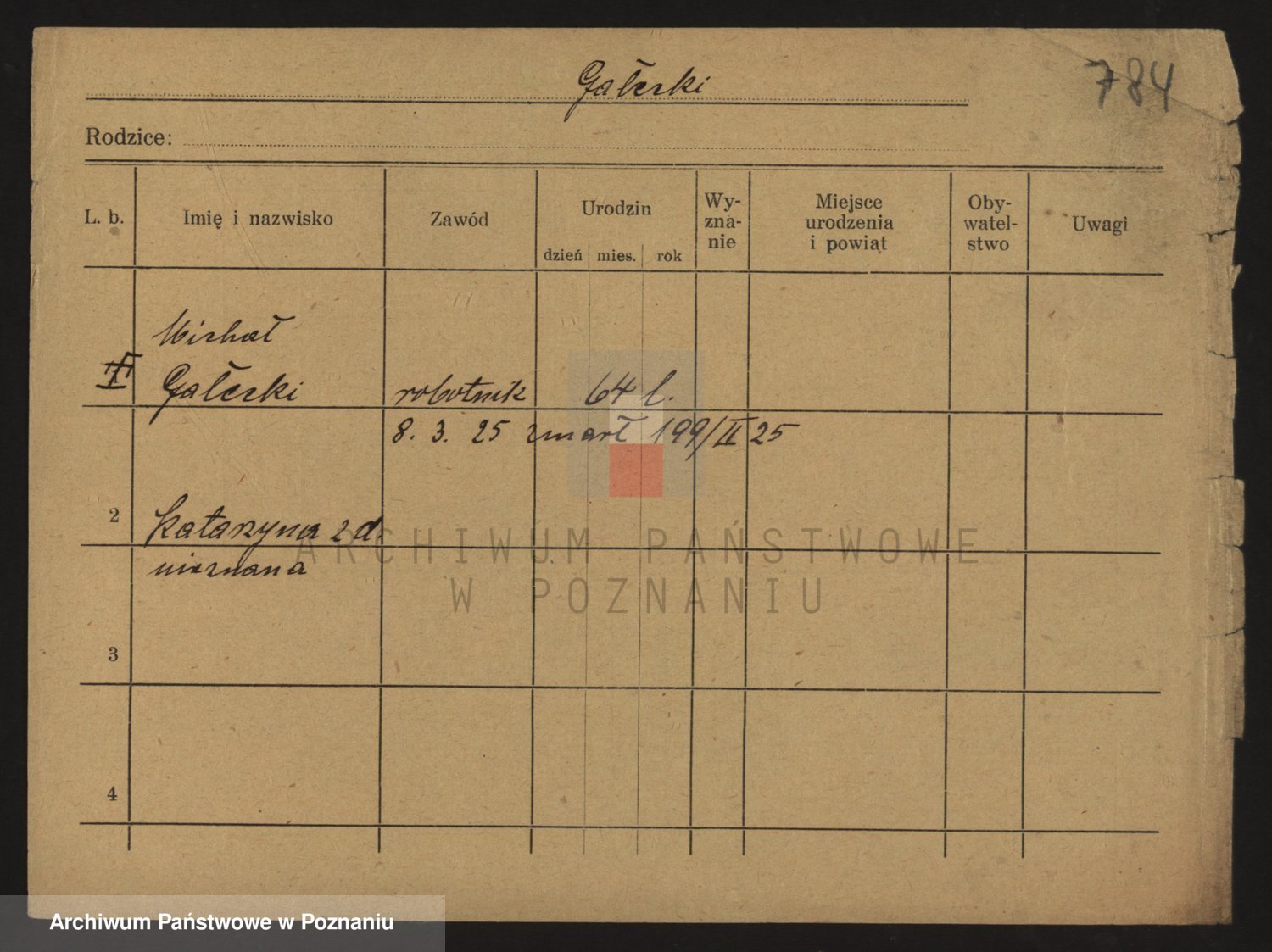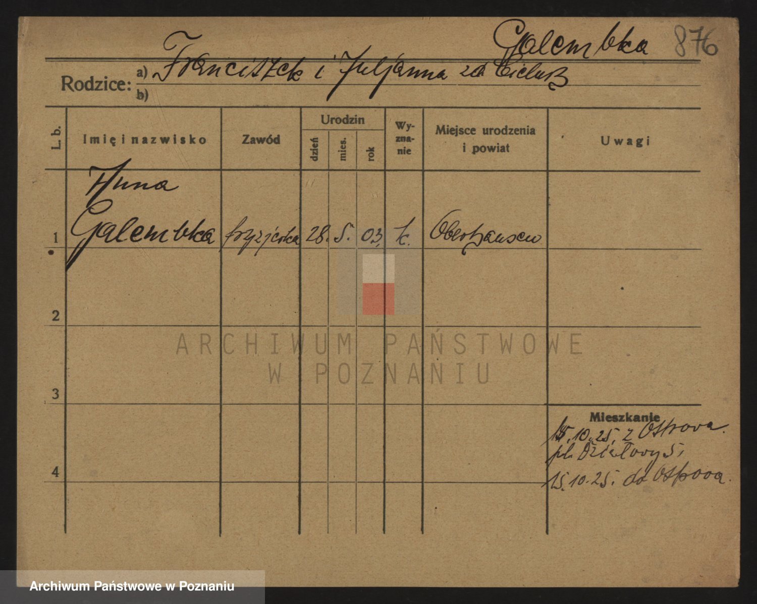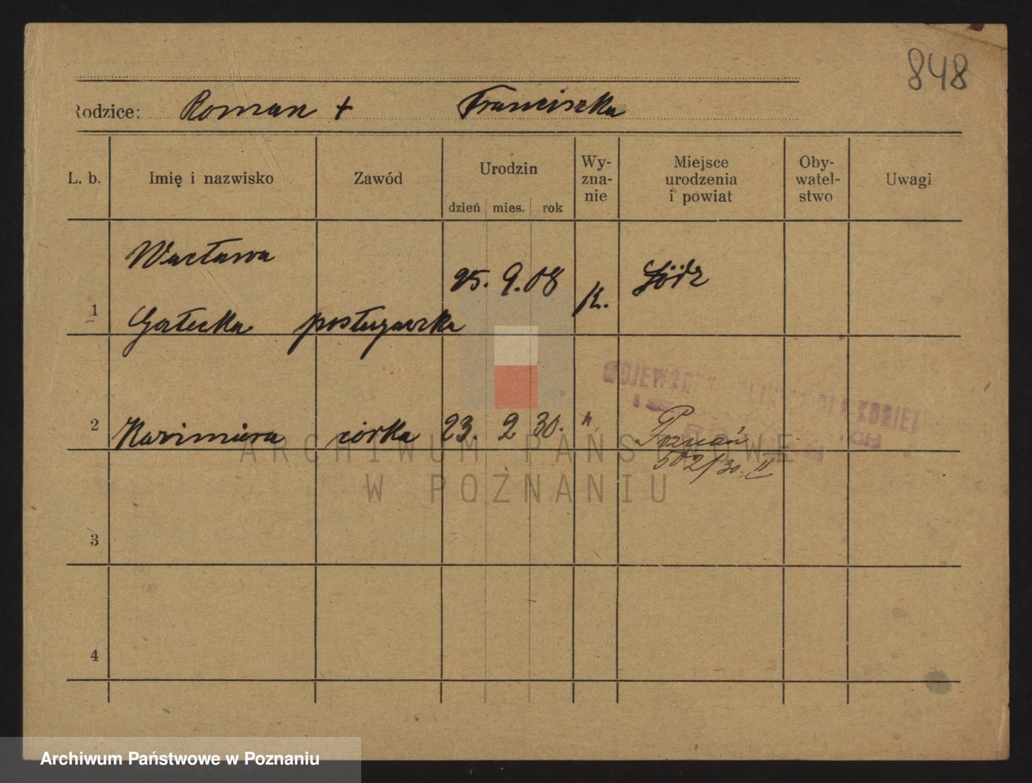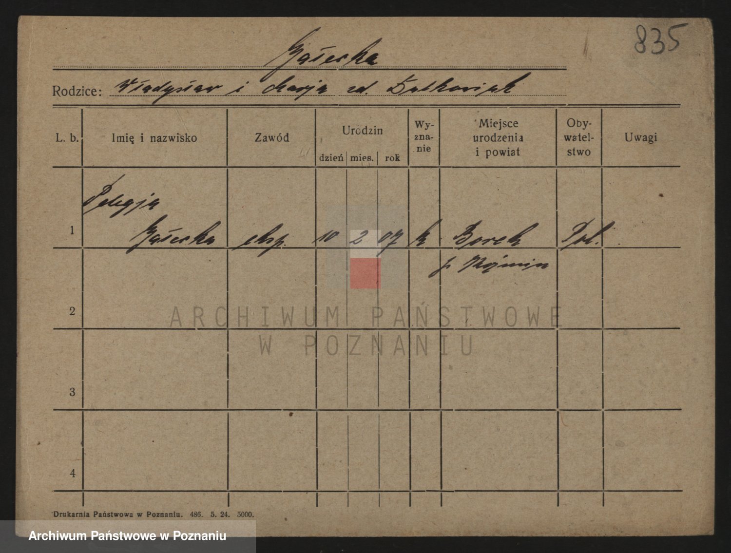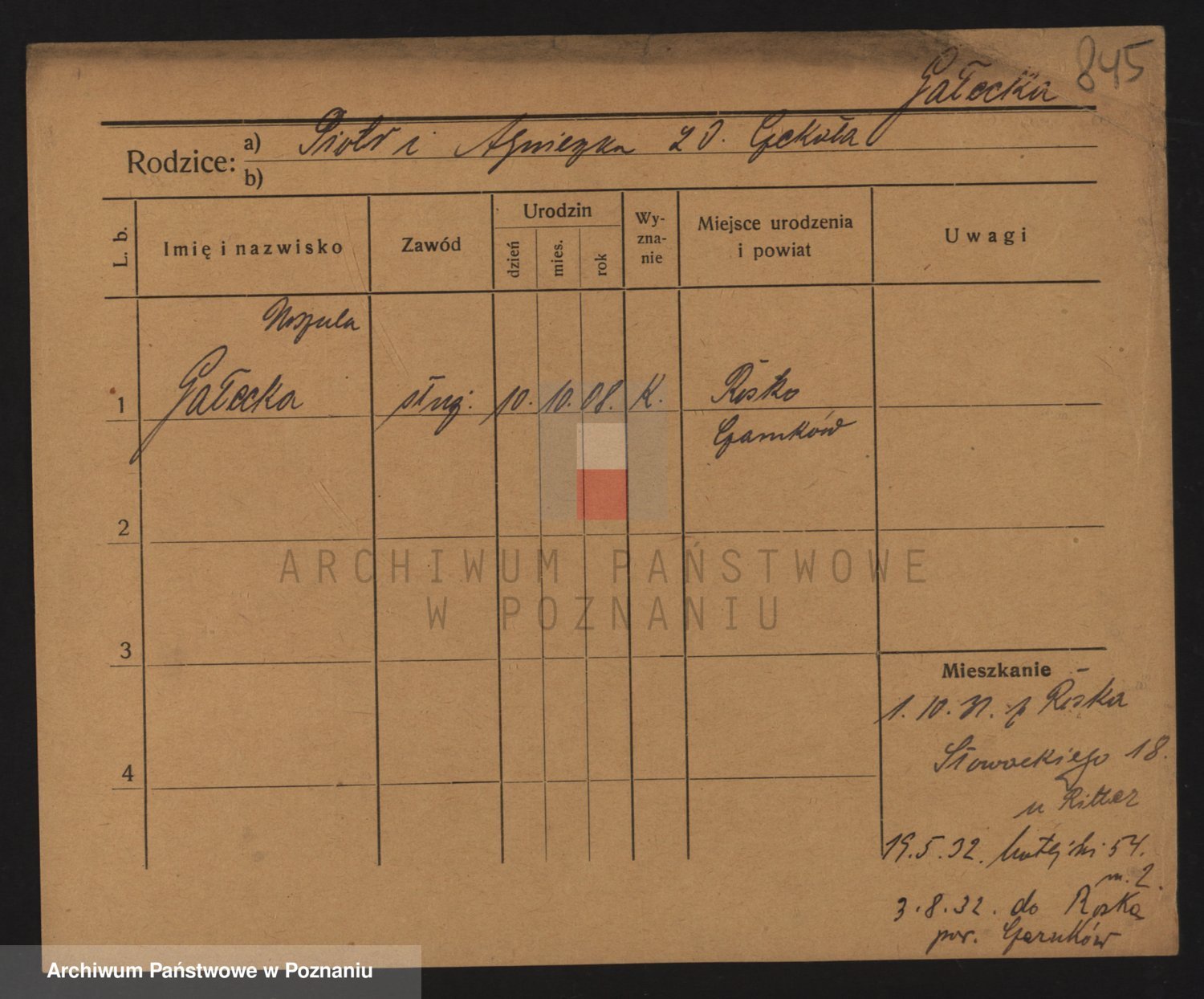 Podgląd karty osobowej dostępny jest po kliknięciu na nazwisko lub ikonkę karty. Można dokonywać powiększenia (ikony na górze) lub przechodzić między kolejnymi skanami (strzałki po bokach).