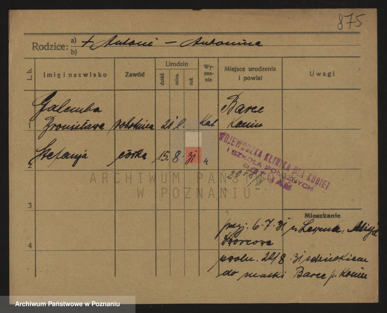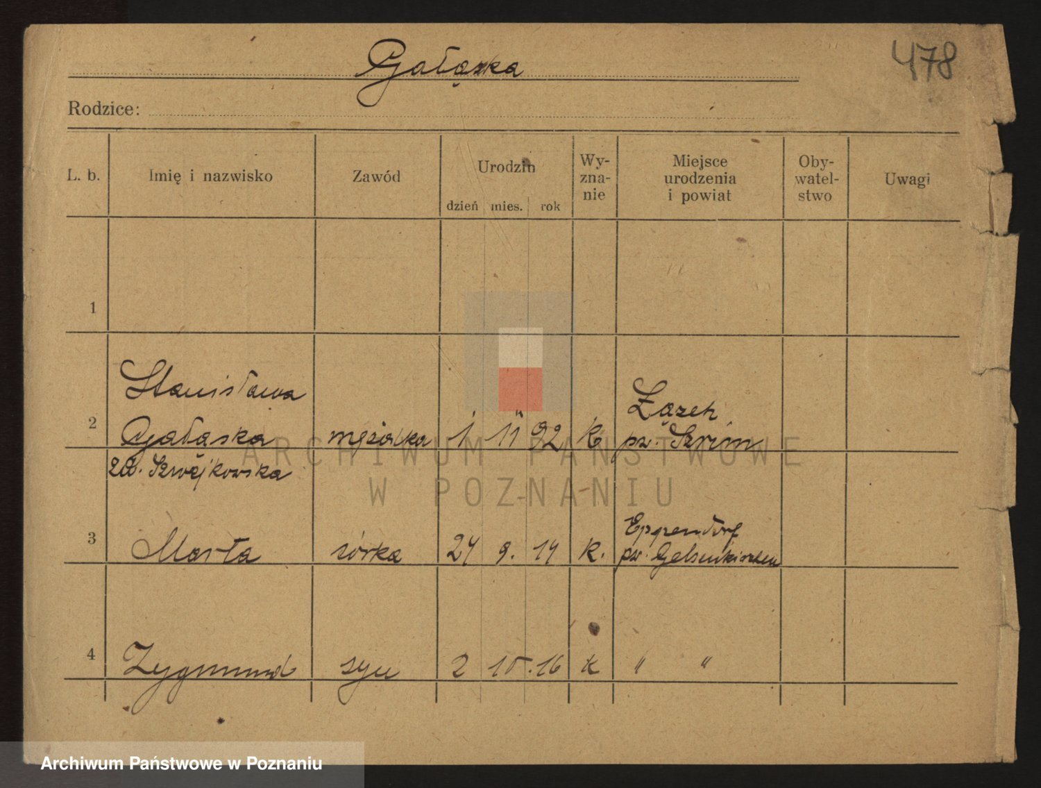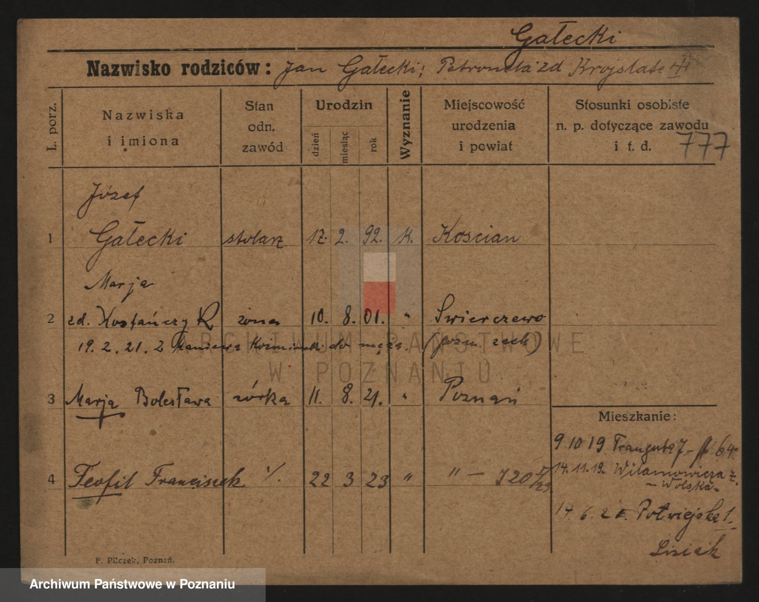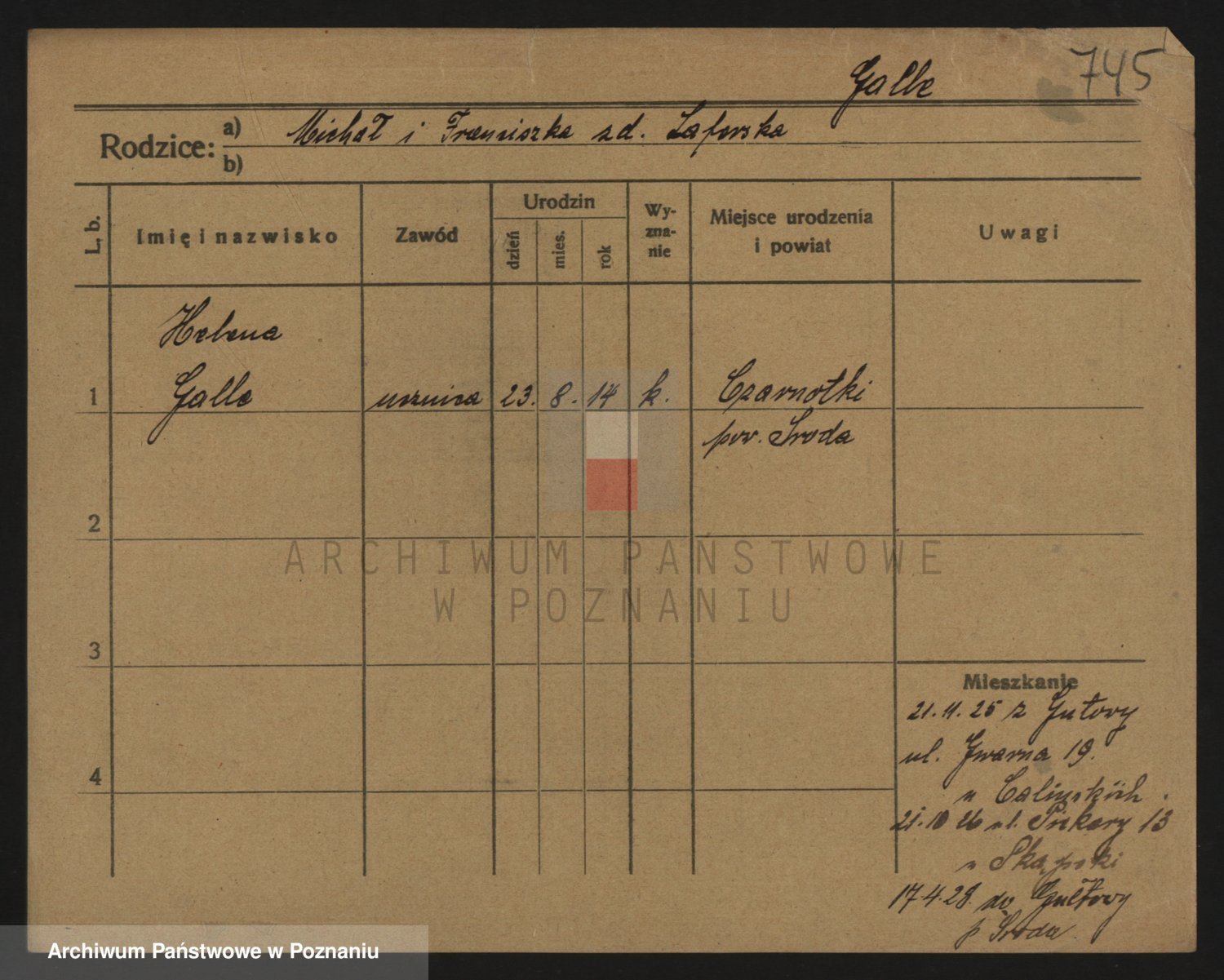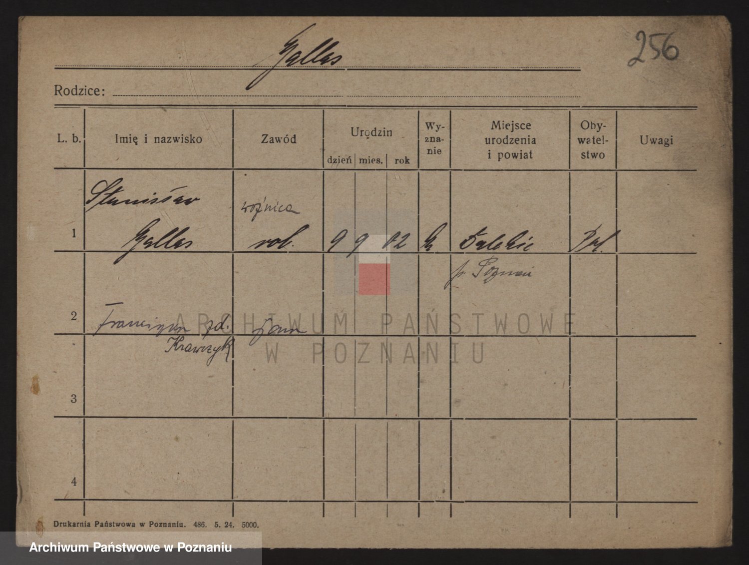 Podgląd karty osobowej dostępny jest po kliknięciu na nazwisko lub ikonkę karty. Można dokonywać powiększenia (ikony na górze) lub przechodzić między kolejnymi skanami (strzałki po bokach).