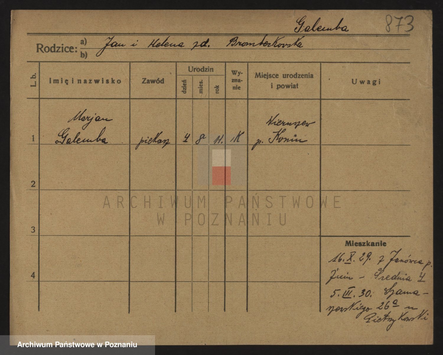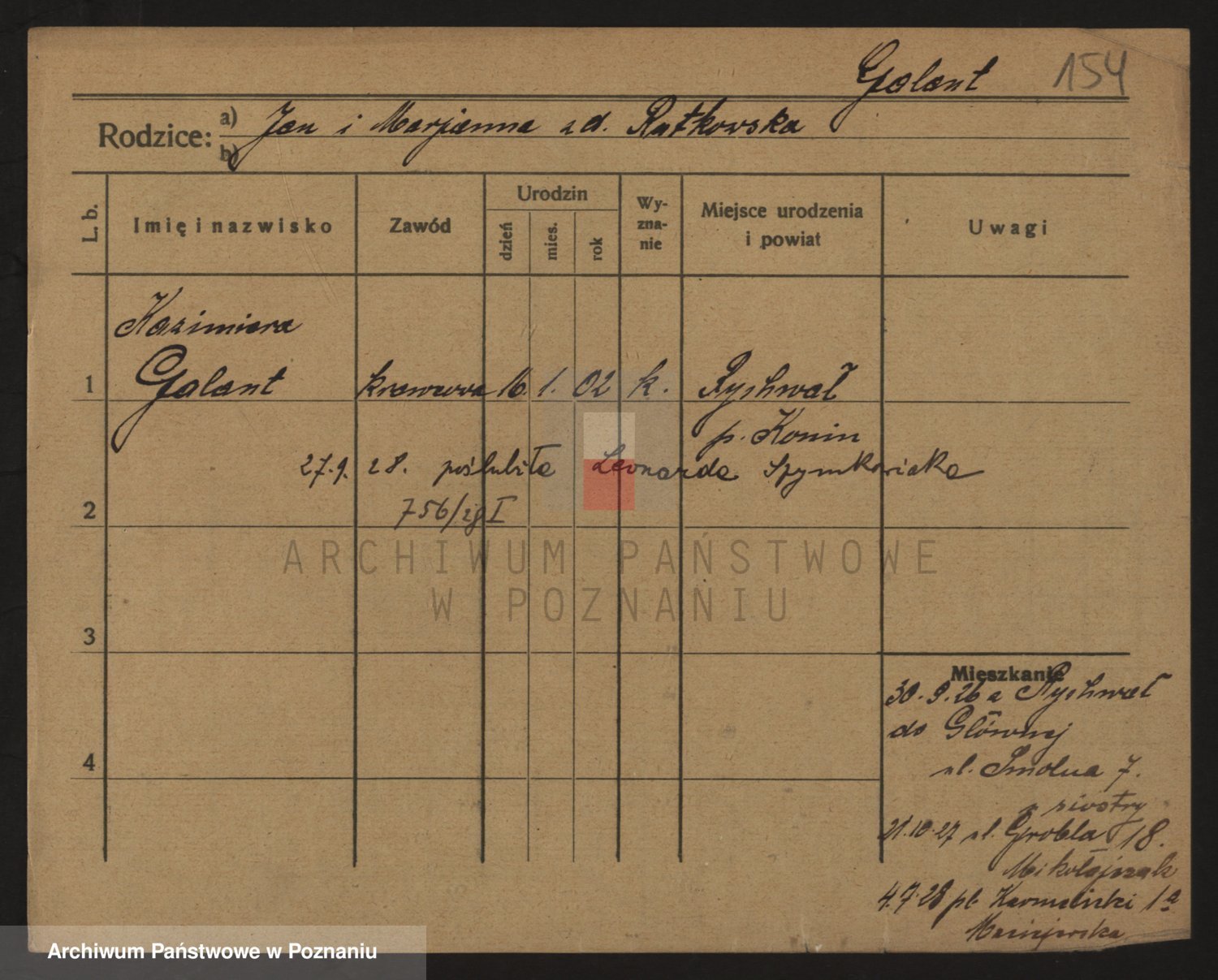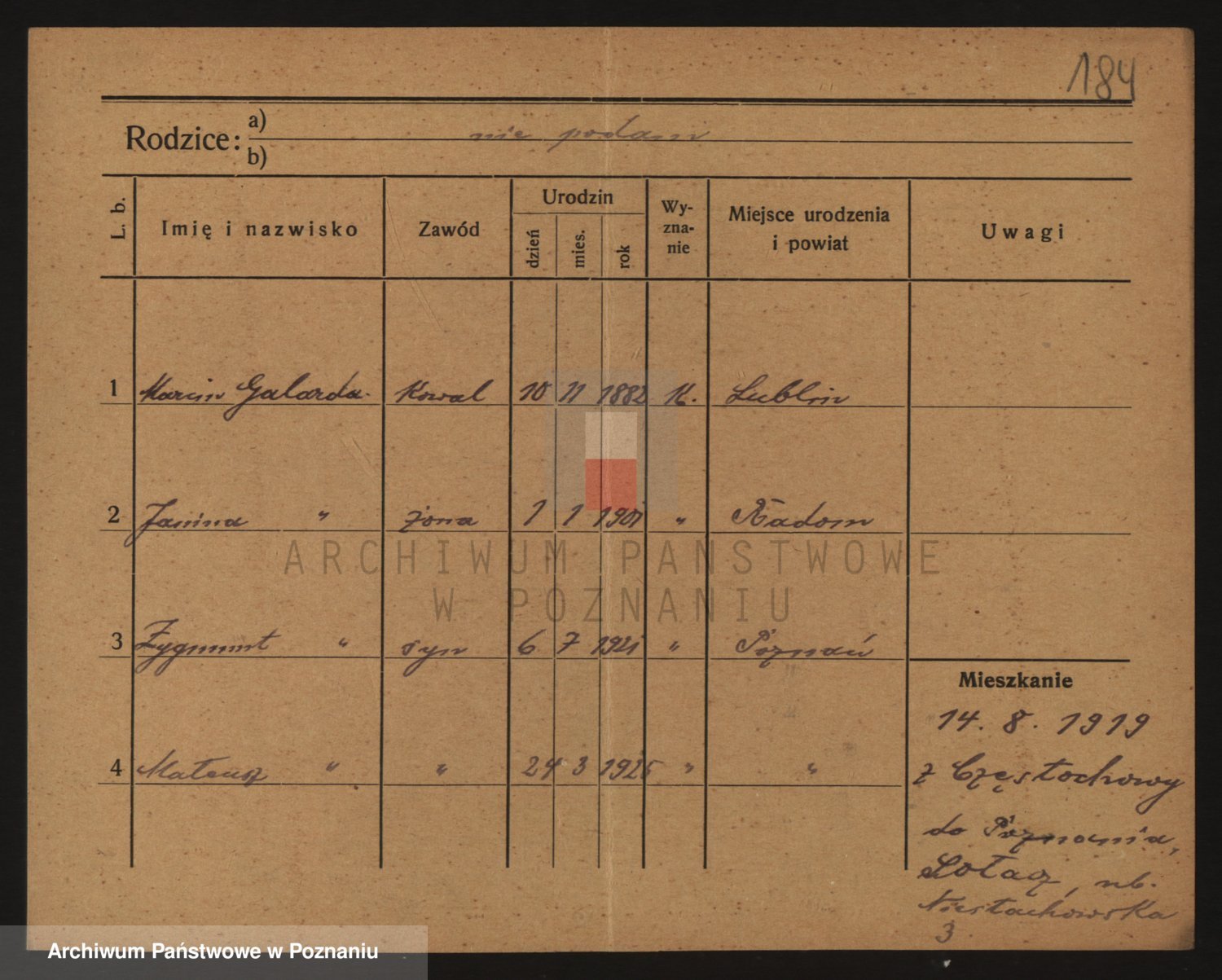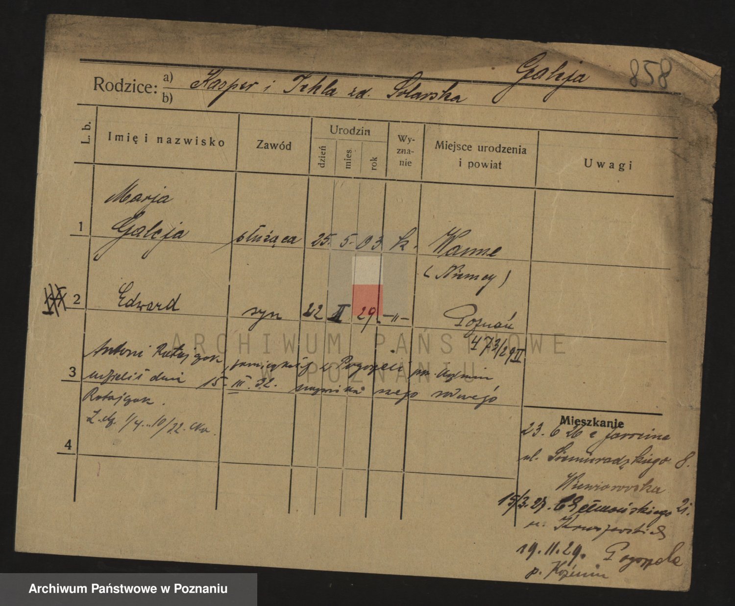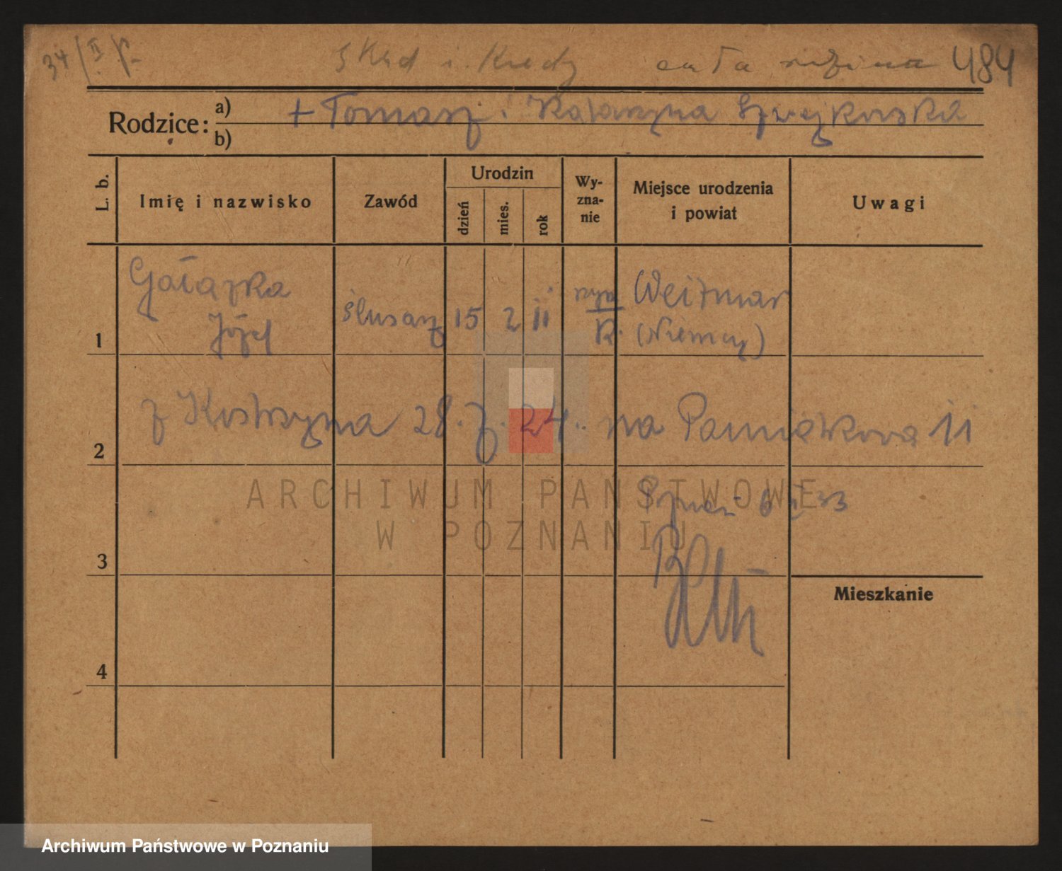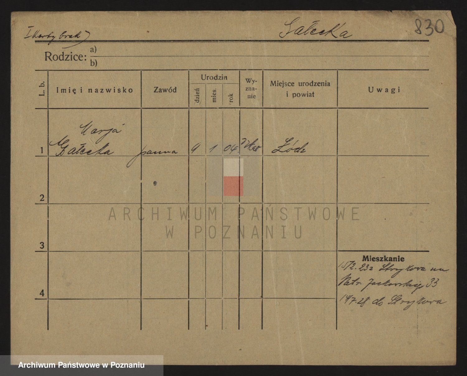 Podgląd karty osobowej dostępny jest po kliknięciu na nazwisko lub ikonkę karty. Można dokonywać powiększenia (ikony na górze) lub przechodzić między kolejnymi skanami (strzałki po bokach).