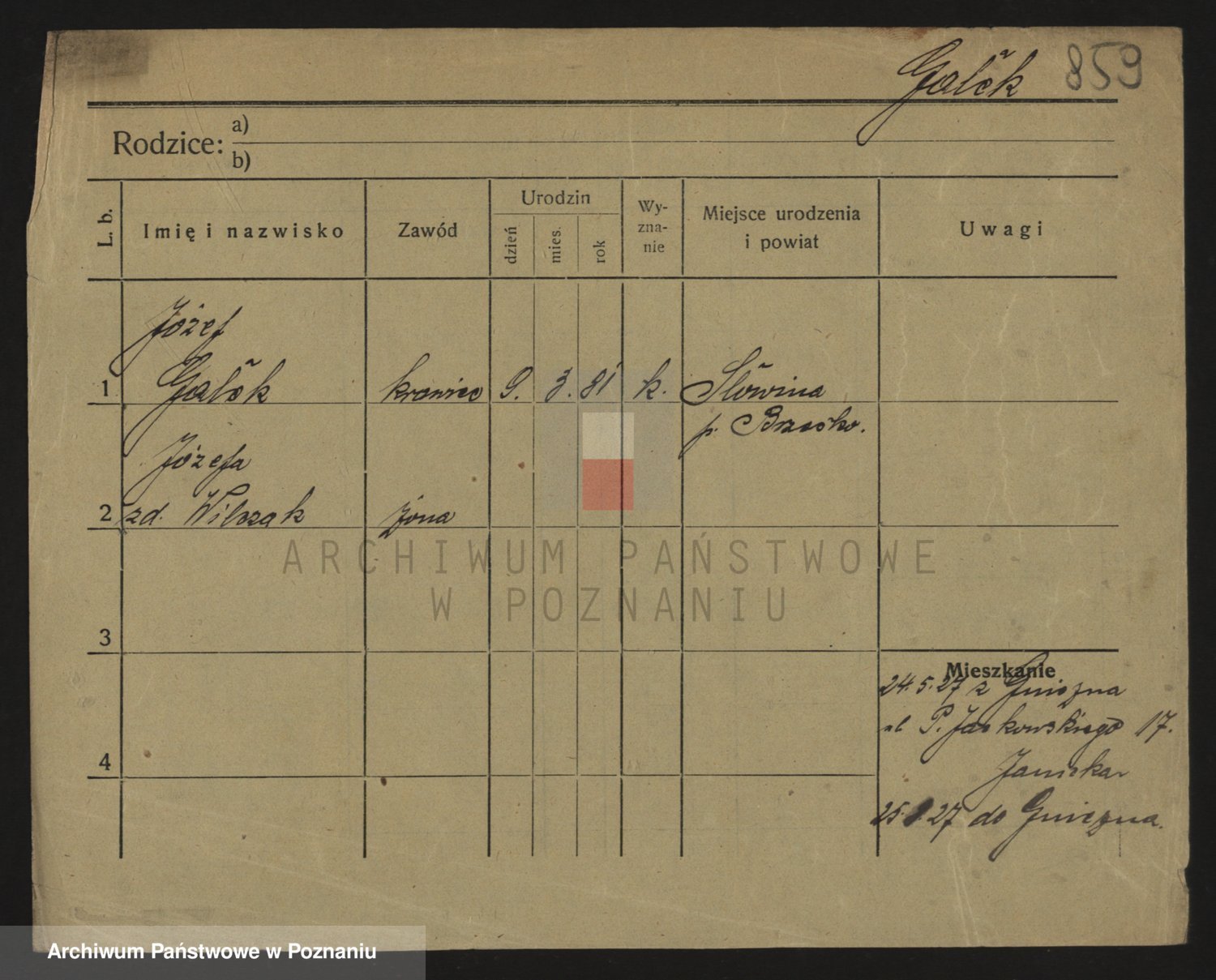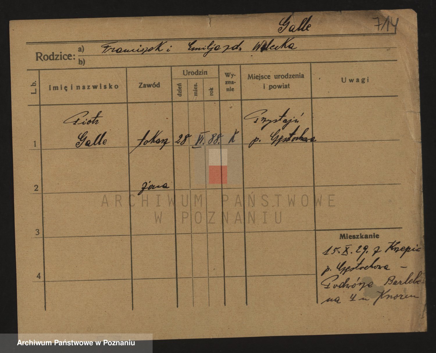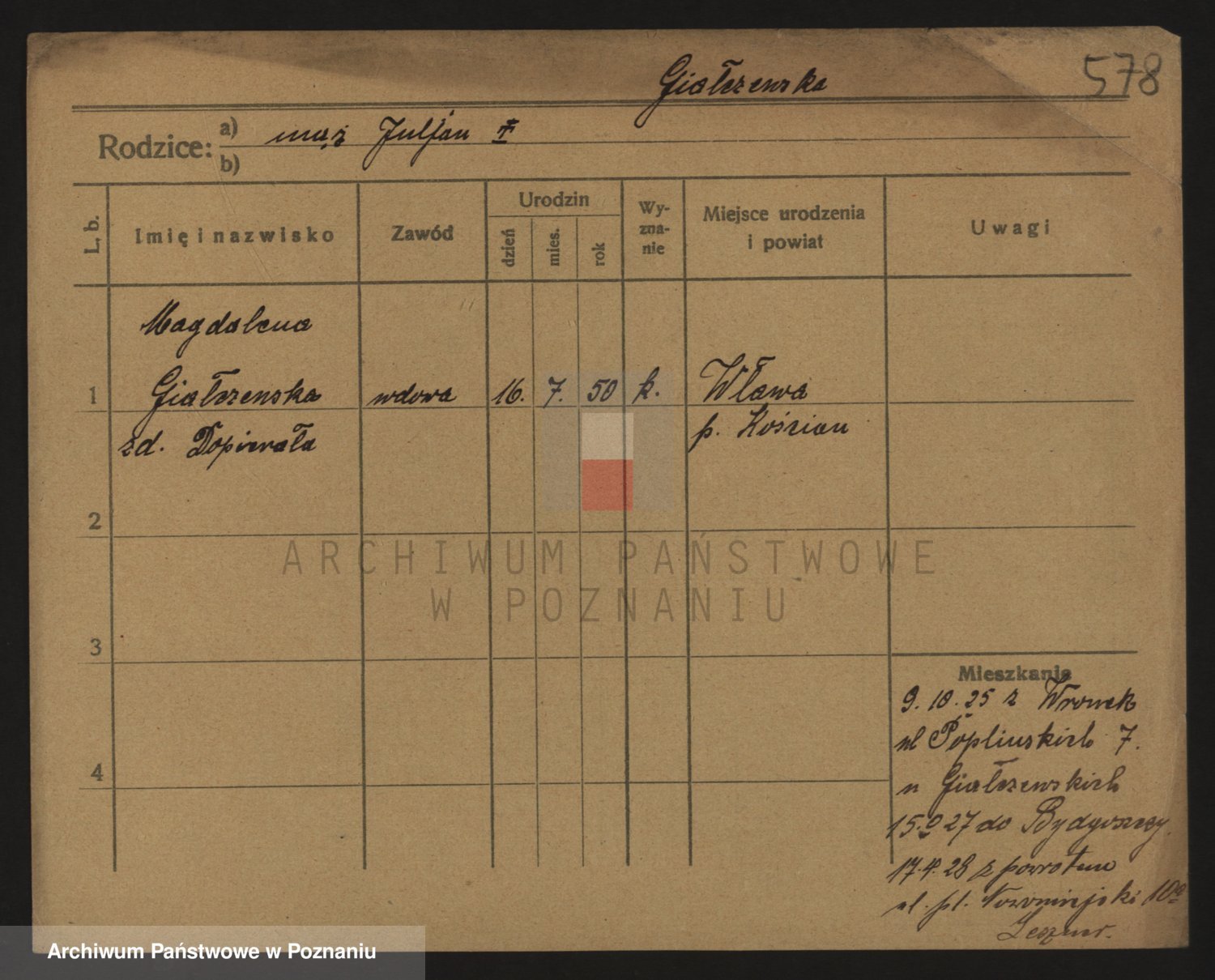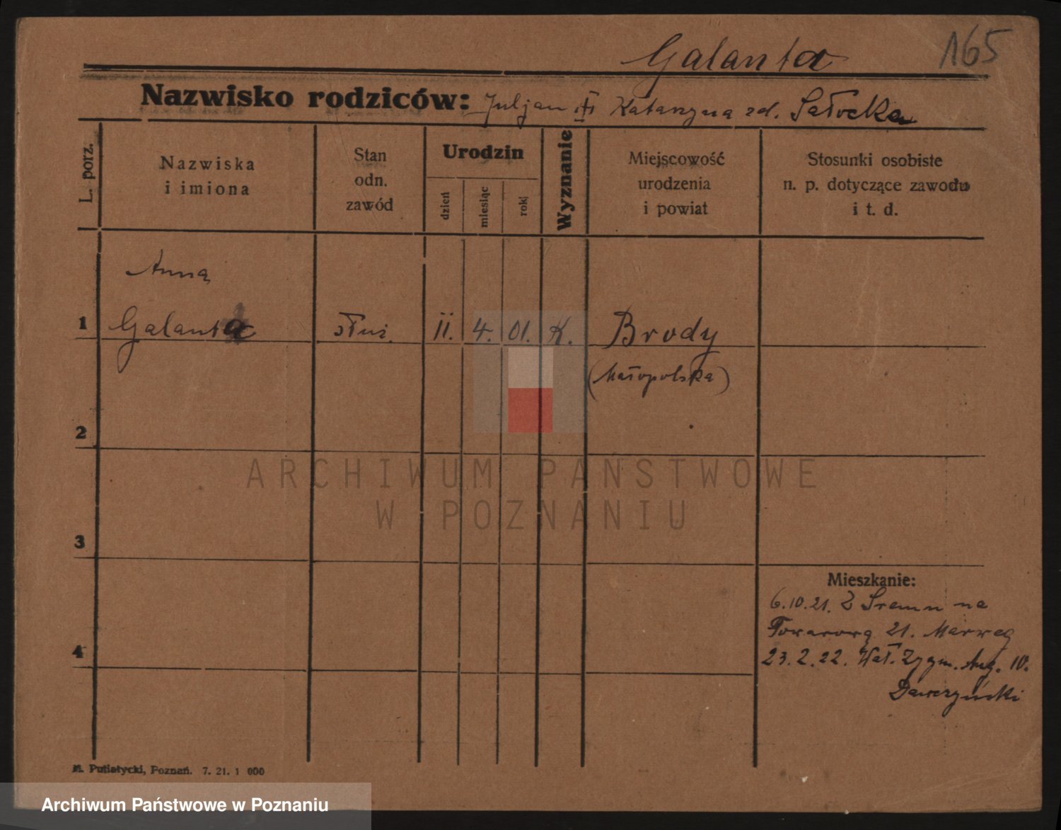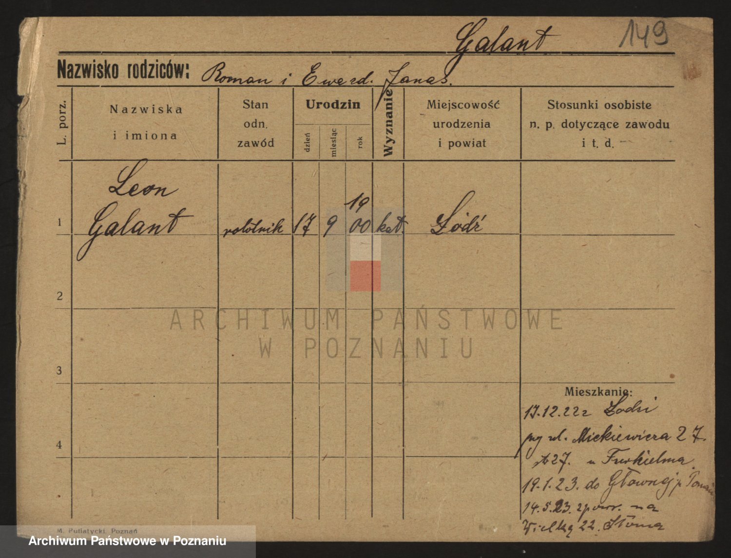 Podgląd karty osobowej dostępny jest po kliknięciu na nazwisko lub ikonkę karty. Można dokonywać powiększenia (ikony na górze) lub przechodzić między kolejnymi skanami (strzałki po bokach).