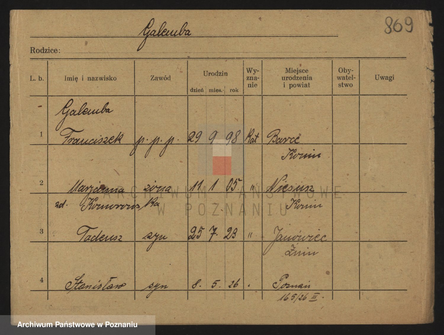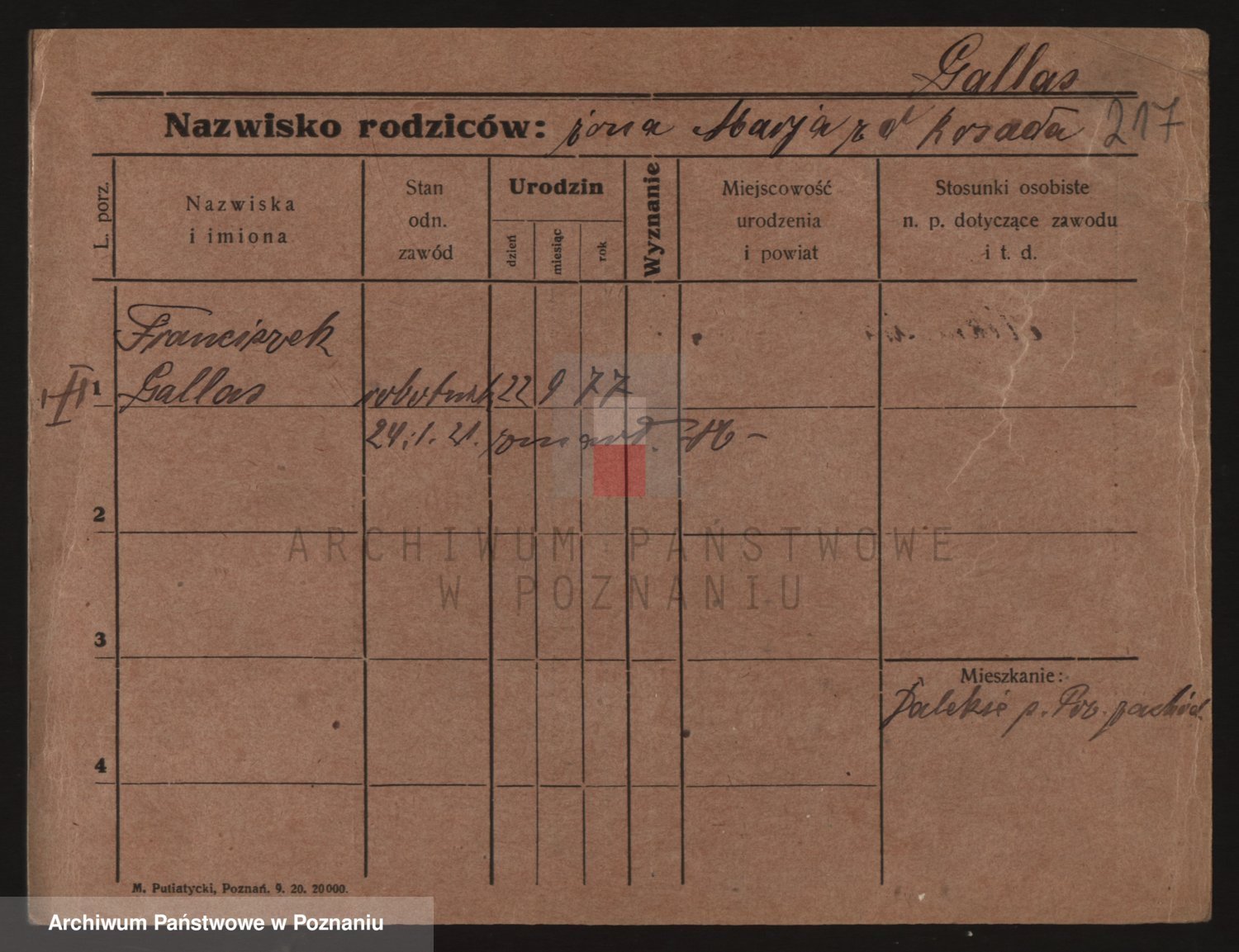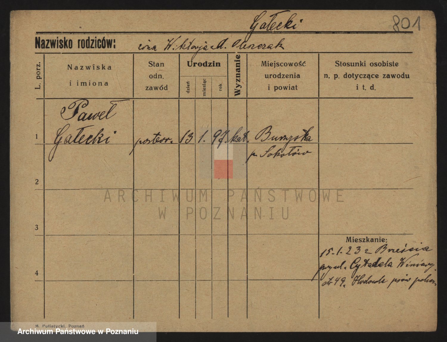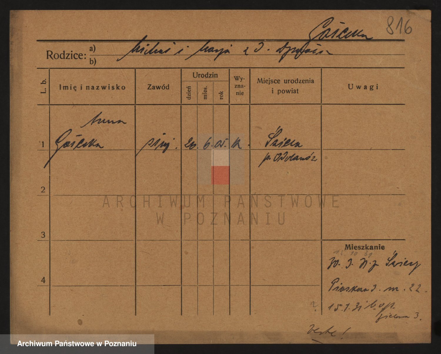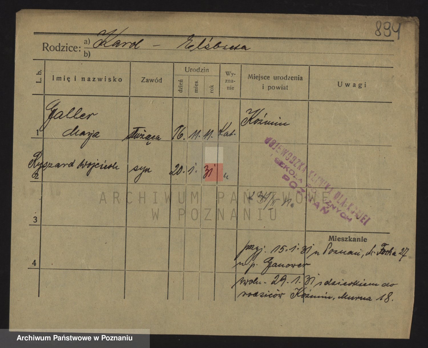 Podgląd karty osobowej dostępny jest po kliknięciu na nazwisko lub ikonkę karty. Można dokonywać powiększenia (ikony na górze) lub przechodzić między kolejnymi skanami (strzałki po bokach).