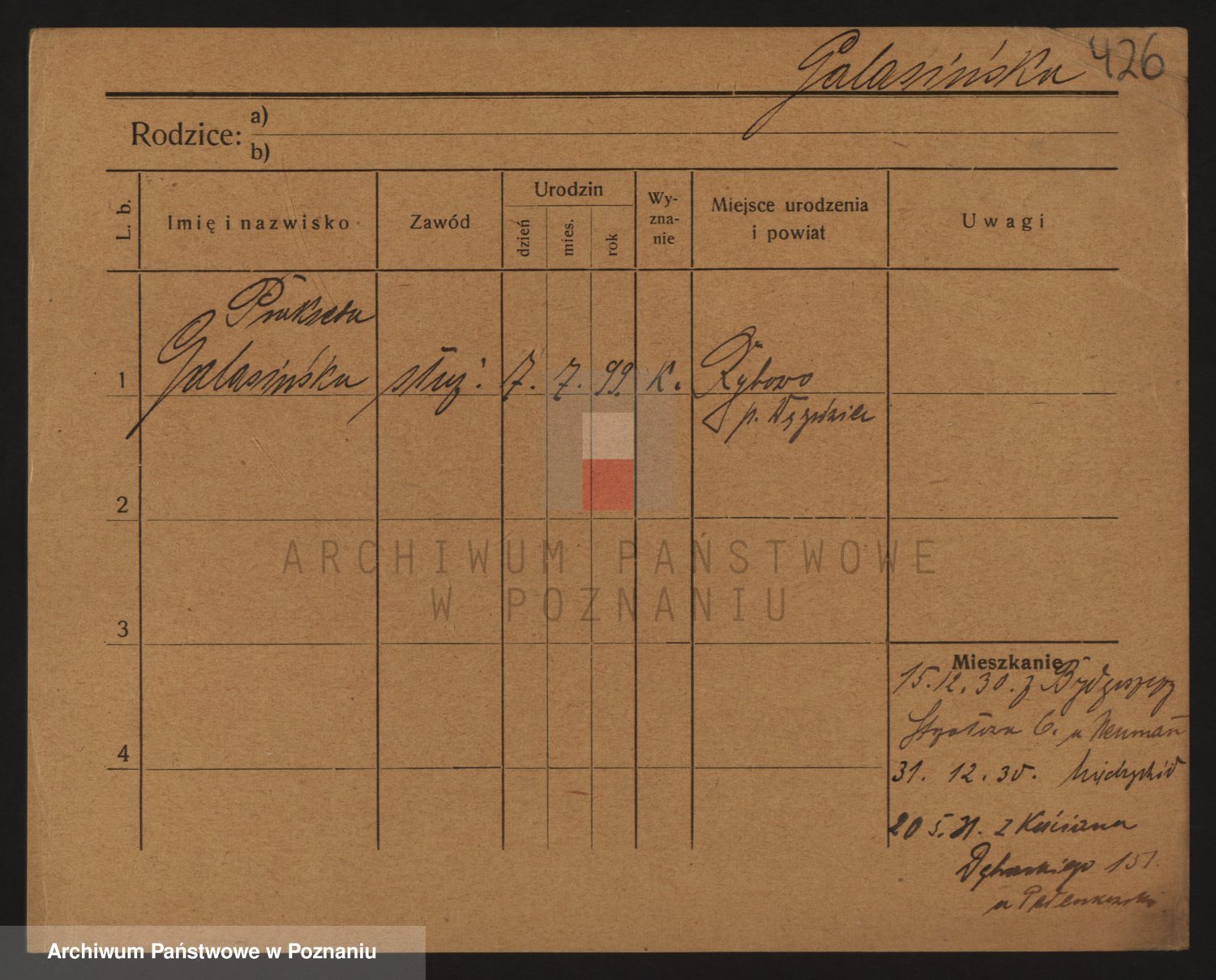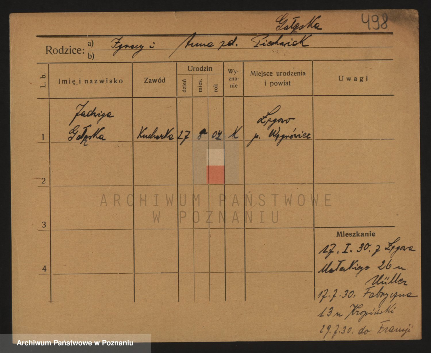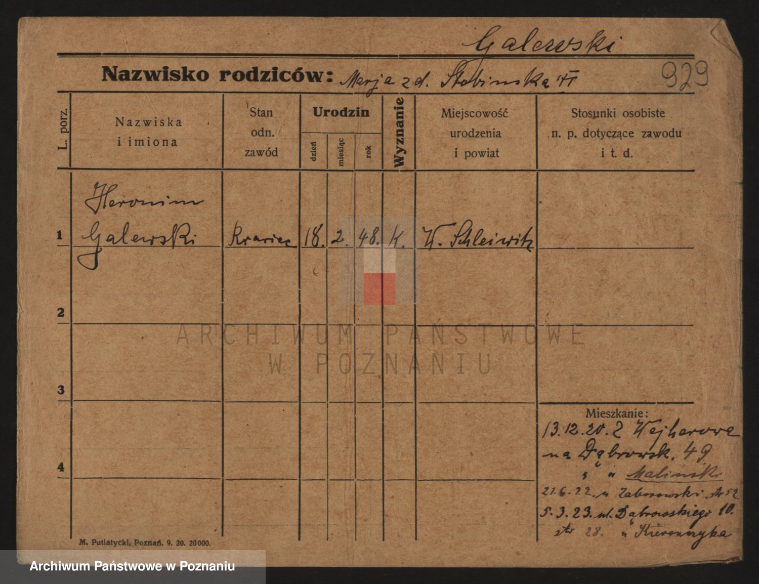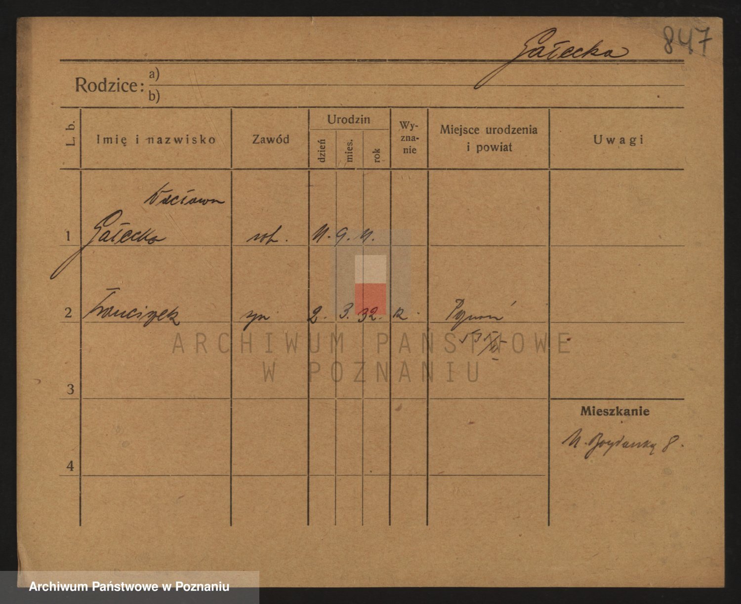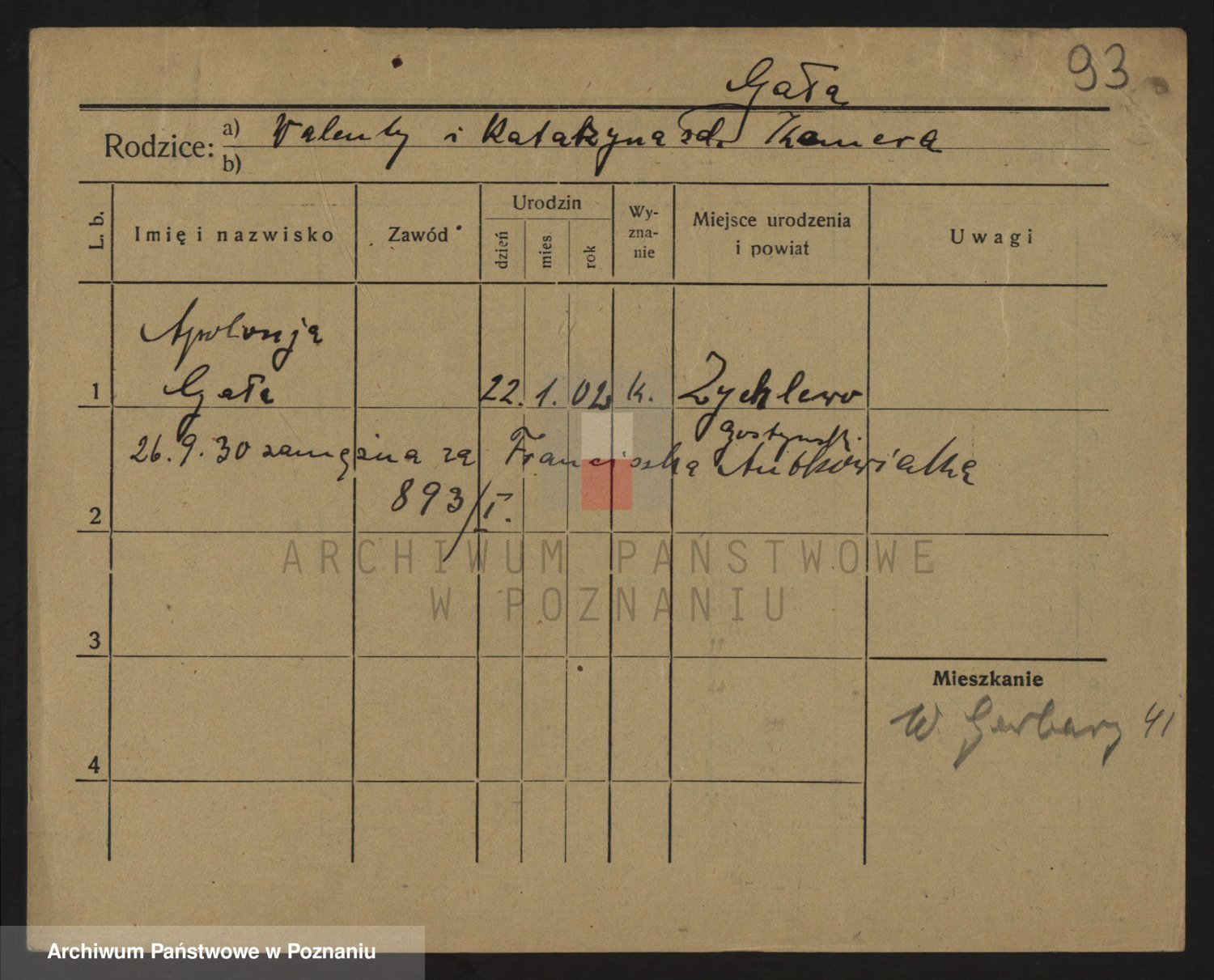 Podgląd karty osobowej dostępny jest po kliknięciu na nazwisko lub ikonkę karty. Można dokonywać powiększenia (ikony na górze) lub przechodzić między kolejnymi skanami (strzałki po bokach).