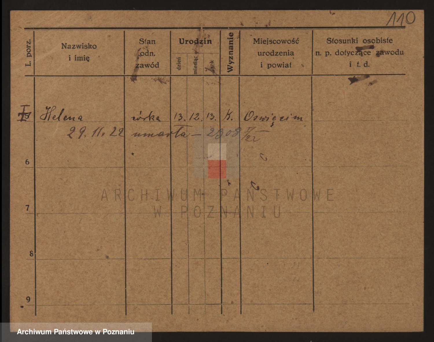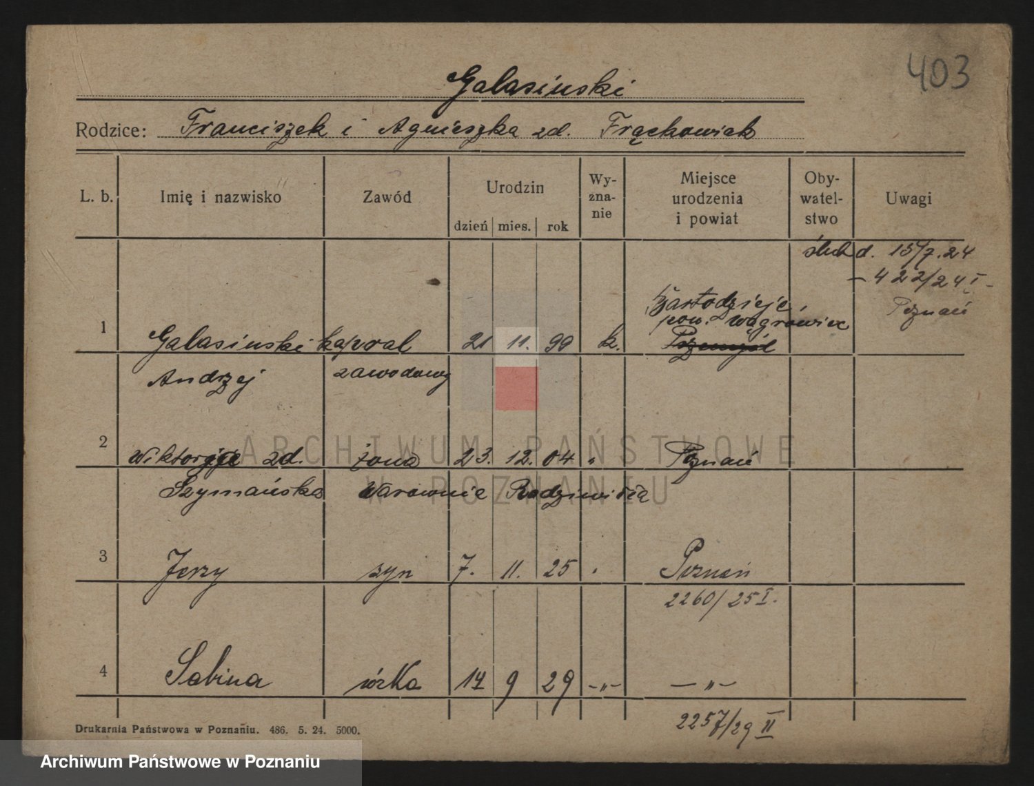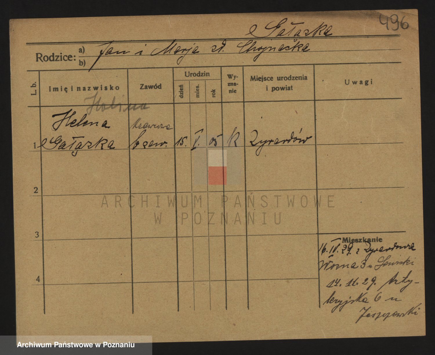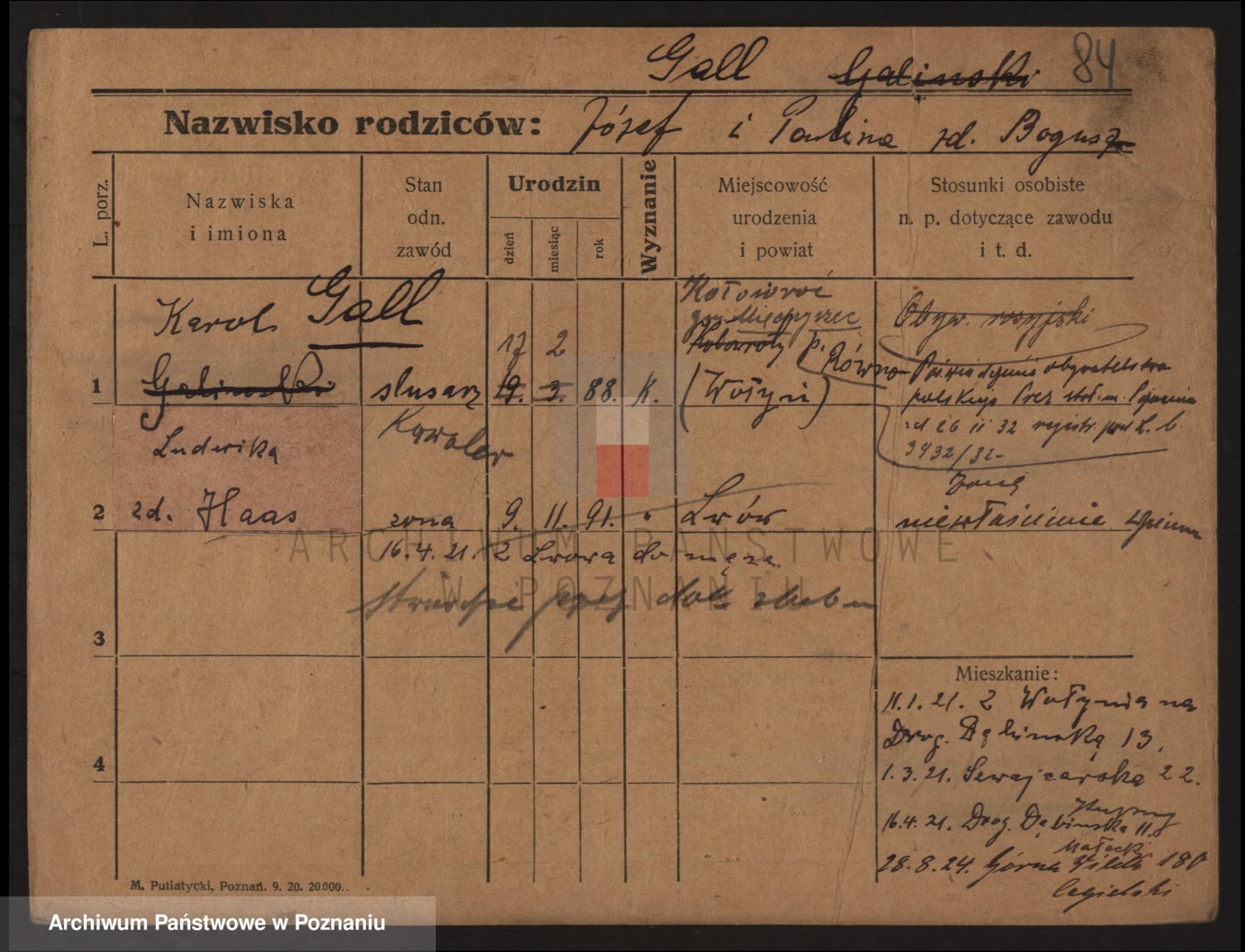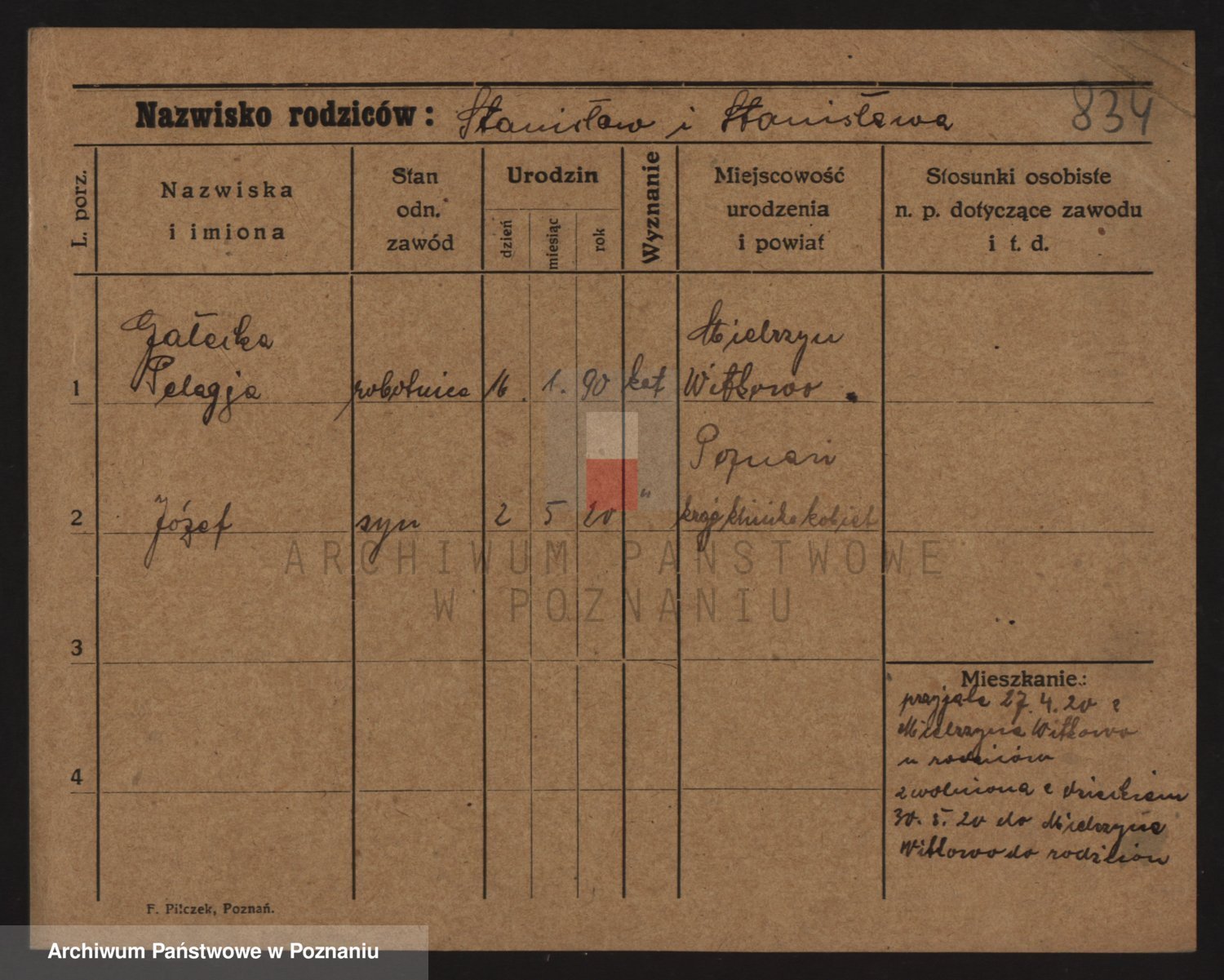 Podgląd karty osobowej dostępny jest po kliknięciu na nazwisko lub ikonkę karty. Można dokonywać powiększenia (ikony na górze) lub przechodzić między kolejnymi skanami (strzałki po bokach).