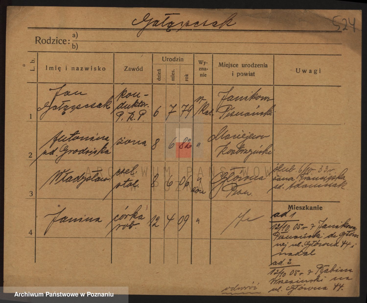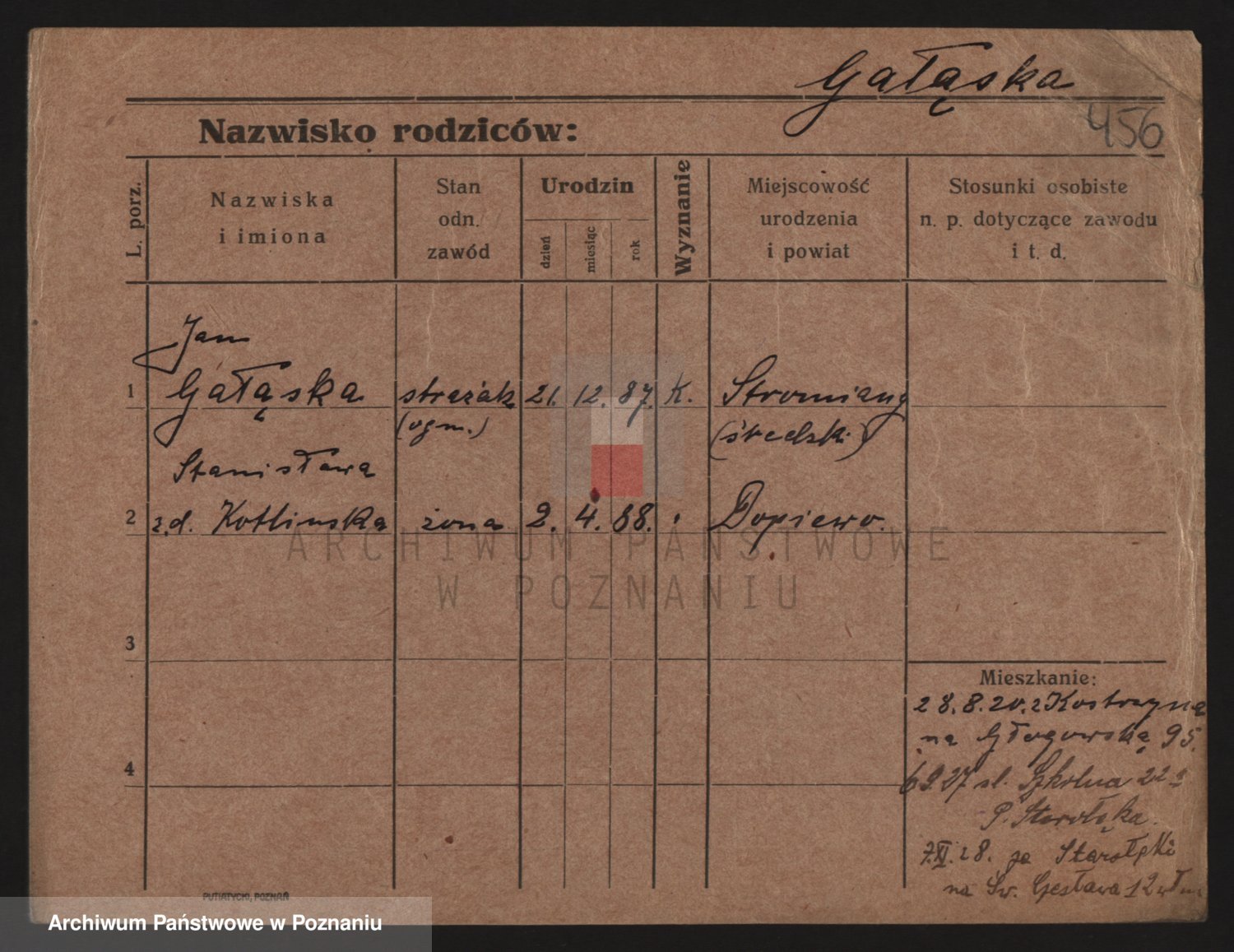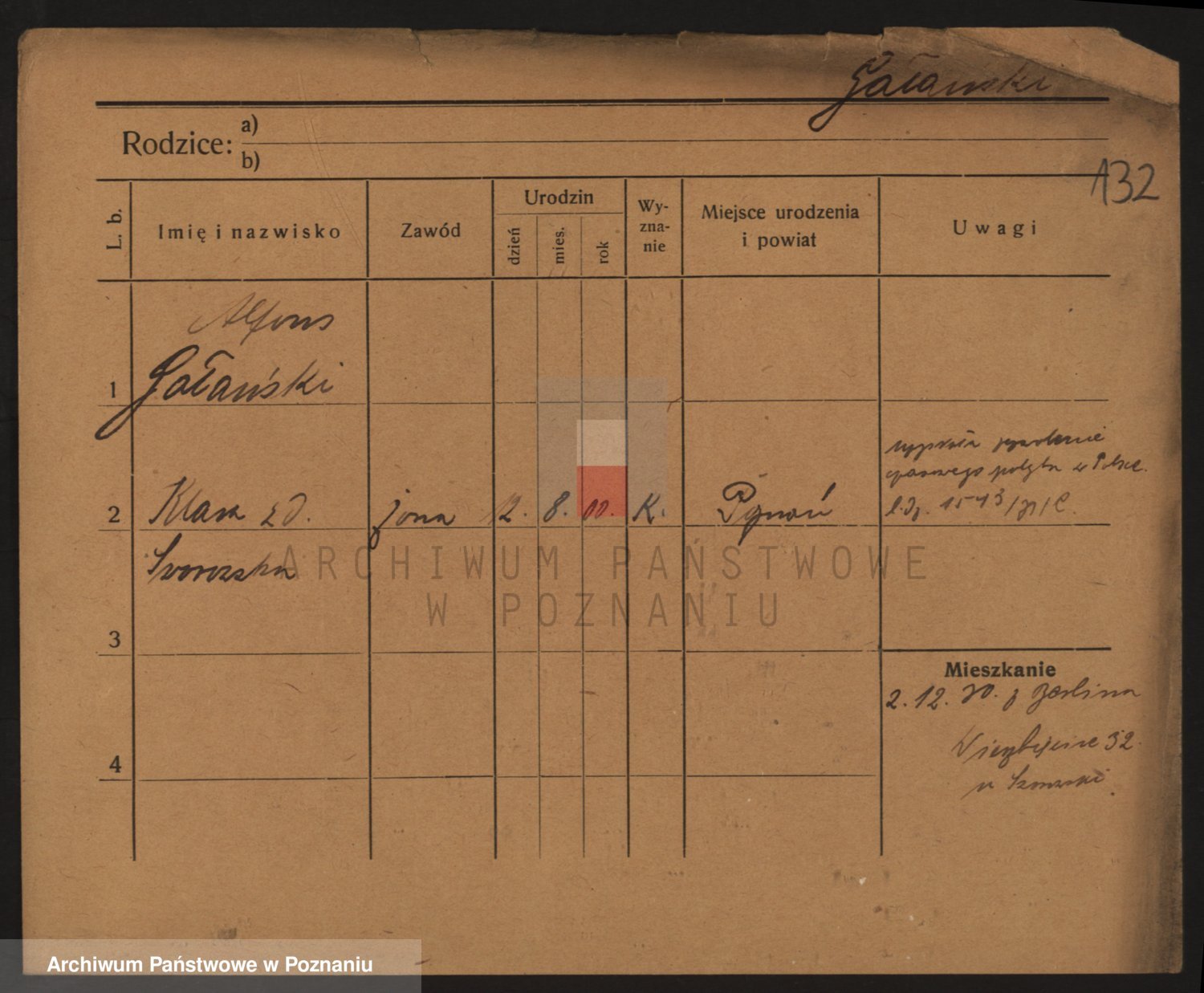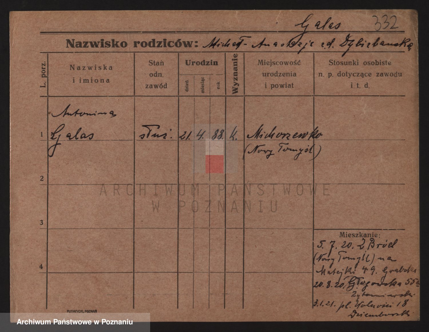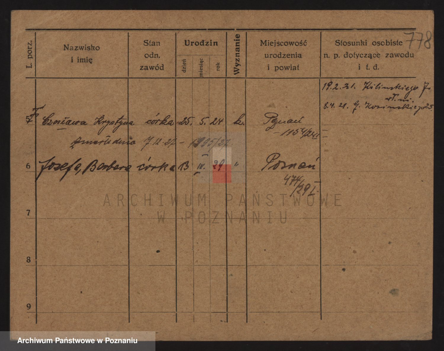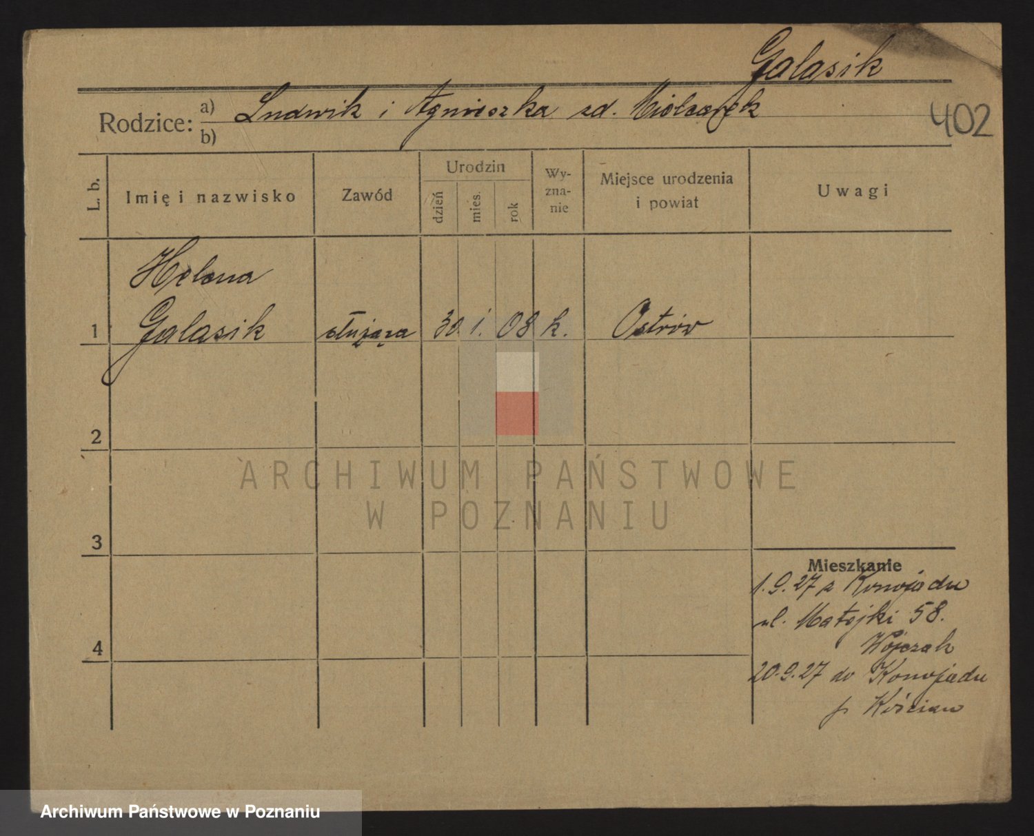 Podgląd karty osobowej dostępny jest po kliknięciu na nazwisko lub ikonkę karty. Można dokonywać powiększenia (ikony na górze) lub przechodzić między kolejnymi skanami (strzałki po bokach).