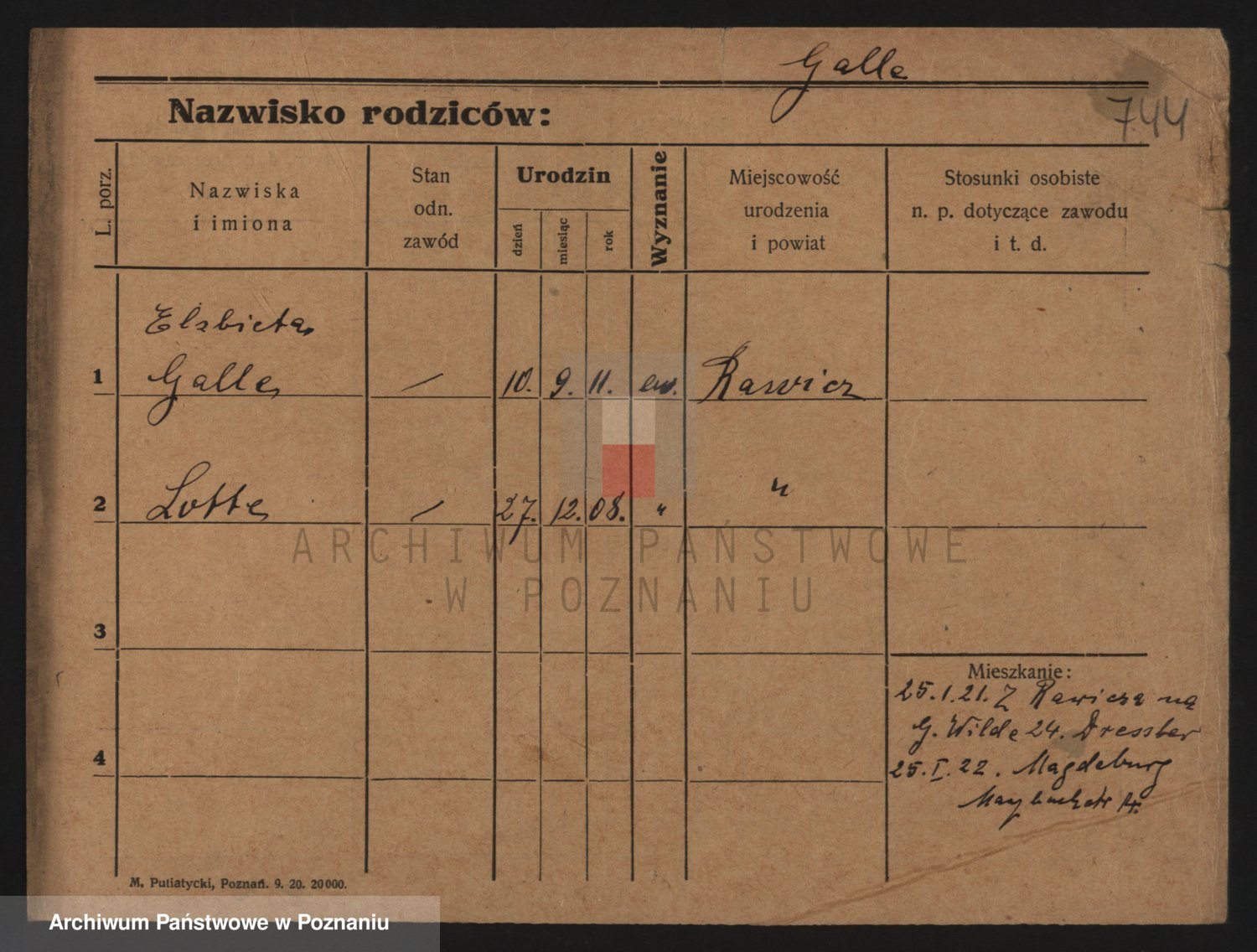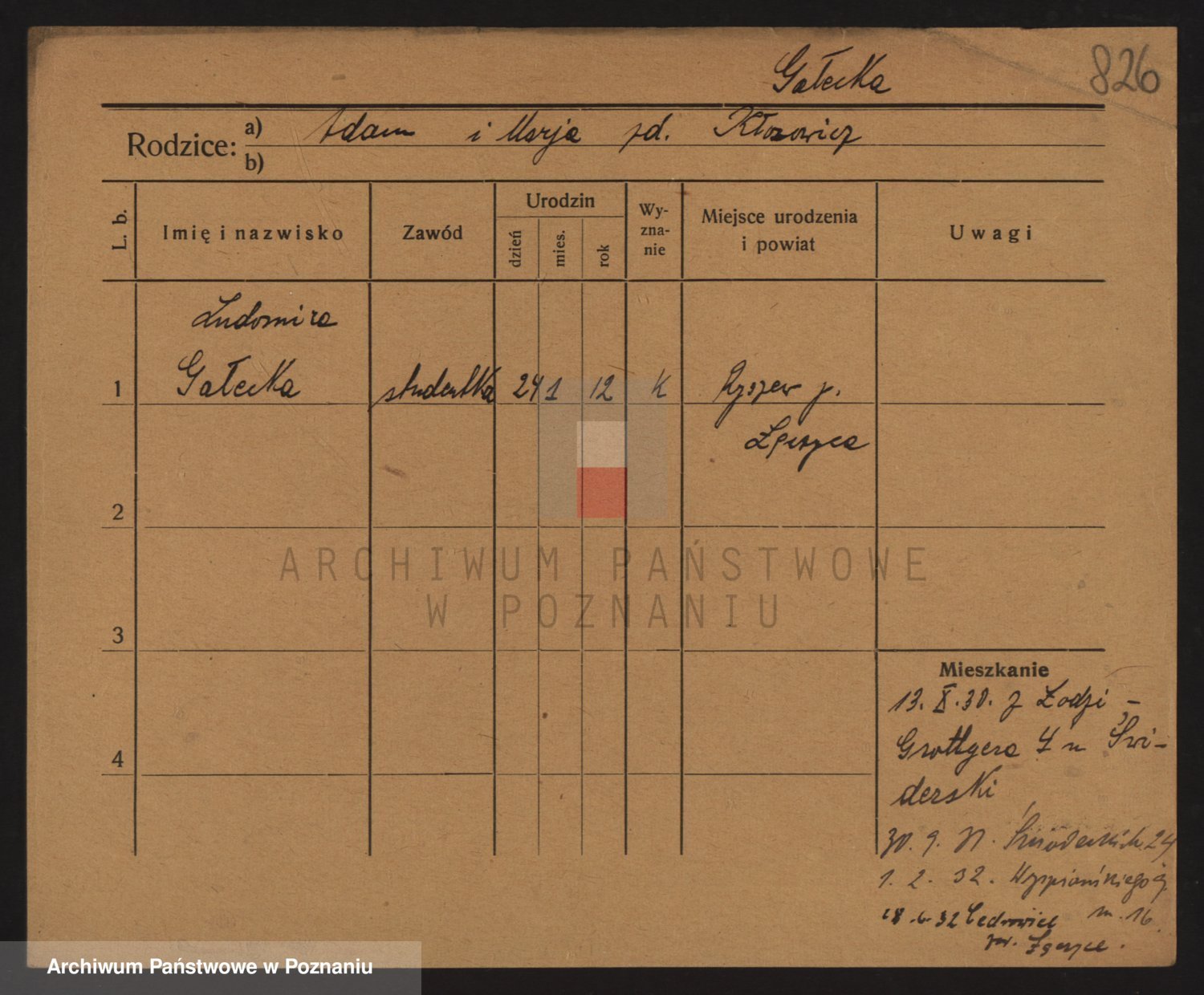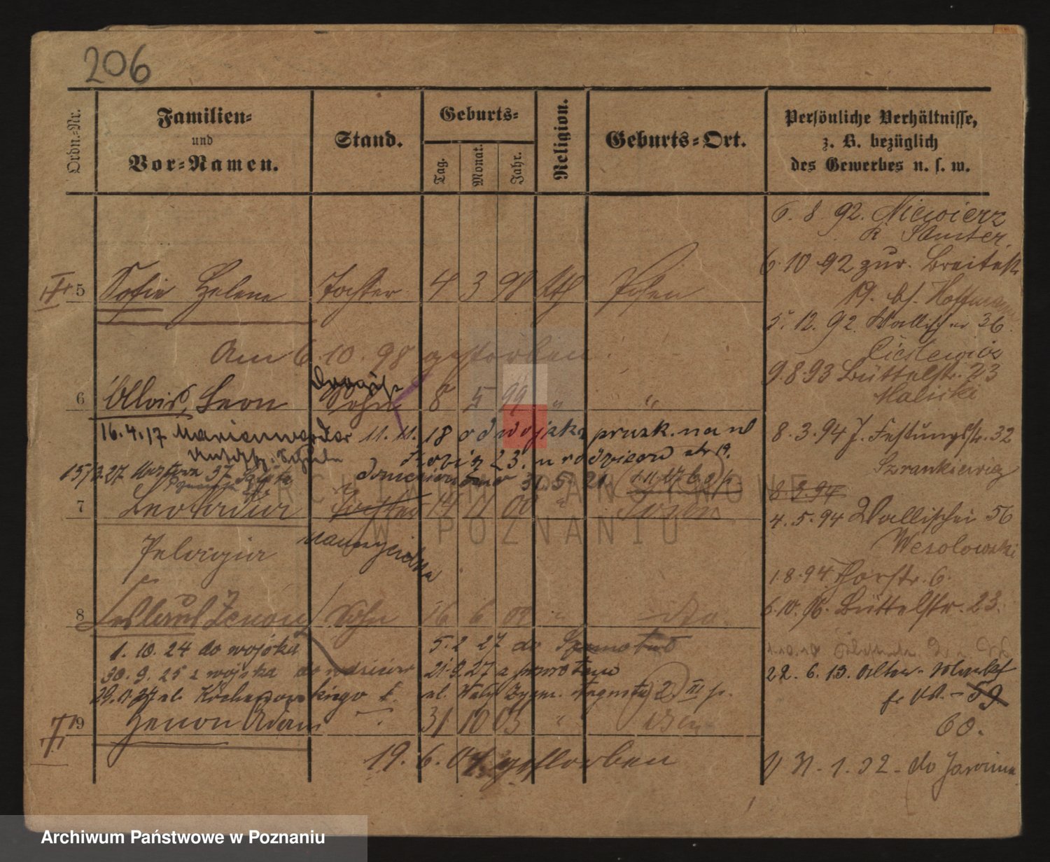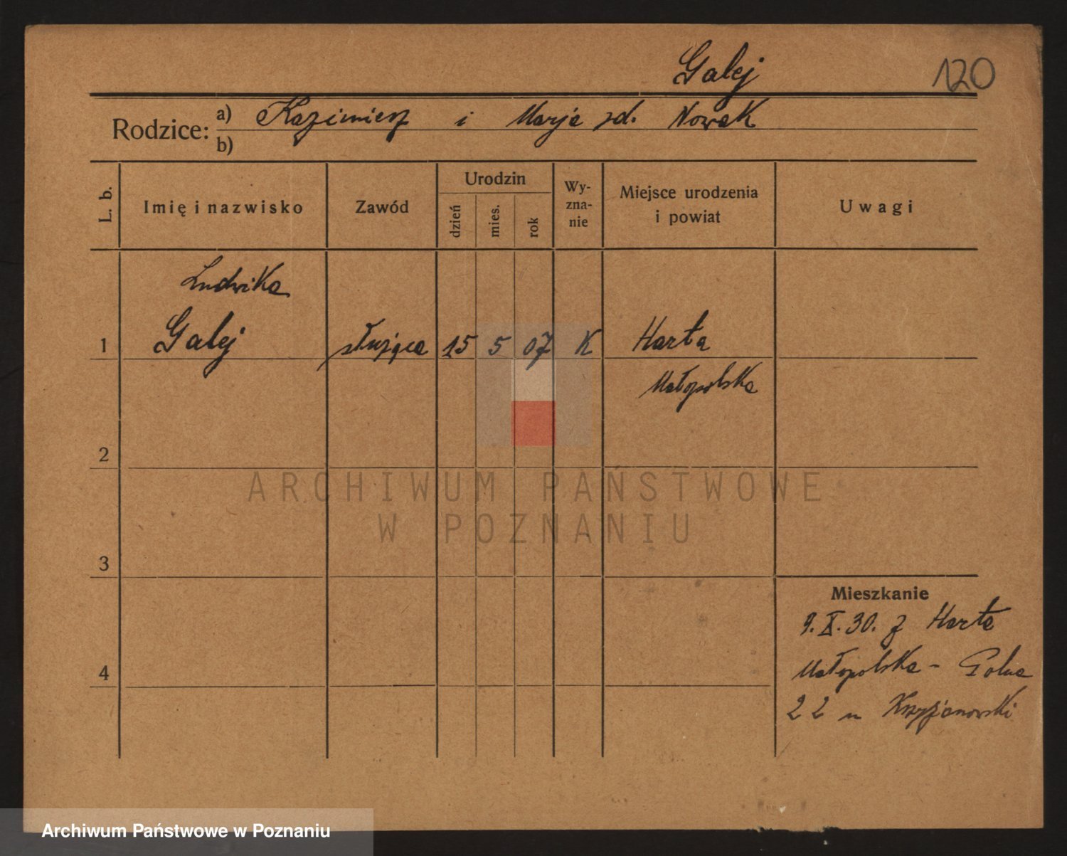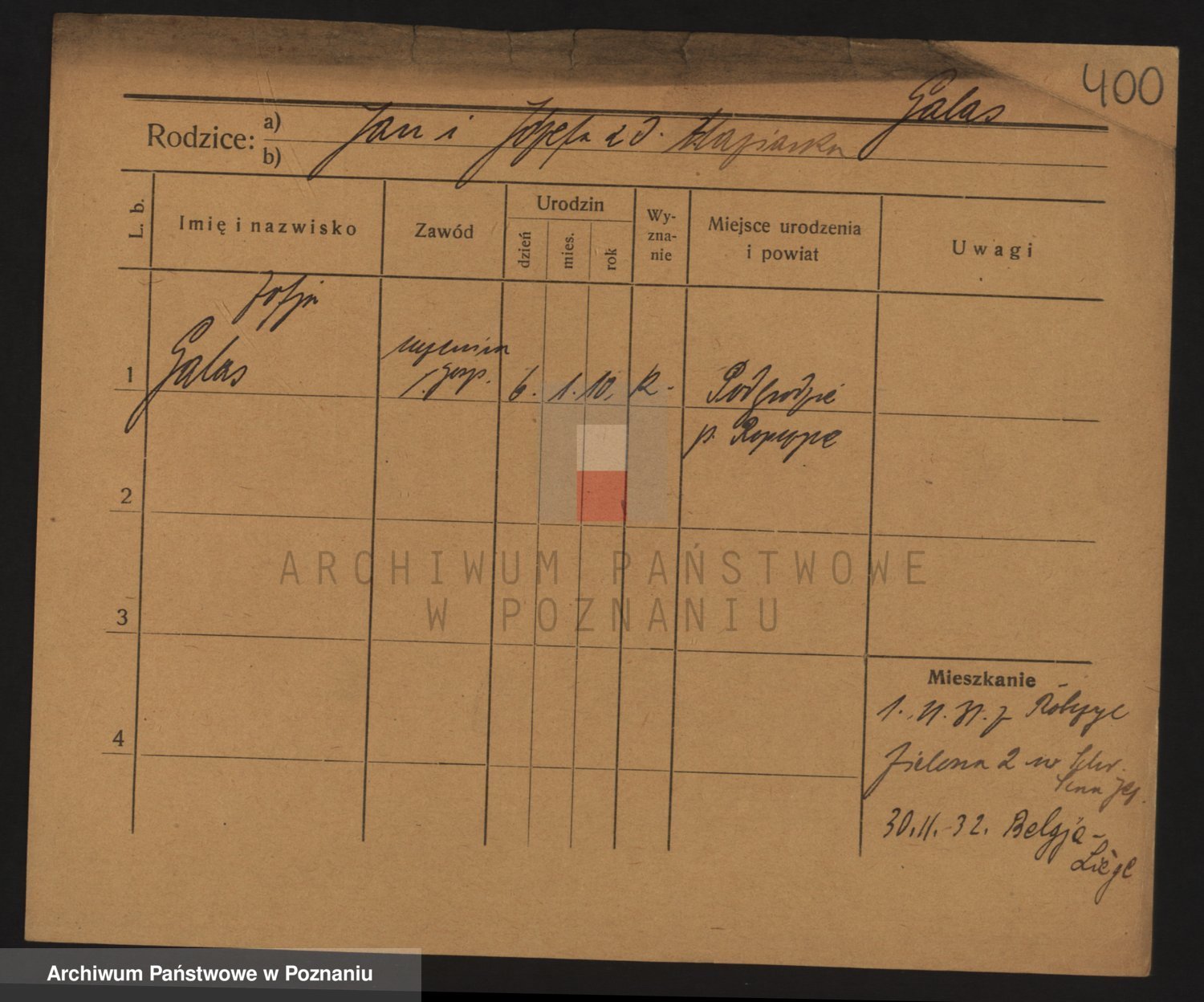 Podgląd karty osobowej dostępny jest po kliknięciu na nazwisko lub ikonkę karty. Można dokonywać powiększenia (ikony na górze) lub przechodzić między kolejnymi skanami (strzałki po bokach).