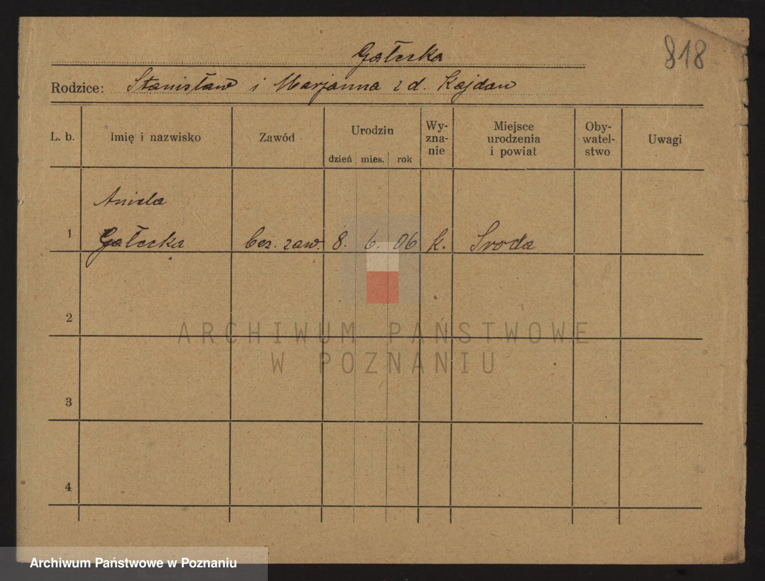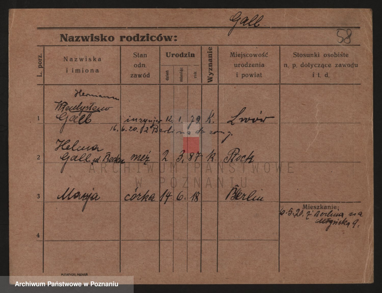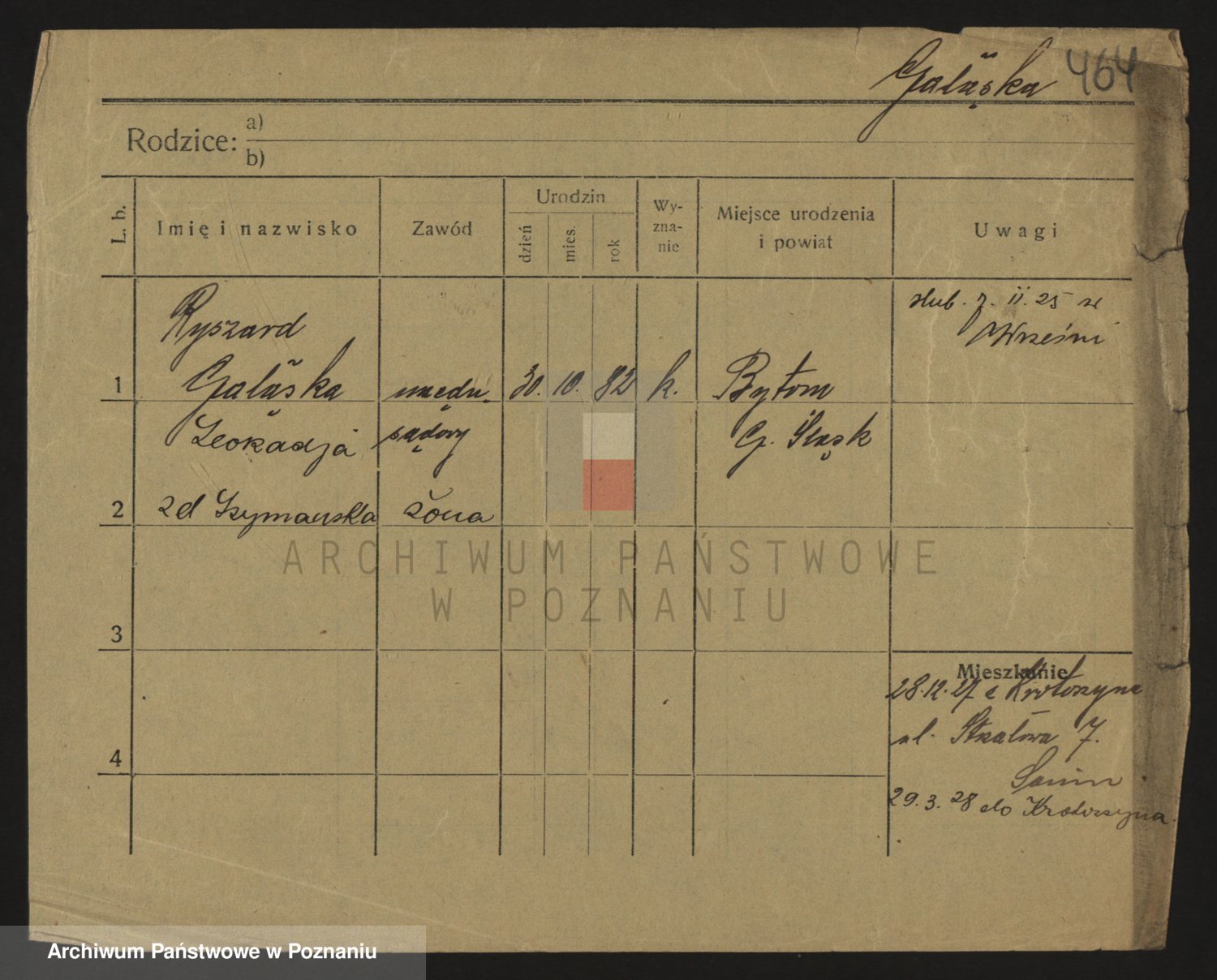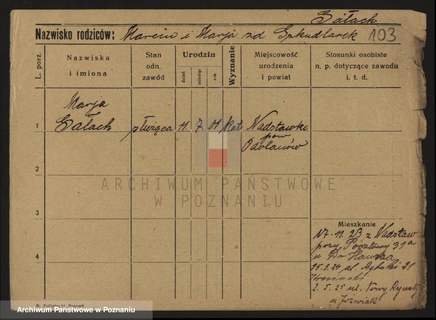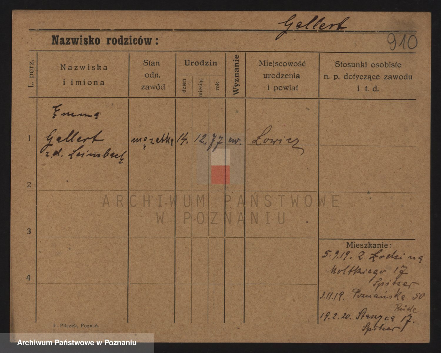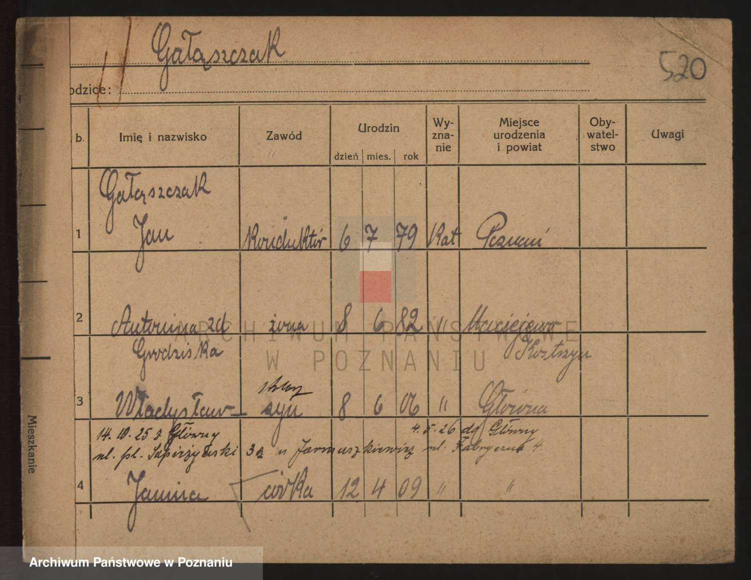 Podgląd karty osobowej dostępny jest po kliknięciu na nazwisko lub ikonkę karty. Można dokonywać powiększenia (ikony na górze) lub przechodzić między kolejnymi skanami (strzałki po bokach).