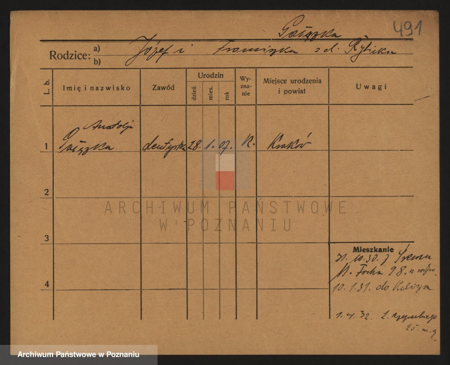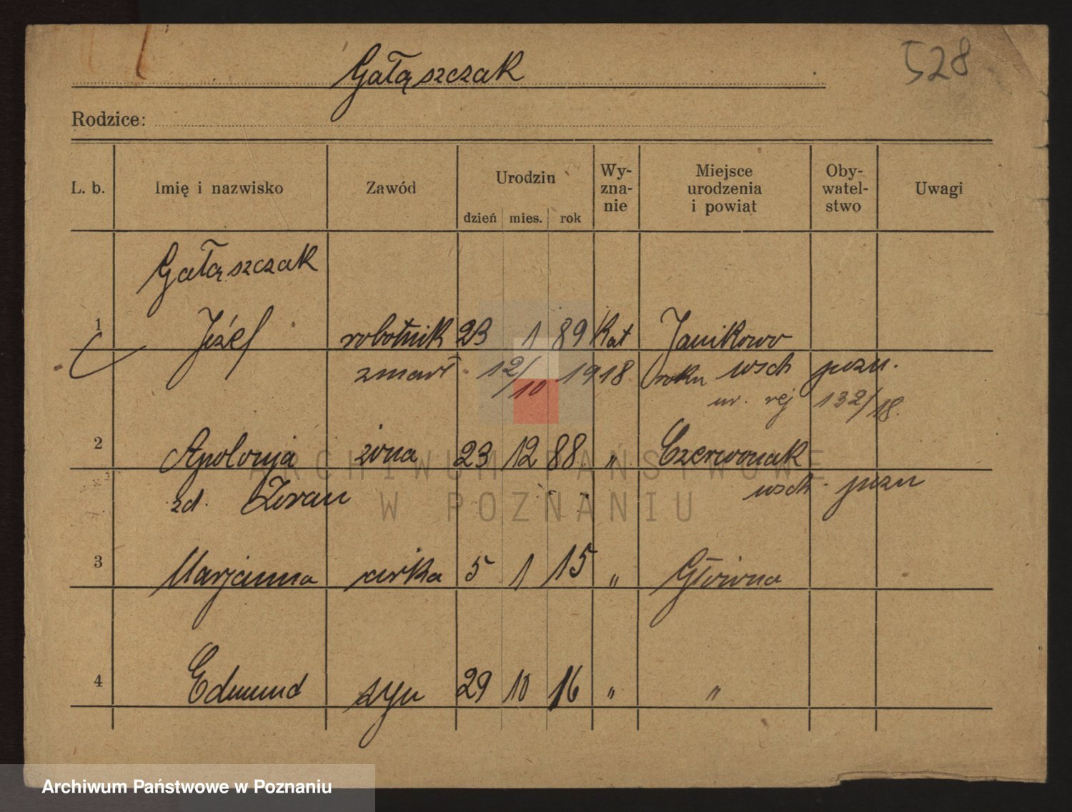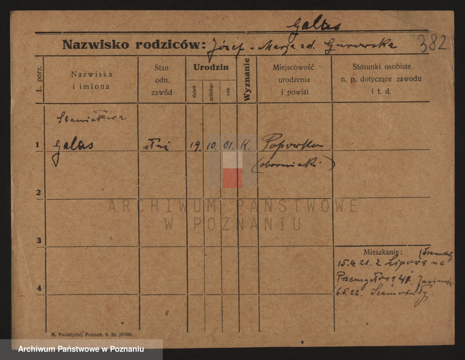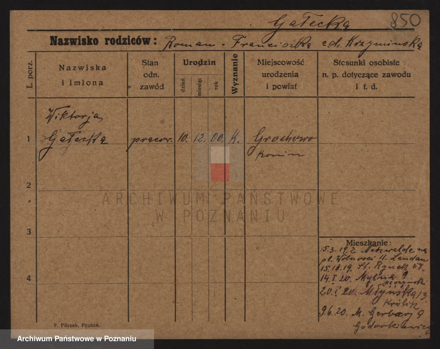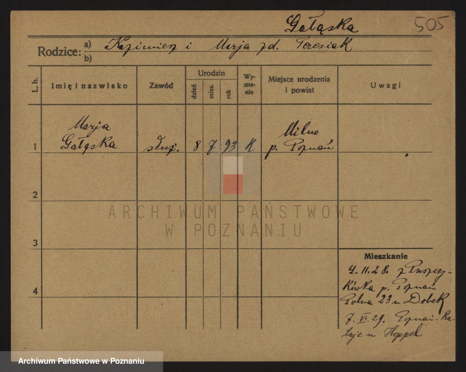 Podgląd karty osobowej dostępny jest po kliknięciu na nazwisko lub ikonkę karty. Można dokonywać powiększenia (ikony na górze) lub przechodzić między kolejnymi skanami (strzałki po bokach).