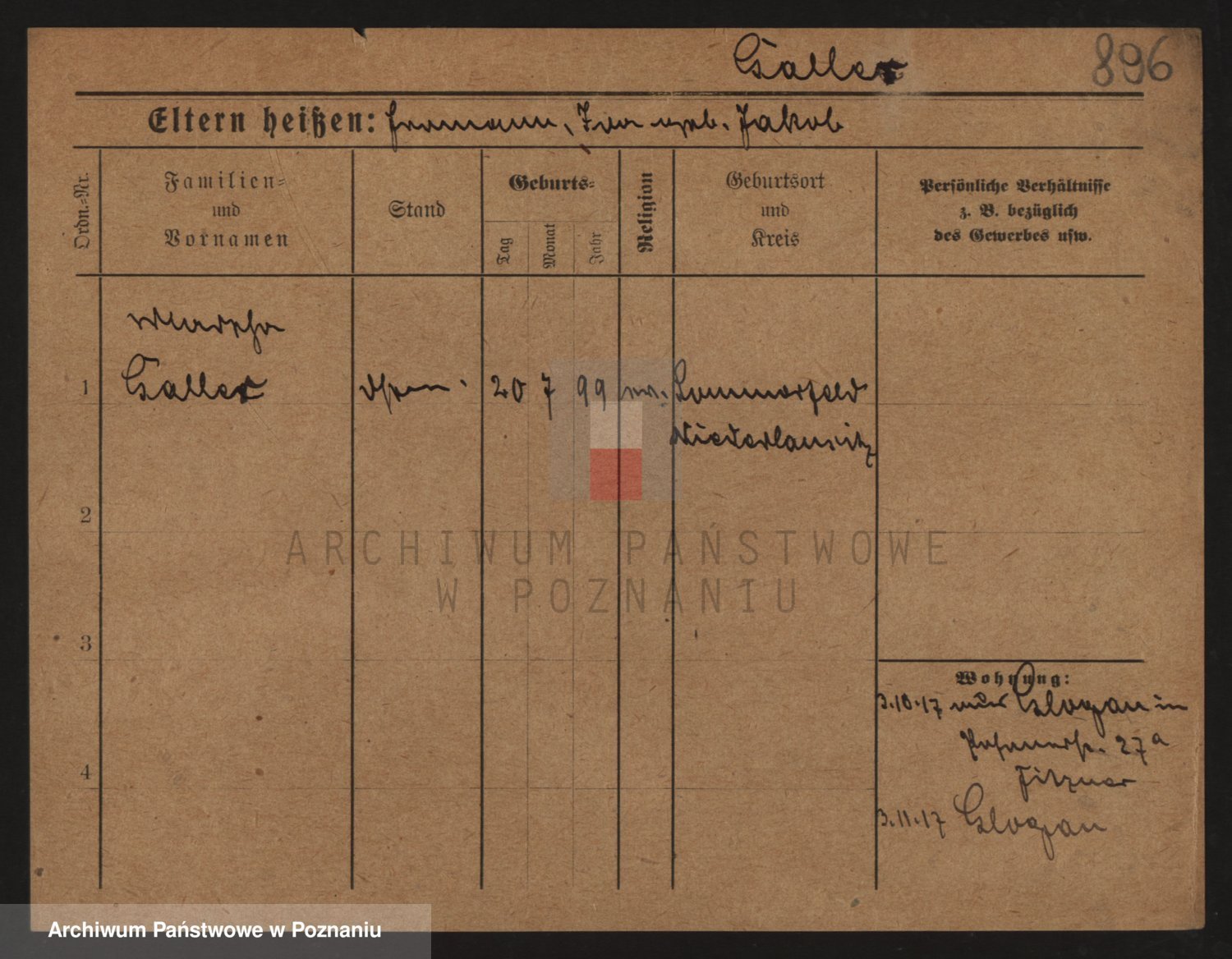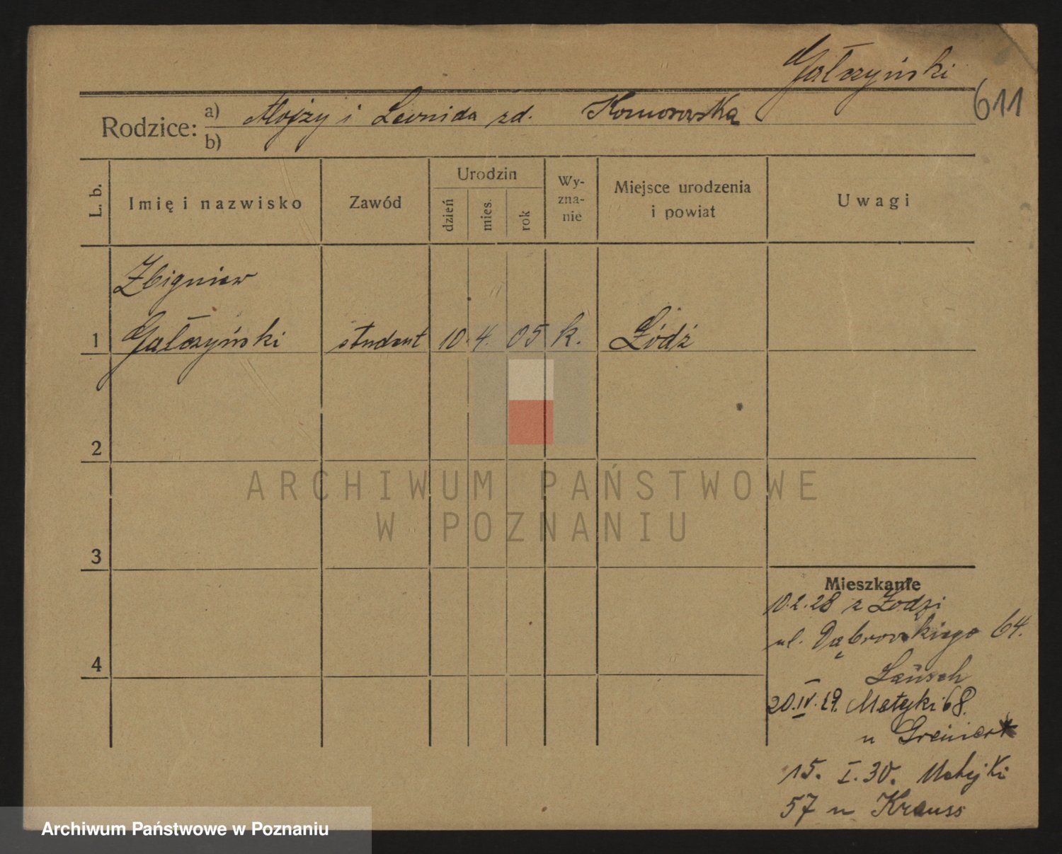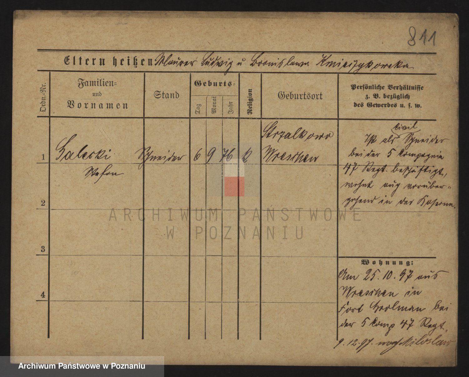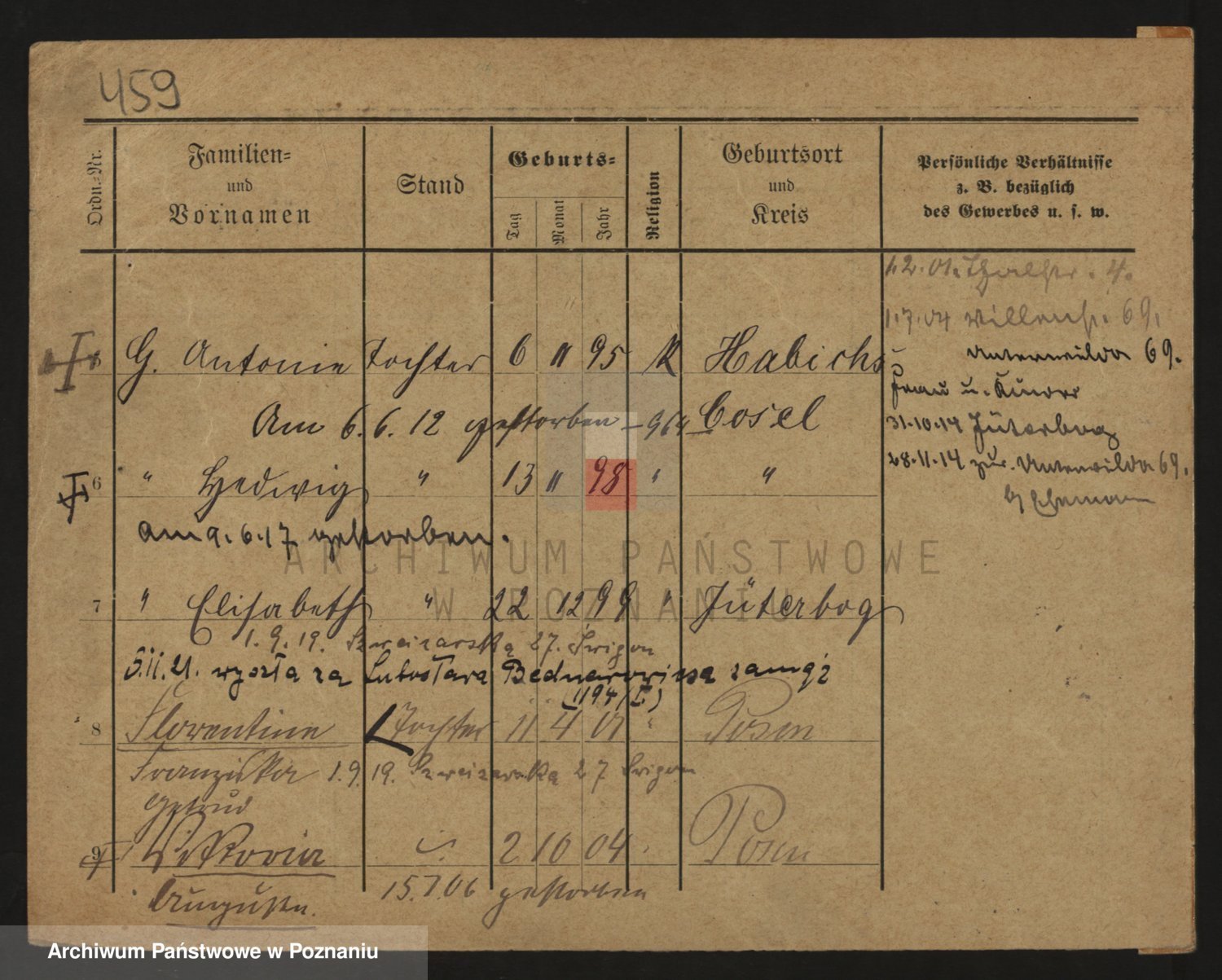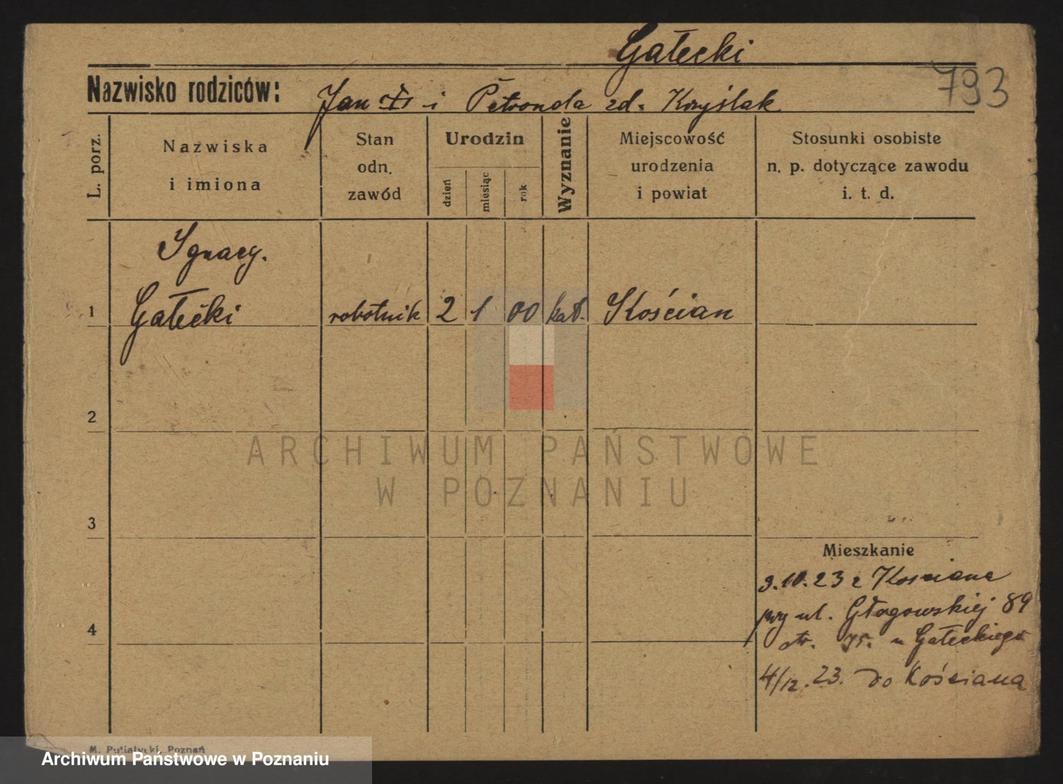 Podgląd karty osobowej dostępny jest po kliknięciu na nazwisko lub ikonkę karty. Można dokonywać powiększenia (ikony na górze) lub przechodzić między kolejnymi skanami (strzałki po bokach).