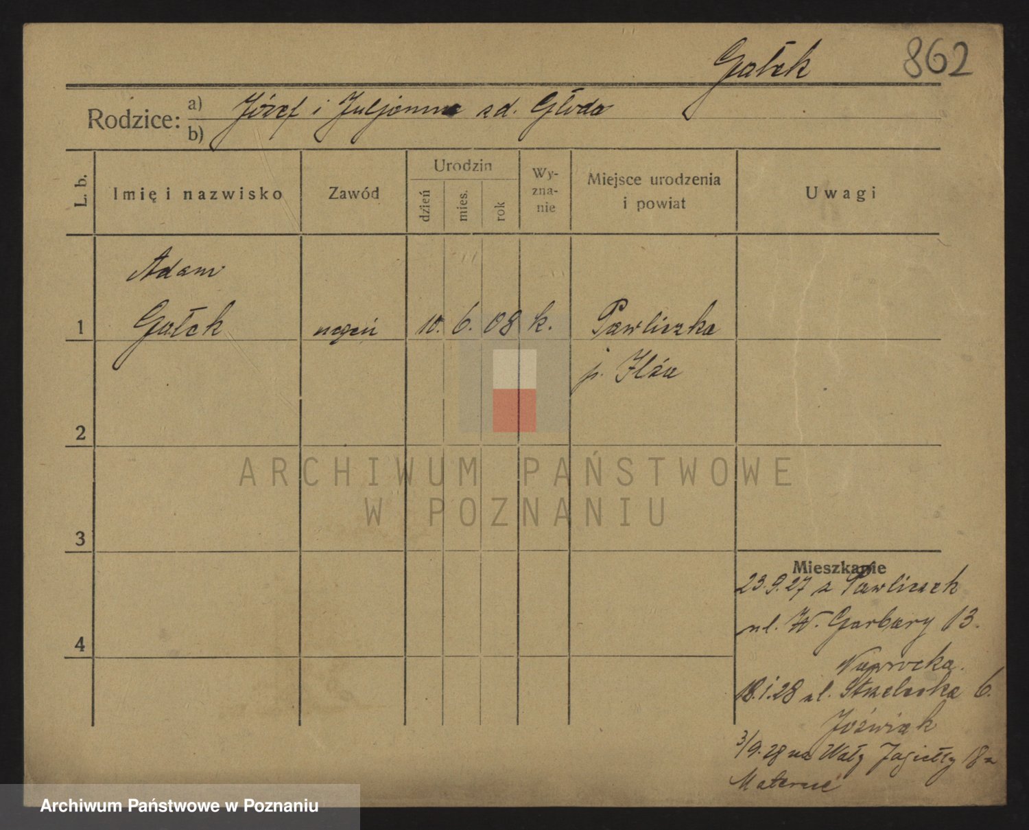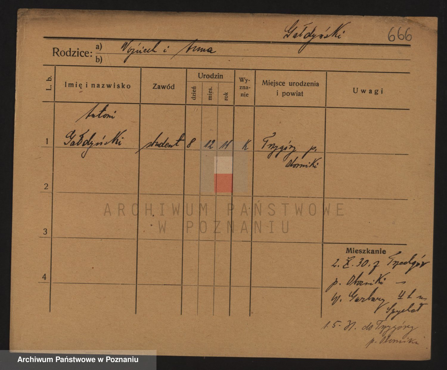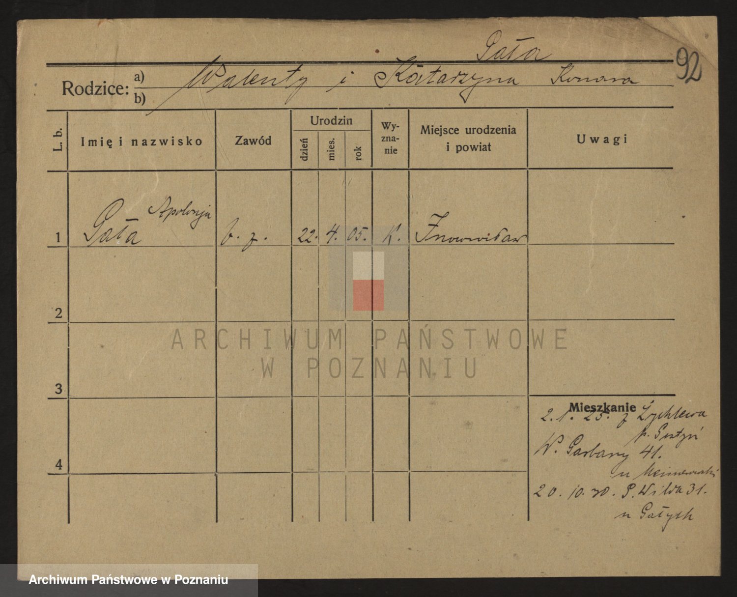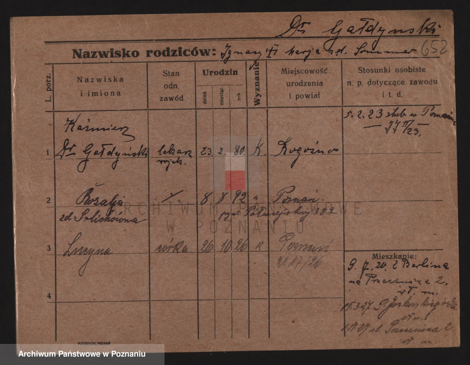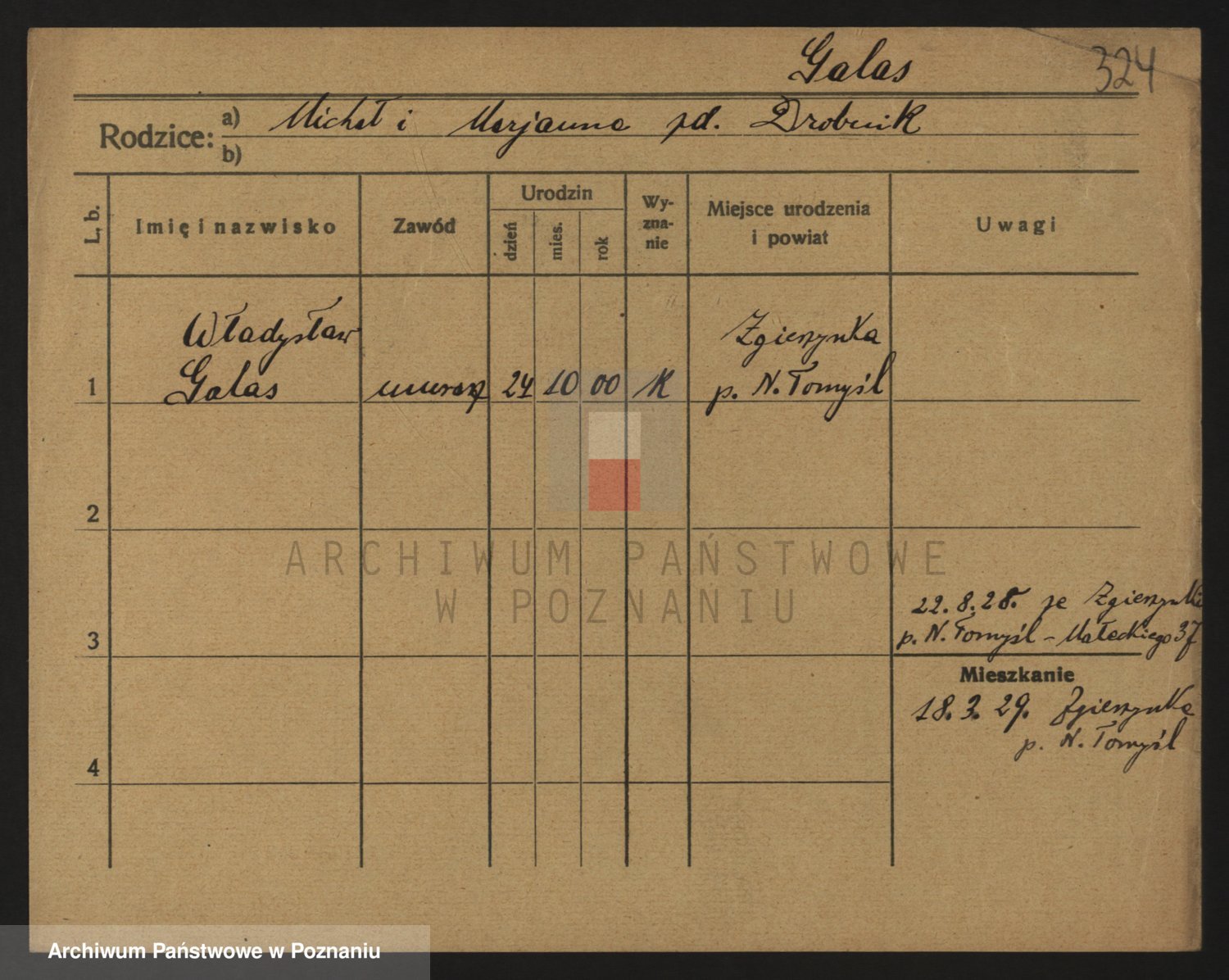 Podgląd karty osobowej dostępny jest po kliknięciu na nazwisko lub ikonkę karty. Można dokonywać powiększenia (ikony na górze) lub przechodzić między kolejnymi skanami (strzałki po bokach).