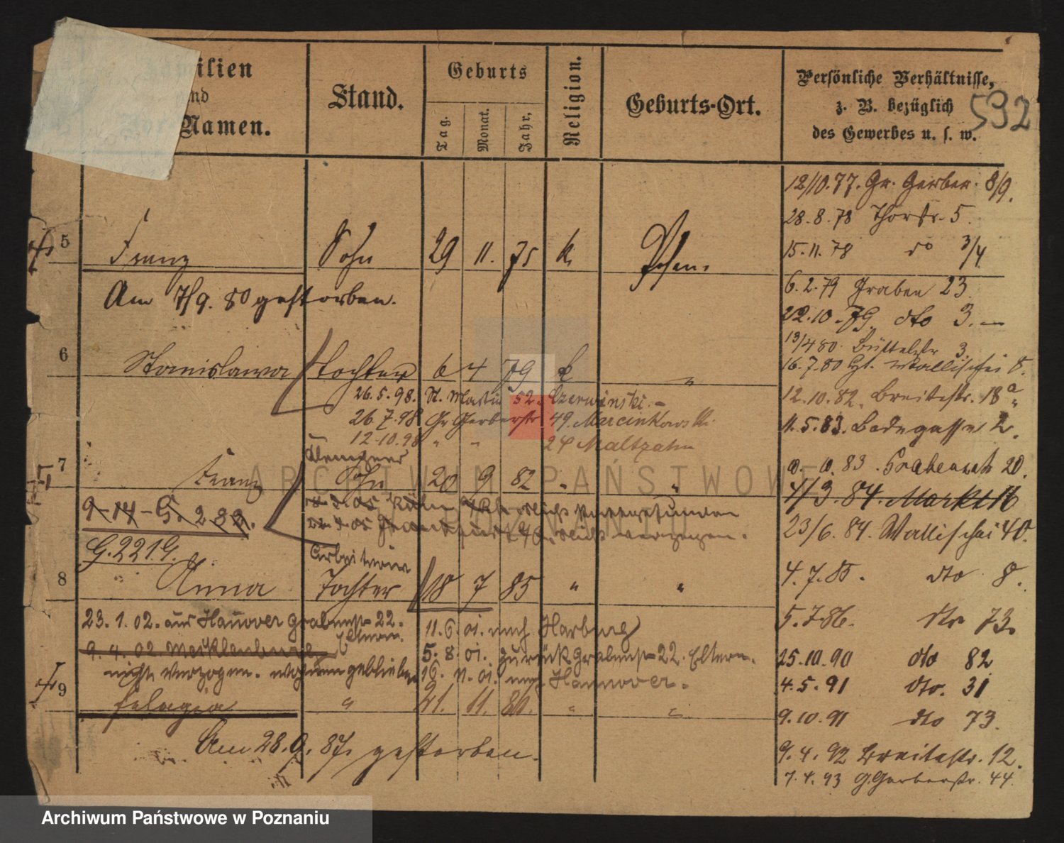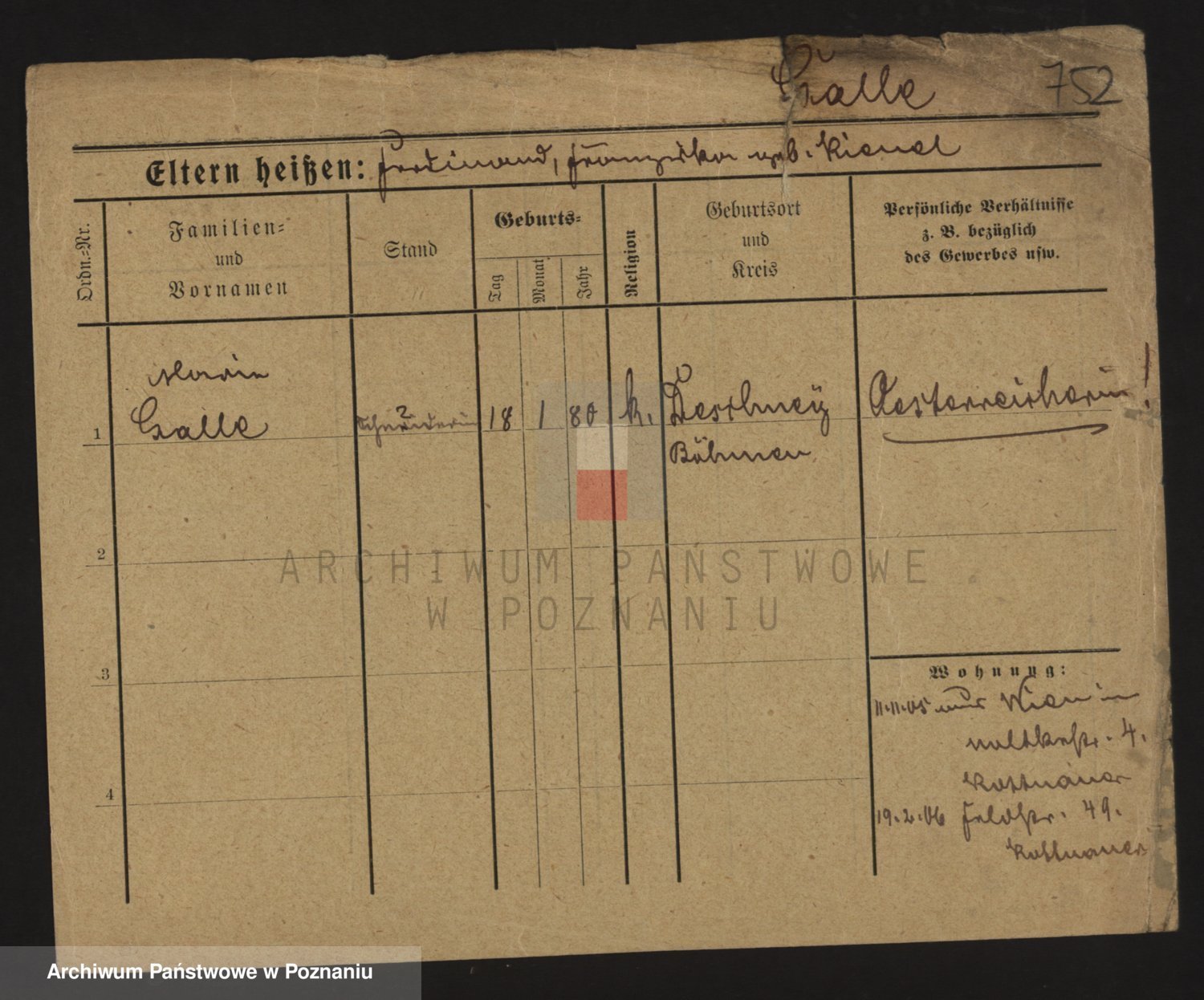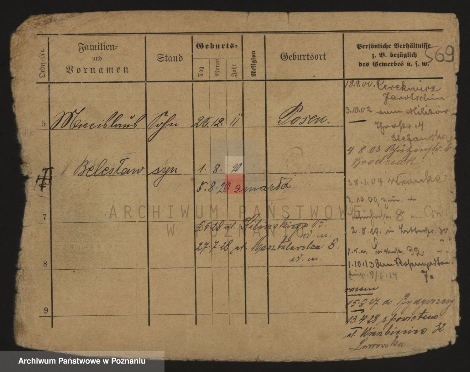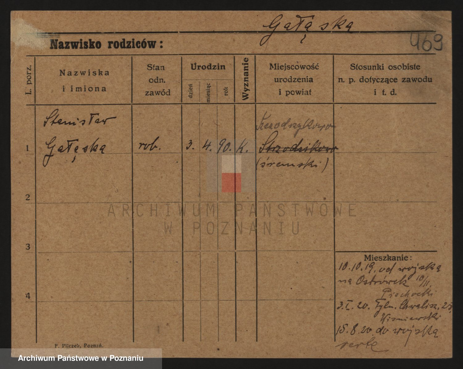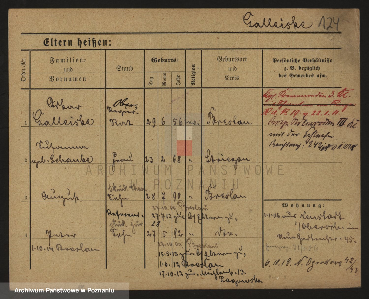 Podgląd karty osobowej dostępny jest po kliknięciu na nazwisko lub ikonkę karty. Można dokonywać powiększenia (ikony na górze) lub przechodzić między kolejnymi skanami (strzałki po bokach).