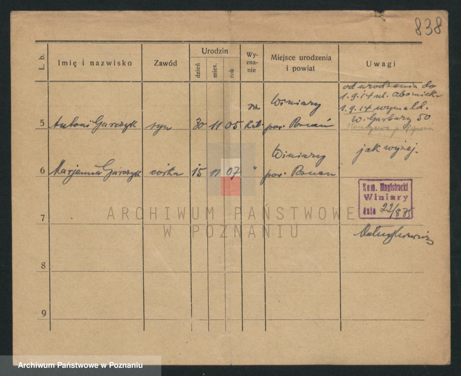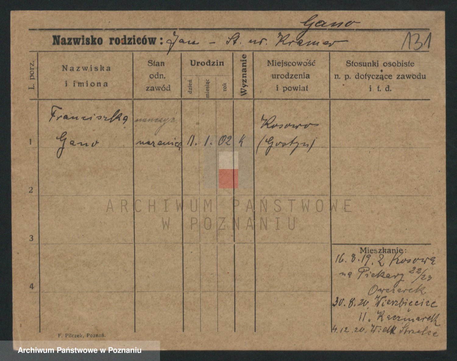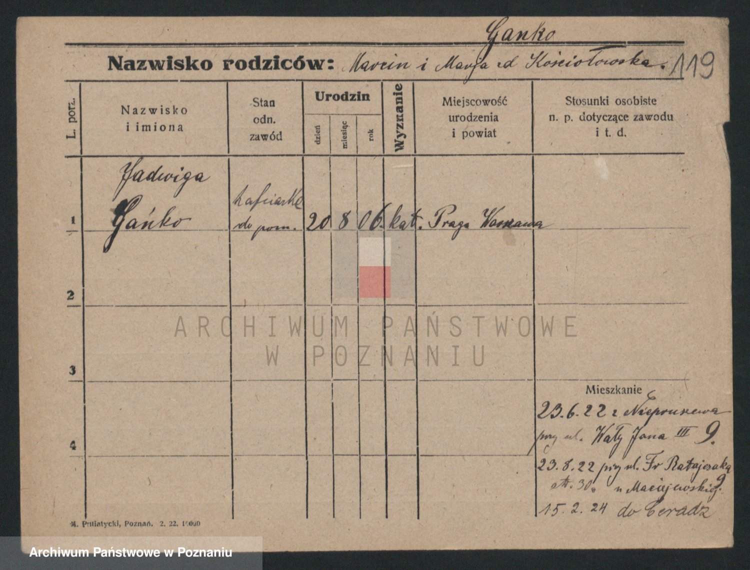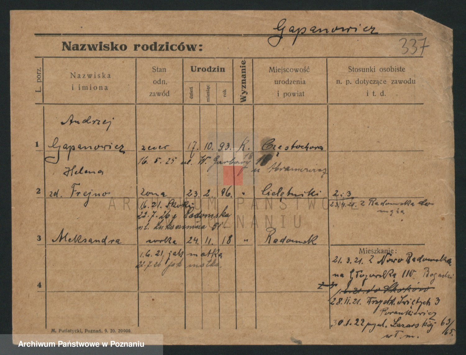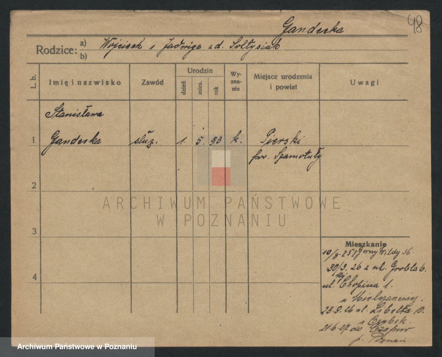 Podgląd karty osobowej dostępny jest po kliknięciu na nazwisko lub ikonkę karty. Można dokonywać powiększenia (ikony na górze) lub przechodzić między kolejnymi skanami (strzałki po bokach).