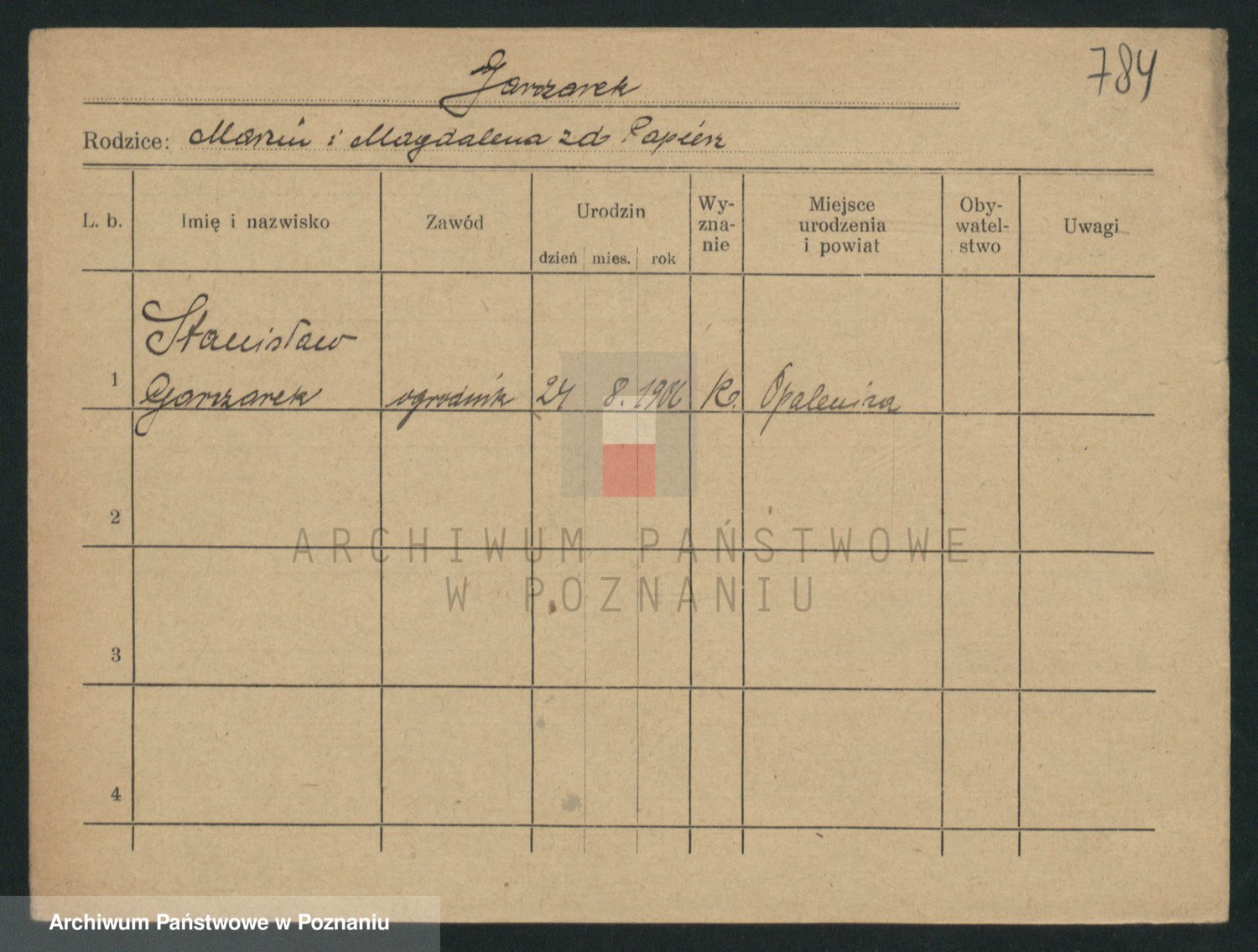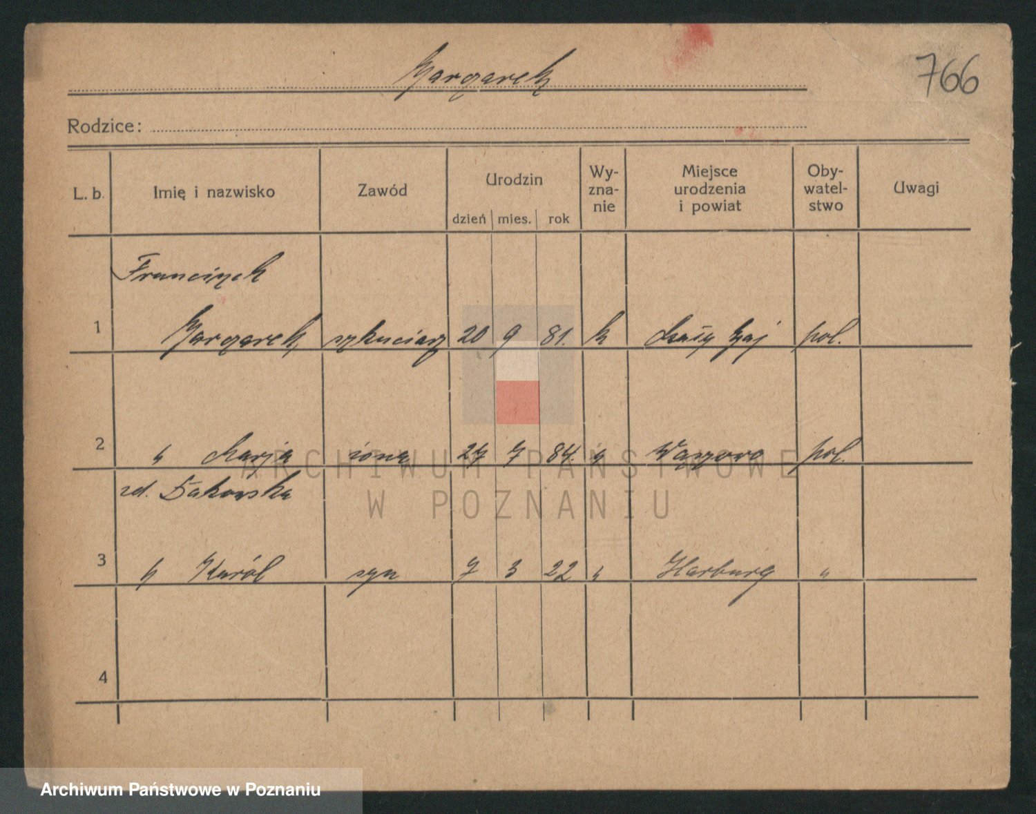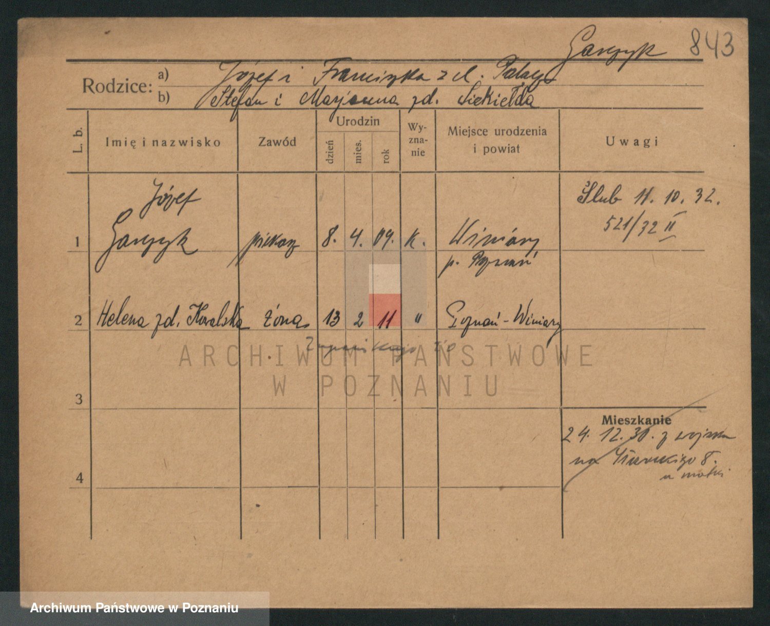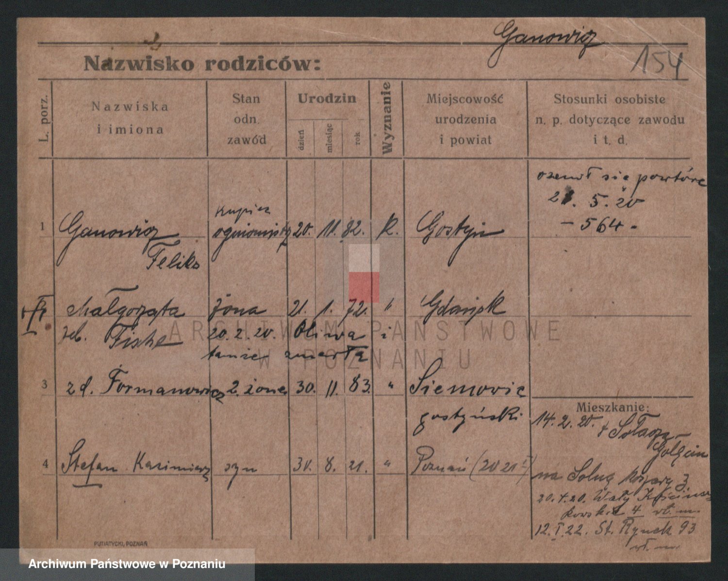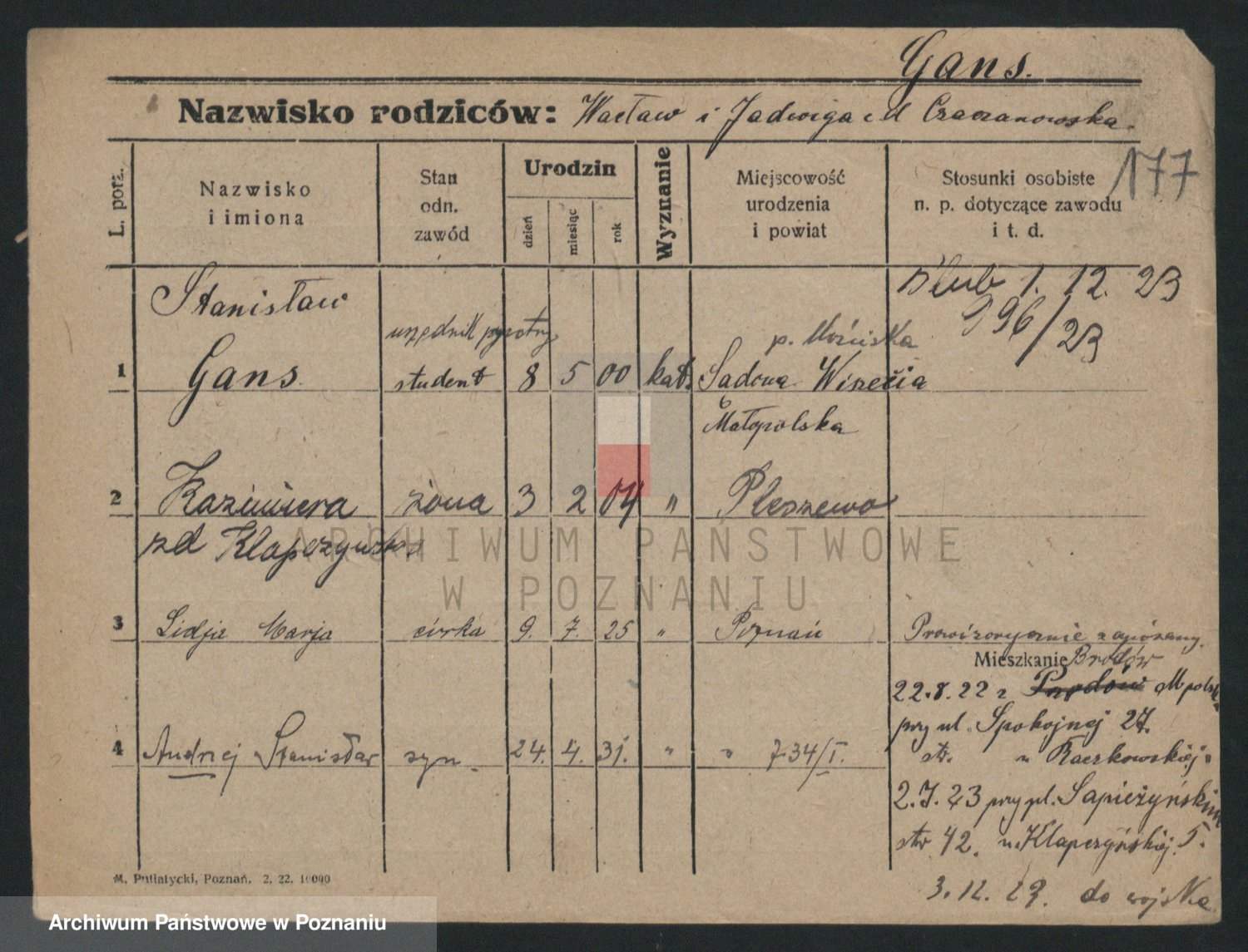 Podgląd karty osobowej dostępny jest po kliknięciu na nazwisko lub ikonkę karty. Można dokonywać powiększenia (ikony na górze) lub przechodzić między kolejnymi skanami (strzałki po bokach).