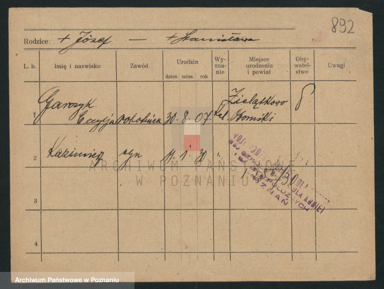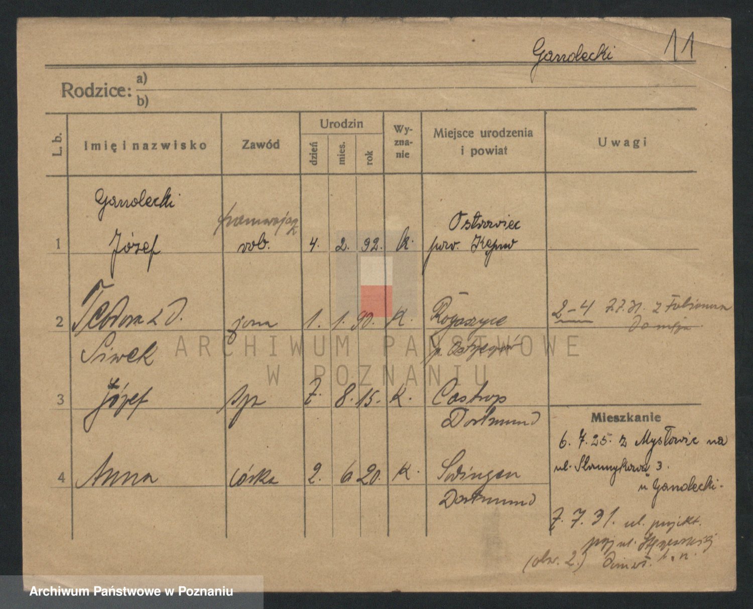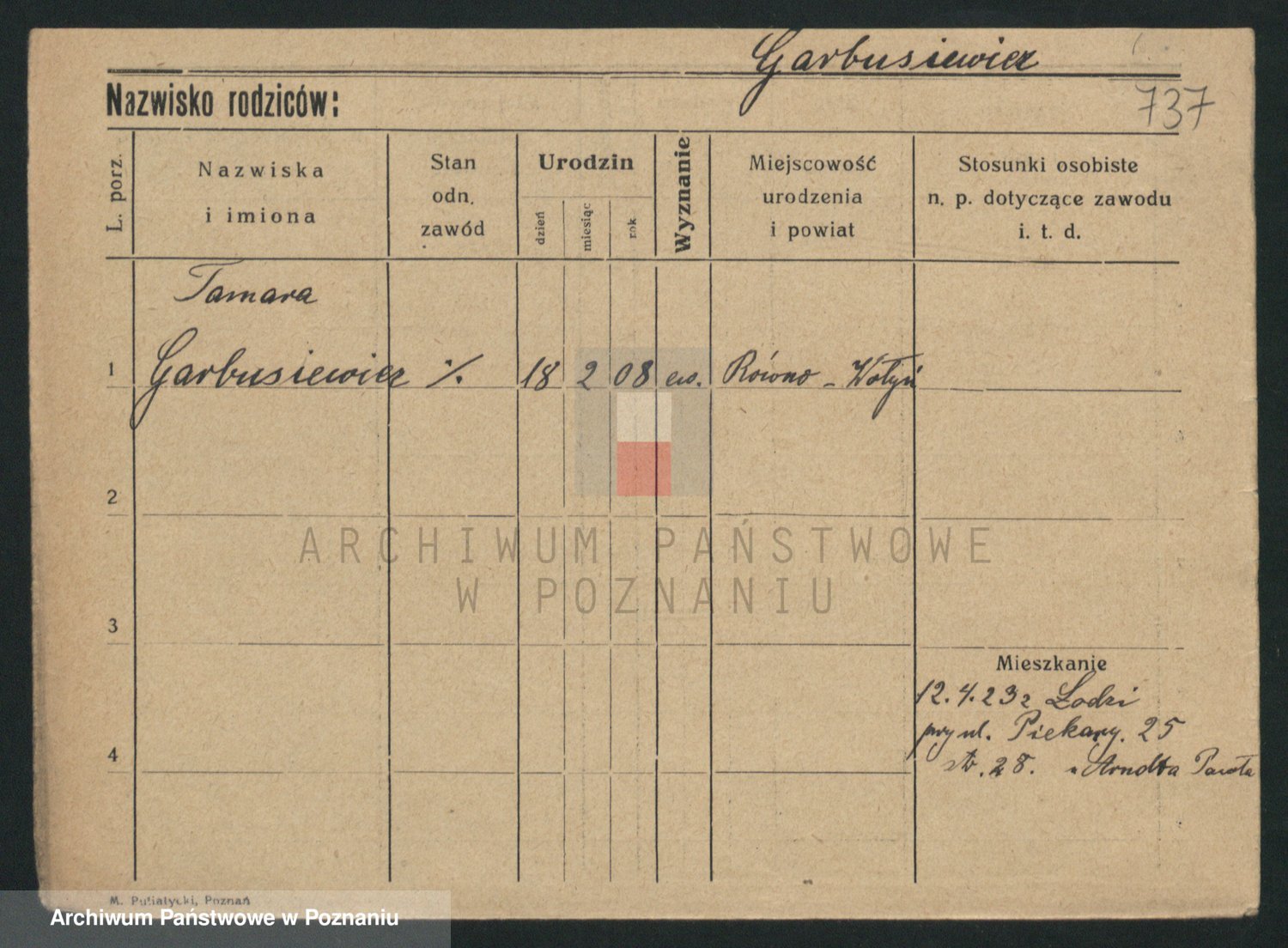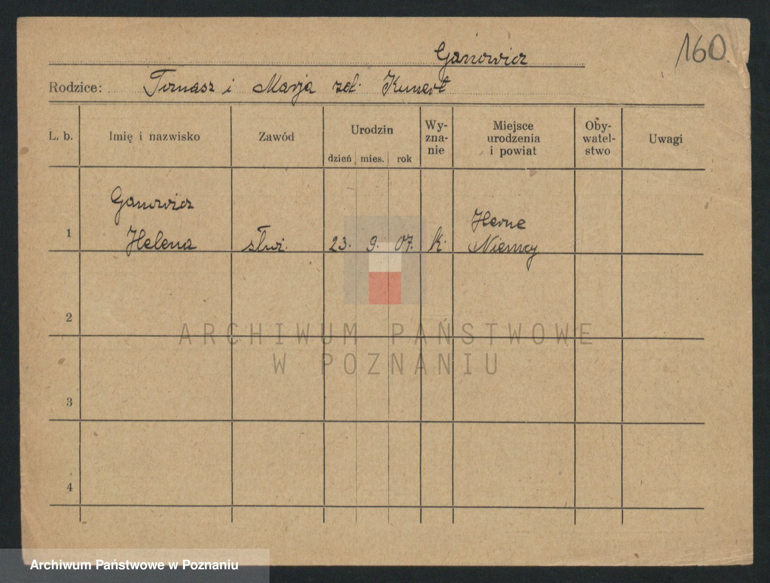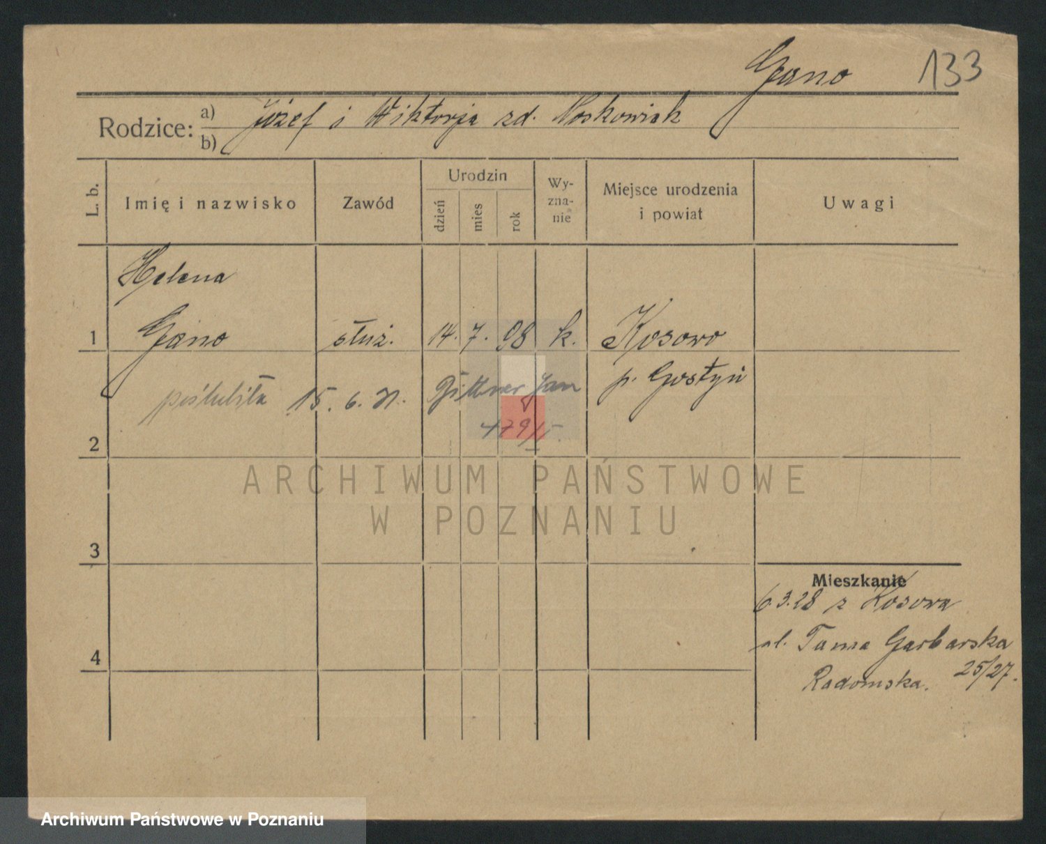 Podgląd karty osobowej dostępny jest po kliknięciu na nazwisko lub ikonkę karty. Można dokonywać powiększenia (ikony na górze) lub przechodzić między kolejnymi skanami (strzałki po bokach).