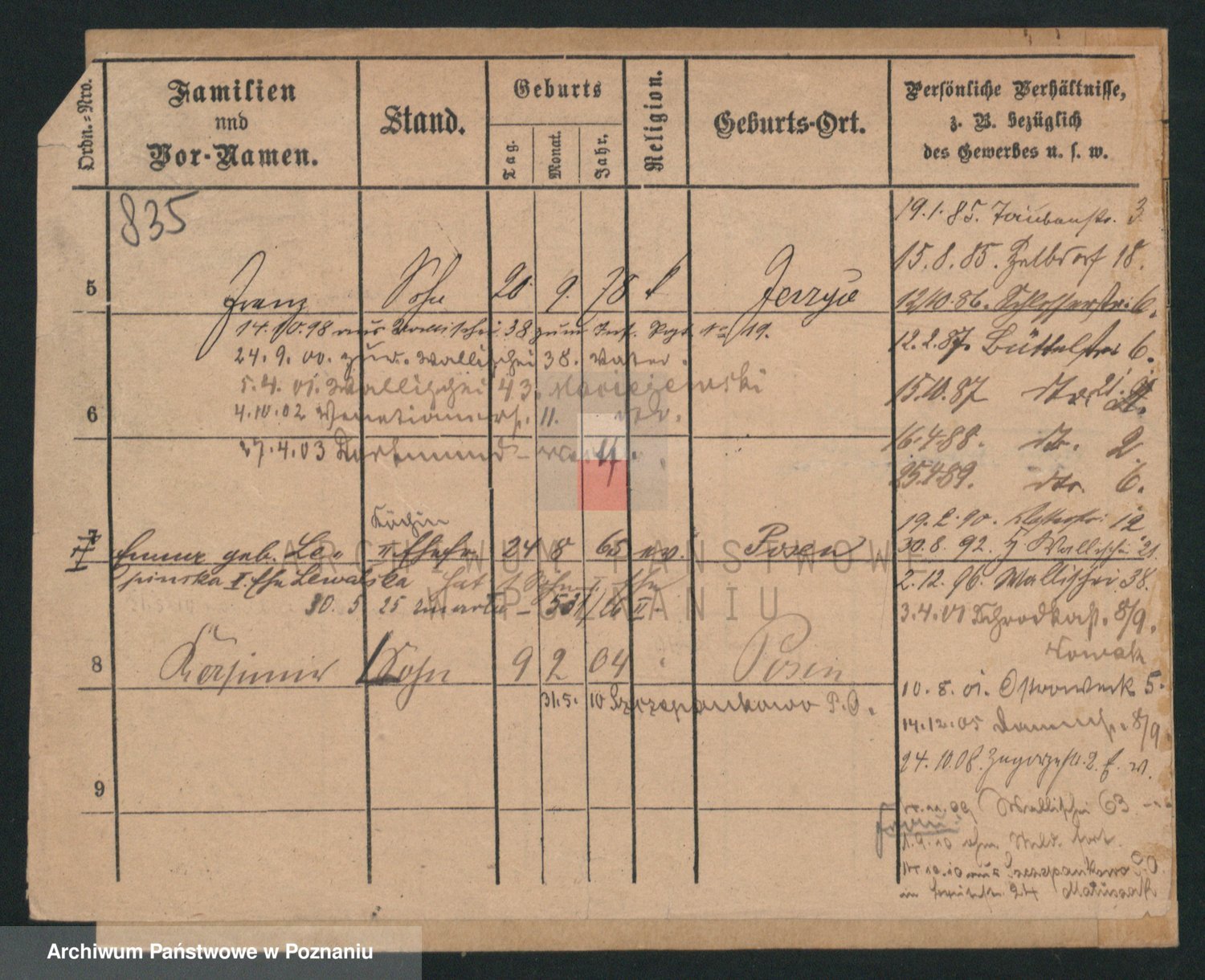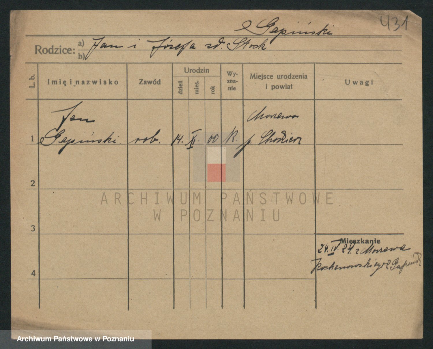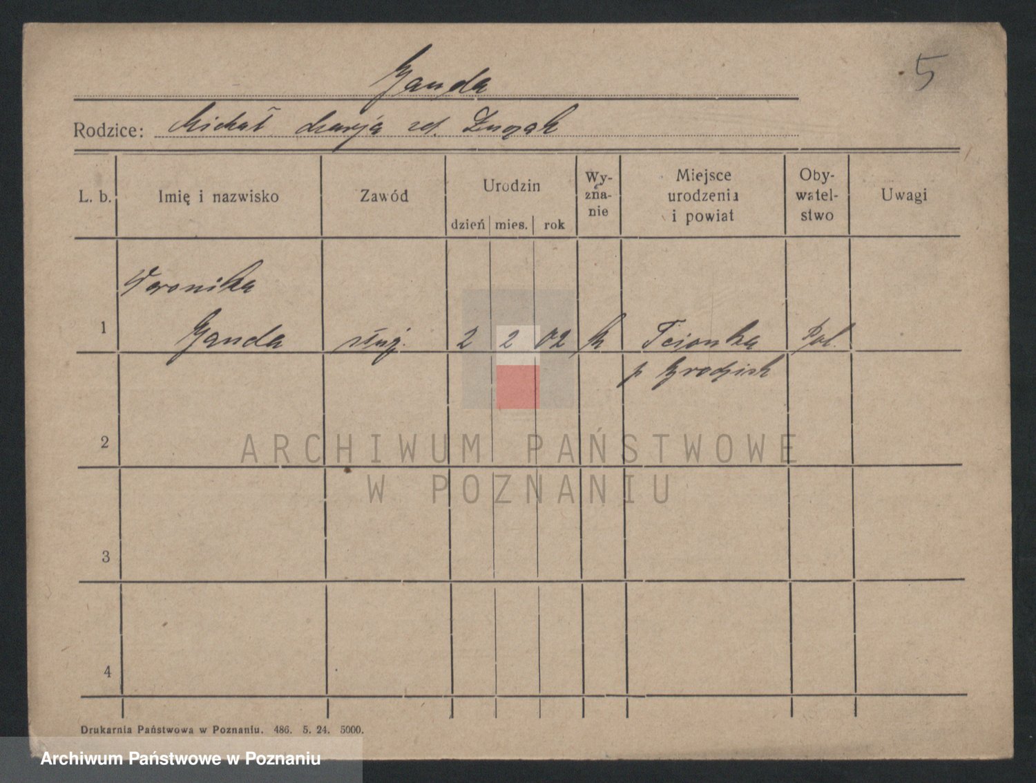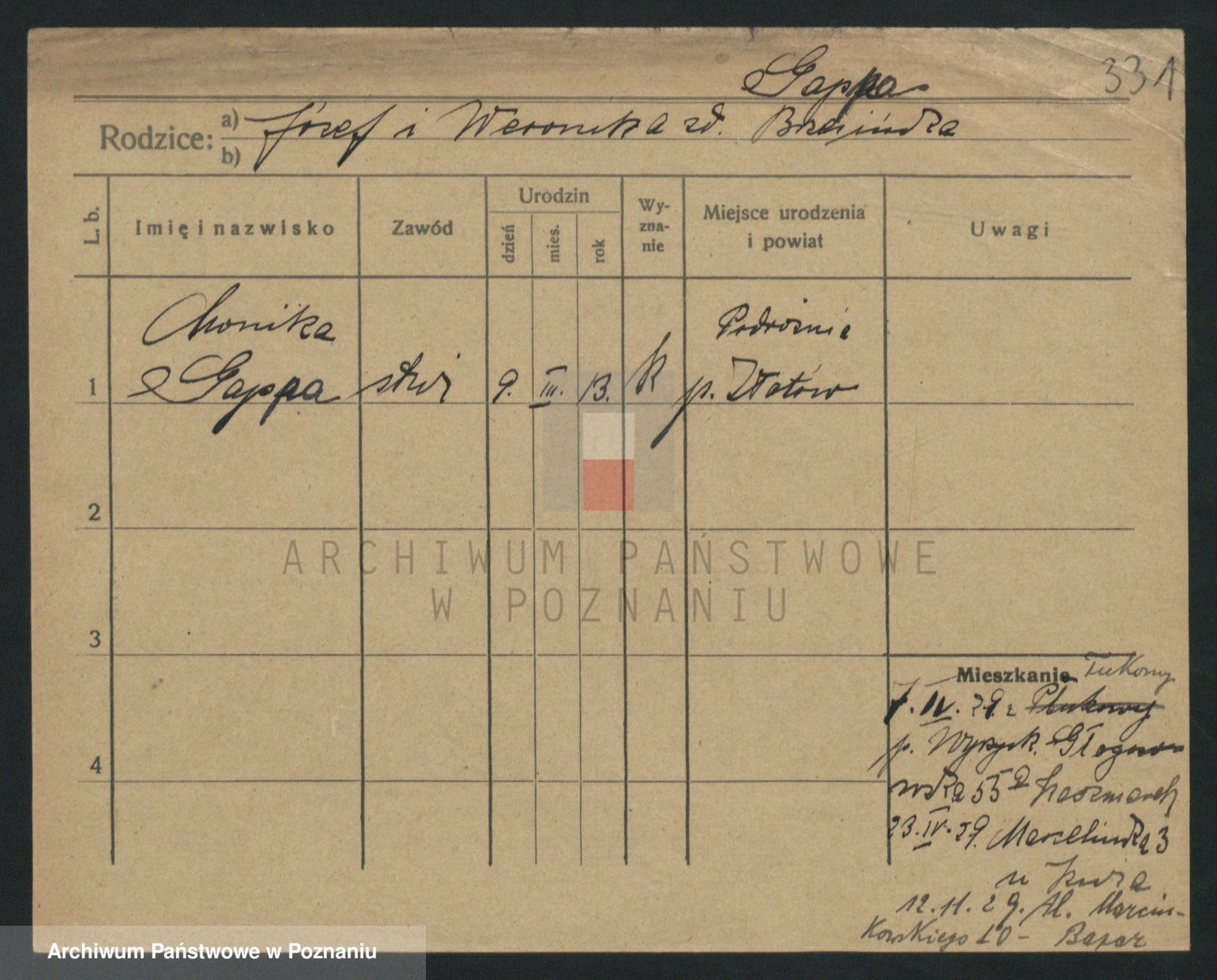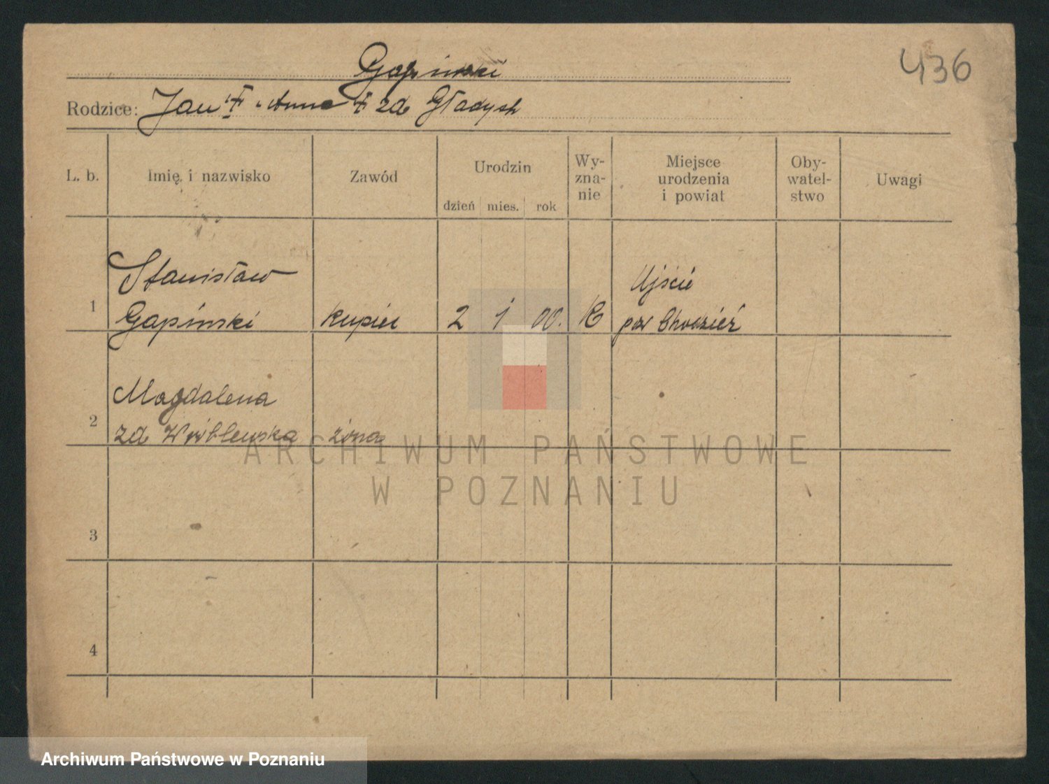 Podgląd karty osobowej dostępny jest po kliknięciu na nazwisko lub ikonkę karty. Można dokonywać powiększenia (ikony na górze) lub przechodzić między kolejnymi skanami (strzałki po bokach).