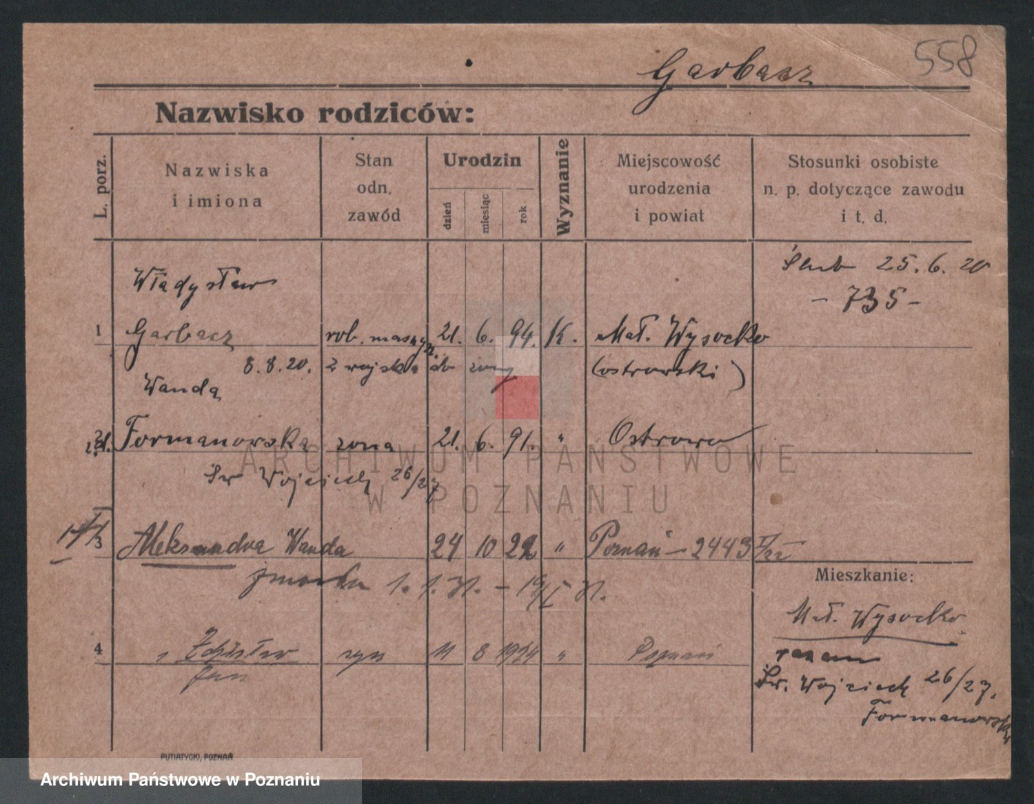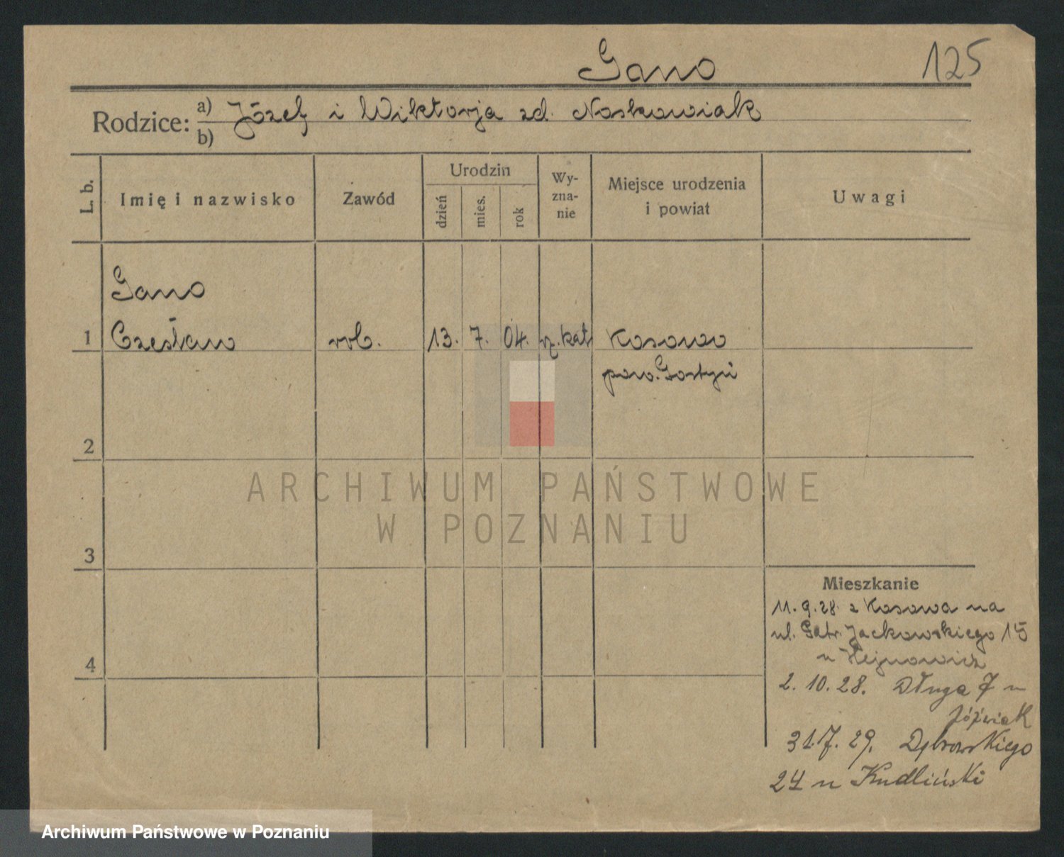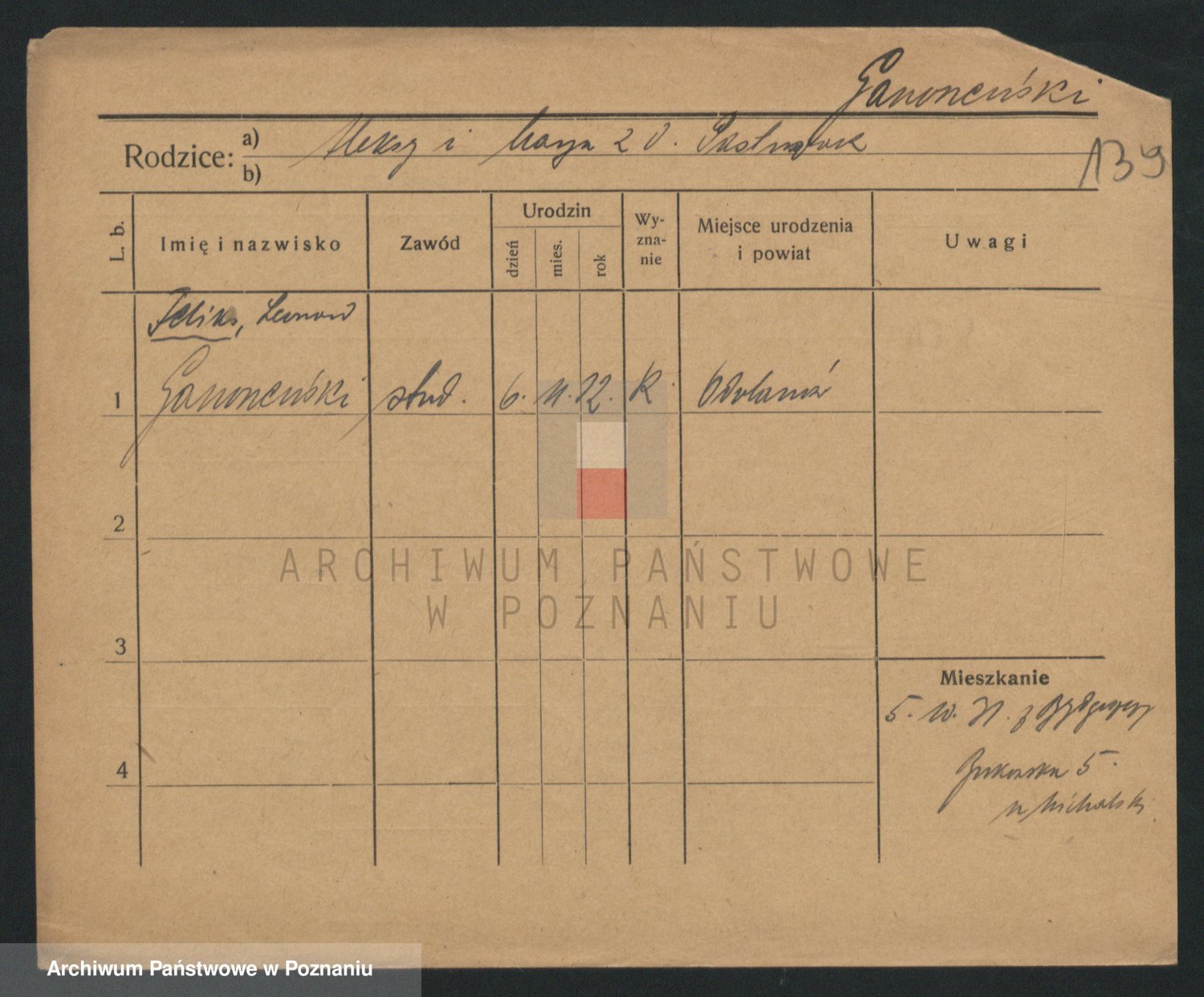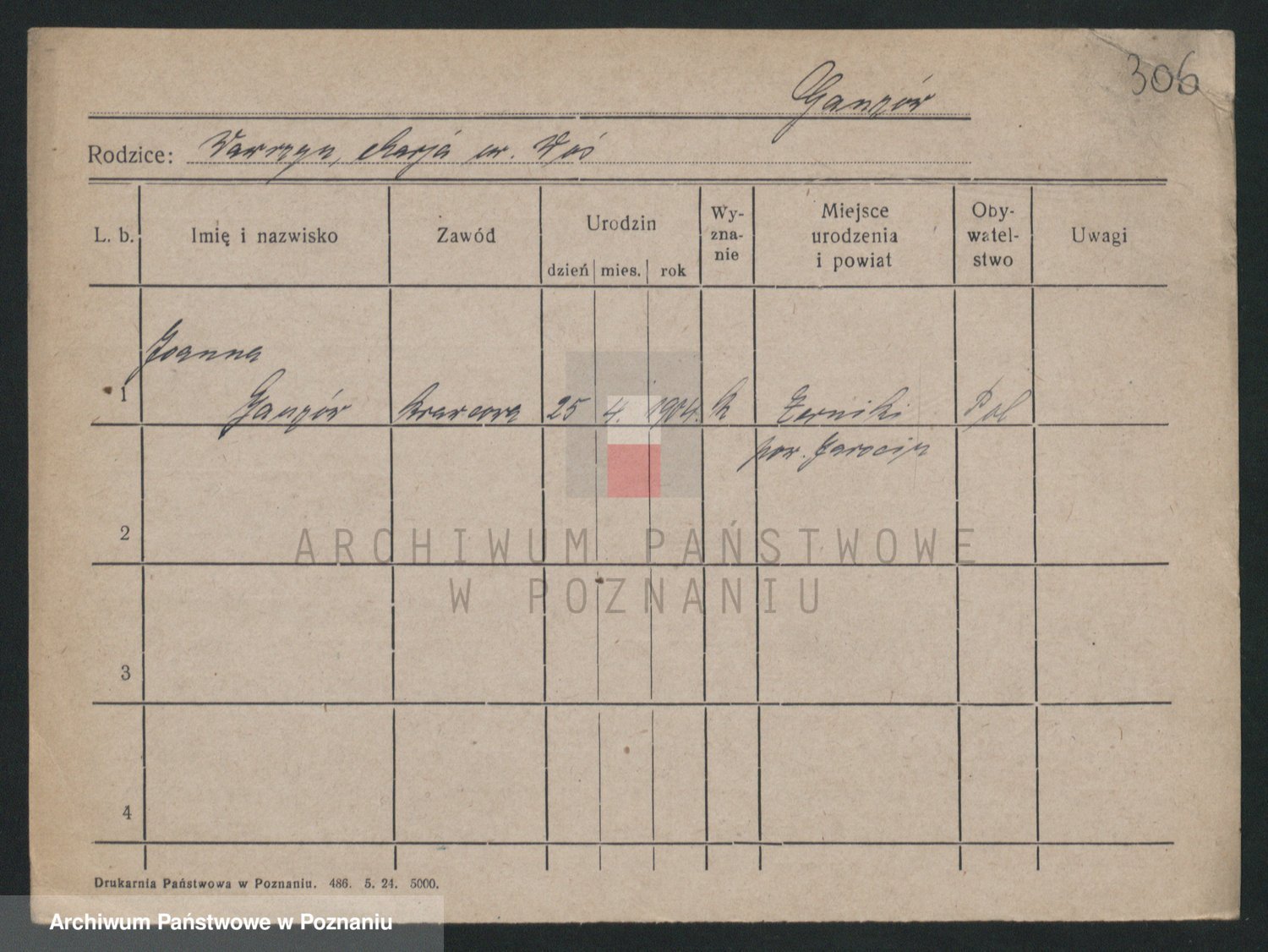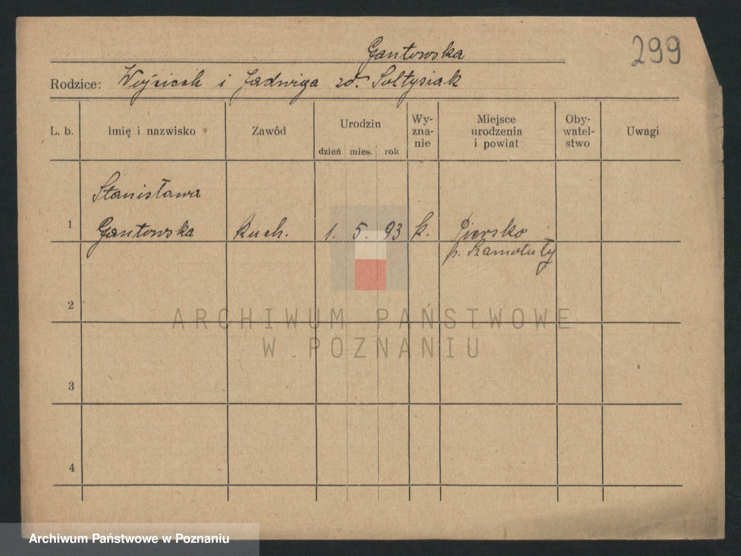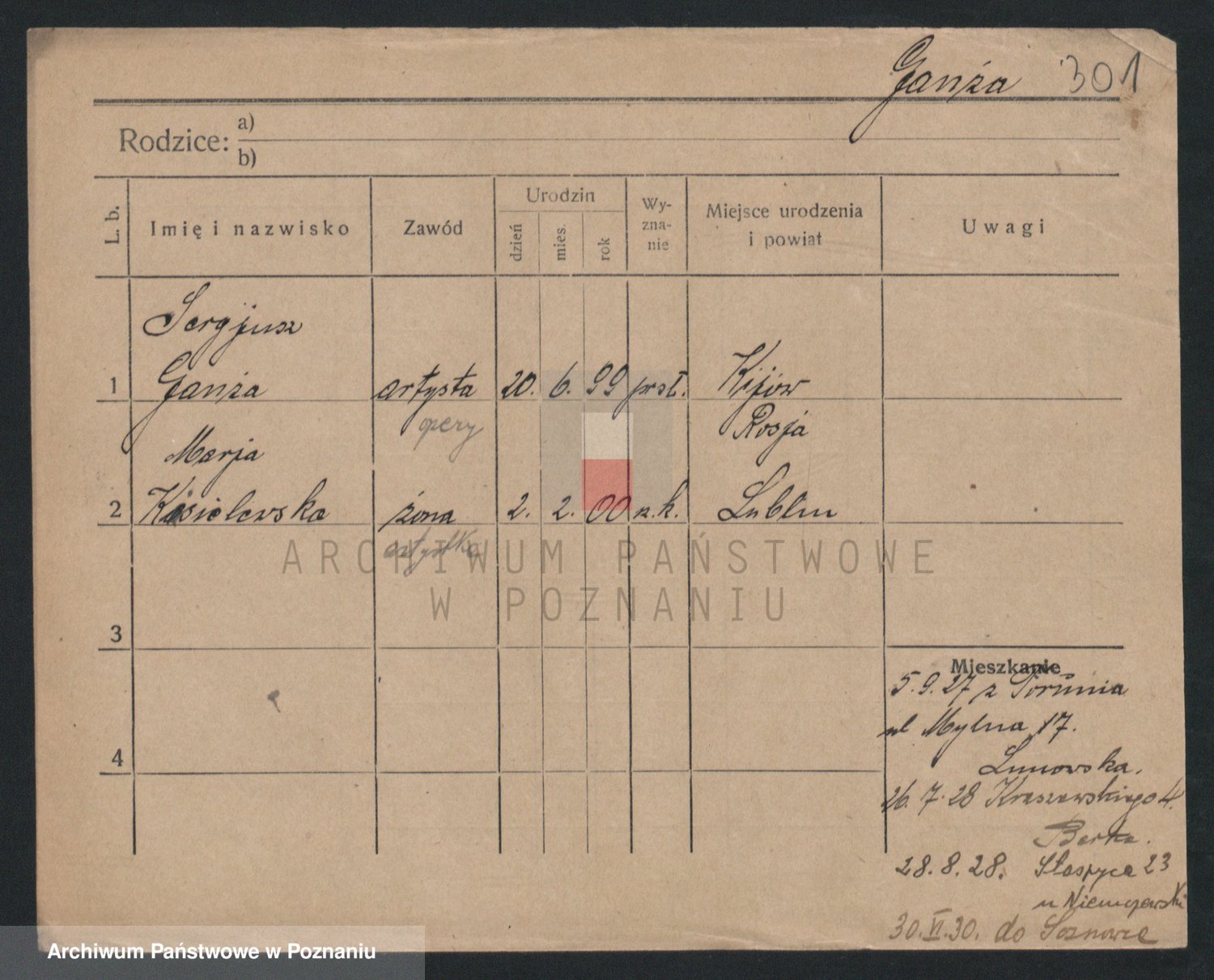 Podgląd karty osobowej dostępny jest po kliknięciu na nazwisko lub ikonkę karty. Można dokonywać powiększenia (ikony na górze) lub przechodzić między kolejnymi skanami (strzałki po bokach).
