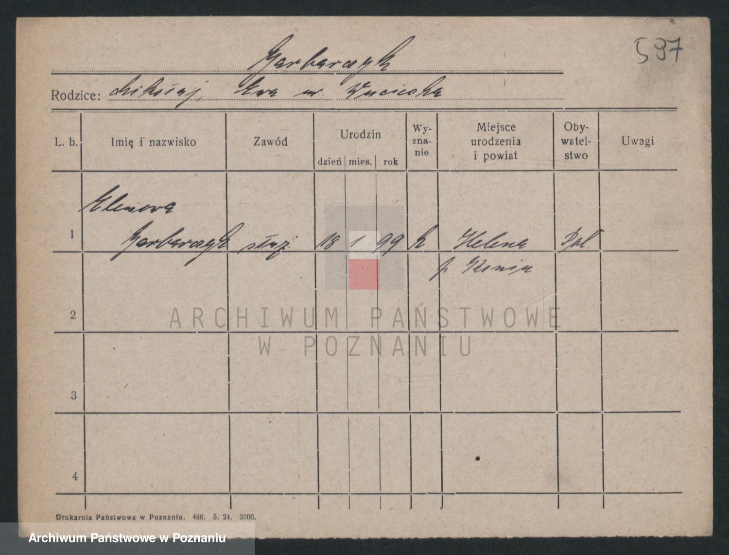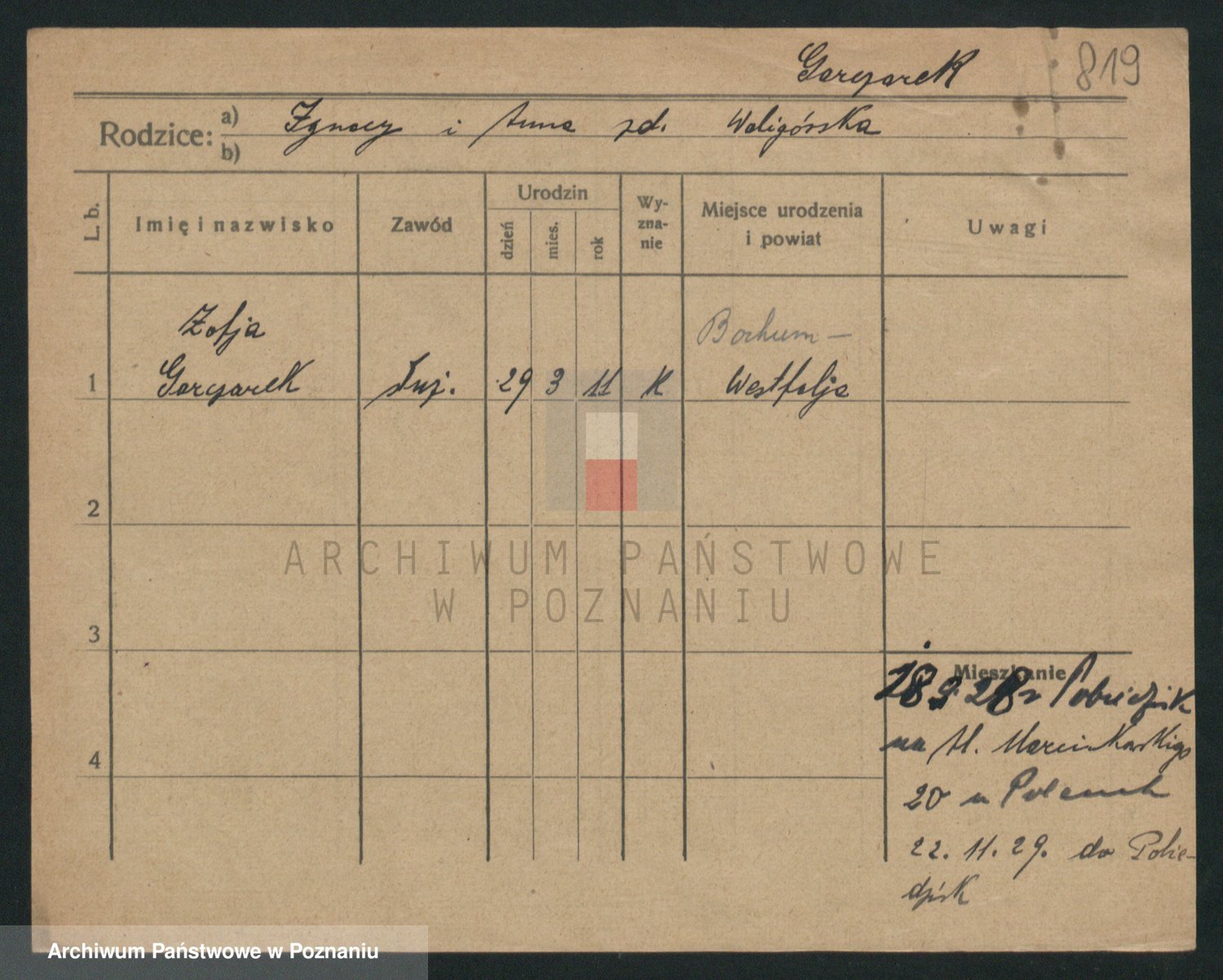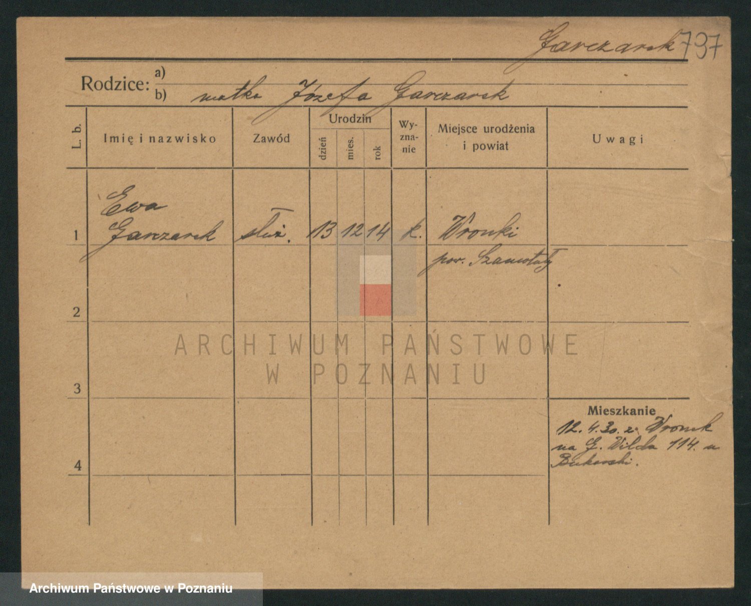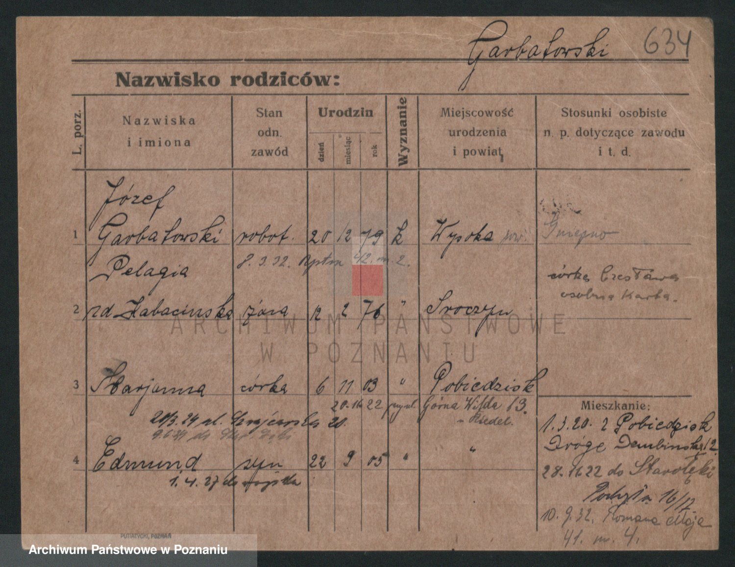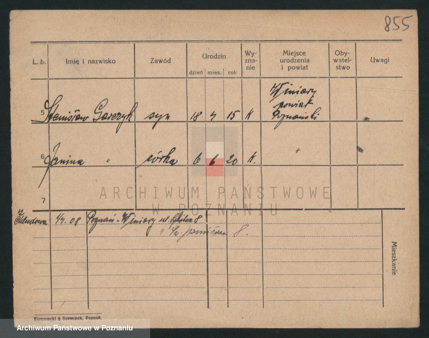 Podgląd karty osobowej dostępny jest po kliknięciu na nazwisko lub ikonkę karty. Można dokonywać powiększenia (ikony na górze) lub przechodzić między kolejnymi skanami (strzałki po bokach).