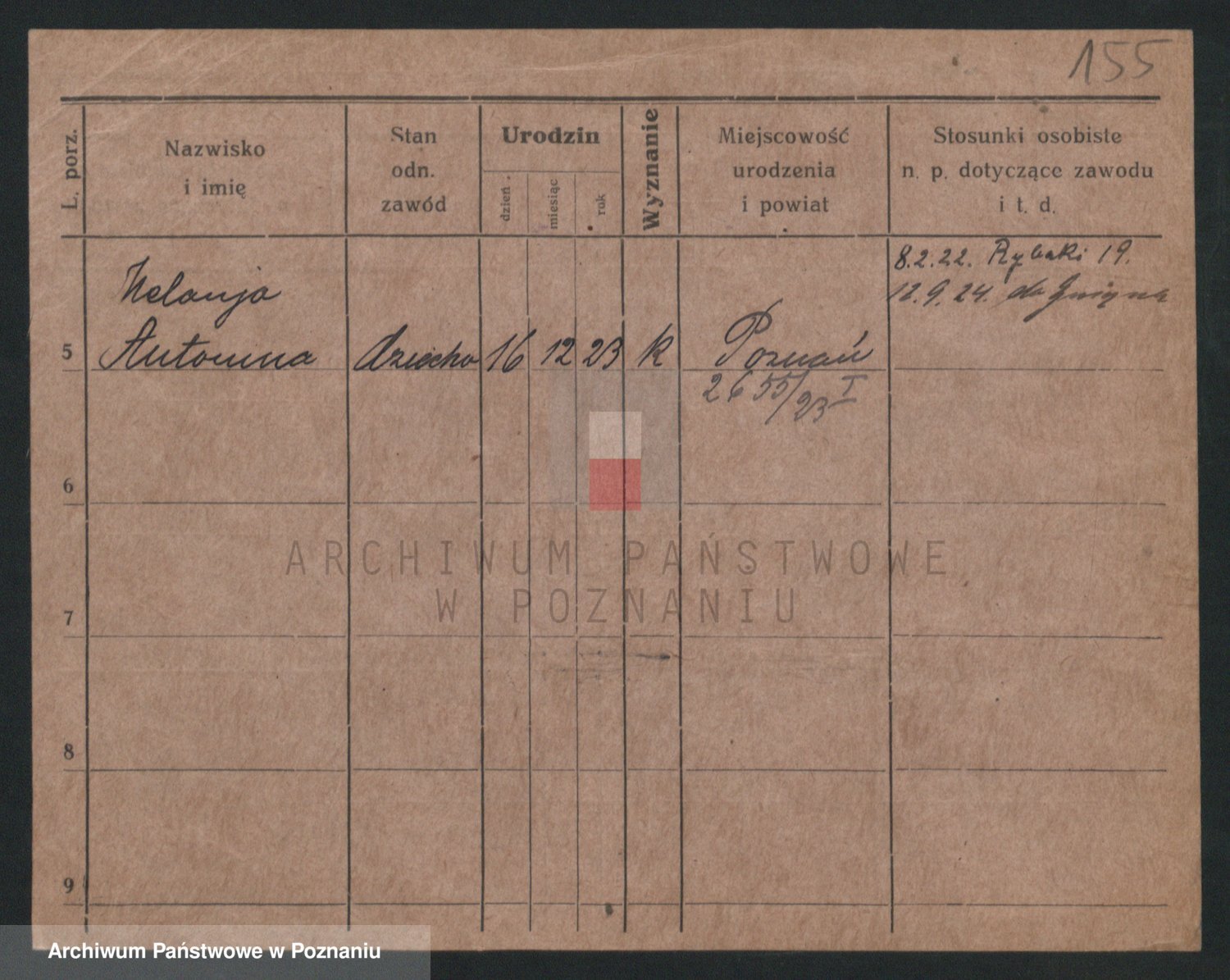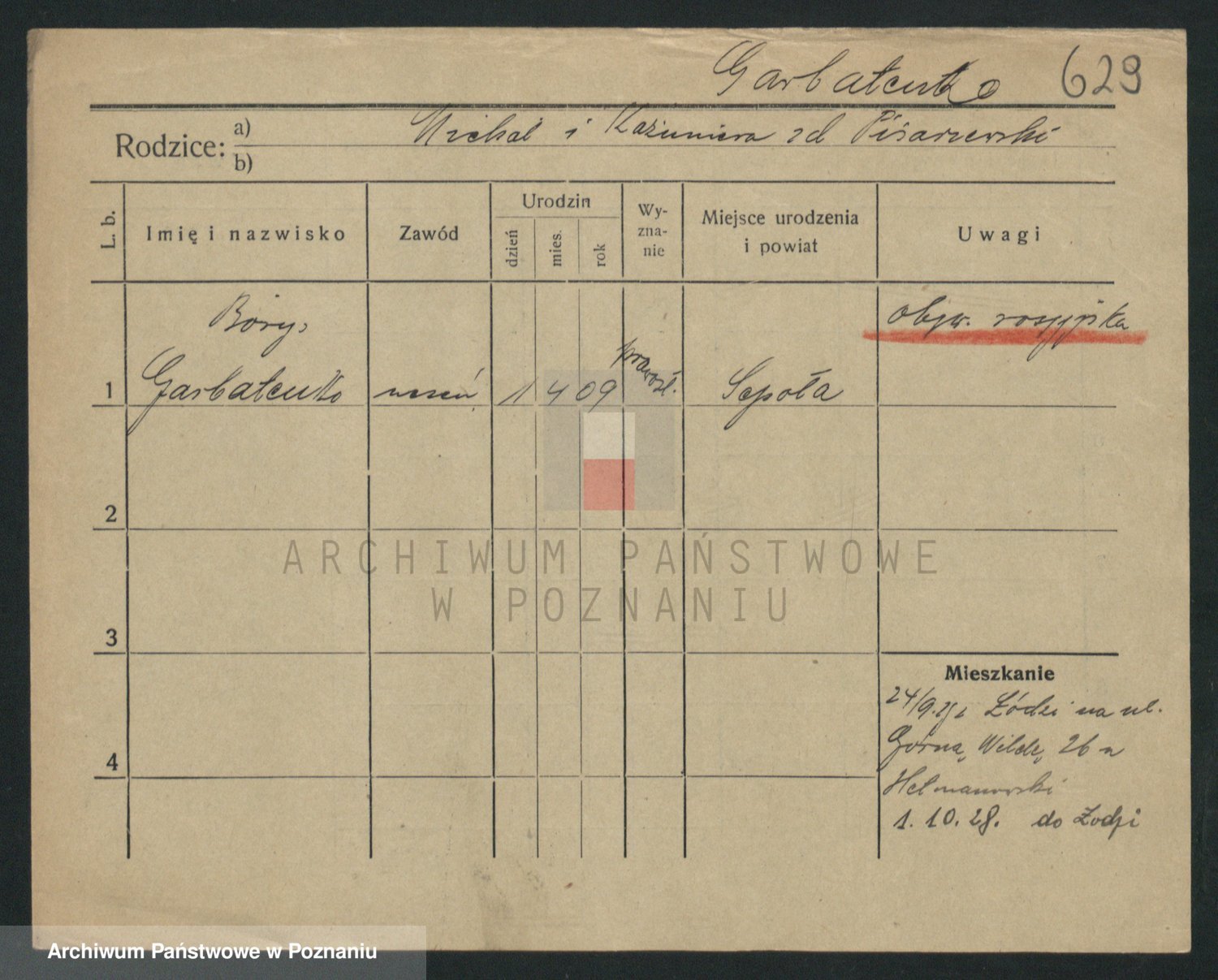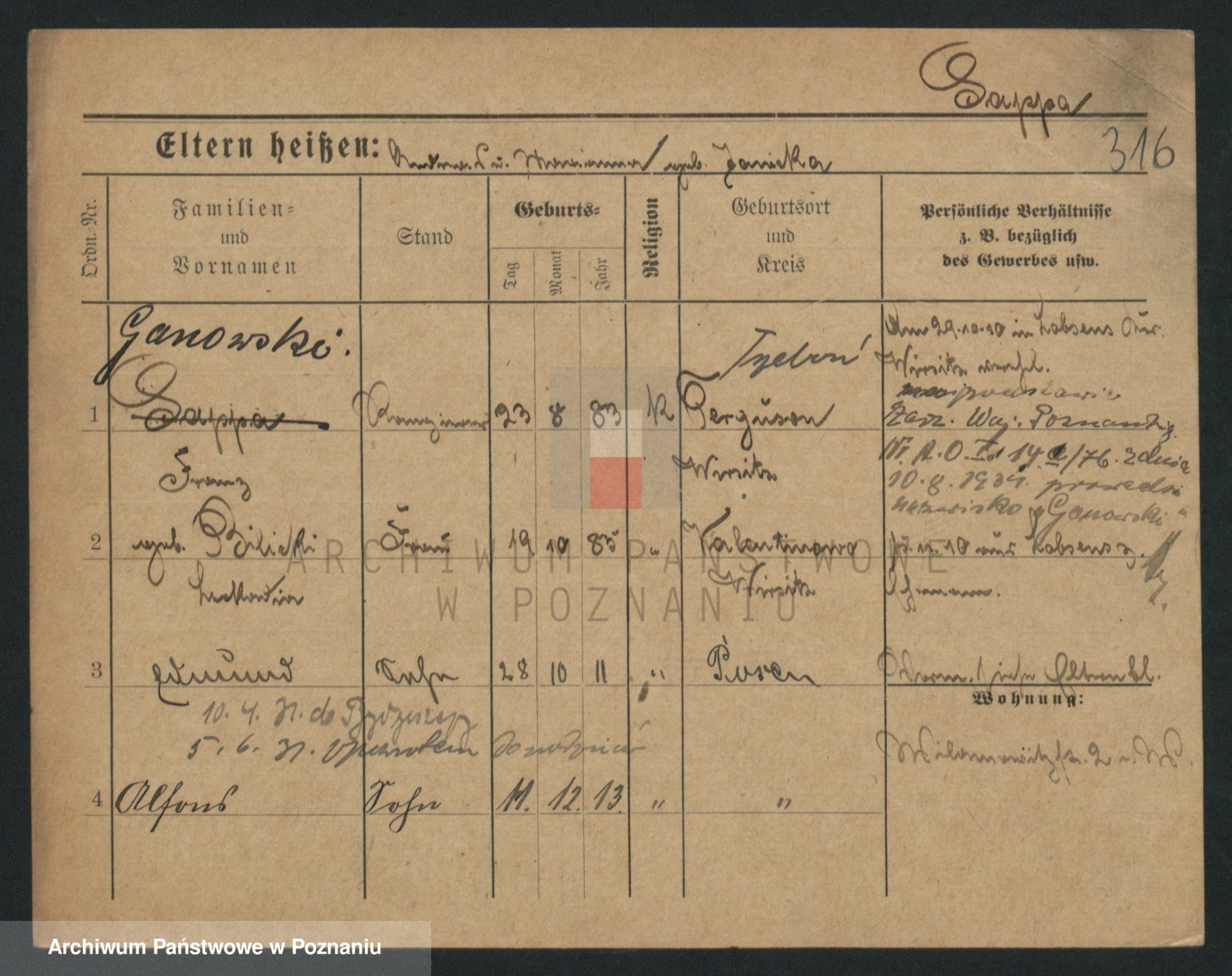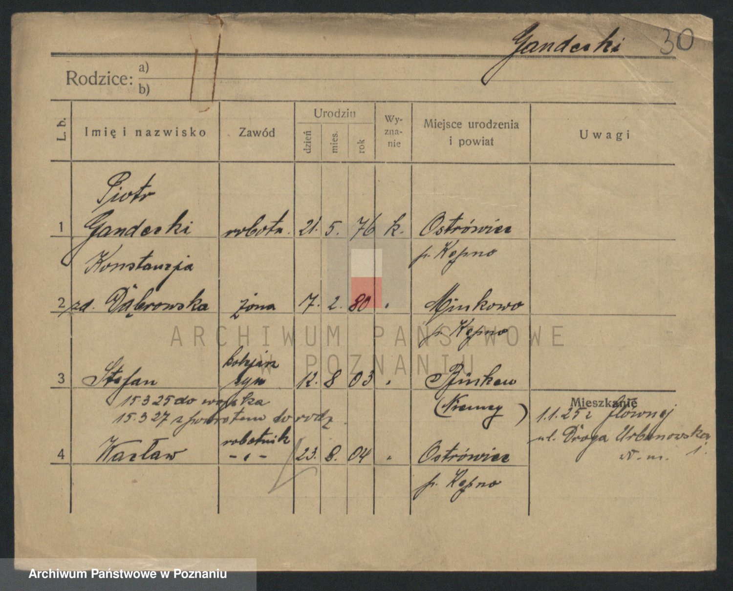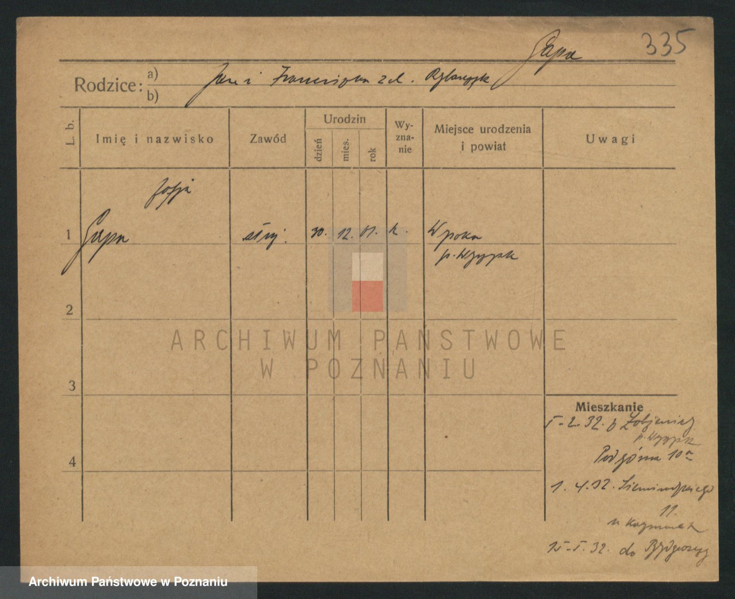 Podgląd karty osobowej dostępny jest po kliknięciu na nazwisko lub ikonkę karty. Można dokonywać powiększenia (ikony na górze) lub przechodzić między kolejnymi skanami (strzałki po bokach).