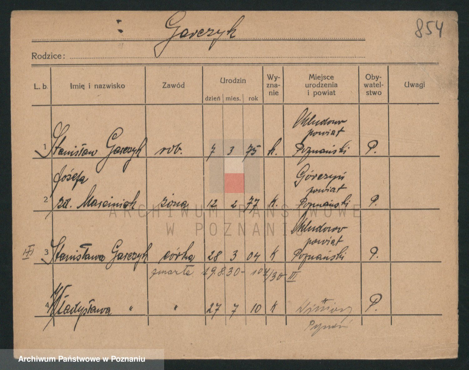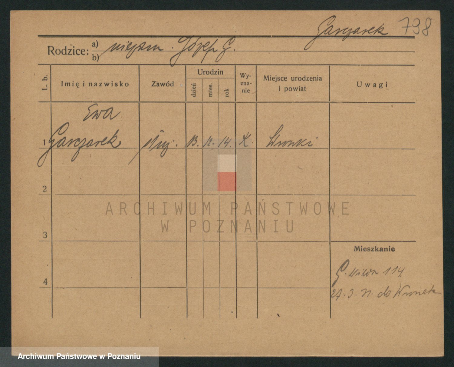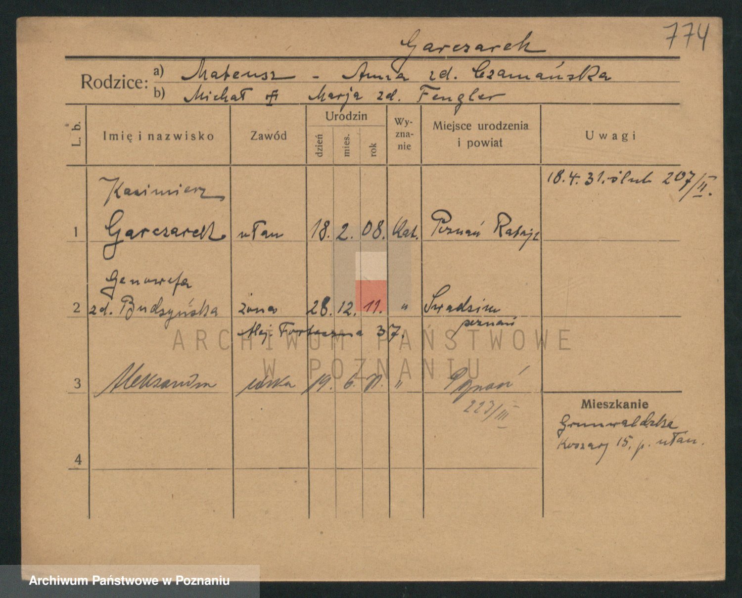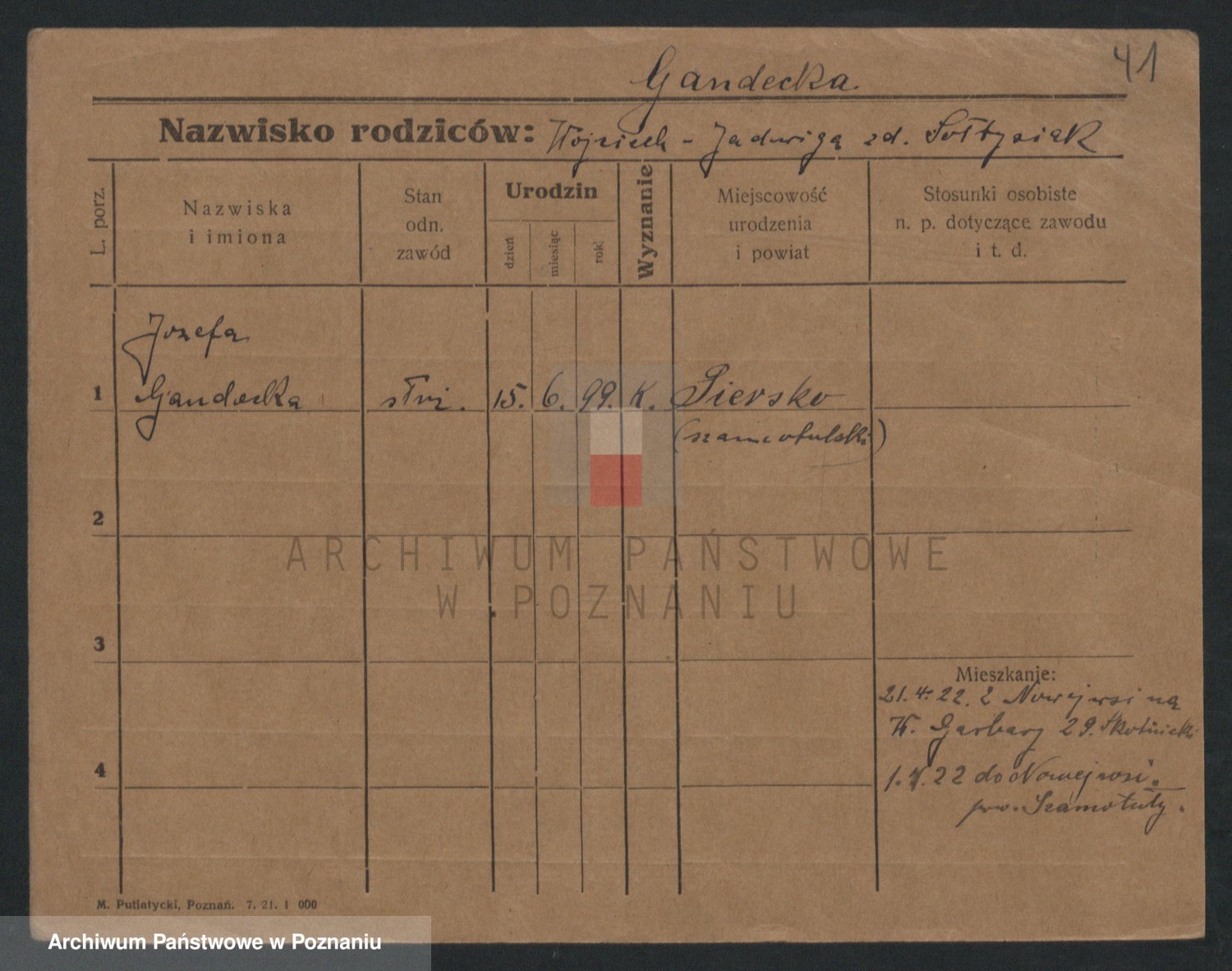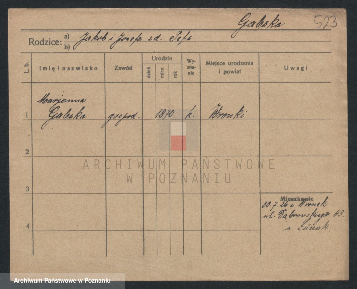 Podgląd karty osobowej dostępny jest po kliknięciu na nazwisko lub ikonkę karty. Można dokonywać powiększenia (ikony na górze) lub przechodzić między kolejnymi skanami (strzałki po bokach).