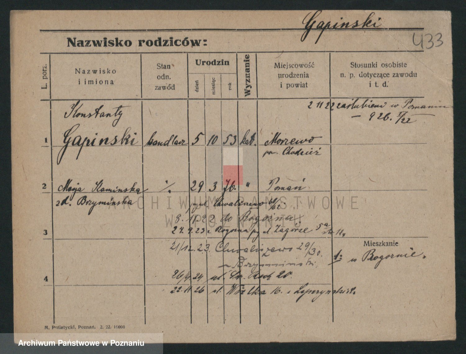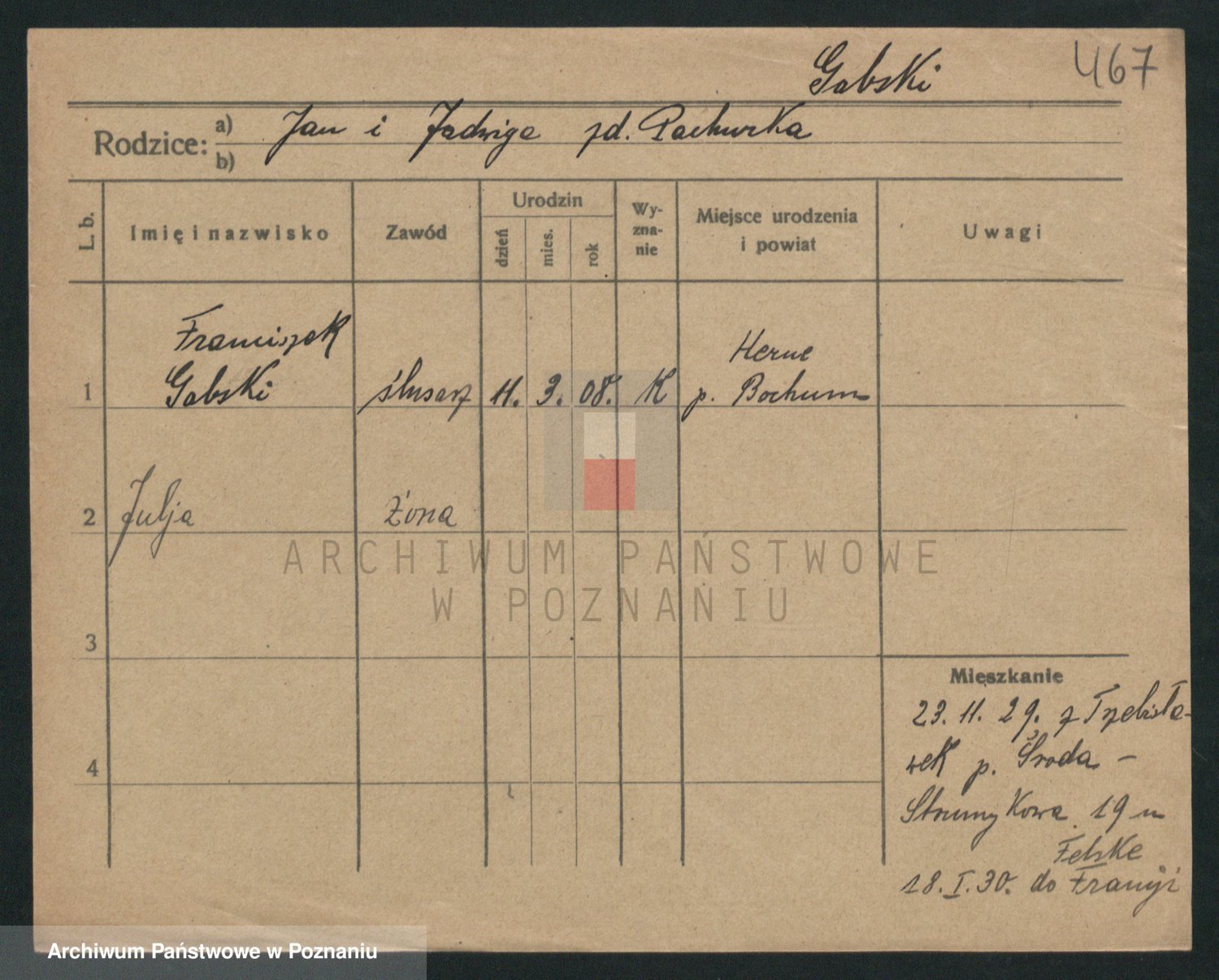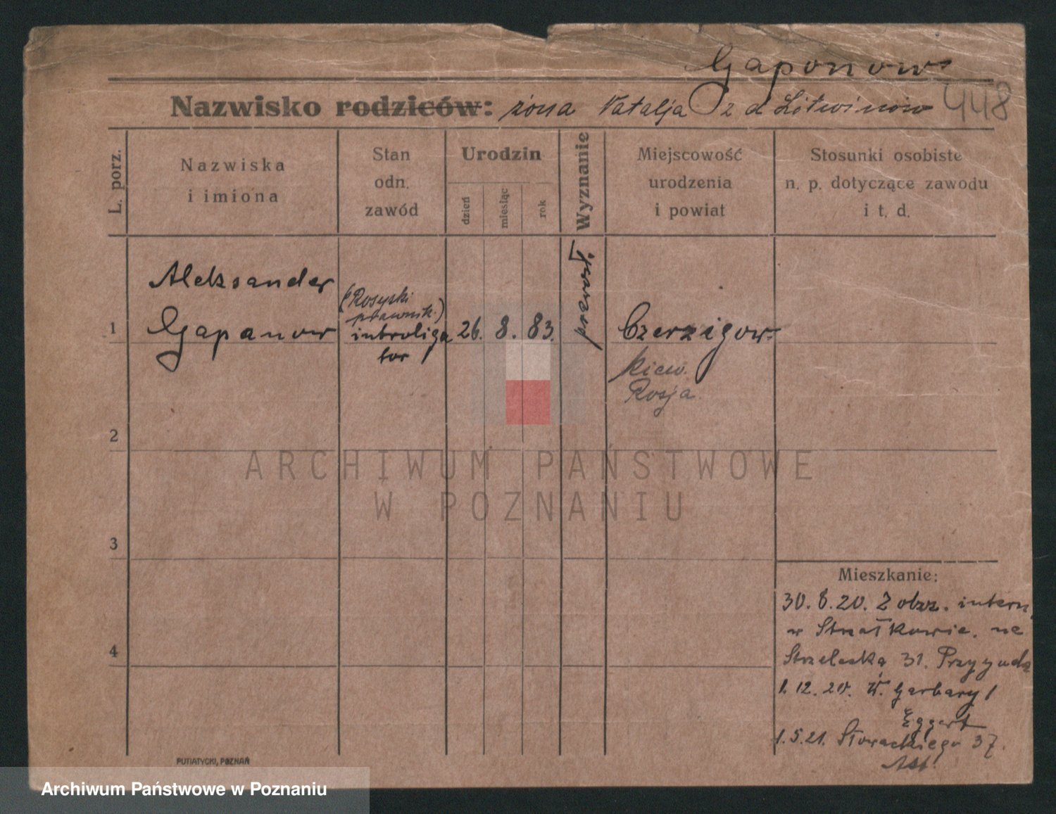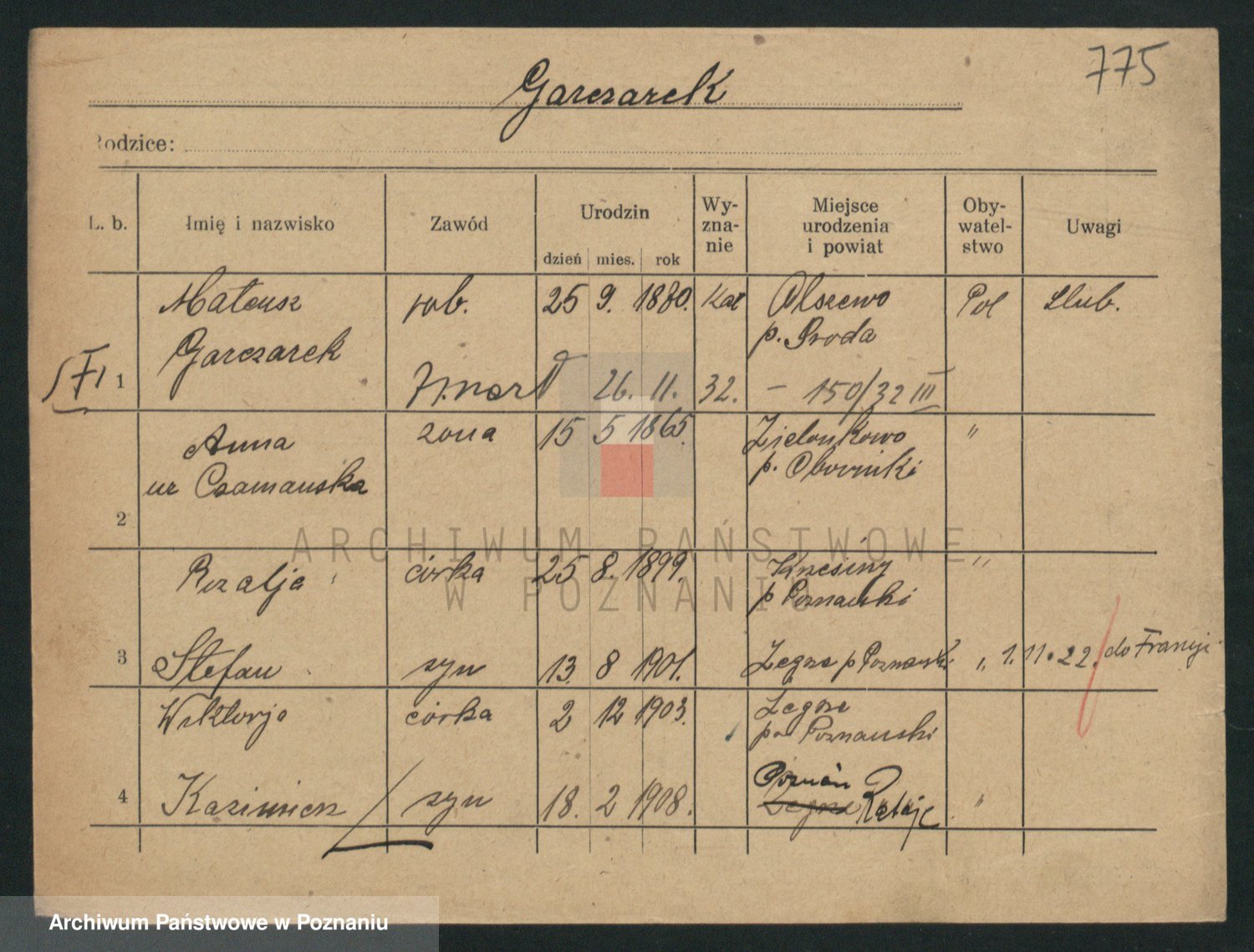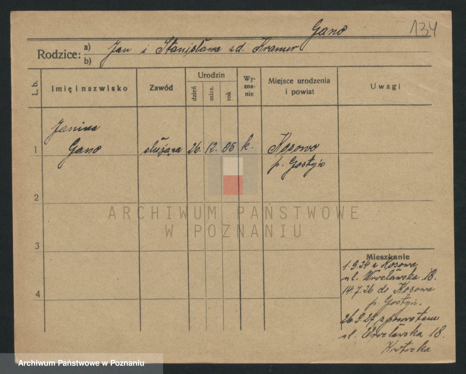 Podgląd karty osobowej dostępny jest po kliknięciu na nazwisko lub ikonkę karty. Można dokonywać powiększenia (ikony na górze) lub przechodzić między kolejnymi skanami (strzałki po bokach).