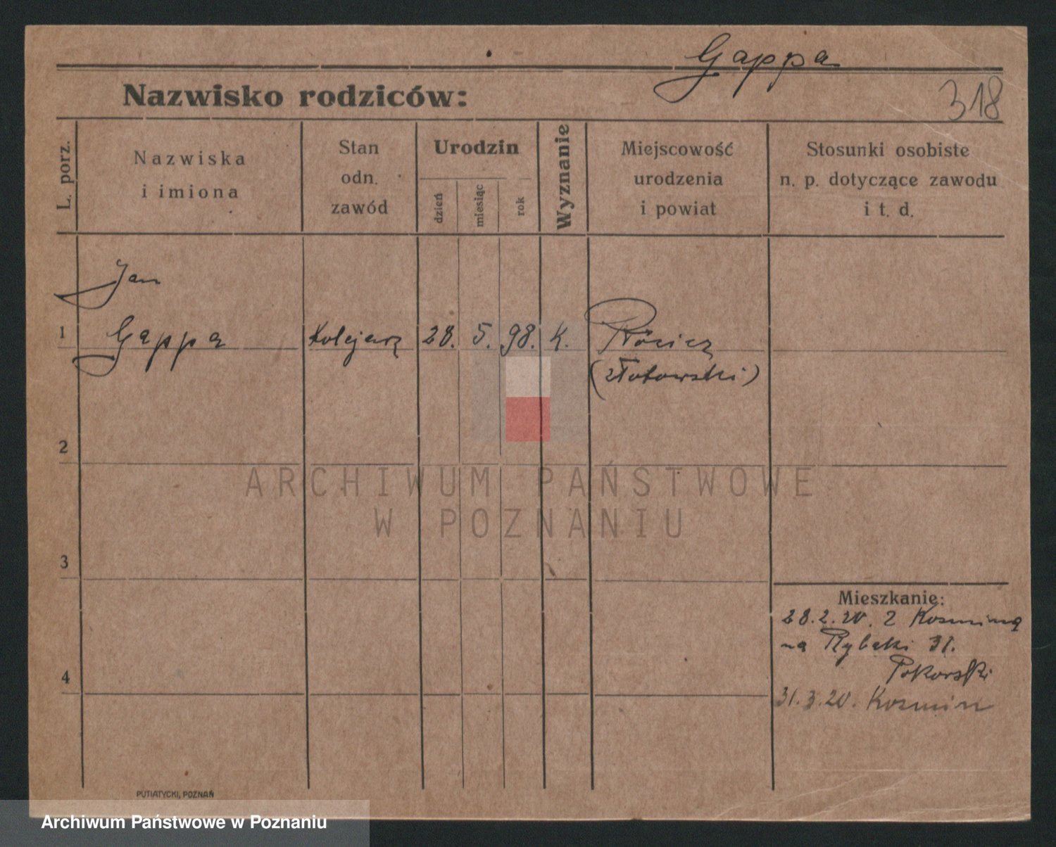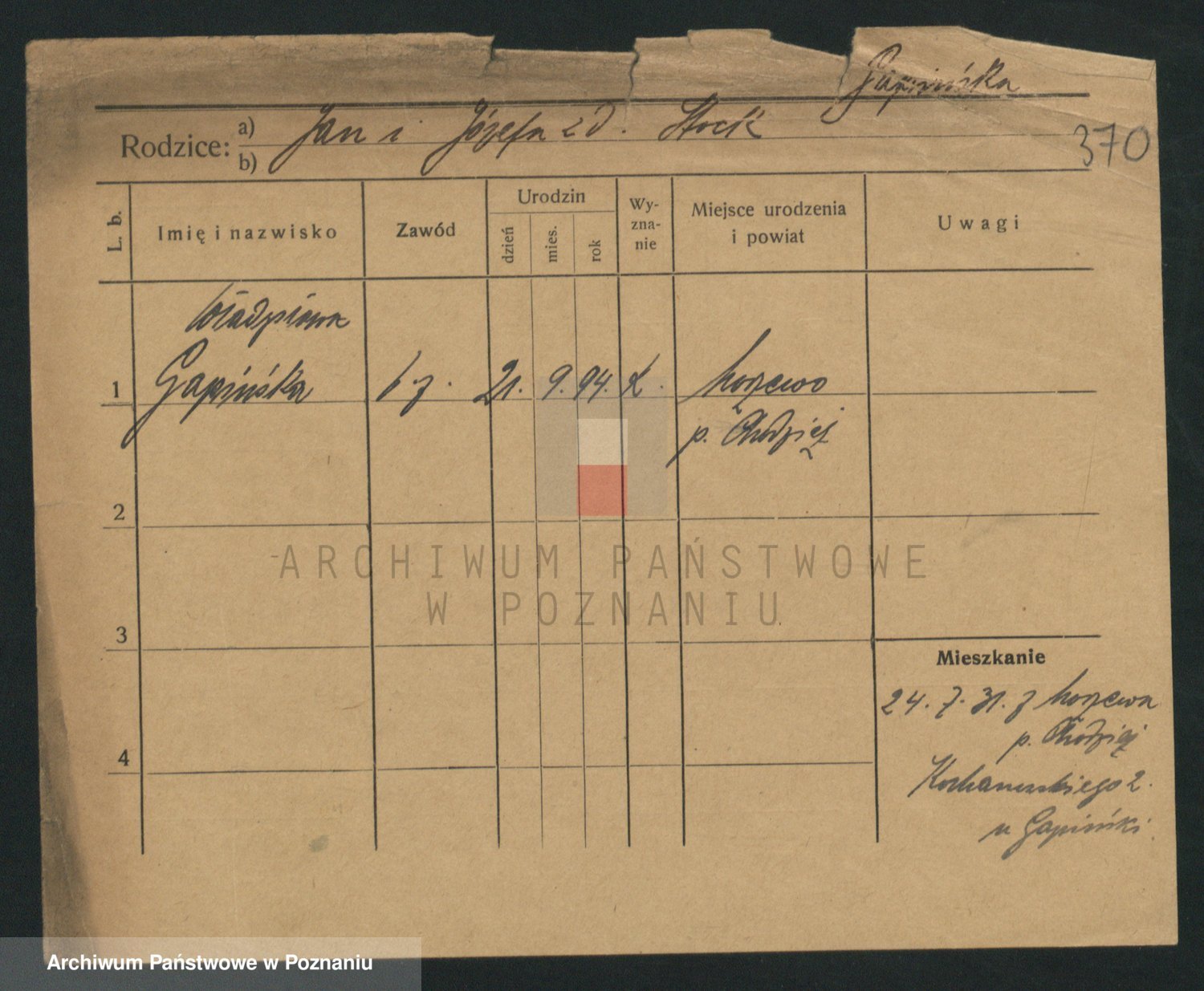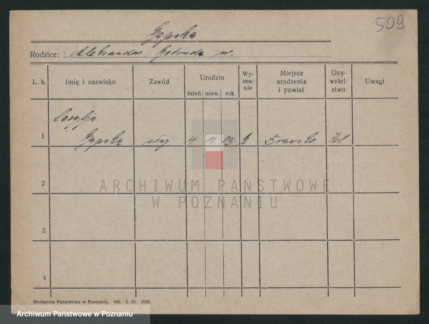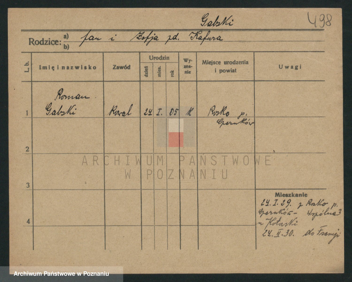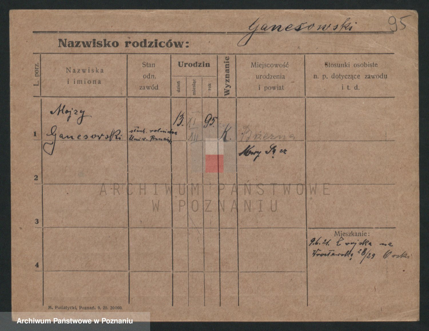 Podgląd karty osobowej dostępny jest po kliknięciu na nazwisko lub ikonkę karty. Można dokonywać powiększenia (ikony na górze) lub przechodzić między kolejnymi skanami (strzałki po bokach).