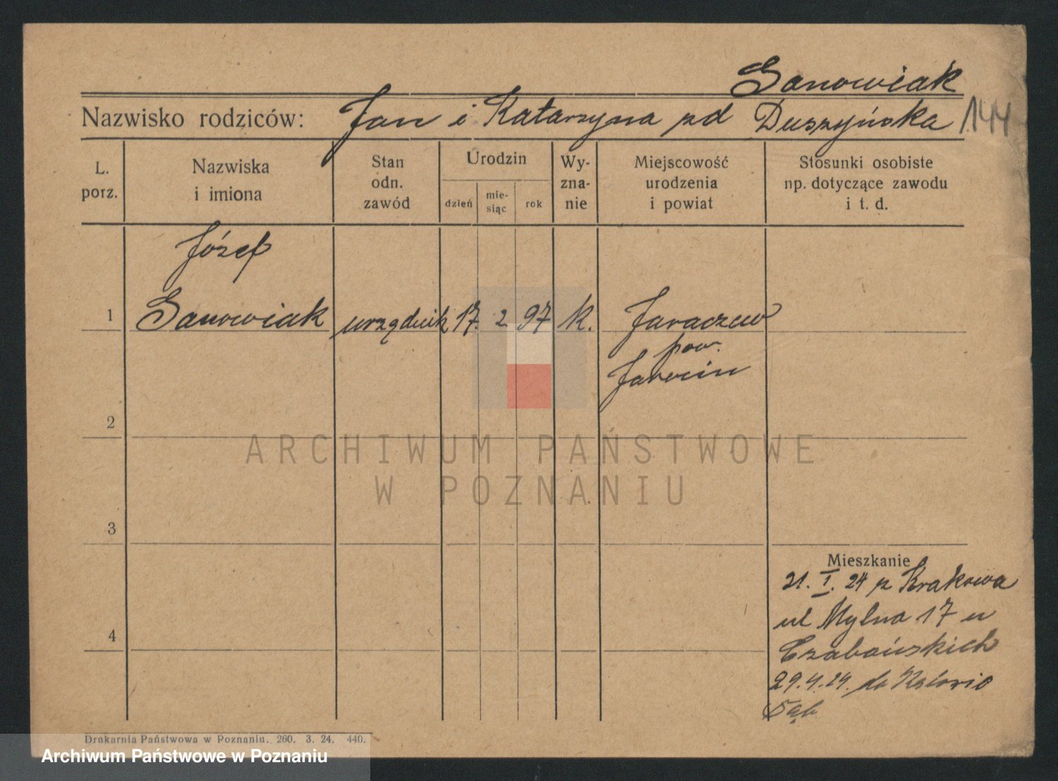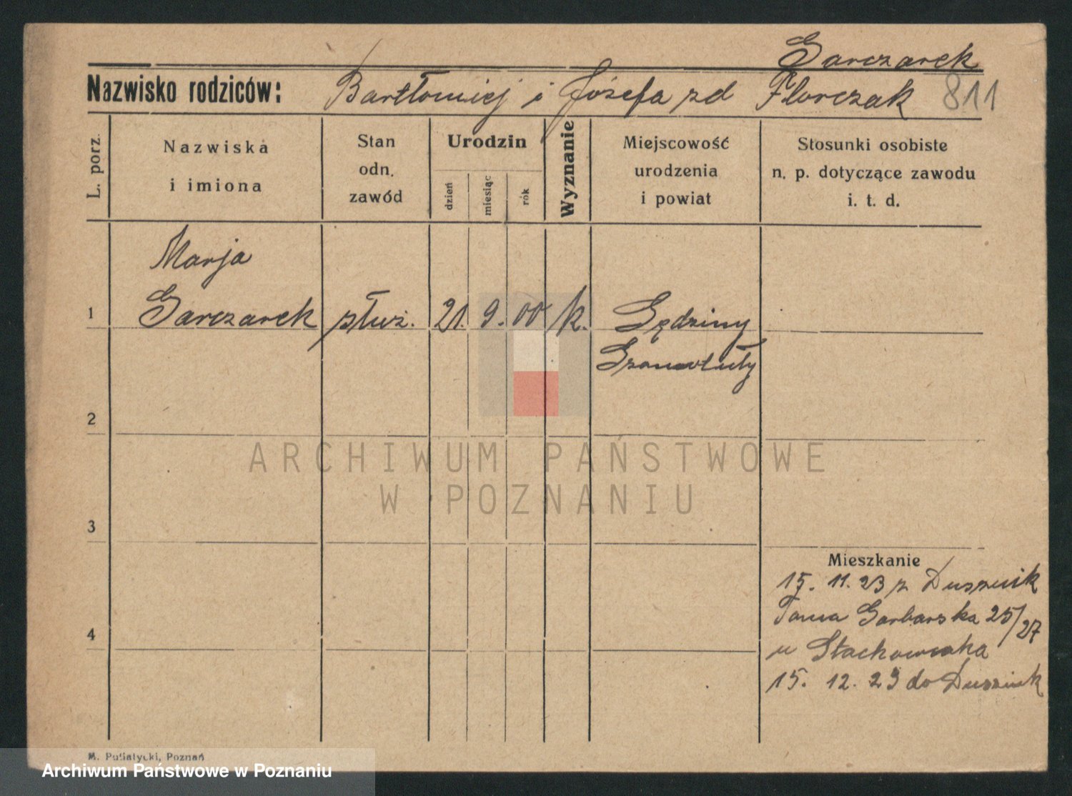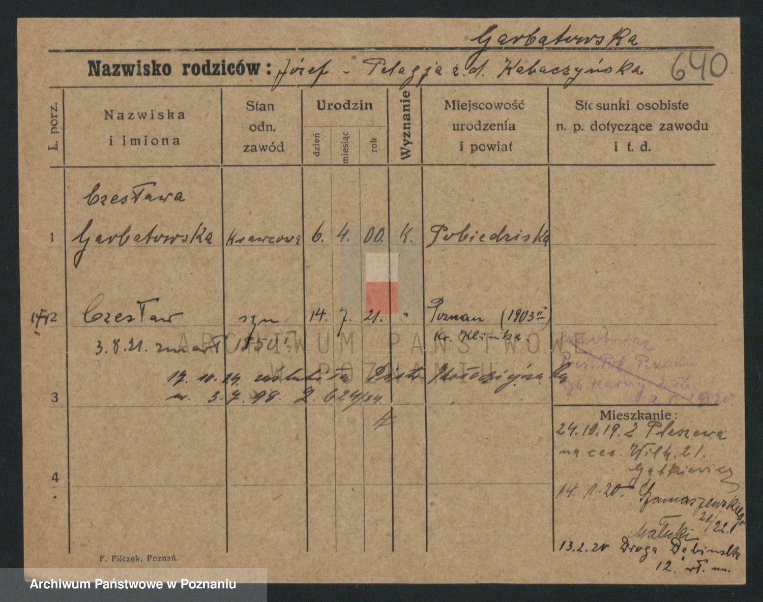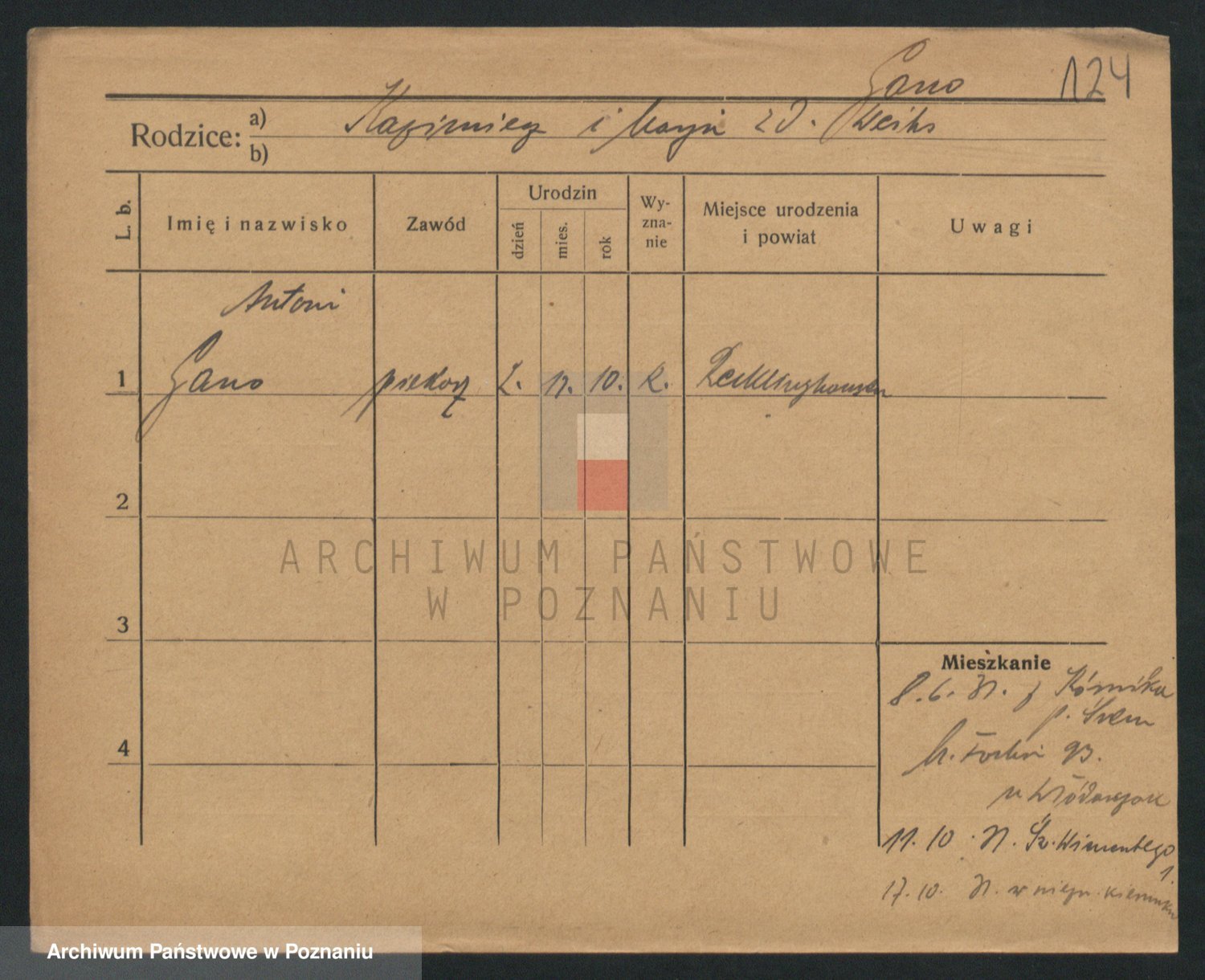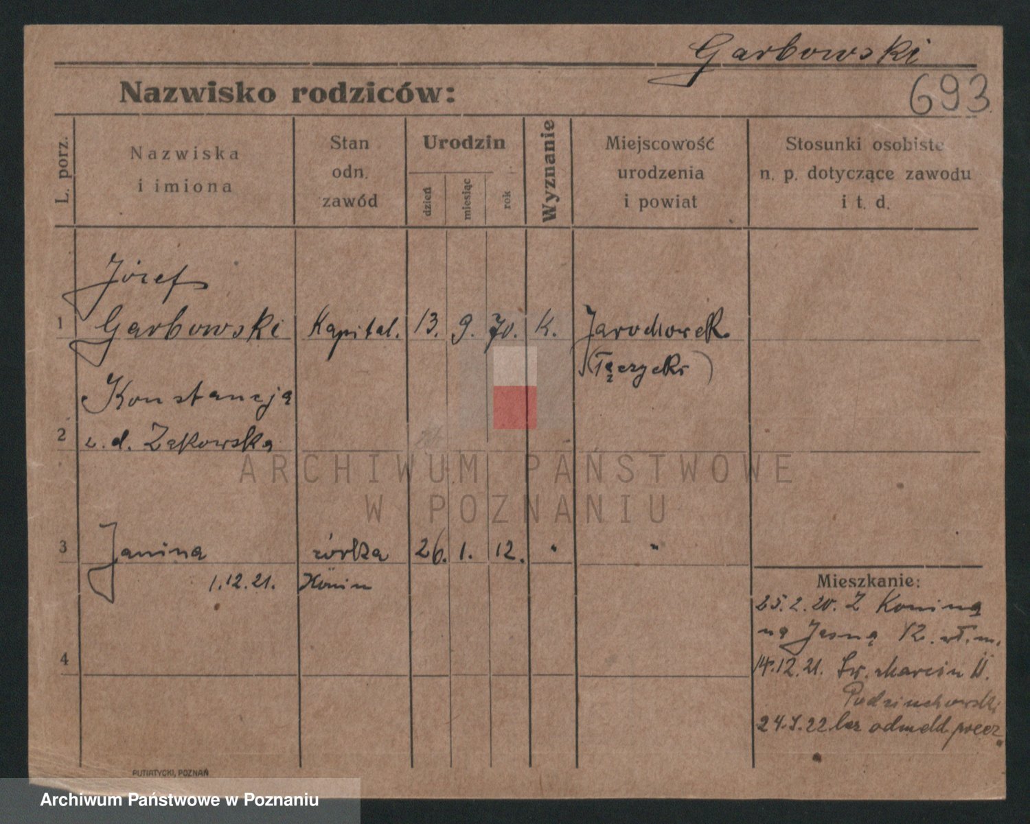Podgląd karty osobowej dostępny jest po kliknięciu na nazwisko lub ikonkę karty. Można dokonywać powiększenia (ikony na górze) lub przechodzić między kolejnymi skanami (strzałki po bokach).