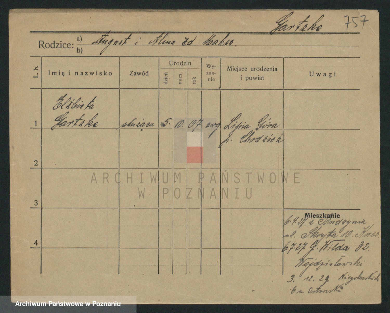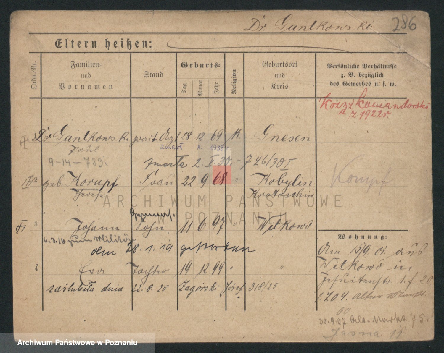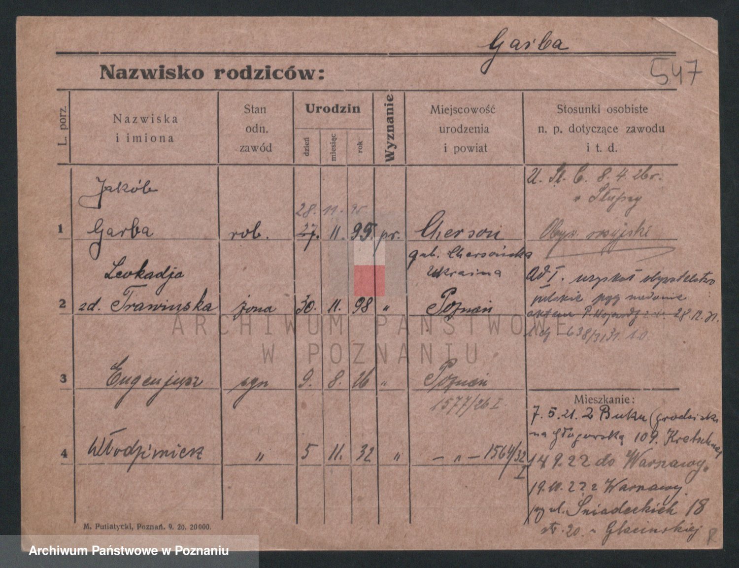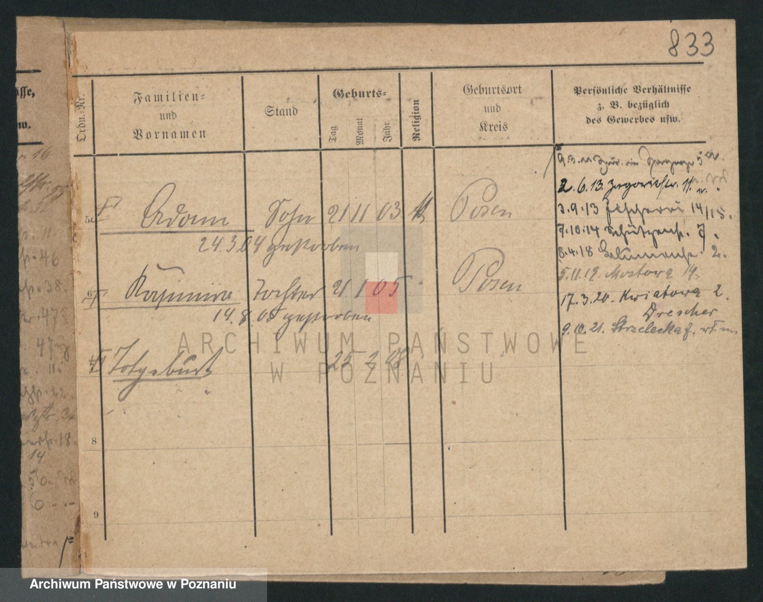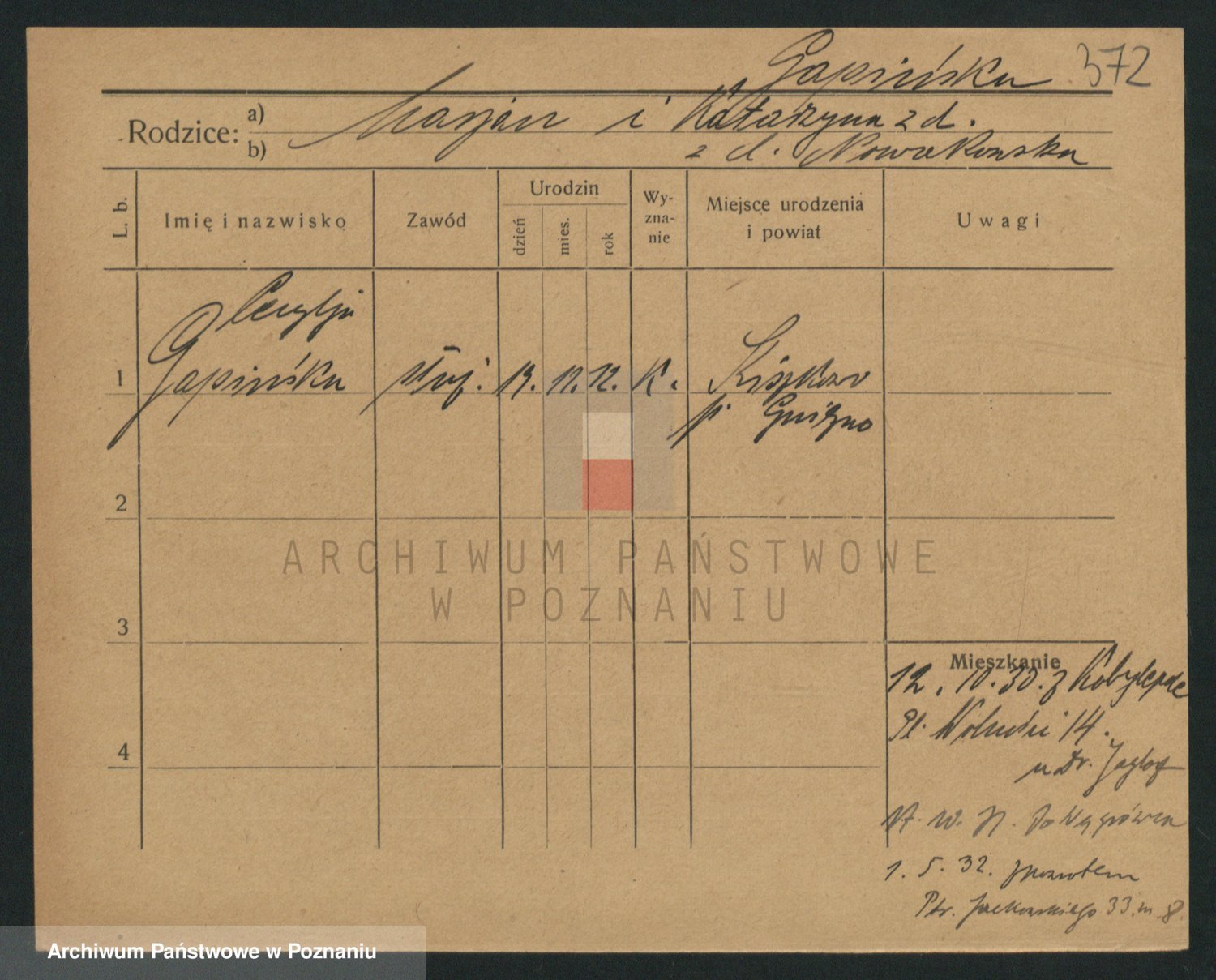 Podgląd karty osobowej dostępny jest po kliknięciu na nazwisko lub ikonkę karty. Można dokonywać powiększenia (ikony na górze) lub przechodzić między kolejnymi skanami (strzałki po bokach).