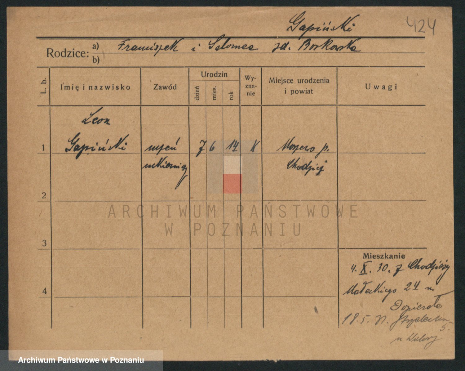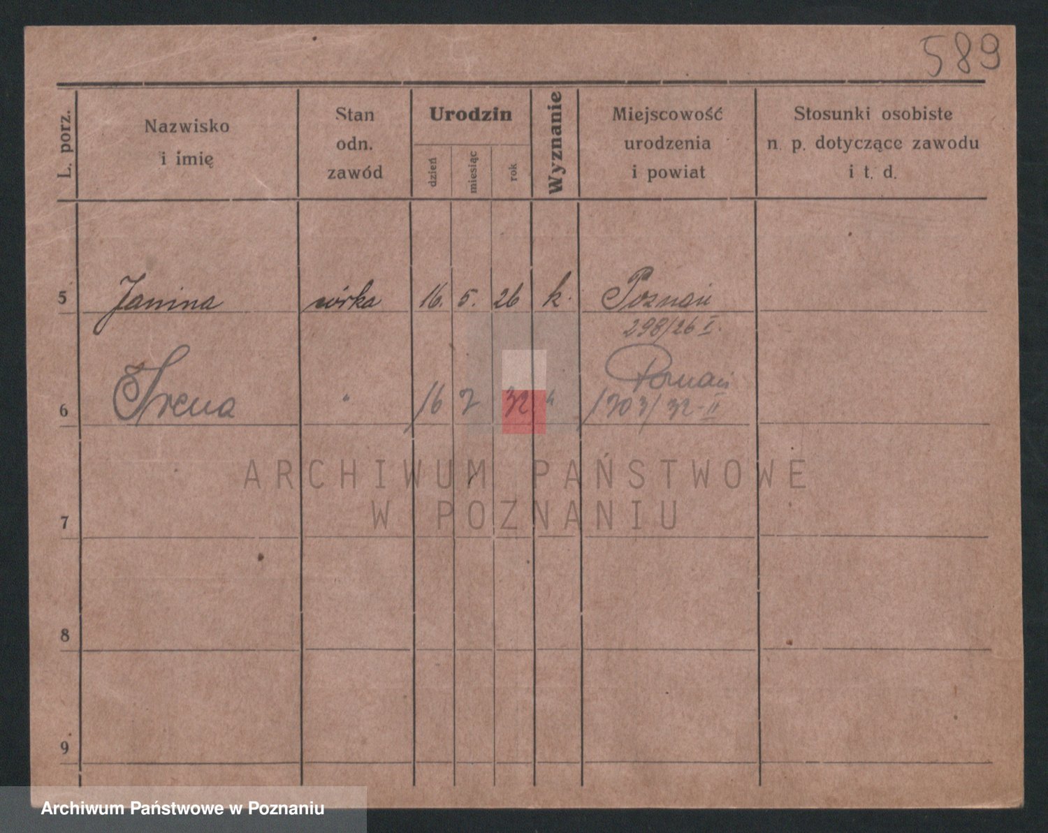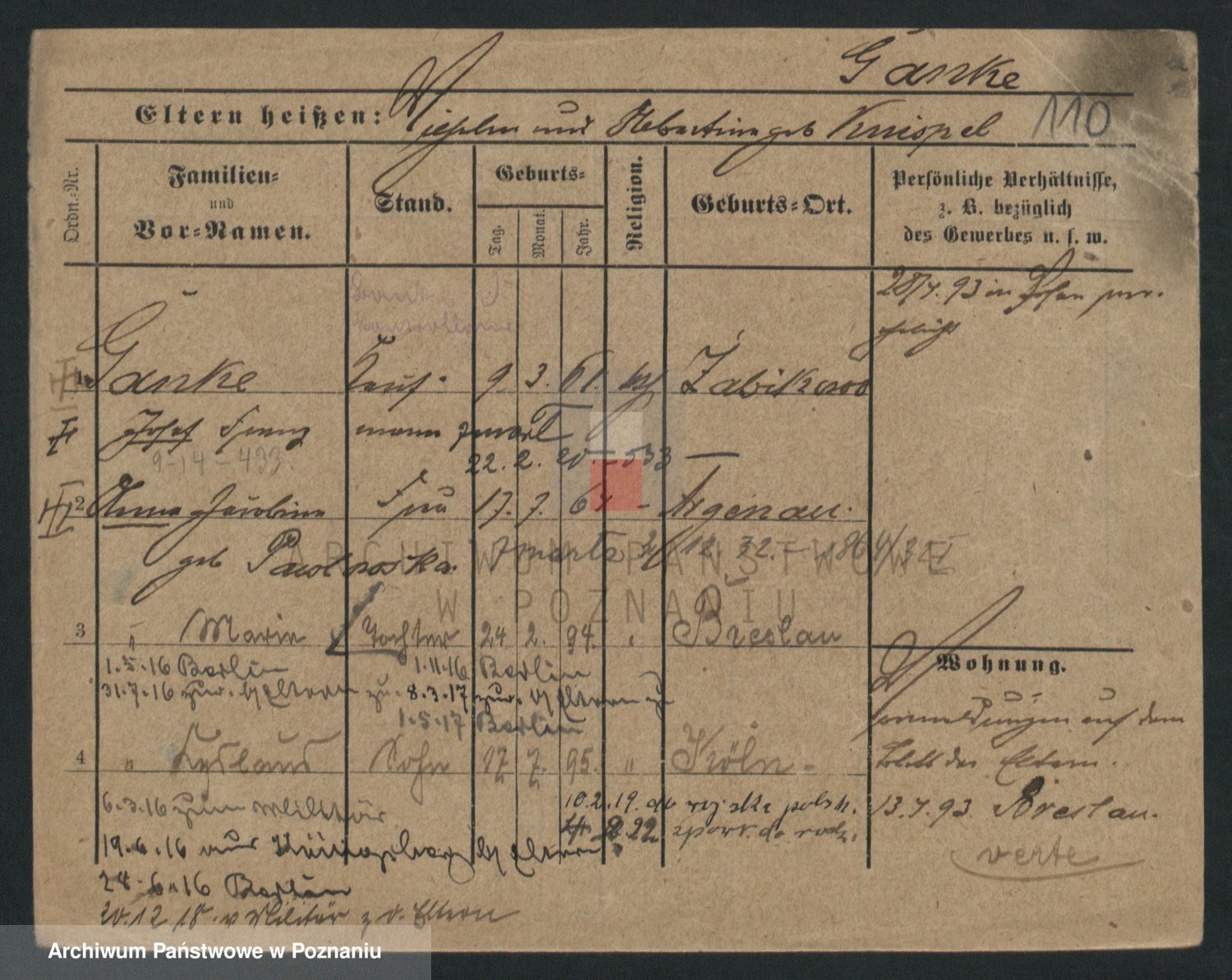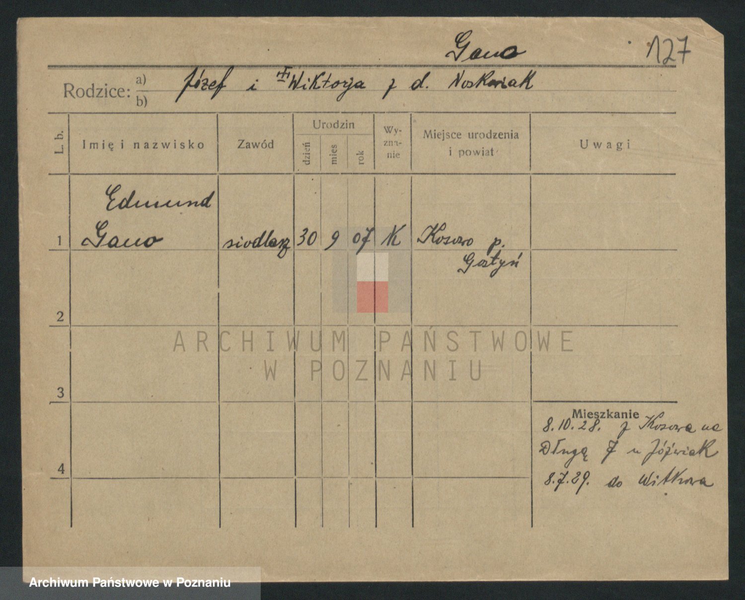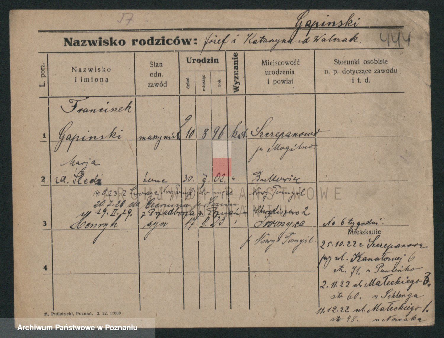 Podgląd karty osobowej dostępny jest po kliknięciu na nazwisko lub ikonkę karty. Można dokonywać powiększenia (ikony na górze) lub przechodzić między kolejnymi skanami (strzałki po bokach).