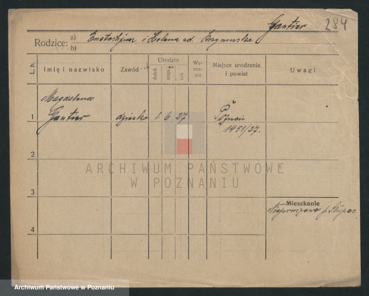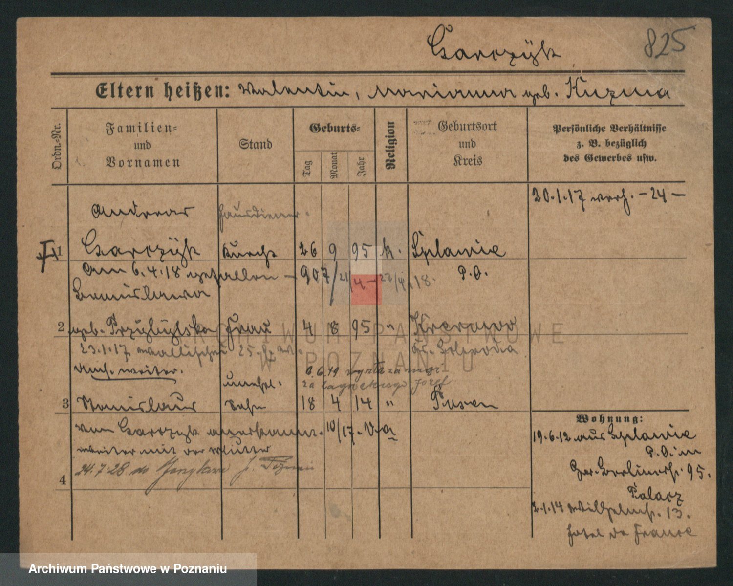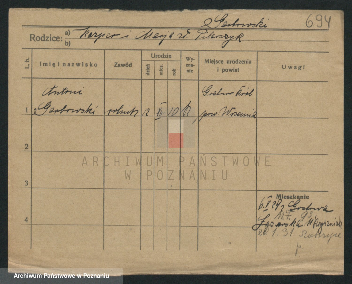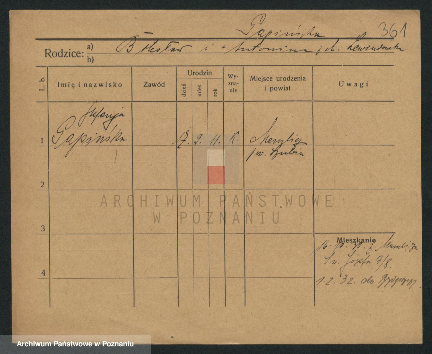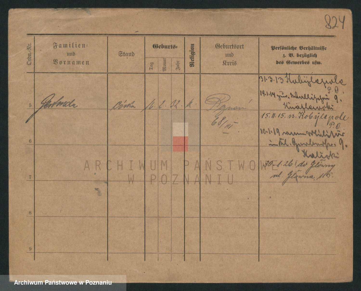 Podgląd karty osobowej dostępny jest po kliknięciu na nazwisko lub ikonkę karty. Można dokonywać powiększenia (ikony na górze) lub przechodzić między kolejnymi skanami (strzałki po bokach).