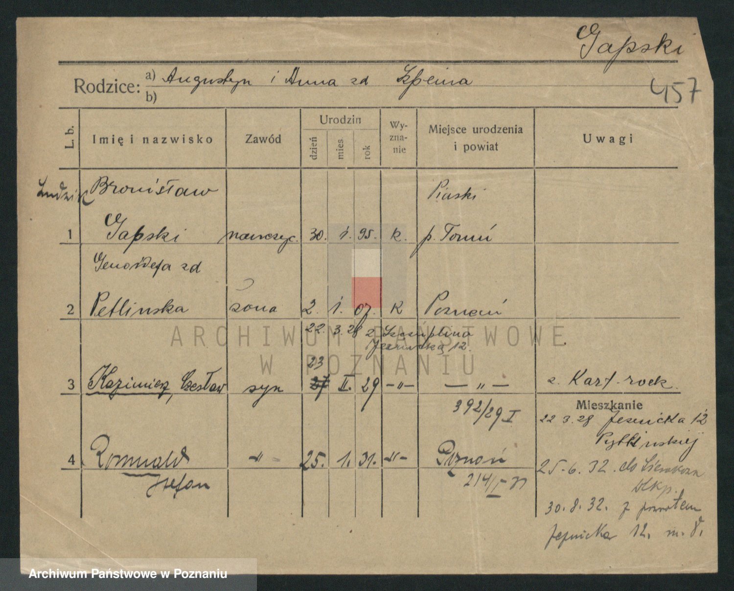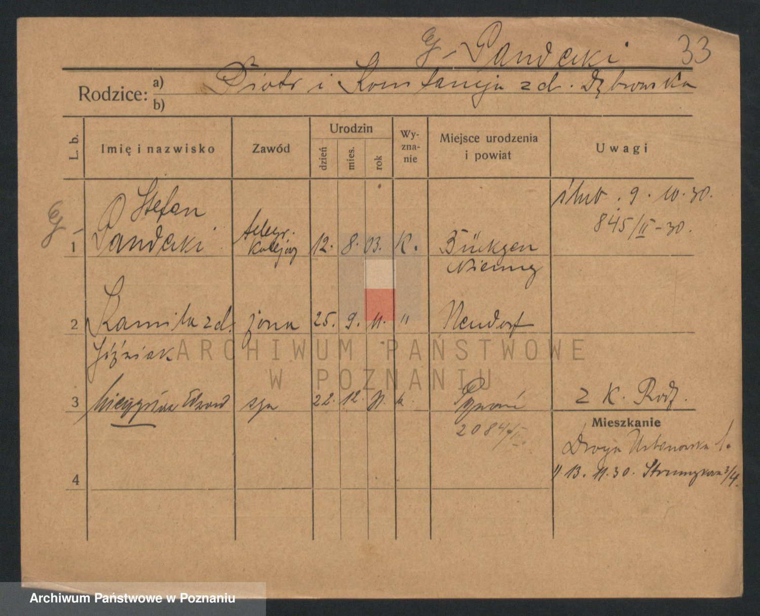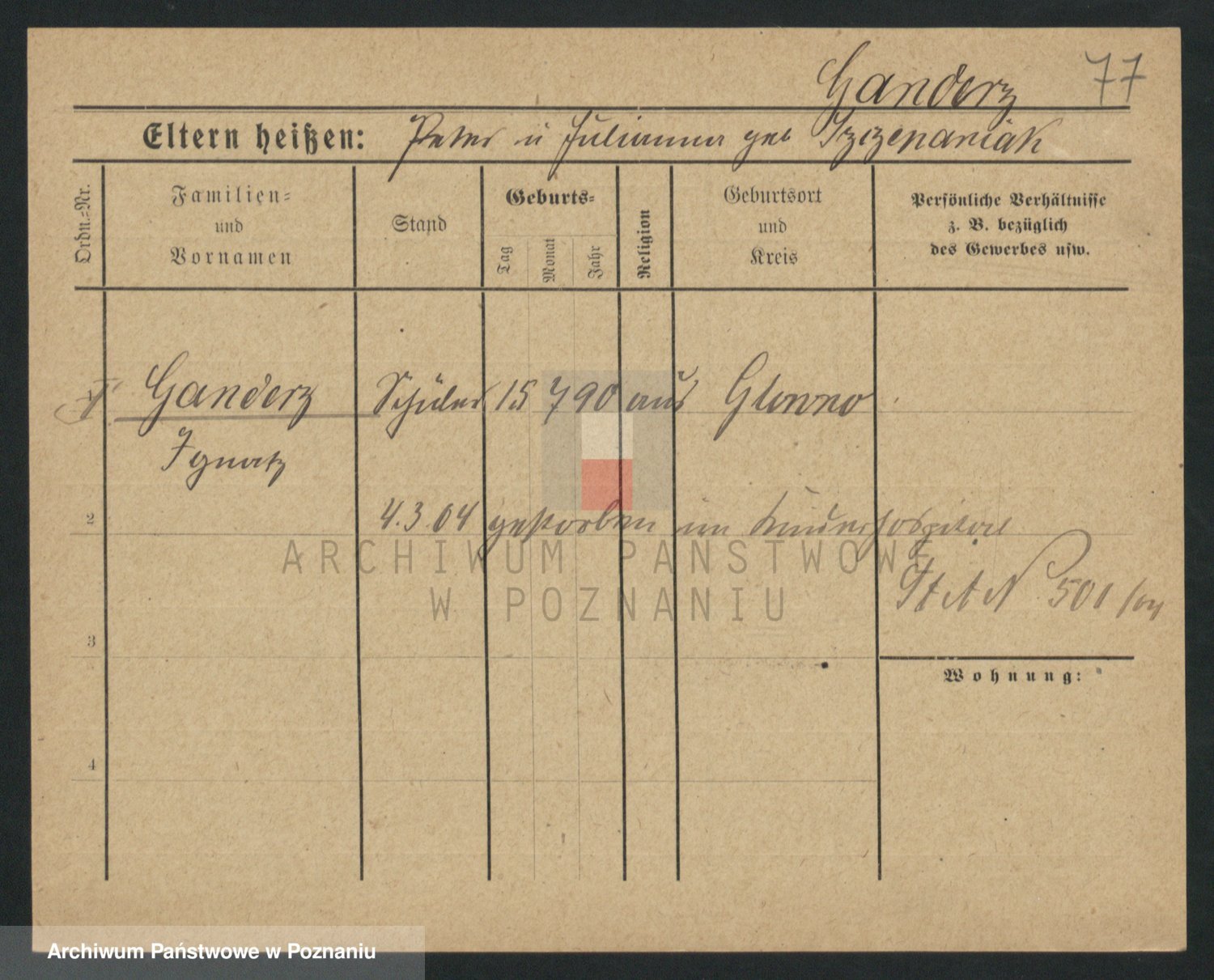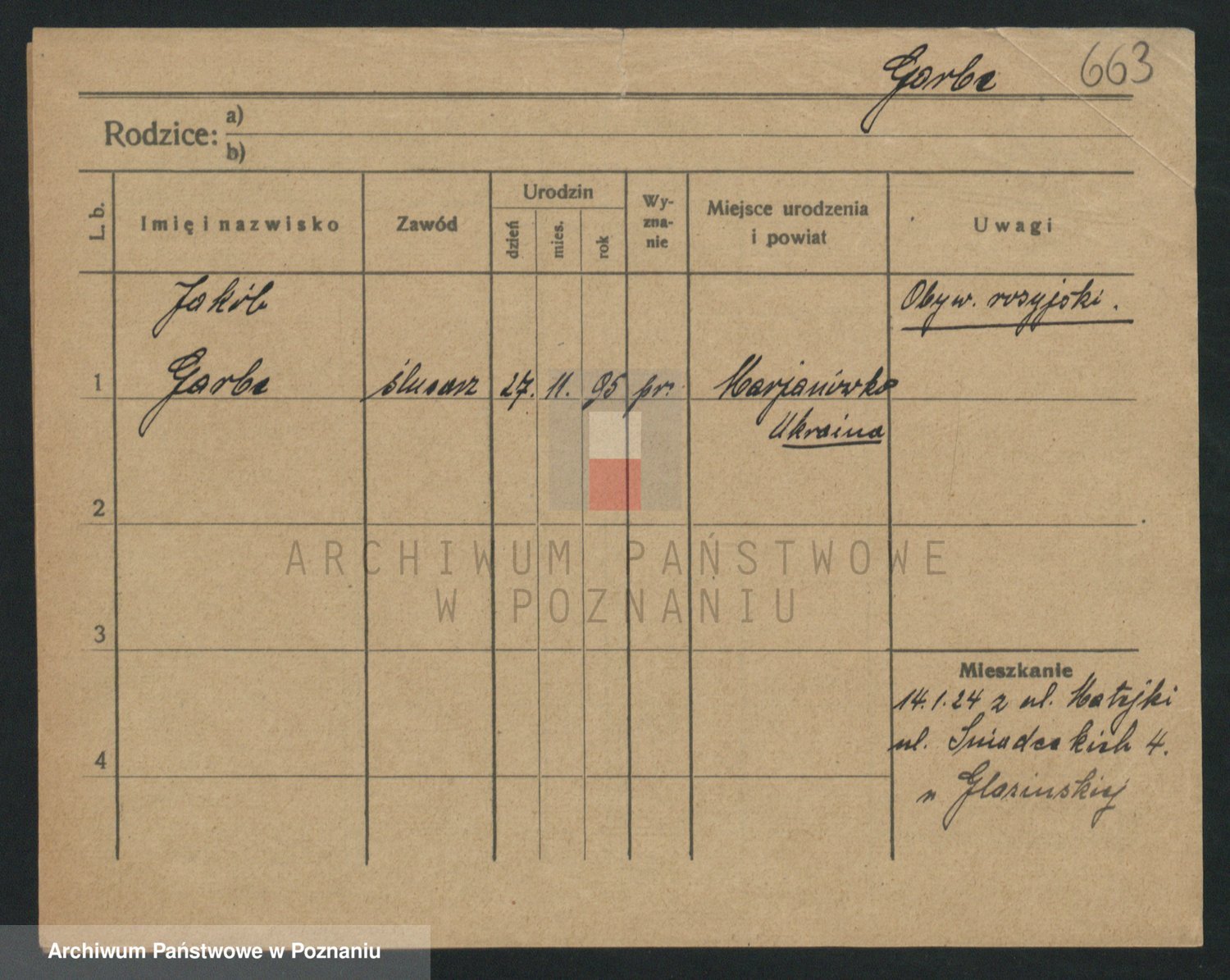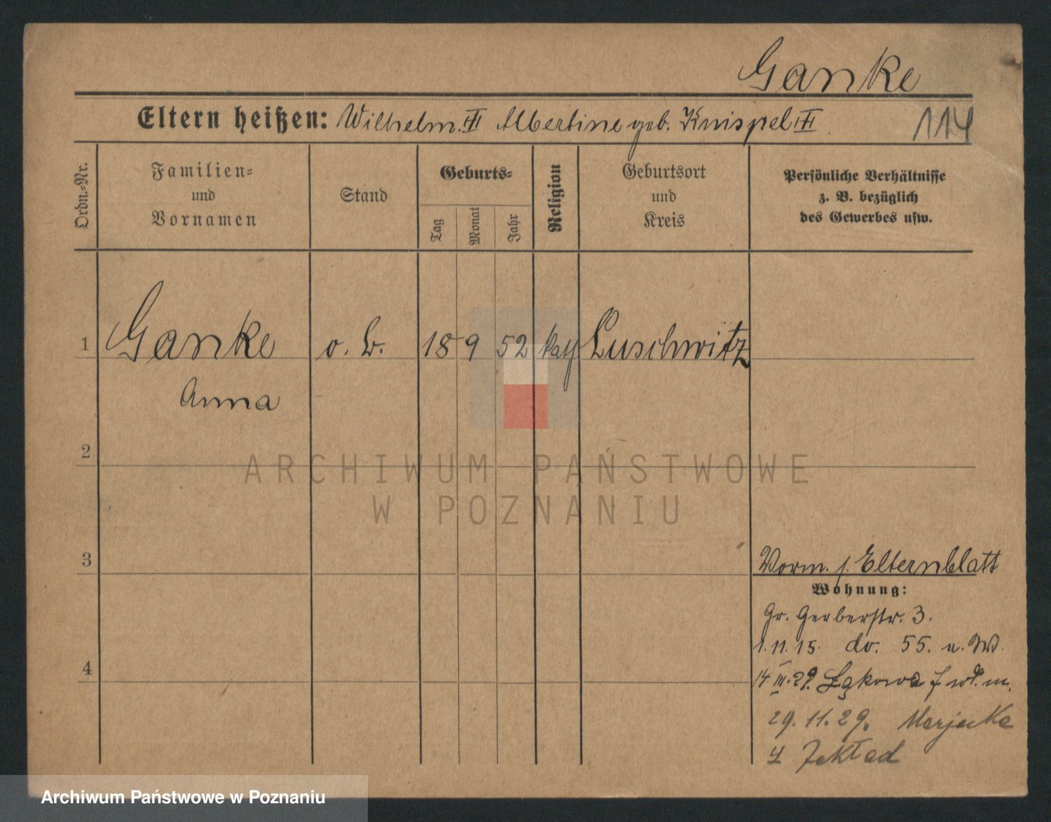 Podgląd karty osobowej dostępny jest po kliknięciu na nazwisko lub ikonkę karty. Można dokonywać powiększenia (ikony na górze) lub przechodzić między kolejnymi skanami (strzałki po bokach).