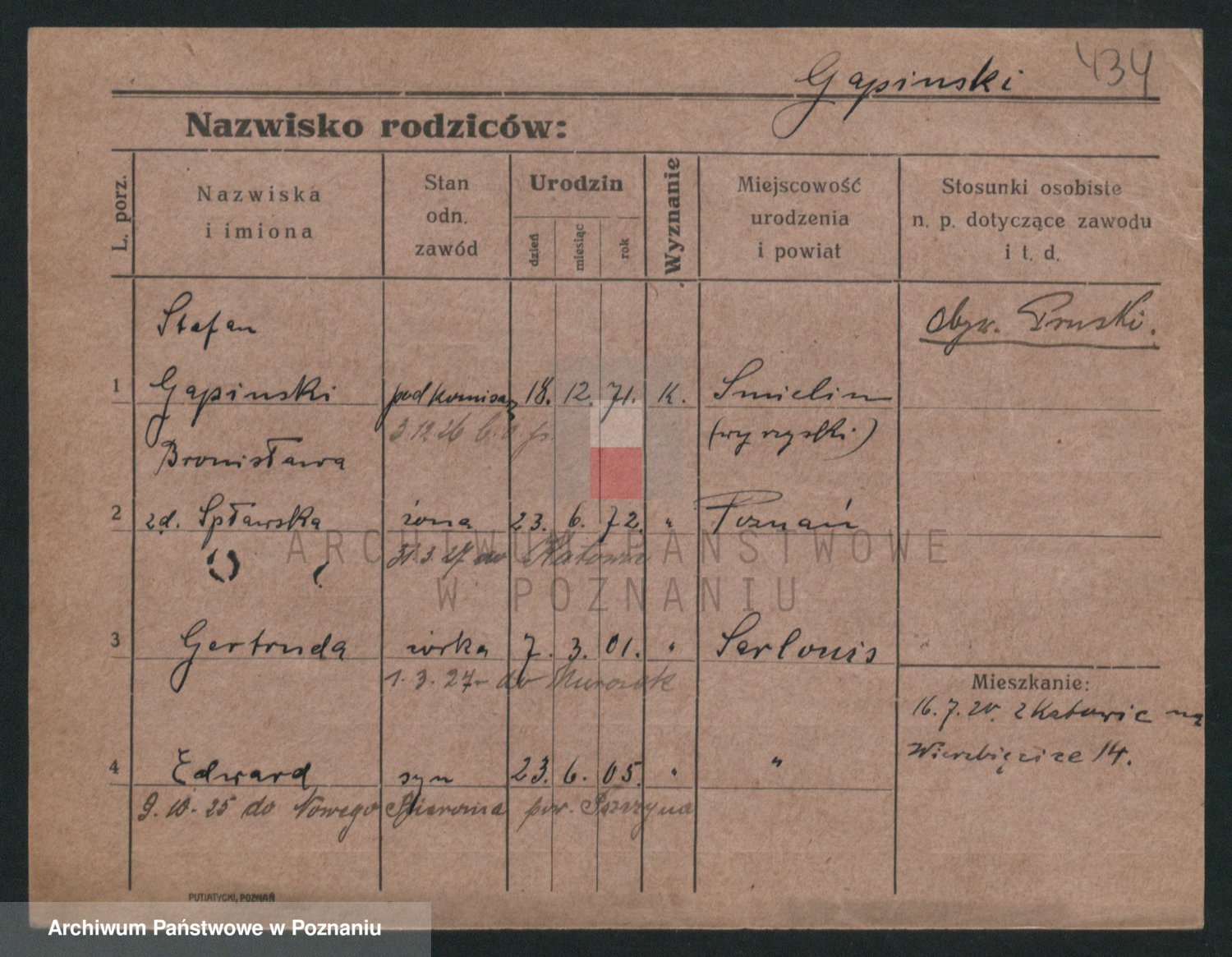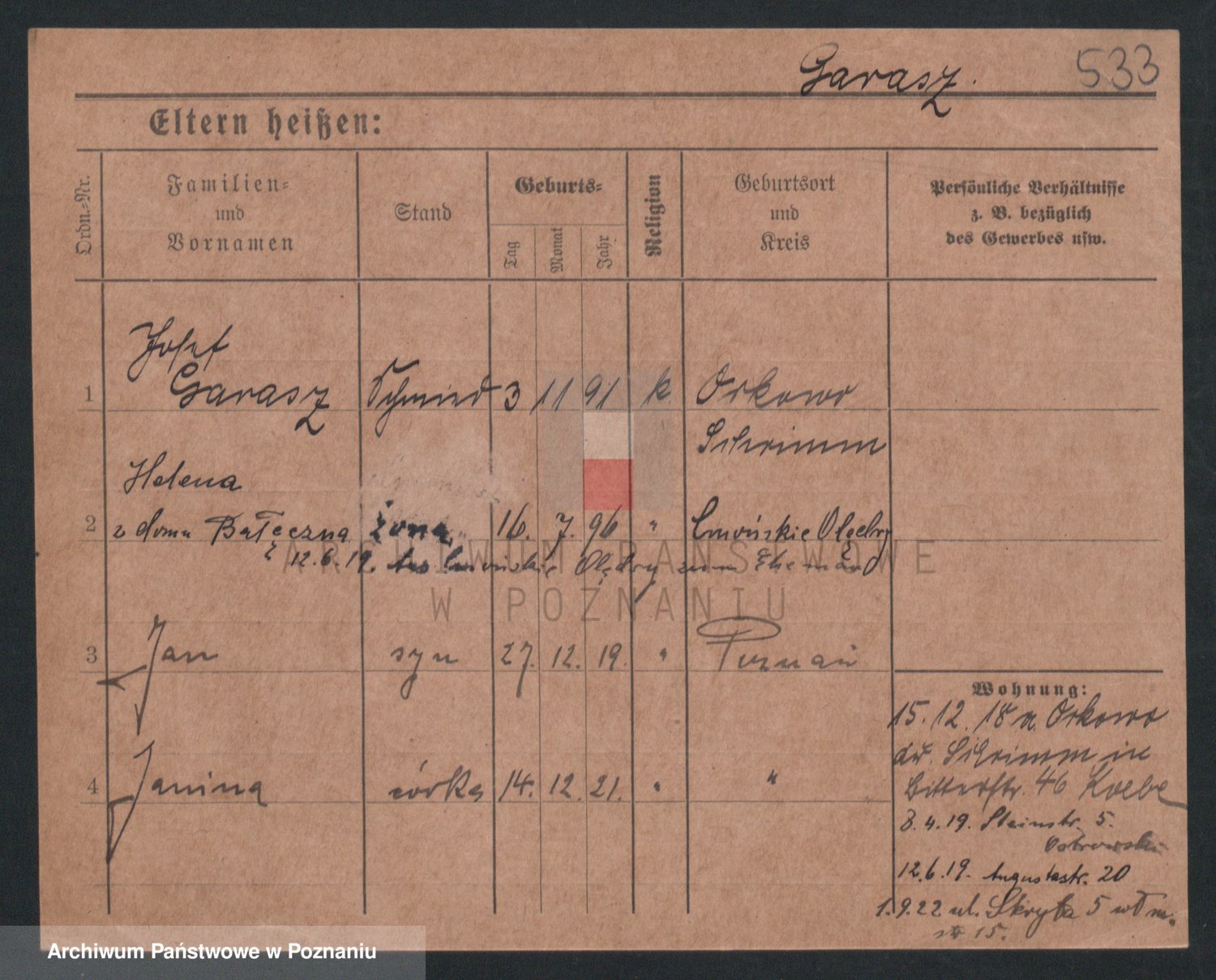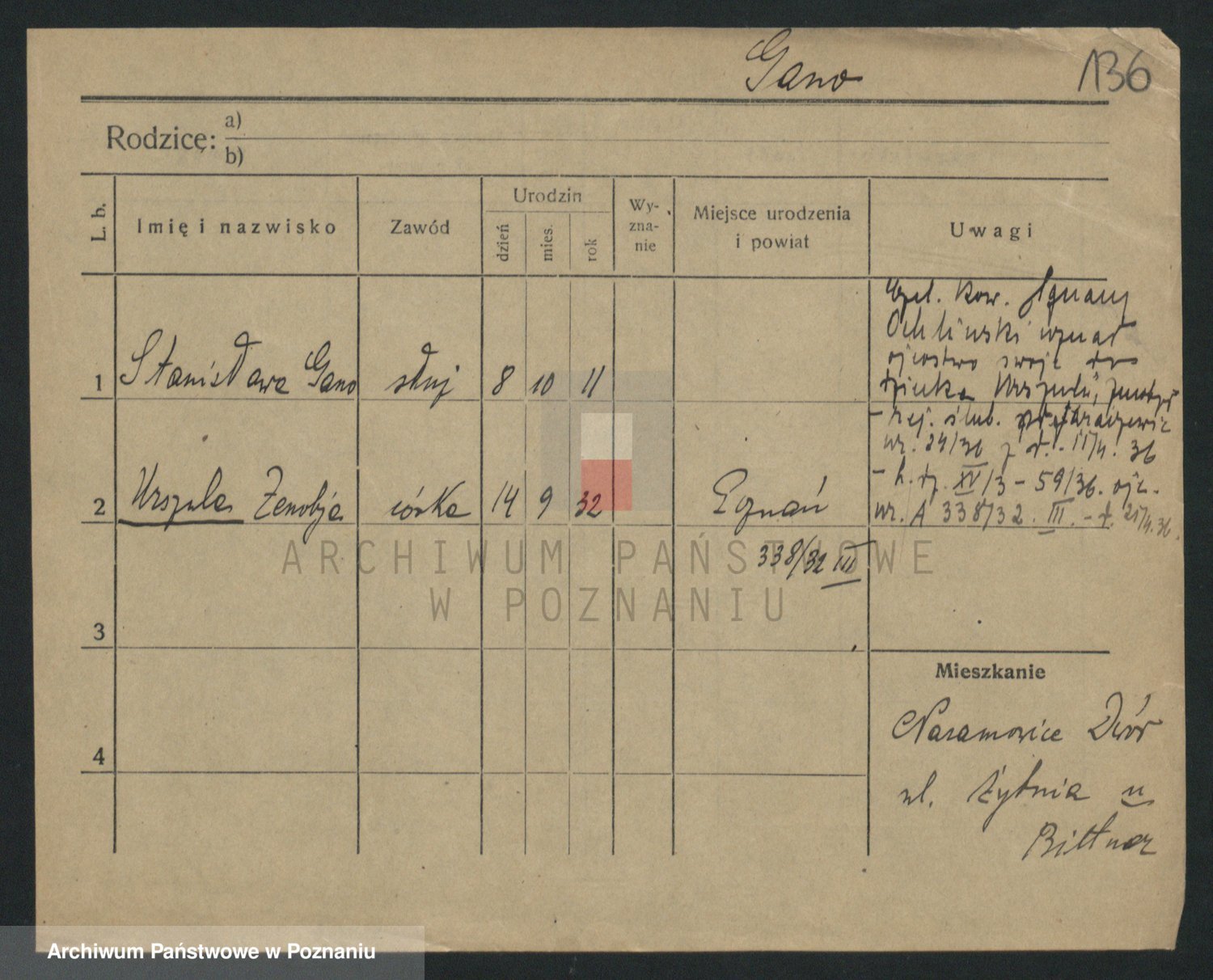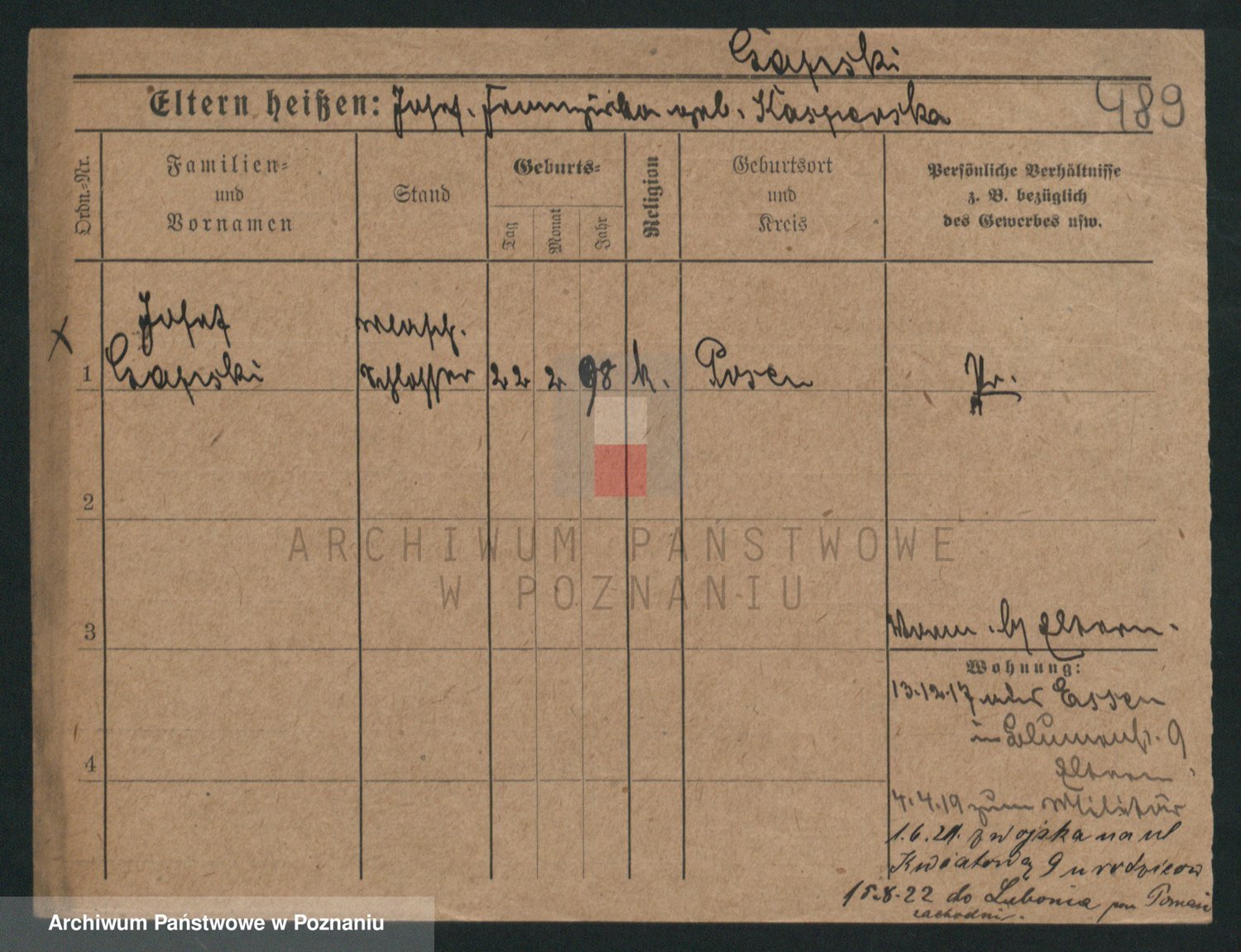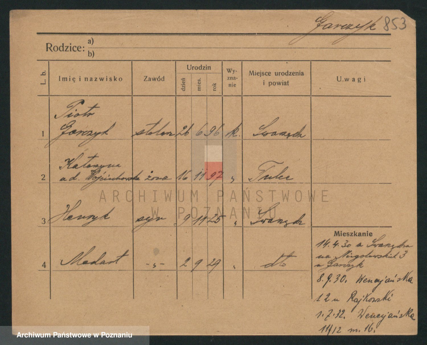 Podgląd karty osobowej dostępny jest po kliknięciu na nazwisko lub ikonkę karty. Można dokonywać powiększenia (ikony na górze) lub przechodzić między kolejnymi skanami (strzałki po bokach).