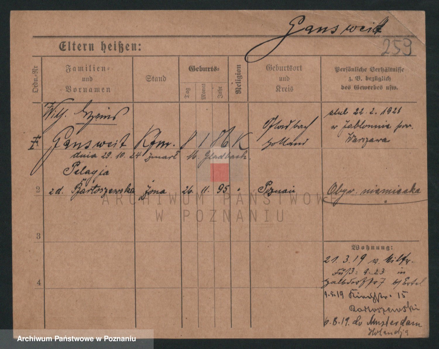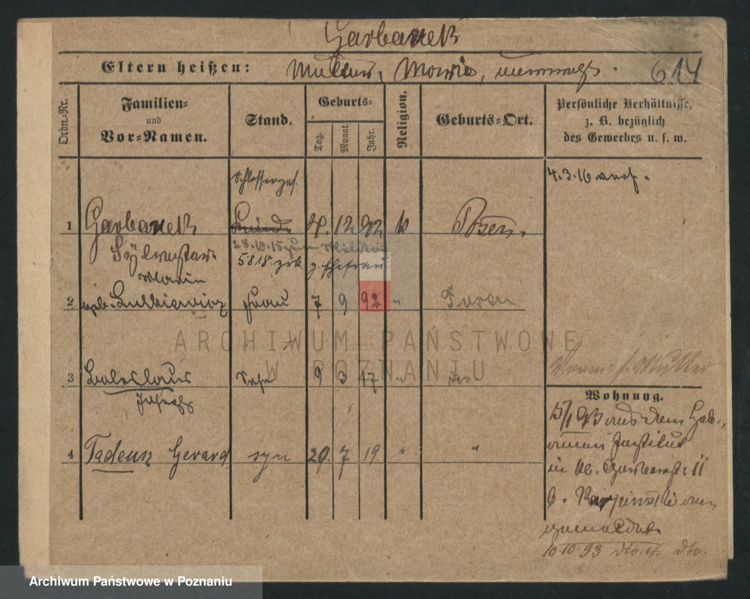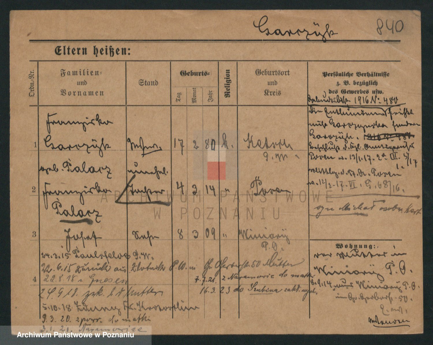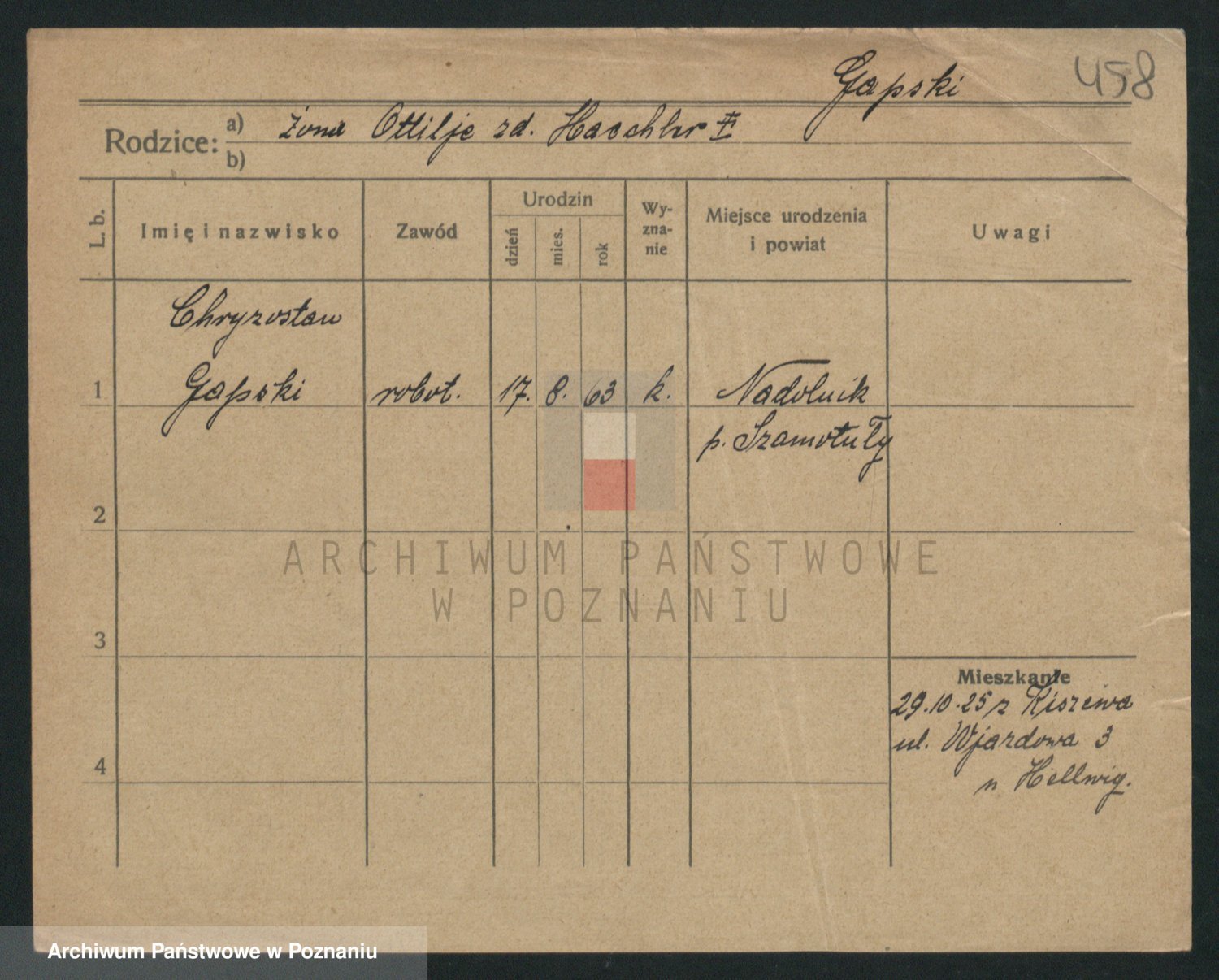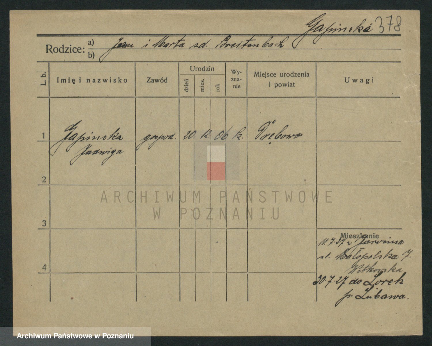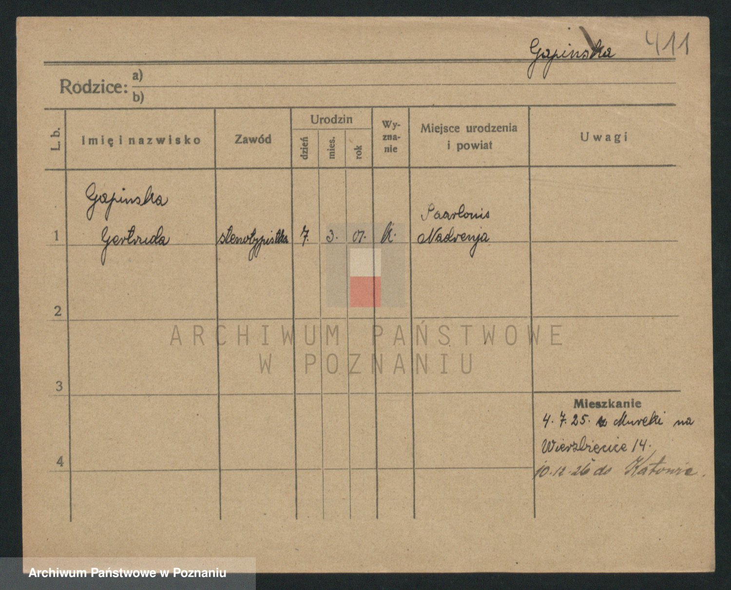 Podgląd karty osobowej dostępny jest po kliknięciu na nazwisko lub ikonkę karty. Można dokonywać powiększenia (ikony na górze) lub przechodzić między kolejnymi skanami (strzałki po bokach).