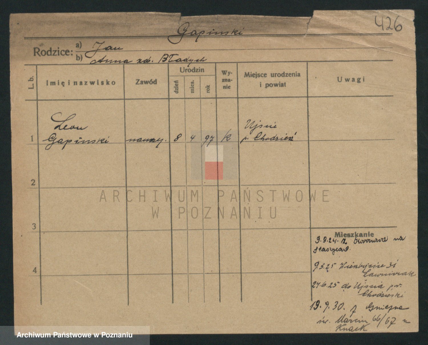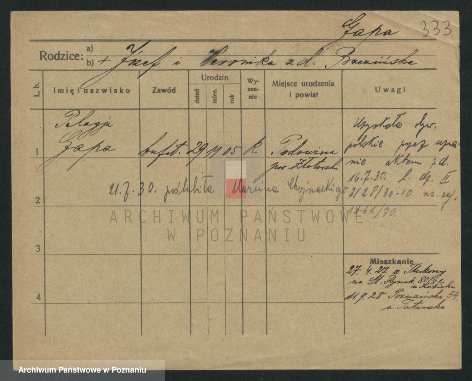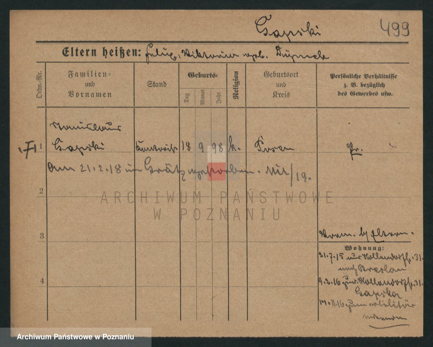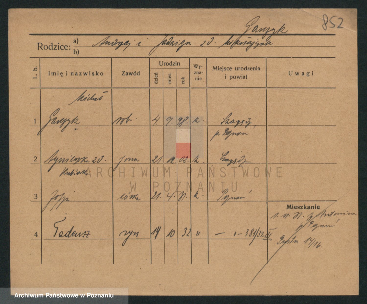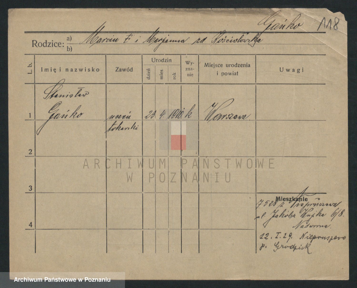 Podgląd karty osobowej dostępny jest po kliknięciu na nazwisko lub ikonkę karty. Można dokonywać powiększenia (ikony na górze) lub przechodzić między kolejnymi skanami (strzałki po bokach).