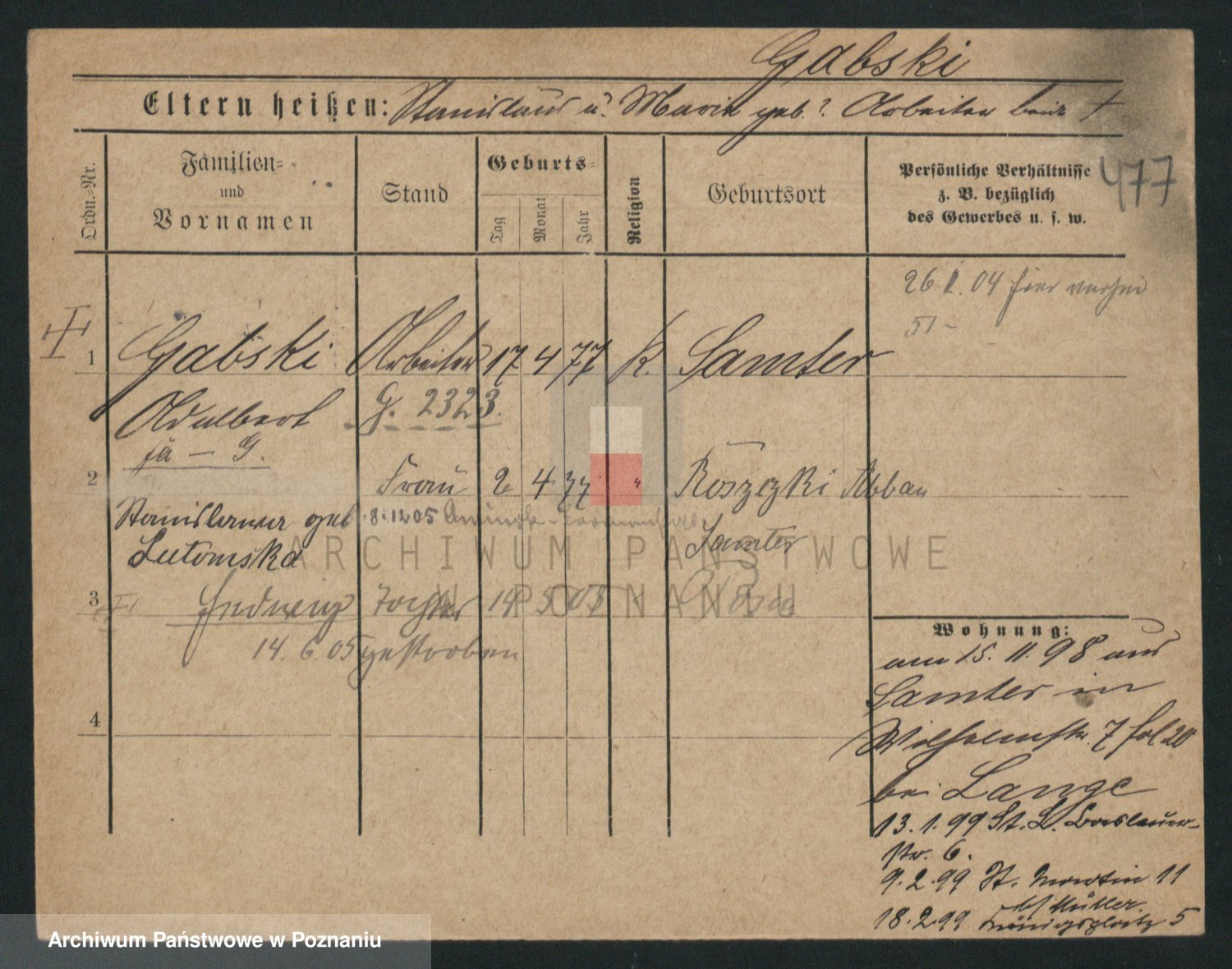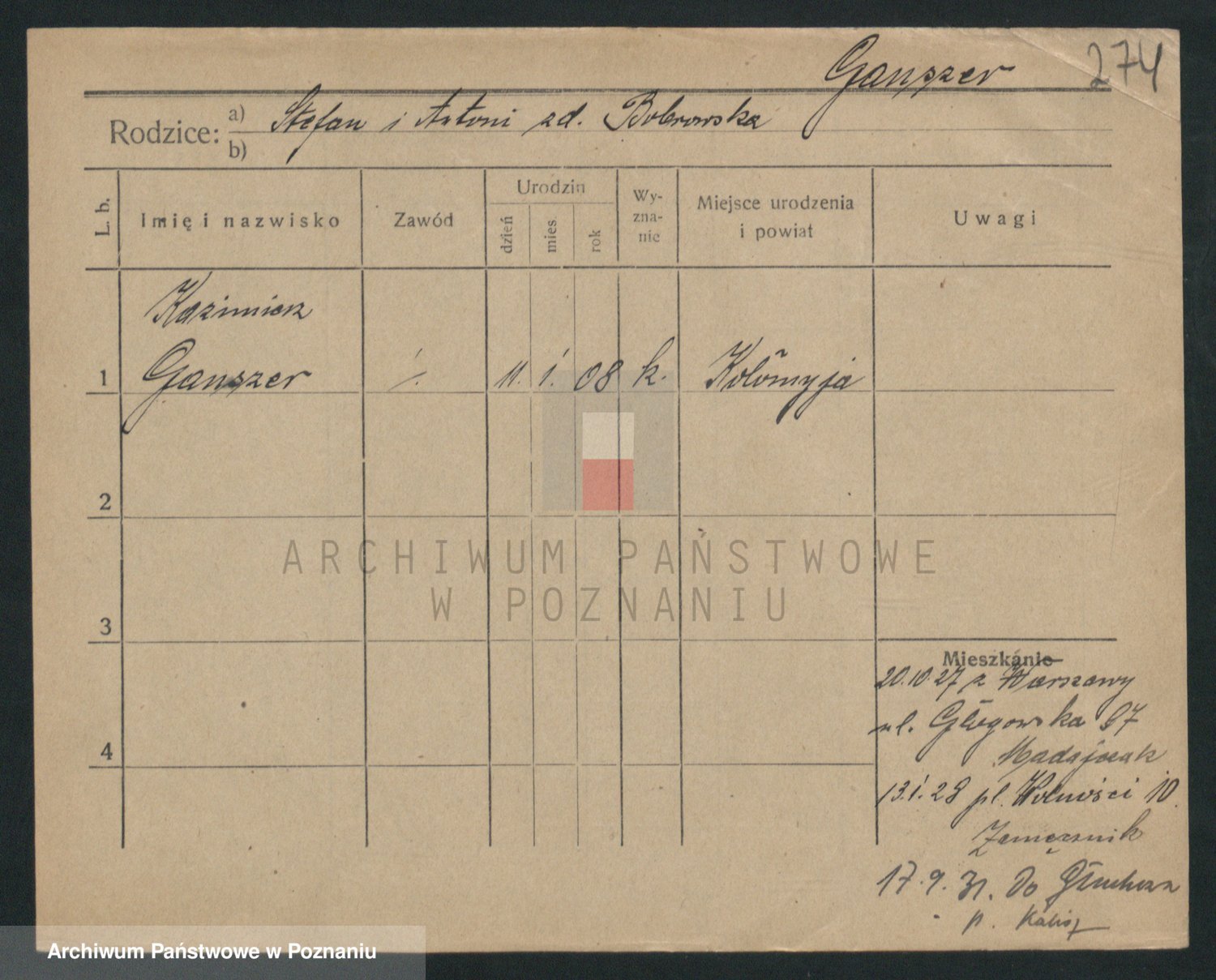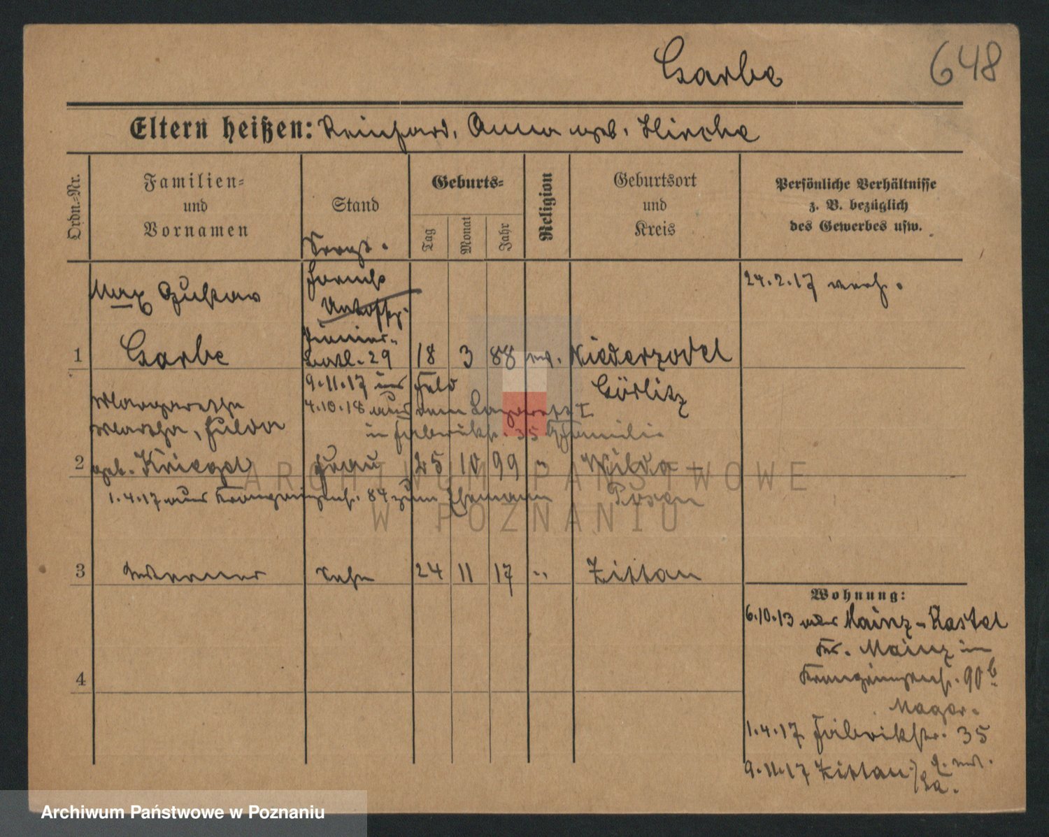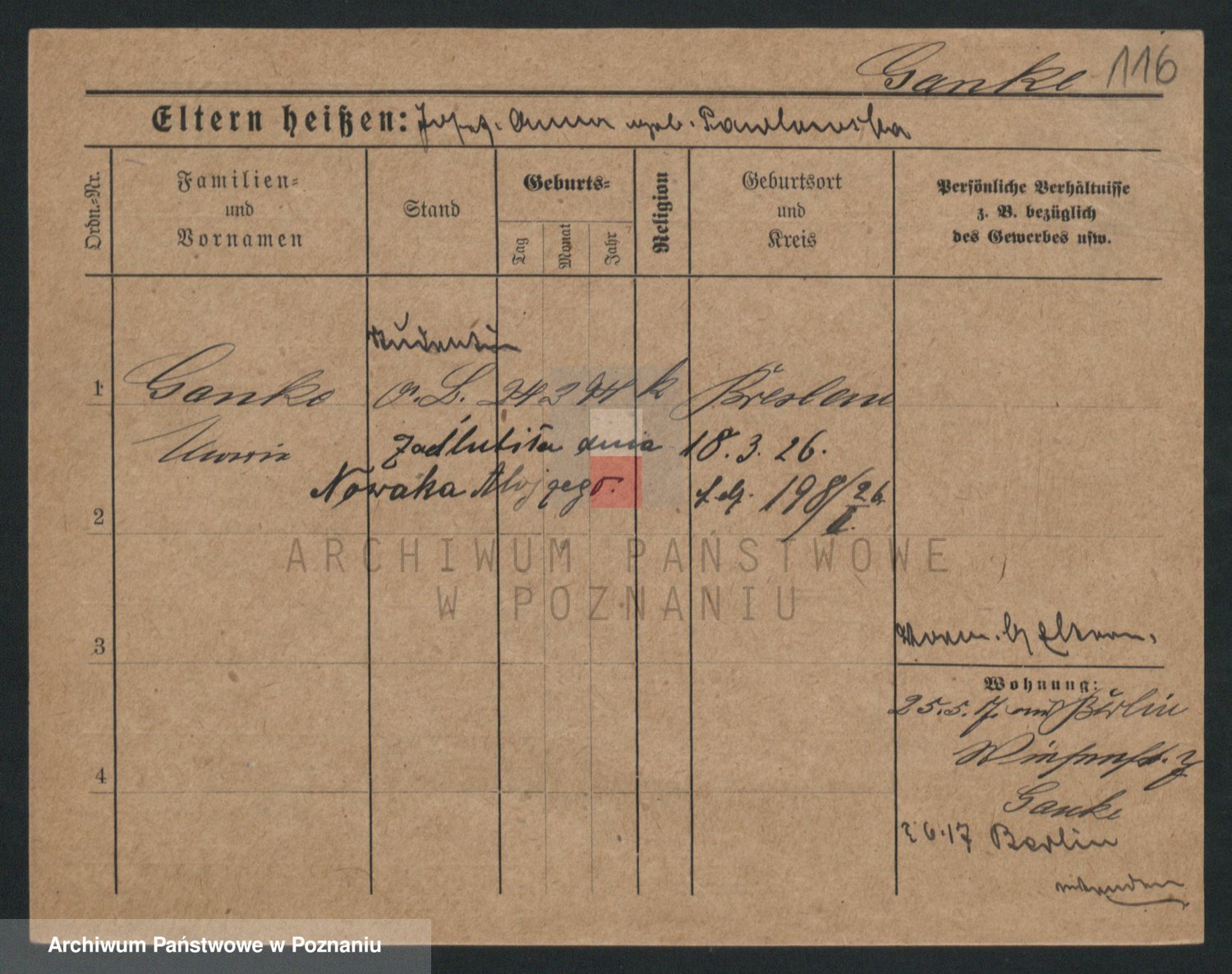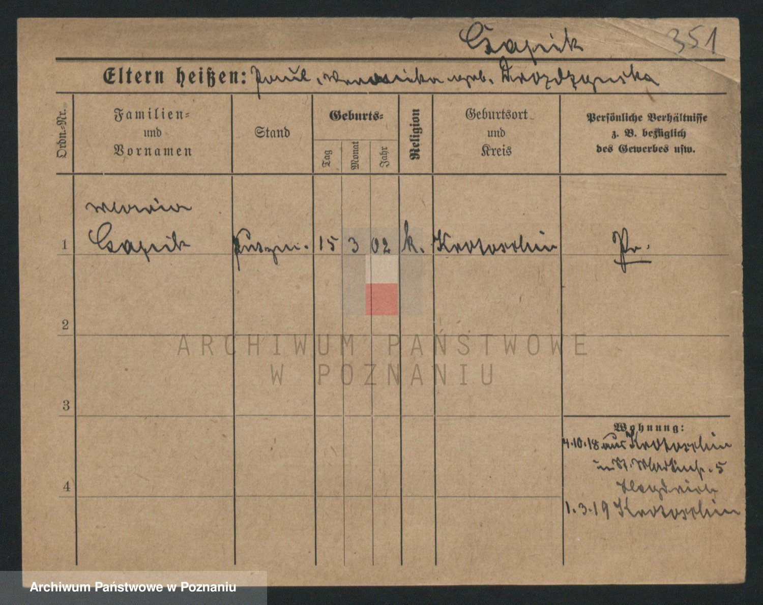 Podgląd karty osobowej dostępny jest po kliknięciu na nazwisko lub ikonkę karty. Można dokonywać powiększenia (ikony na górze) lub przechodzić między kolejnymi skanami (strzałki po bokach).