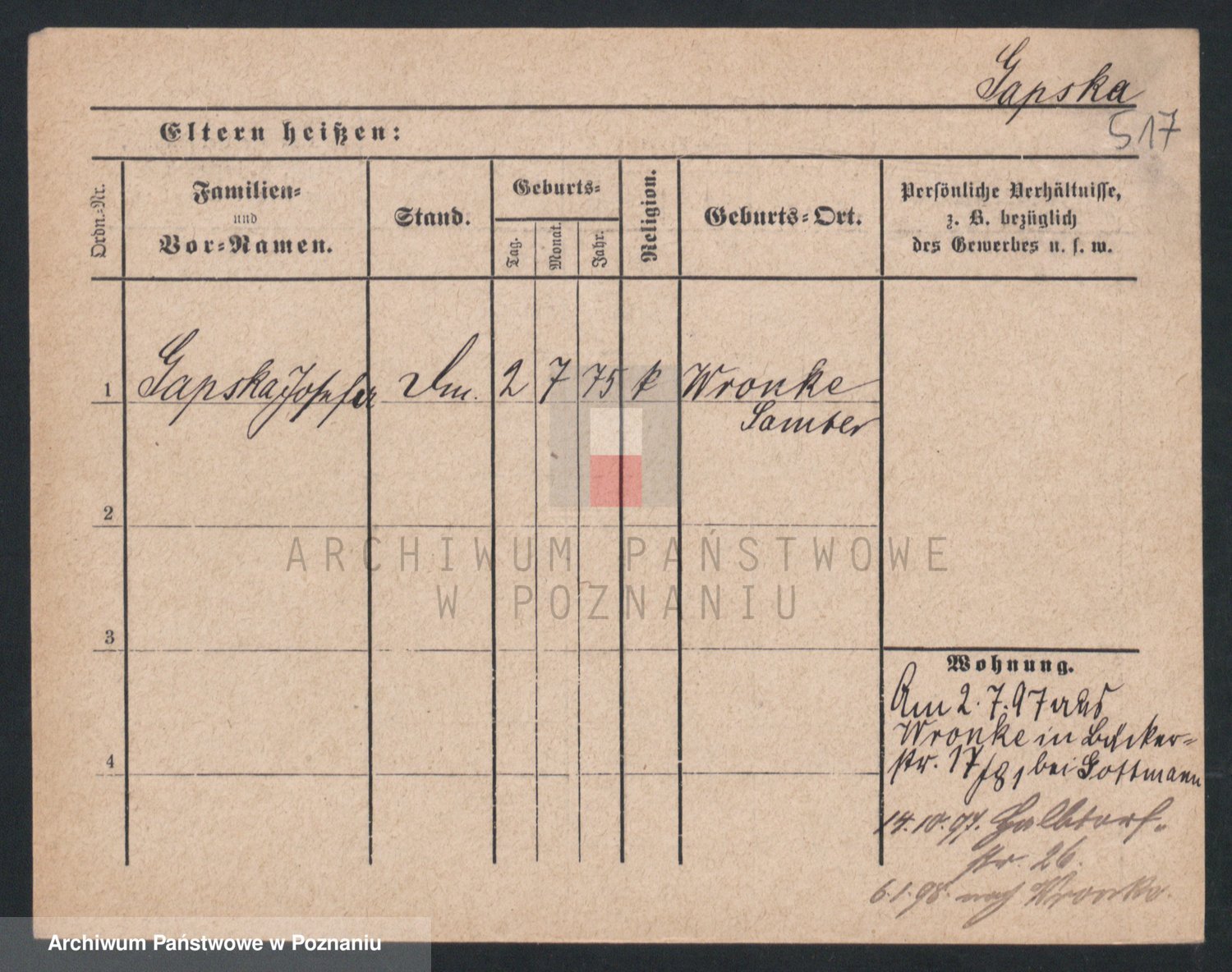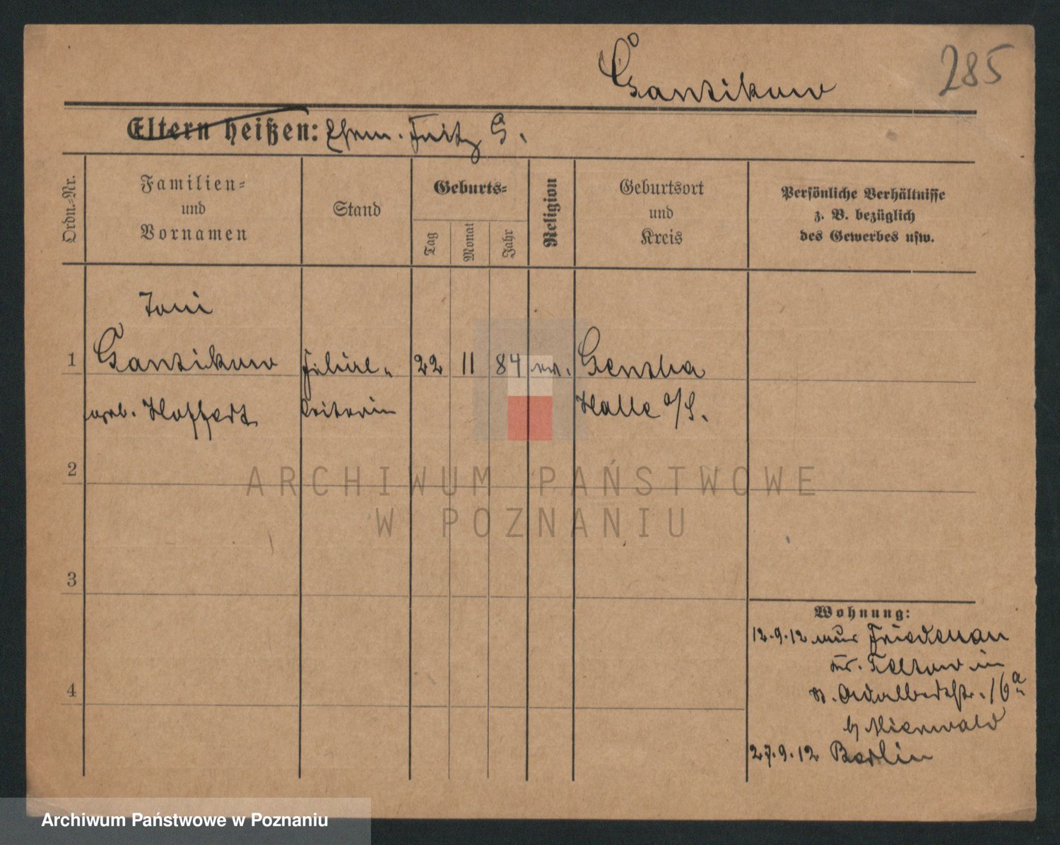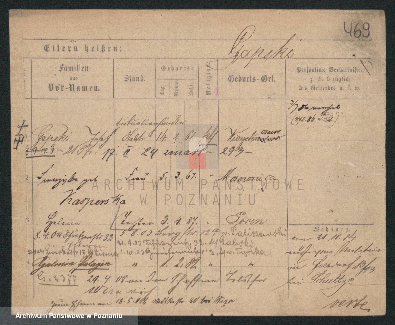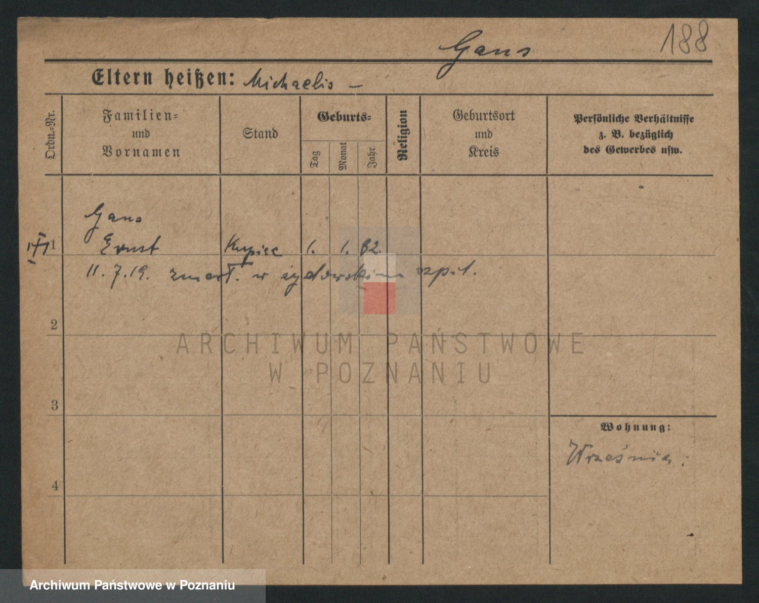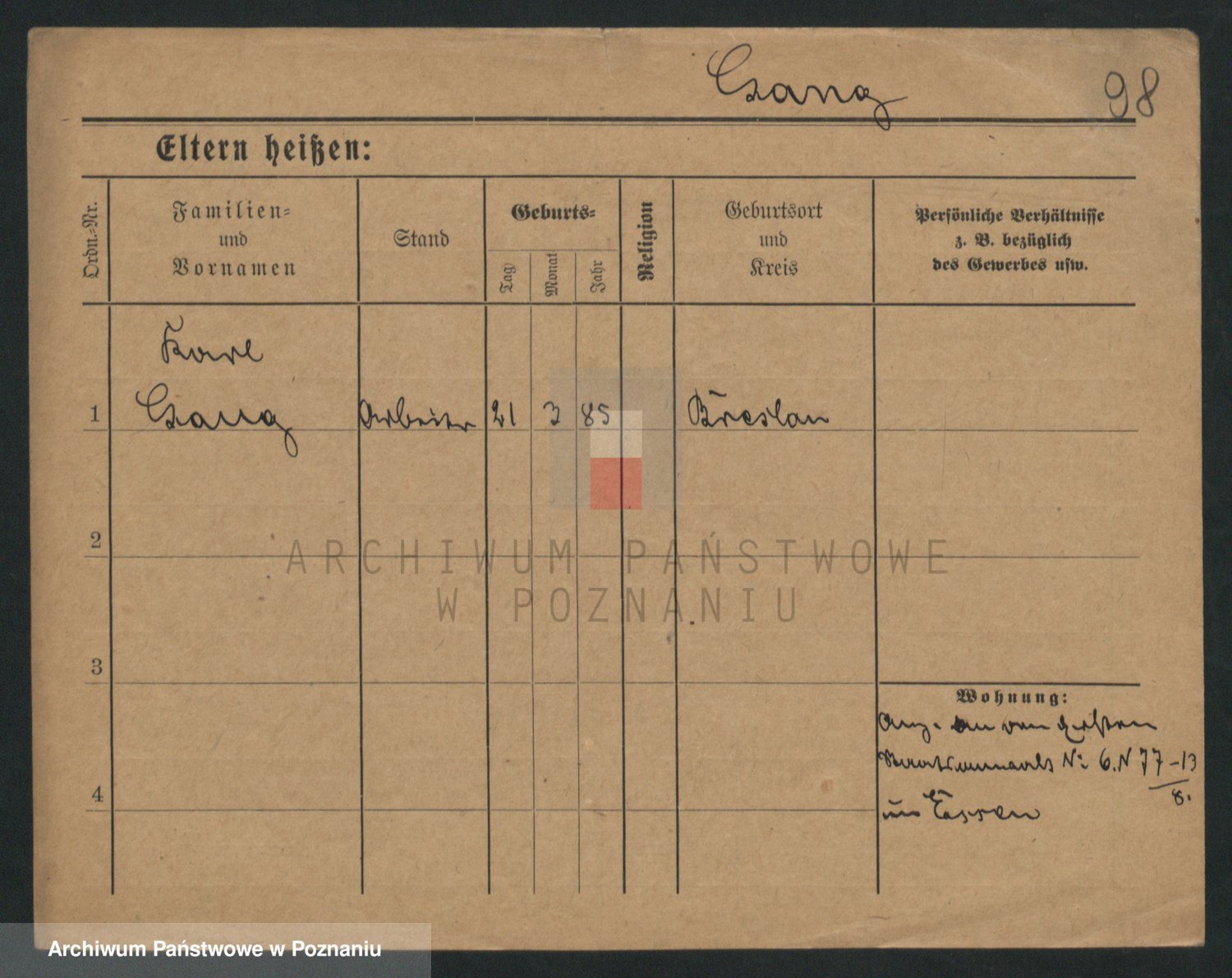 Podgląd karty osobowej dostępny jest po kliknięciu na nazwisko lub ikonkę karty. Można dokonywać powiększenia (ikony na górze) lub przechodzić między kolejnymi skanami (strzałki po bokach).