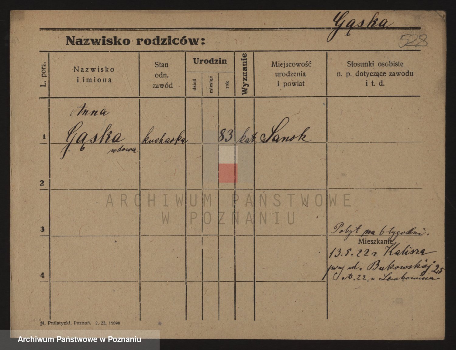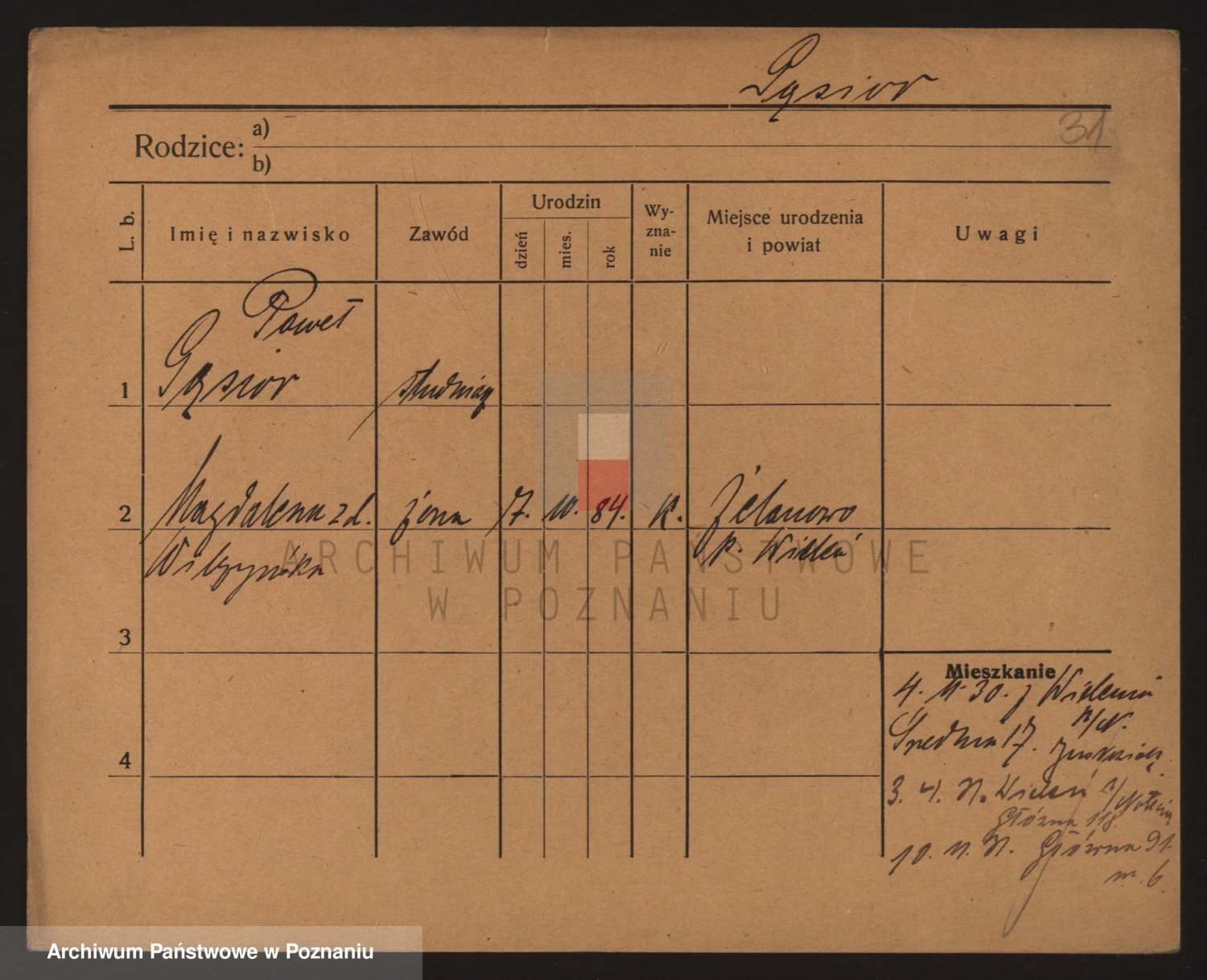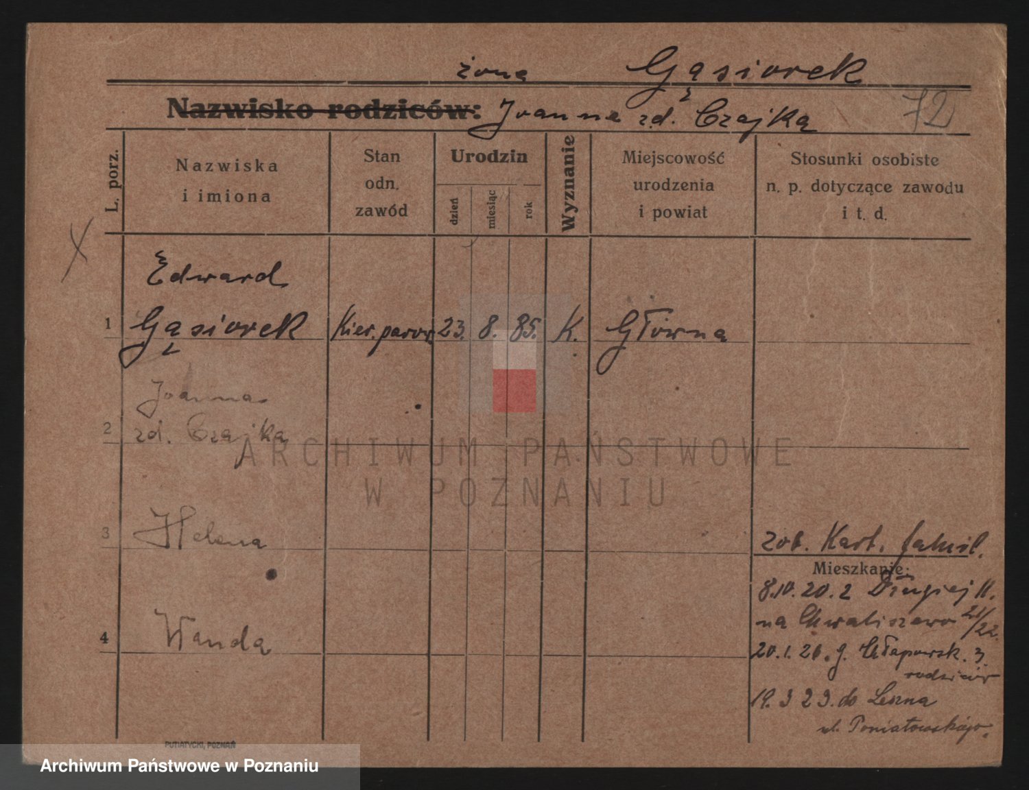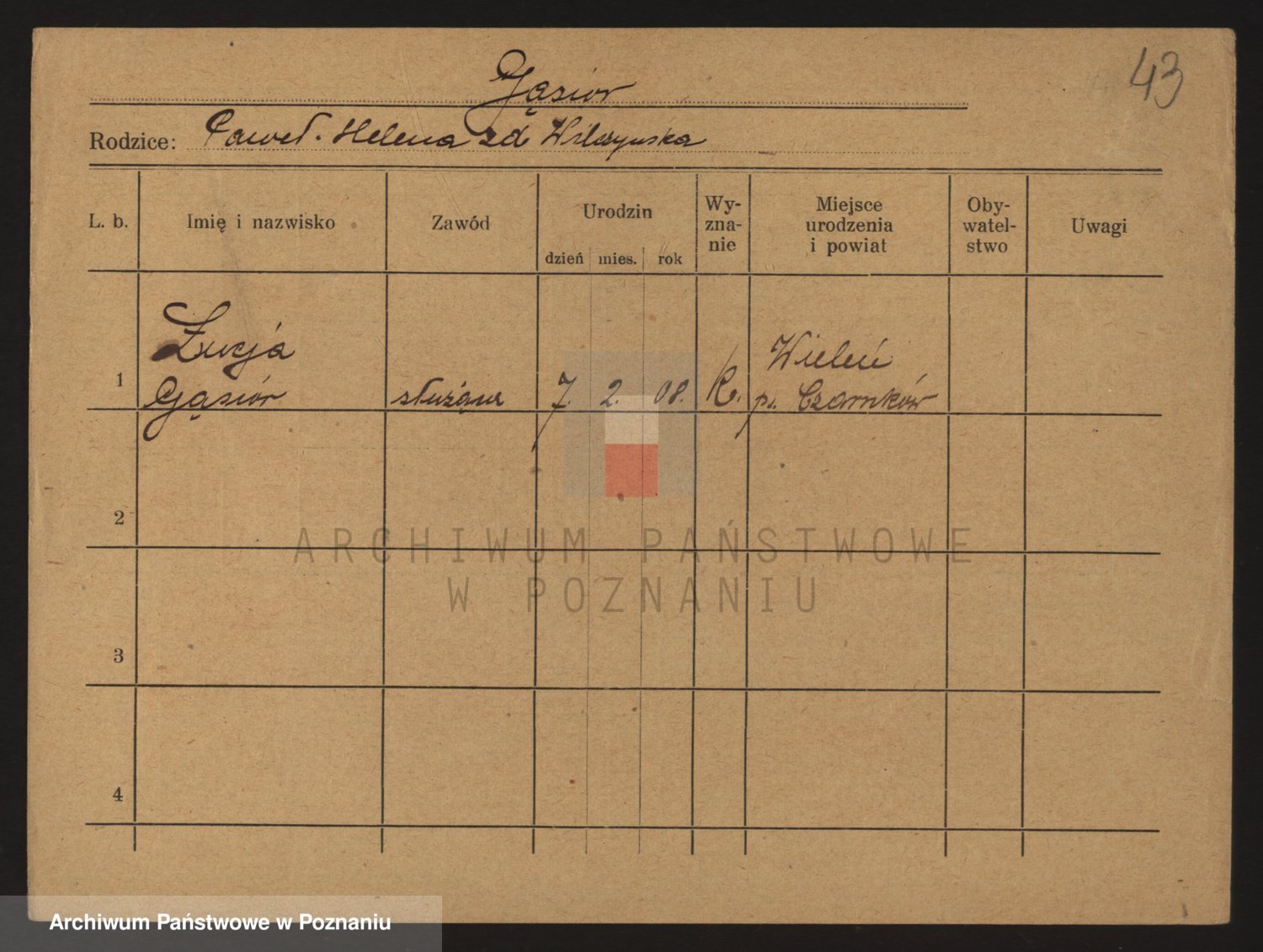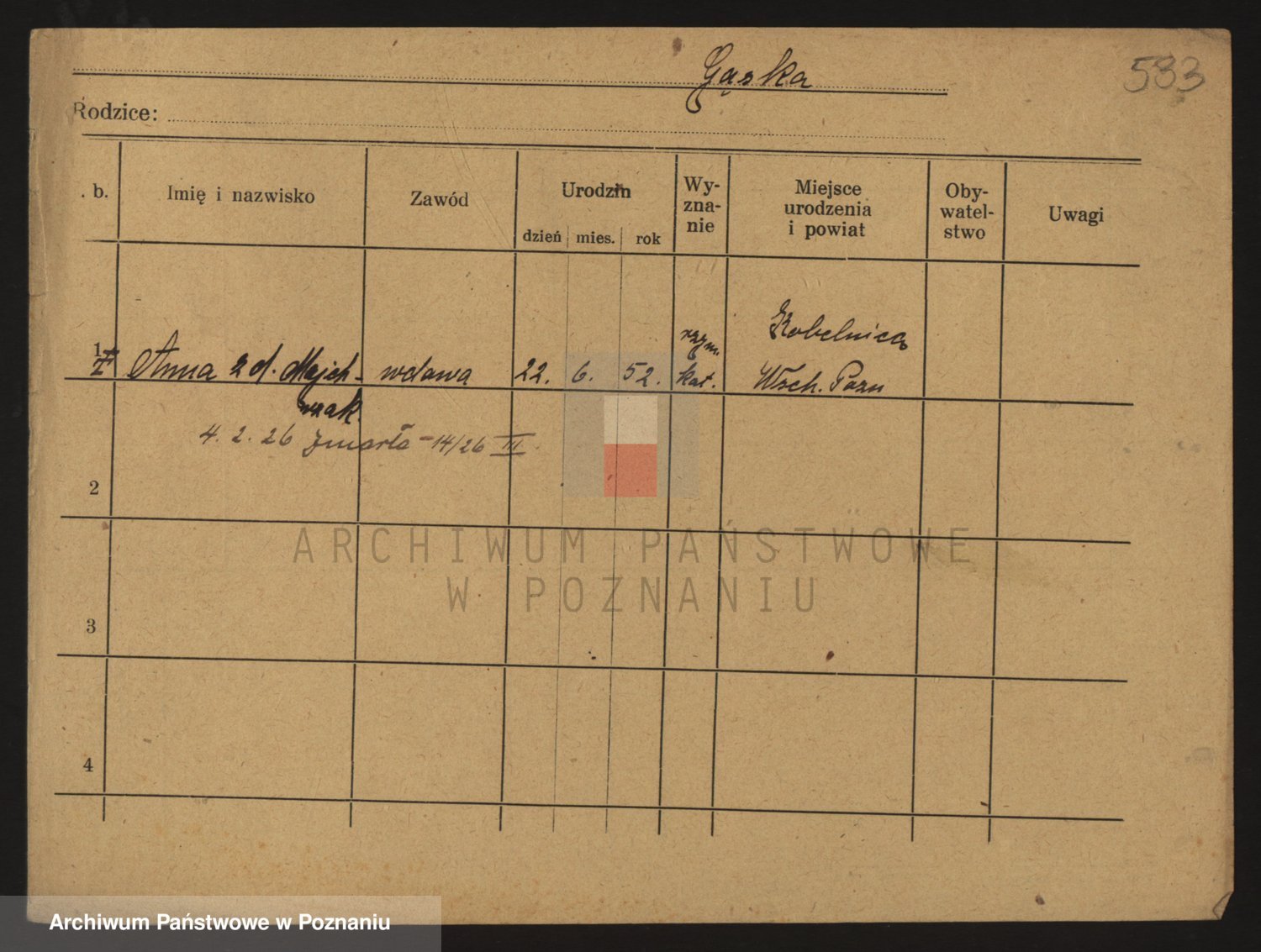 Podgląd karty osobowej dostępny jest po kliknięciu na nazwisko lub ikonkę karty. Można dokonywać powiększenia (ikony na górze) lub przechodzić między kolejnymi skanami (strzałki po bokach).