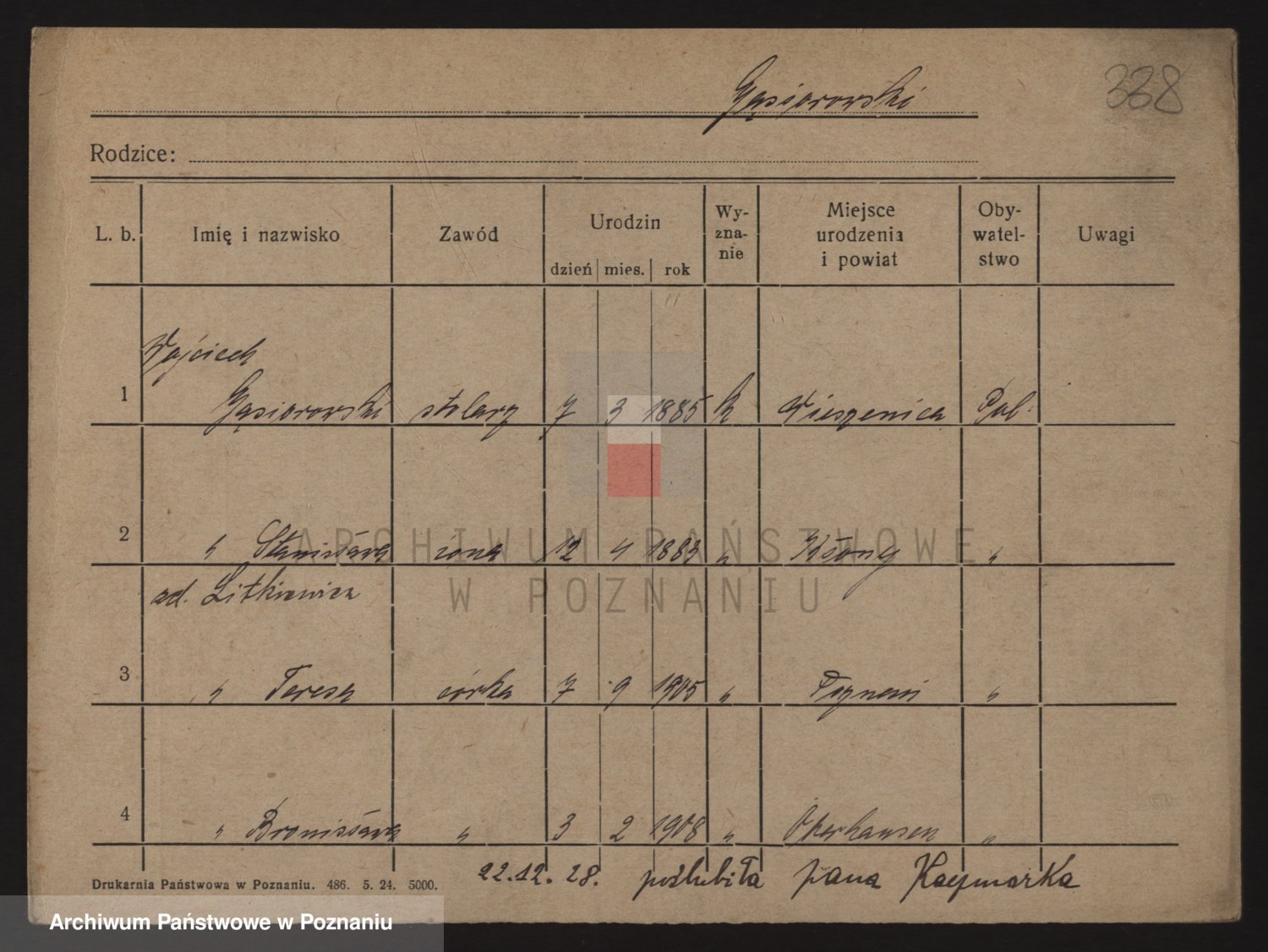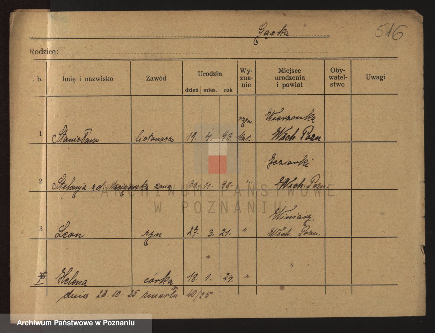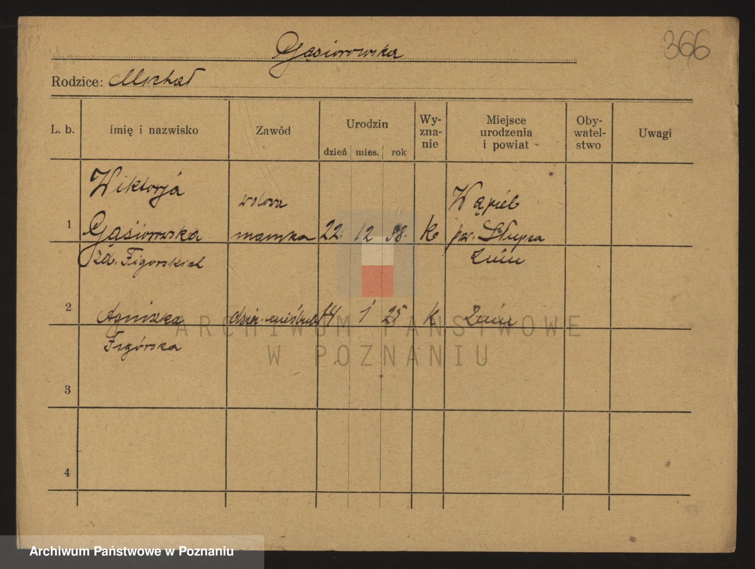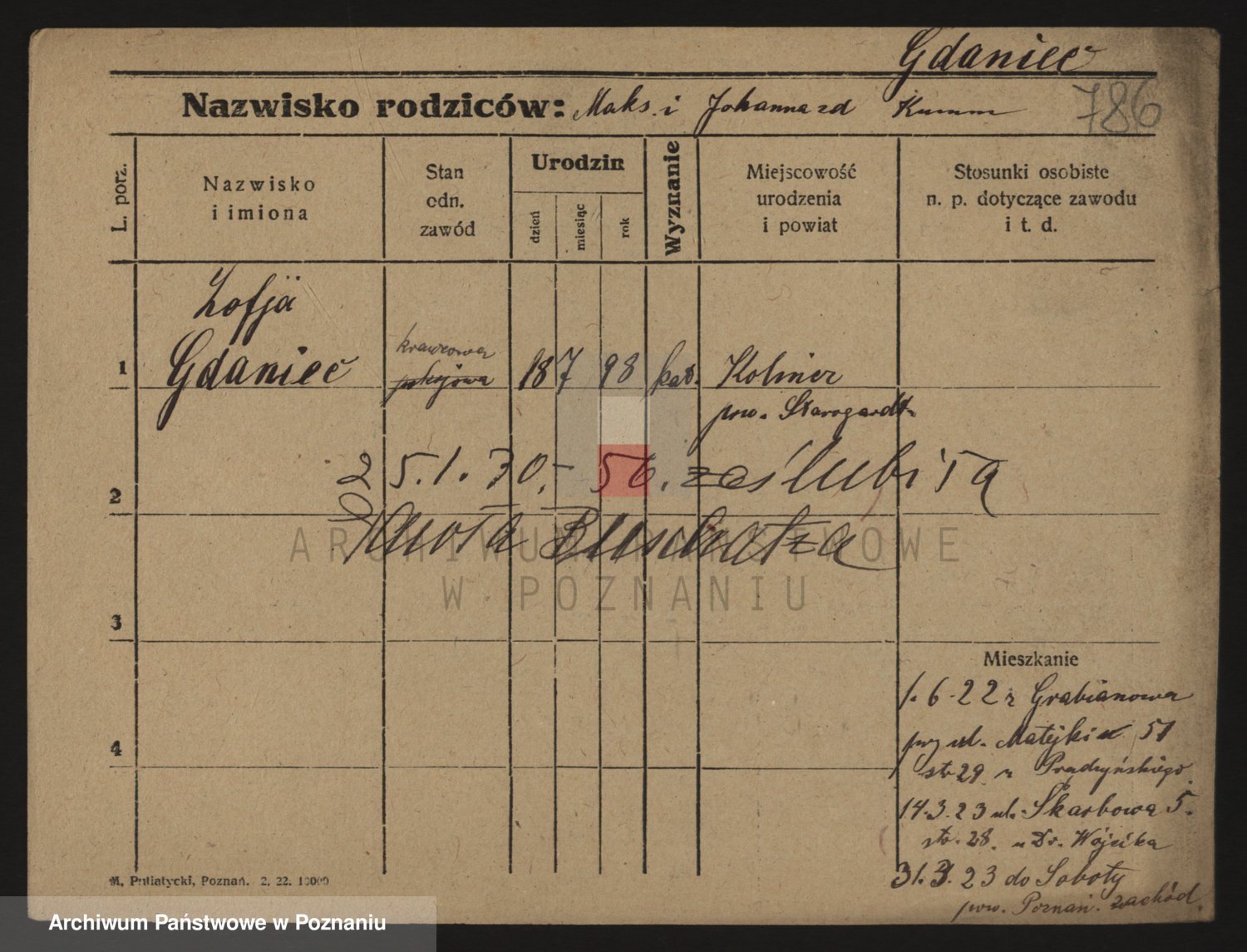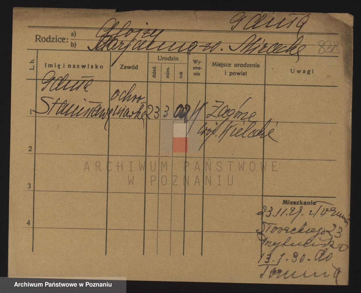 Podgląd karty osobowej dostępny jest po kliknięciu na nazwisko lub ikonkę karty. Można dokonywać powiększenia (ikony na górze) lub przechodzić między kolejnymi skanami (strzałki po bokach).