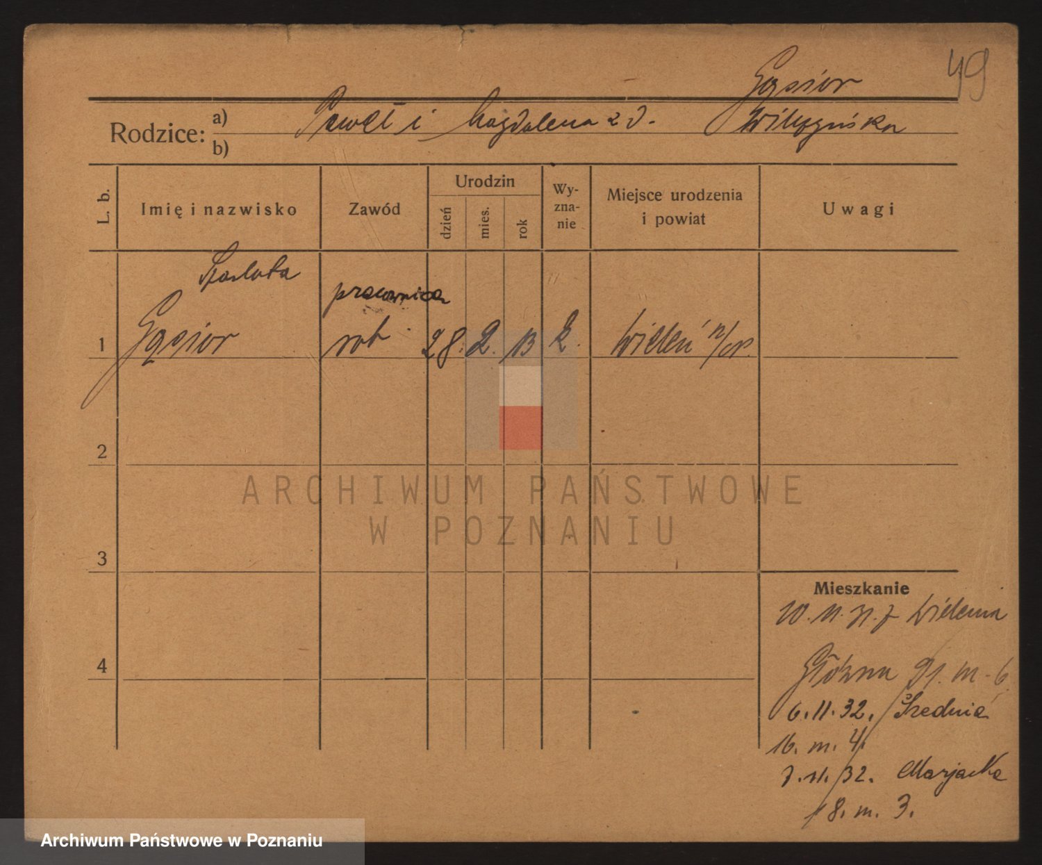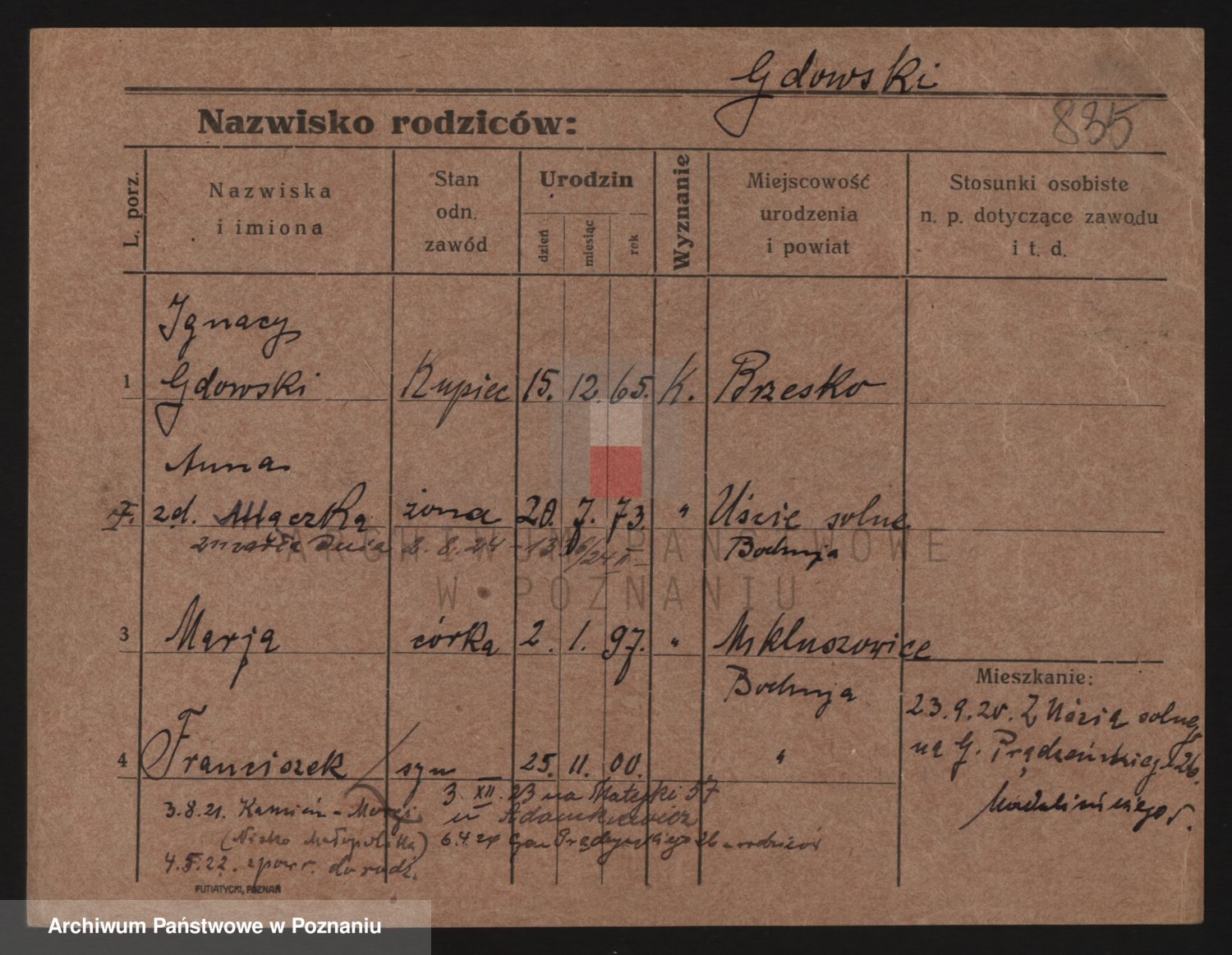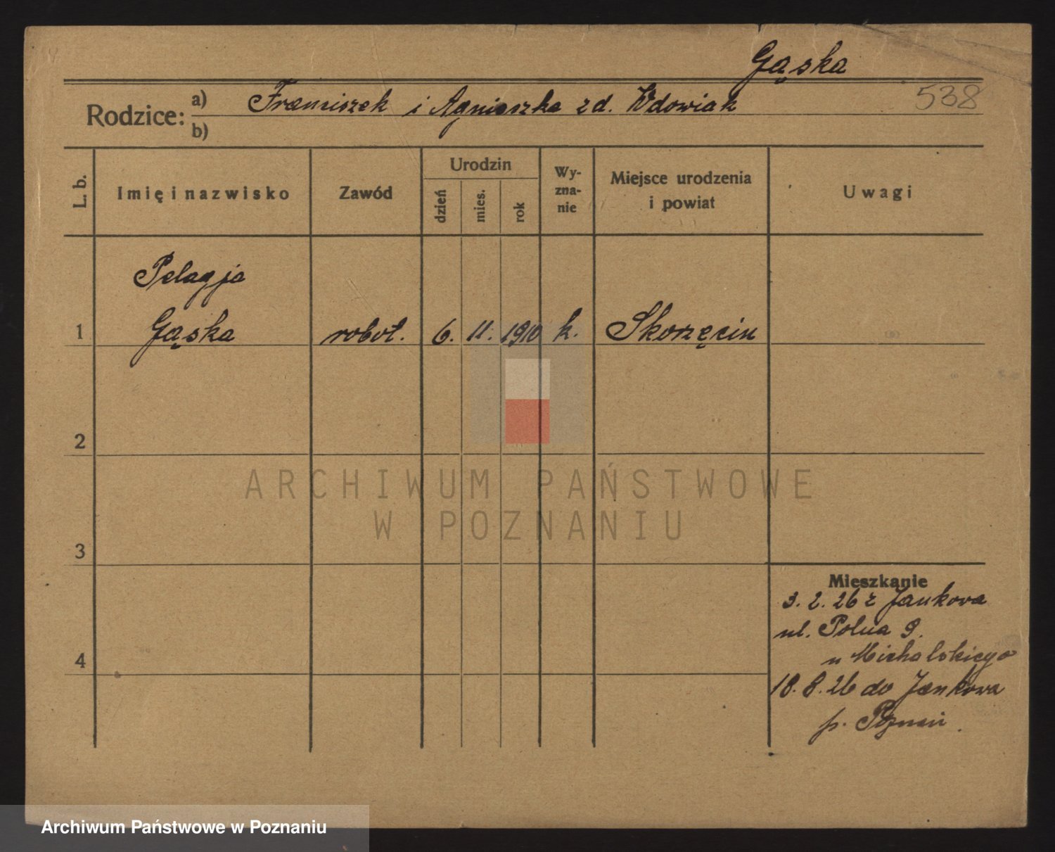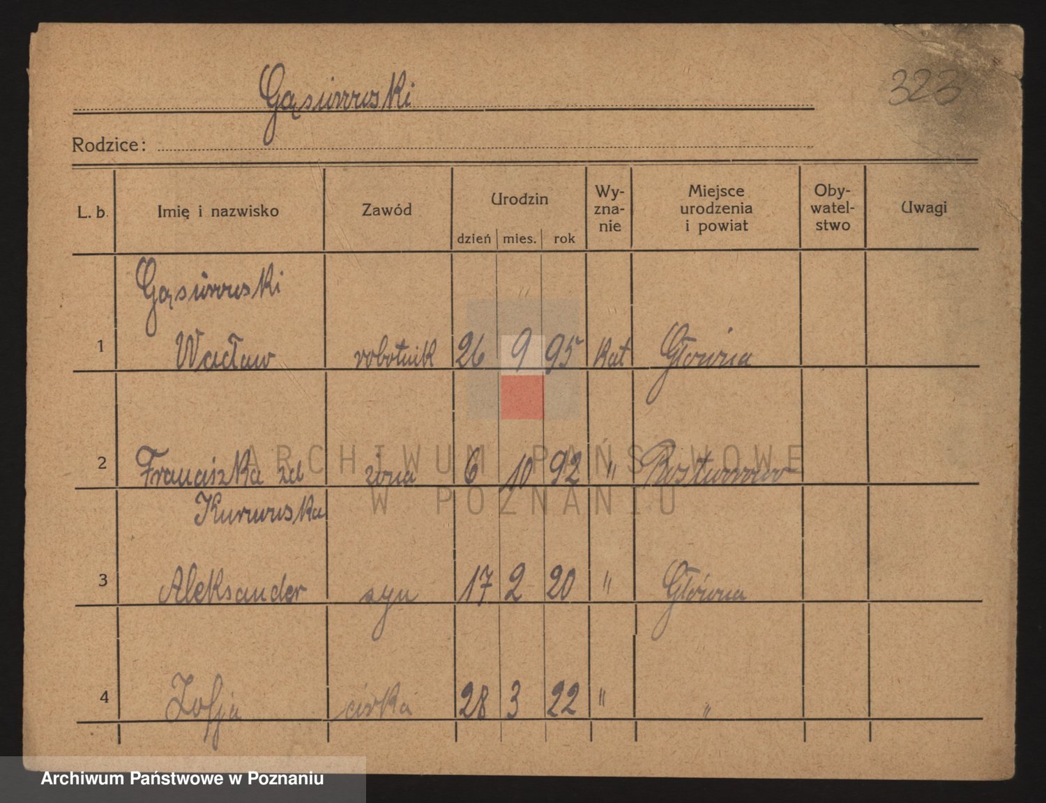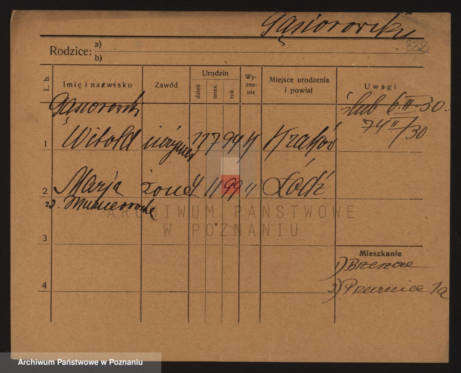 Podgląd karty osobowej dostępny jest po kliknięciu na nazwisko lub ikonkę karty. Można dokonywać powiększenia (ikony na górze) lub przechodzić między kolejnymi skanami (strzałki po bokach).