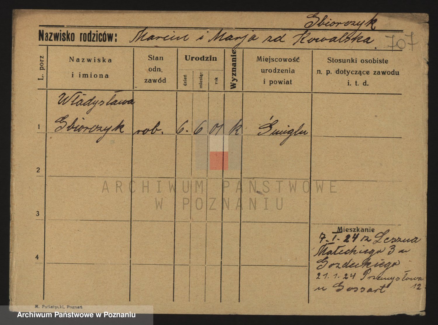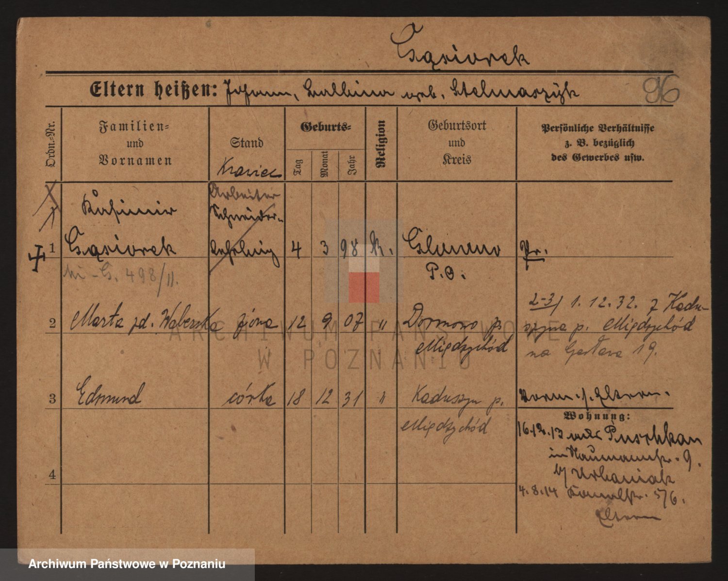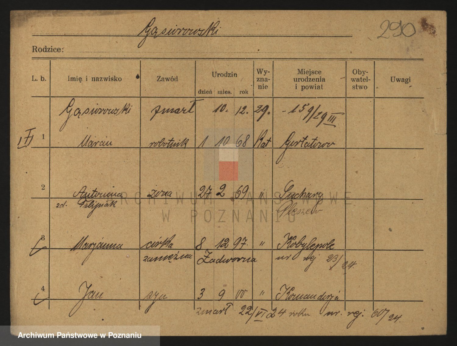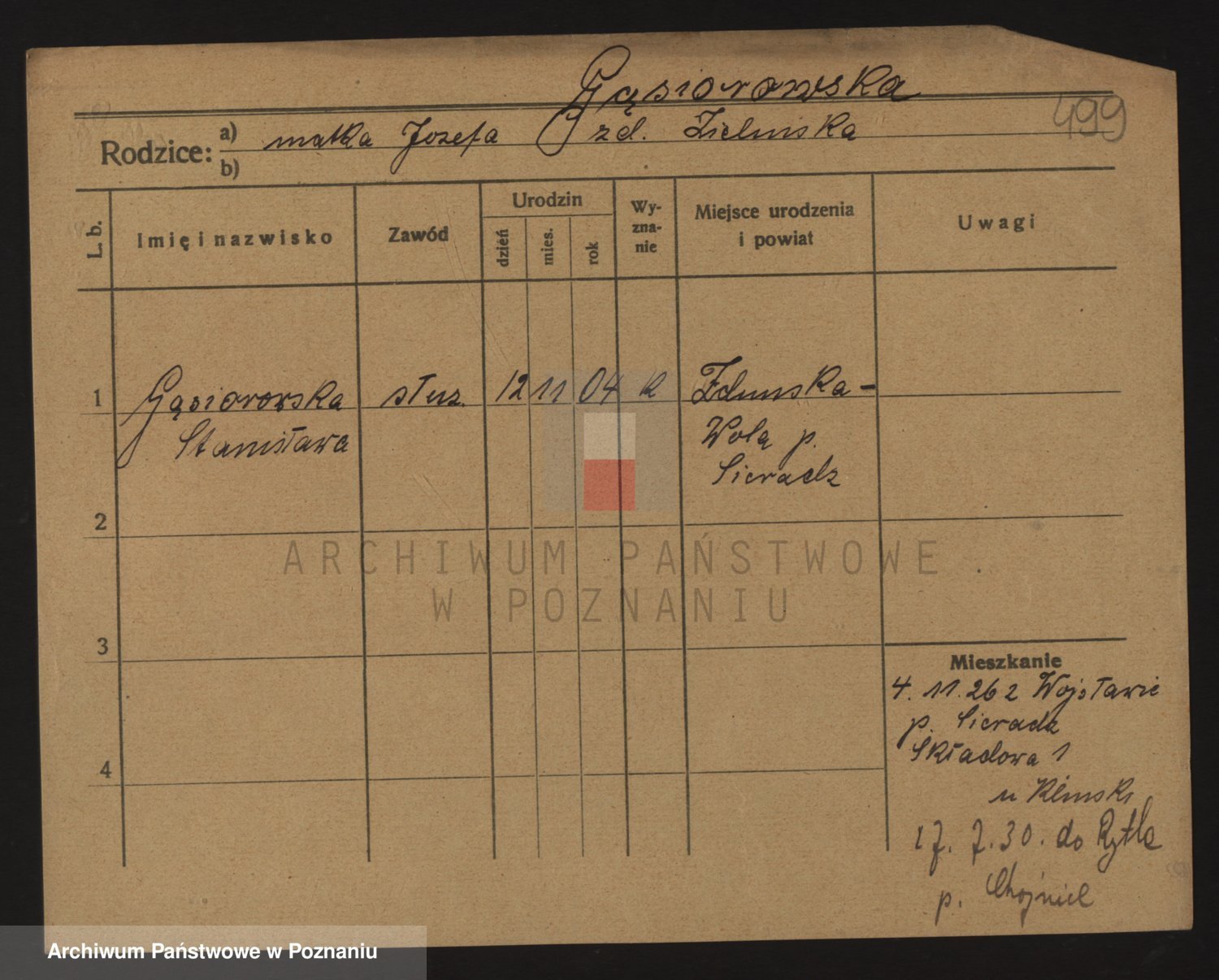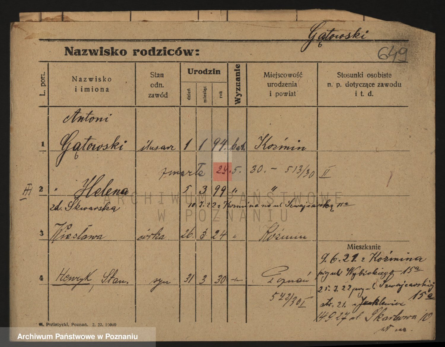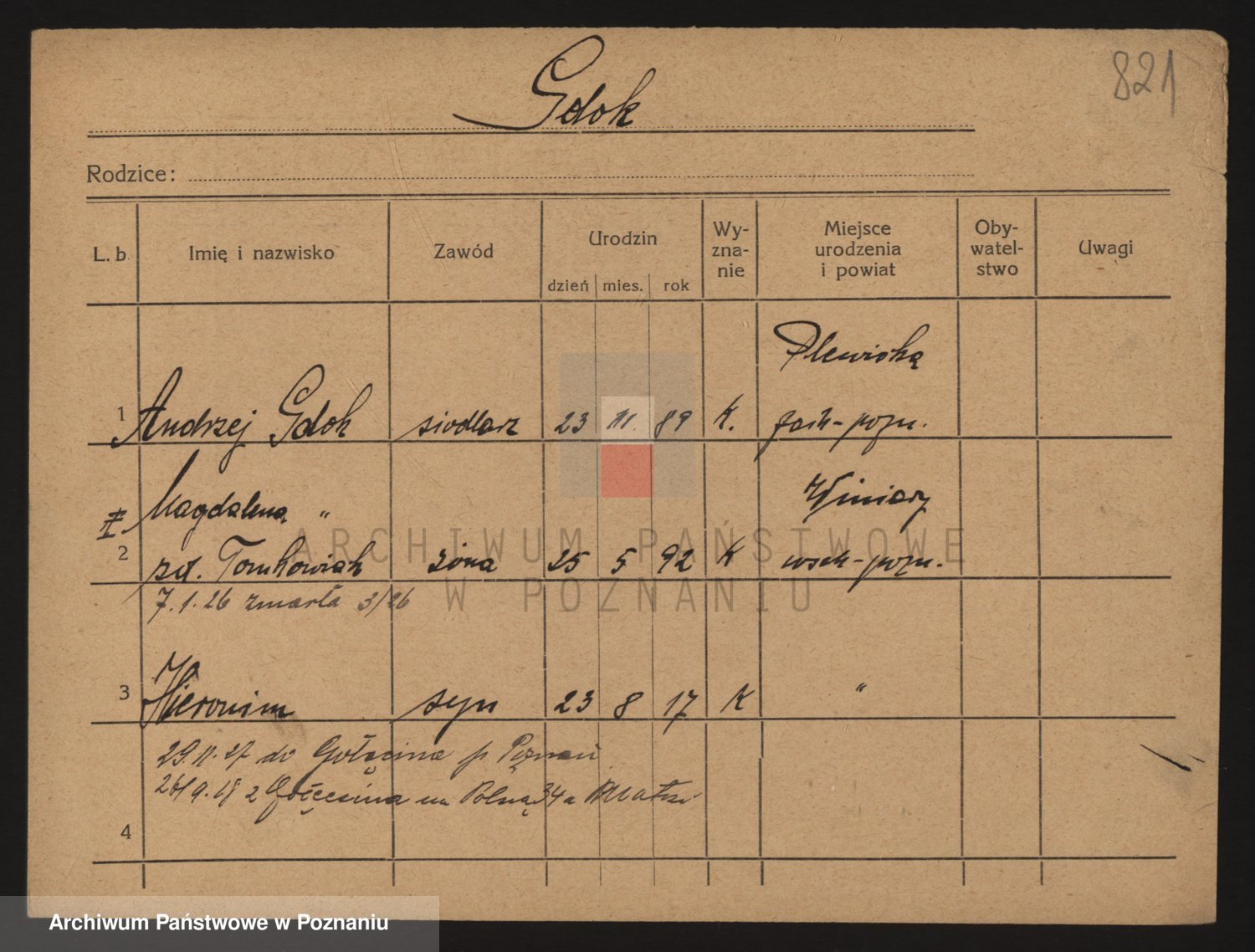 Podgląd karty osobowej dostępny jest po kliknięciu na nazwisko lub ikonkę karty. Można dokonywać powiększenia (ikony na górze) lub przechodzić między kolejnymi skanami (strzałki po bokach).