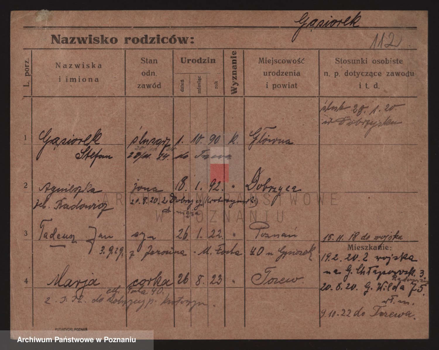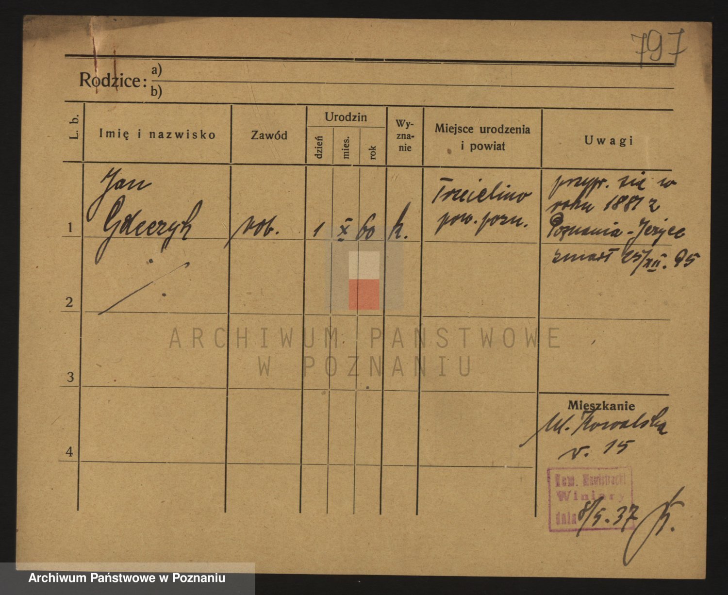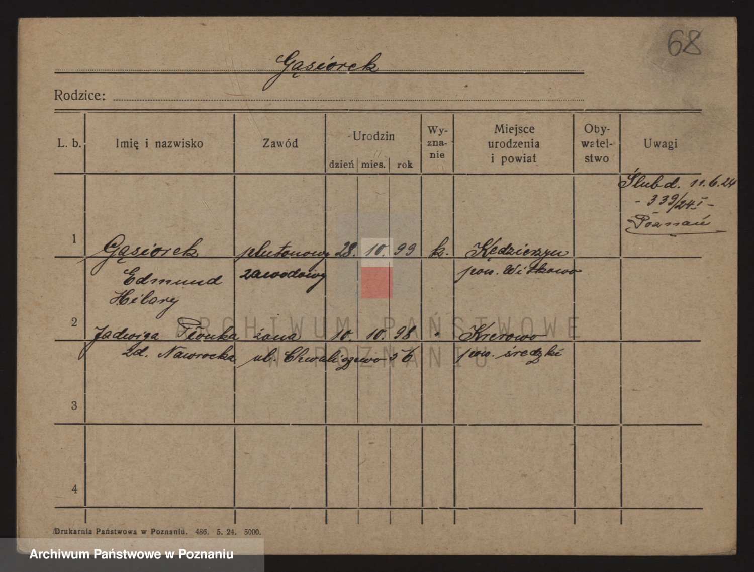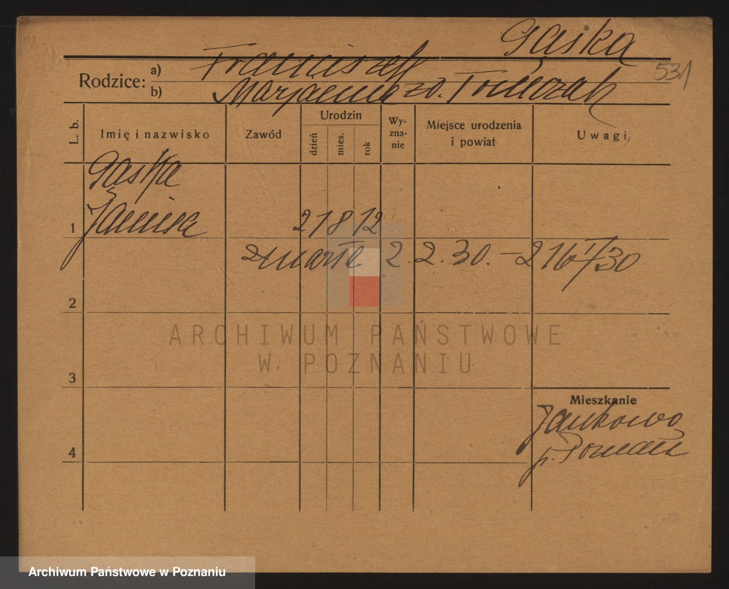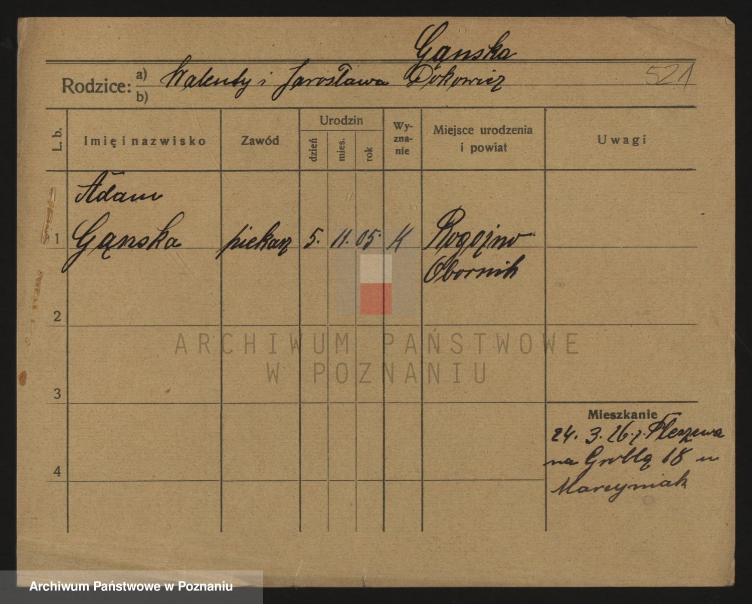 Podgląd karty osobowej dostępny jest po kliknięciu na nazwisko lub ikonkę karty. Można dokonywać powiększenia (ikony na górze) lub przechodzić między kolejnymi skanami (strzałki po bokach).