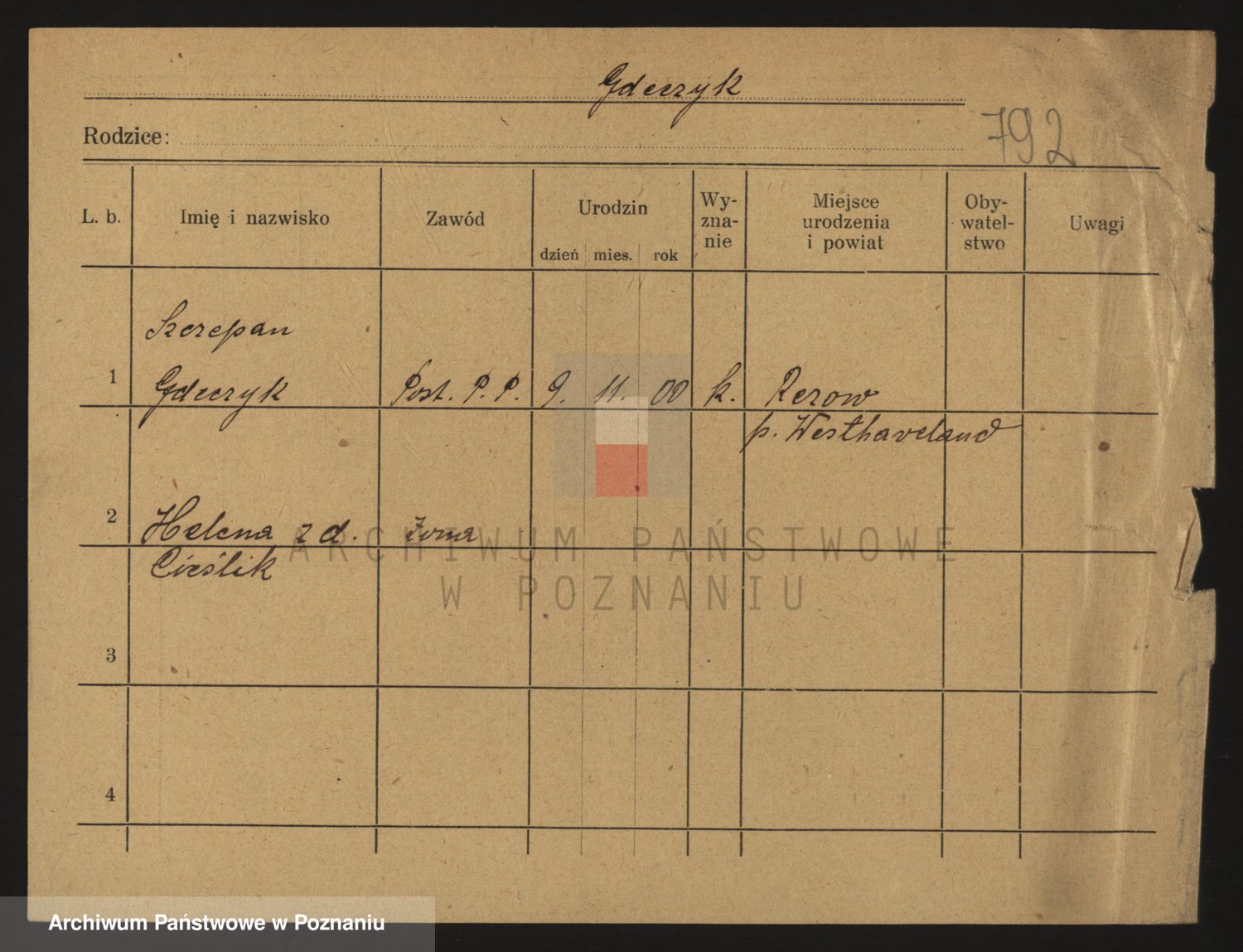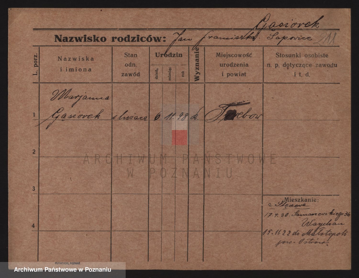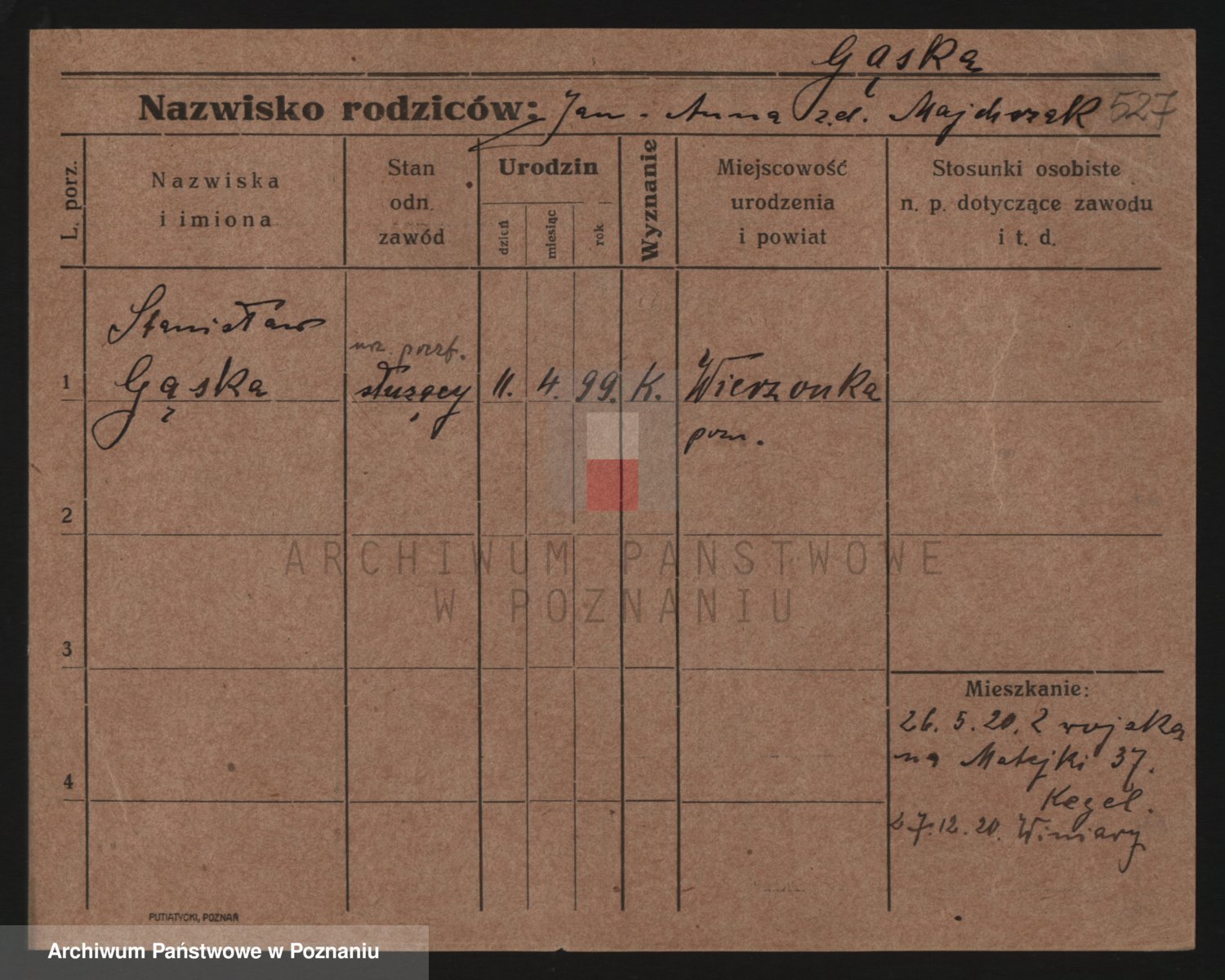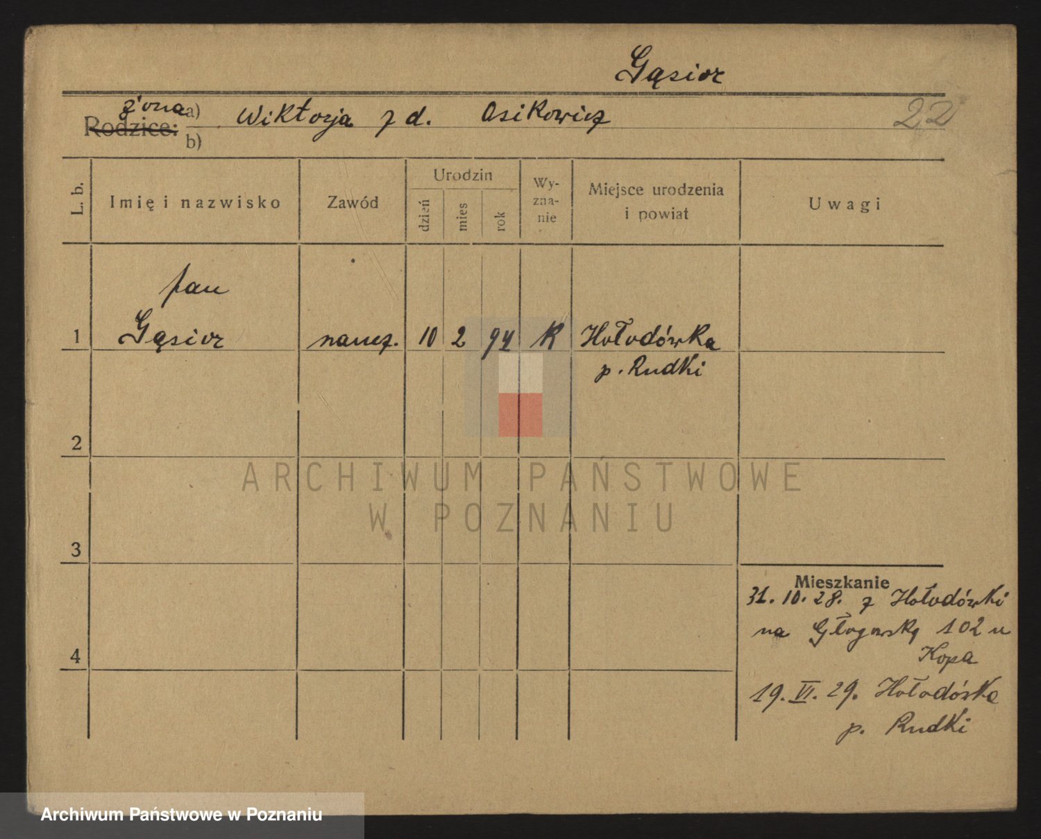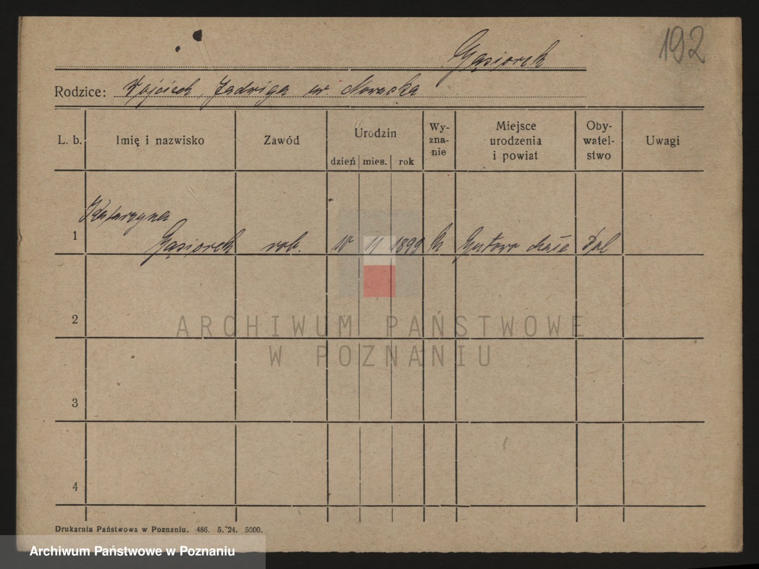 Podgląd karty osobowej dostępny jest po kliknięciu na nazwisko lub ikonkę karty. Można dokonywać powiększenia (ikony na górze) lub przechodzić między kolejnymi skanami (strzałki po bokach).