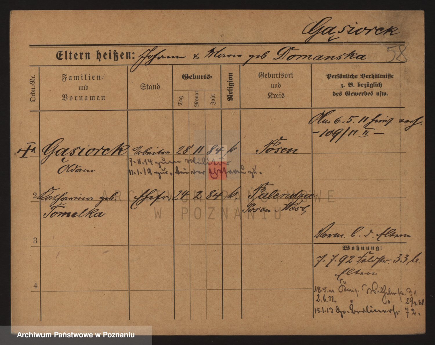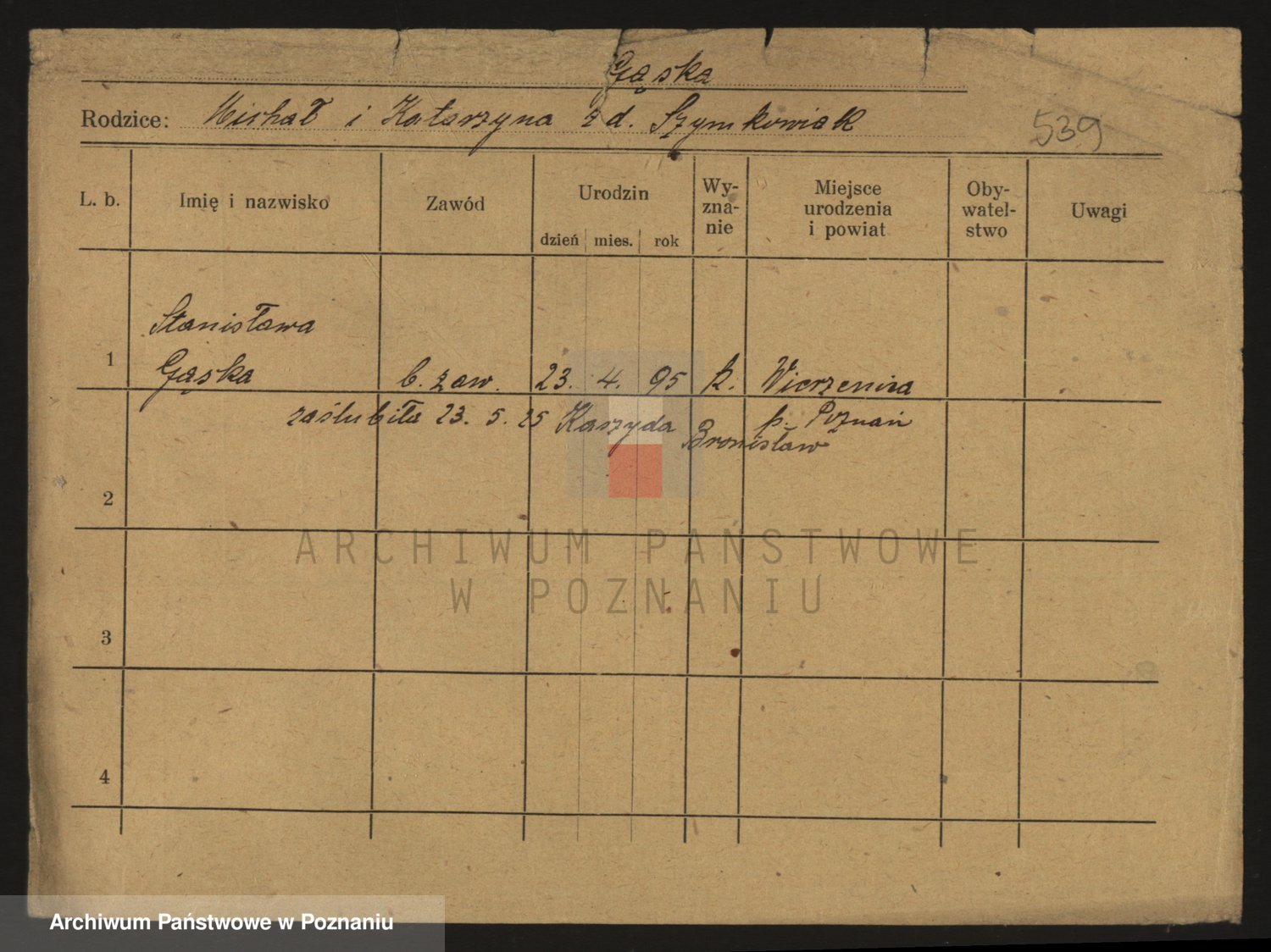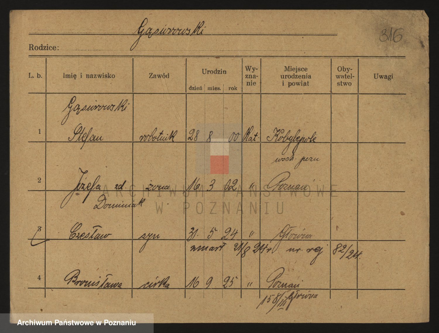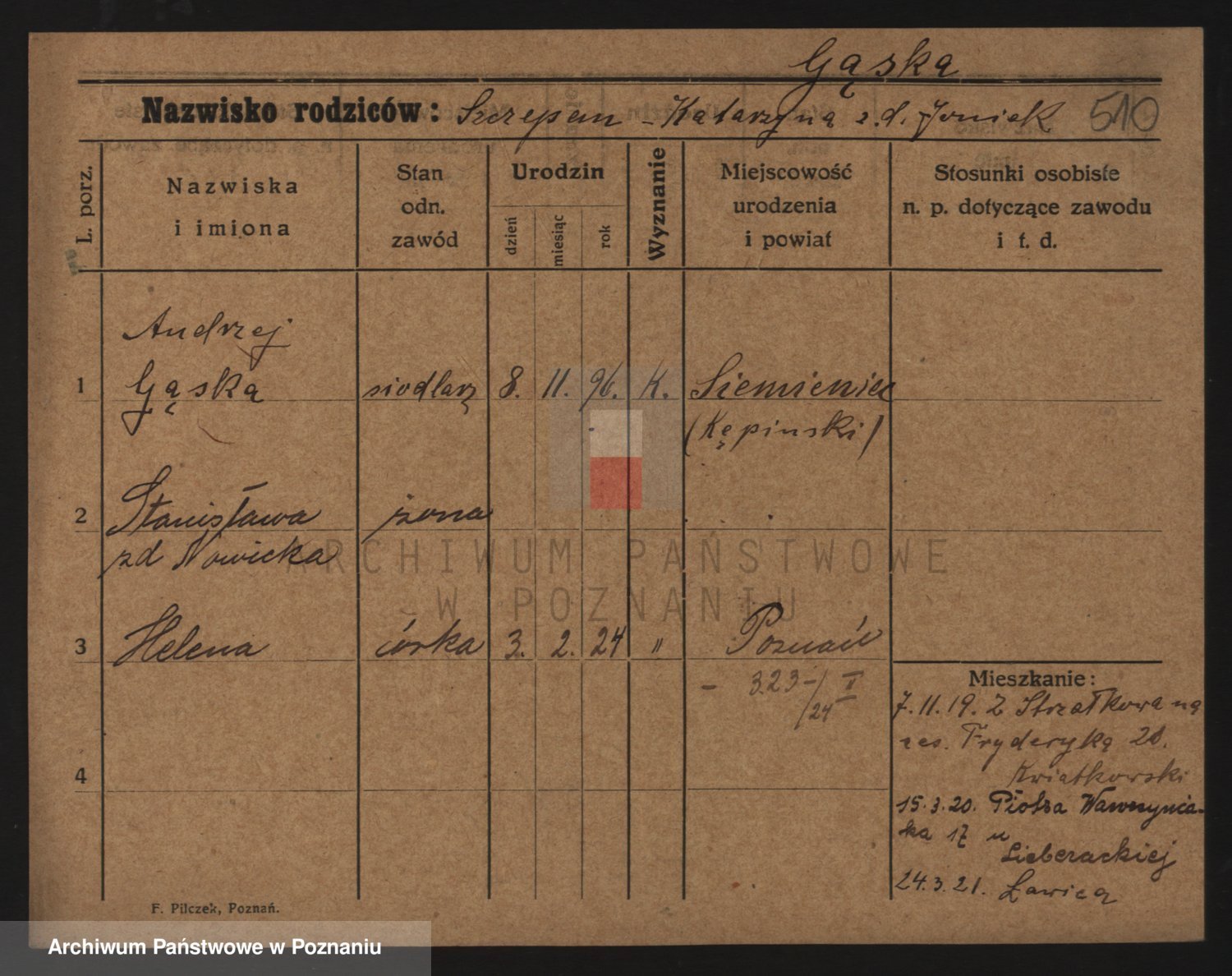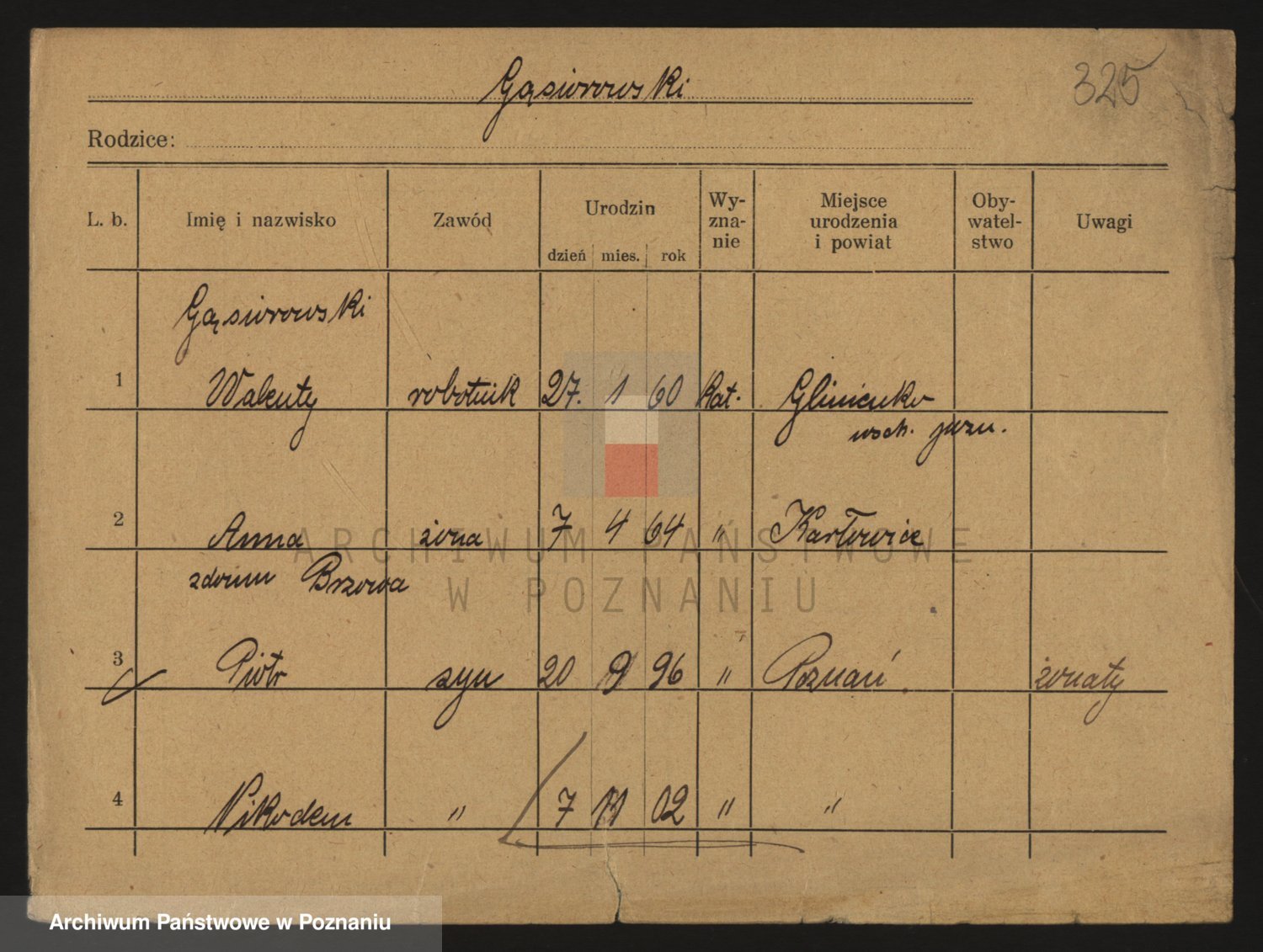 Podgląd karty osobowej dostępny jest po kliknięciu na nazwisko lub ikonkę karty. Można dokonywać powiększenia (ikony na górze) lub przechodzić między kolejnymi skanami (strzałki po bokach).